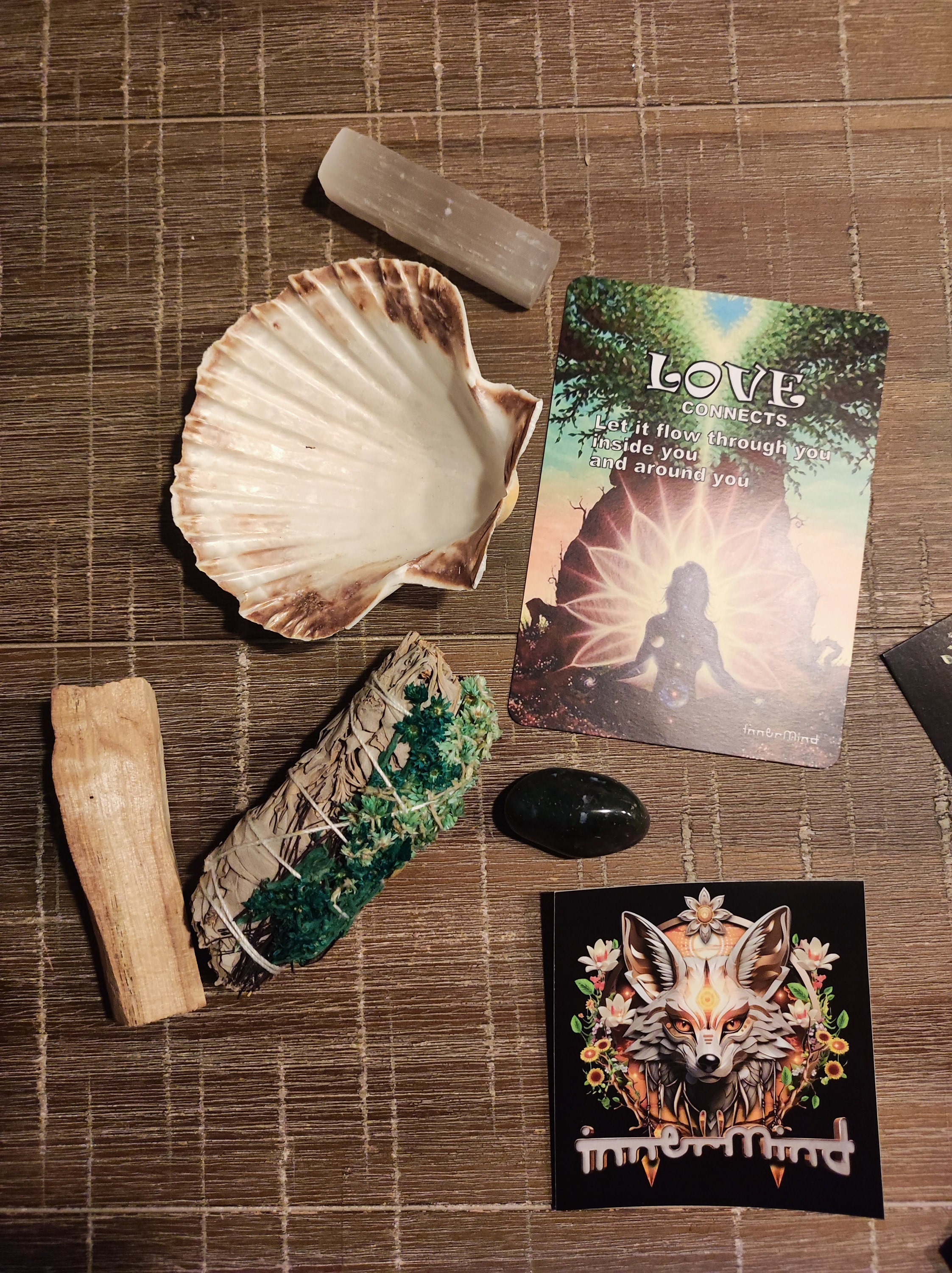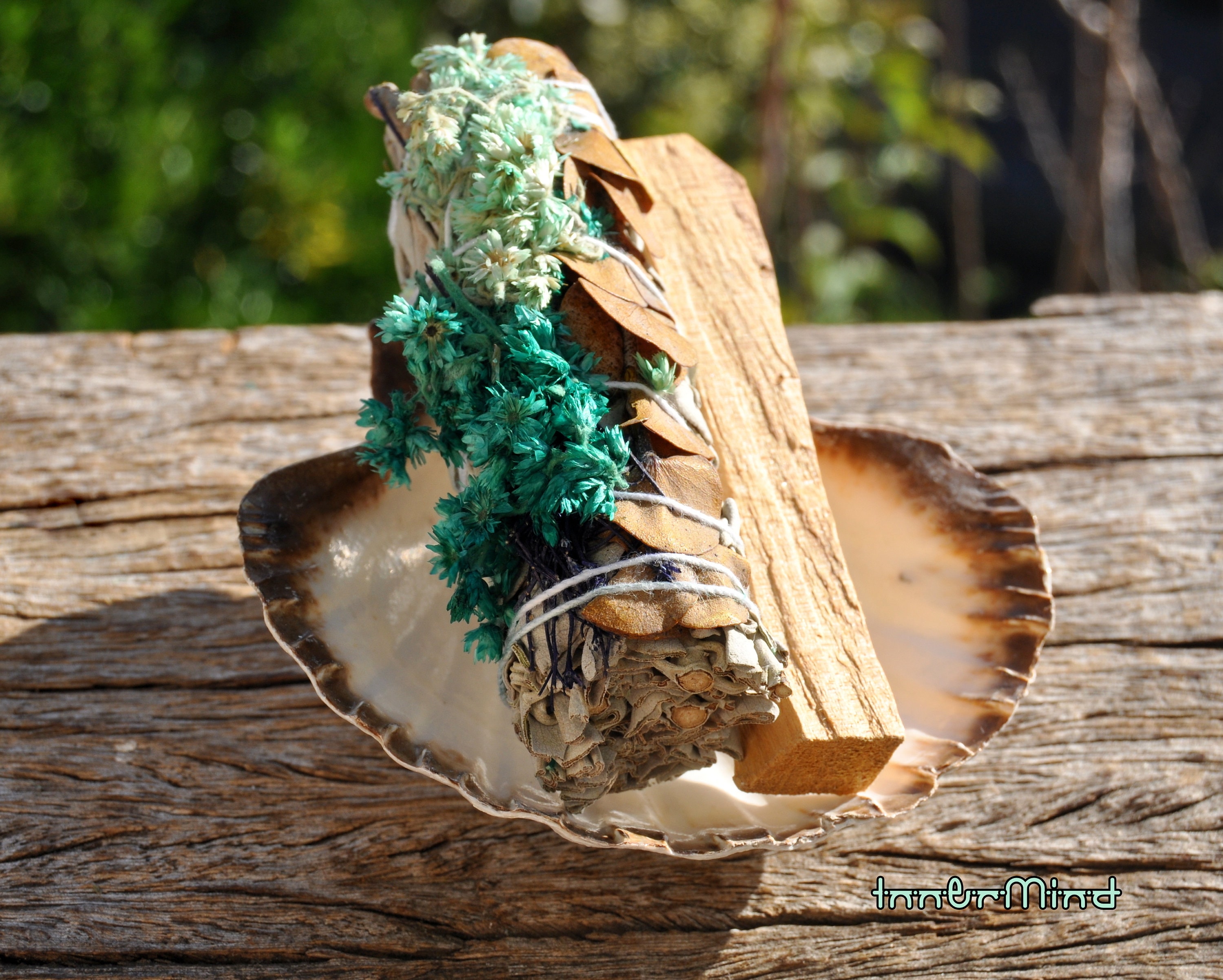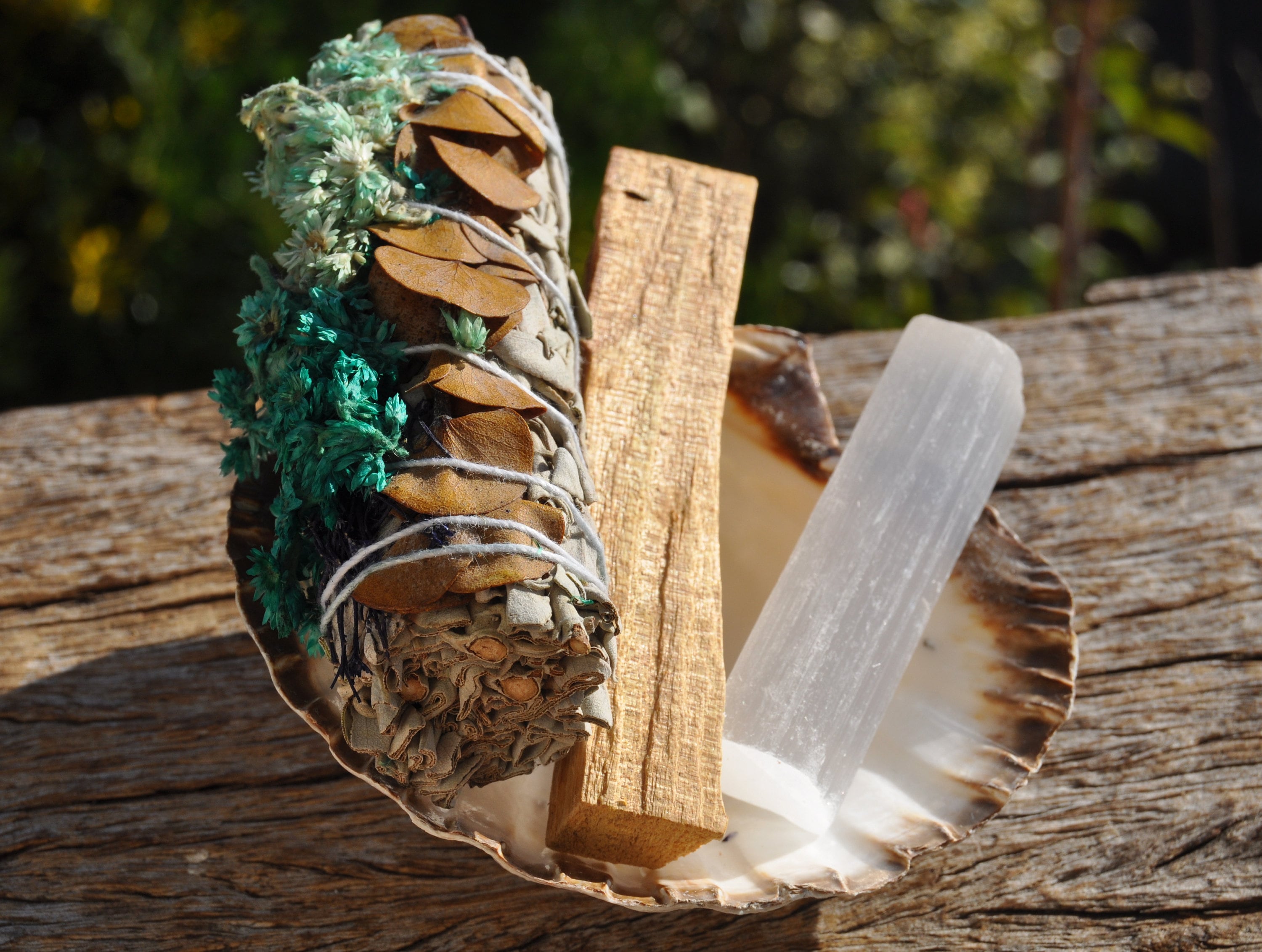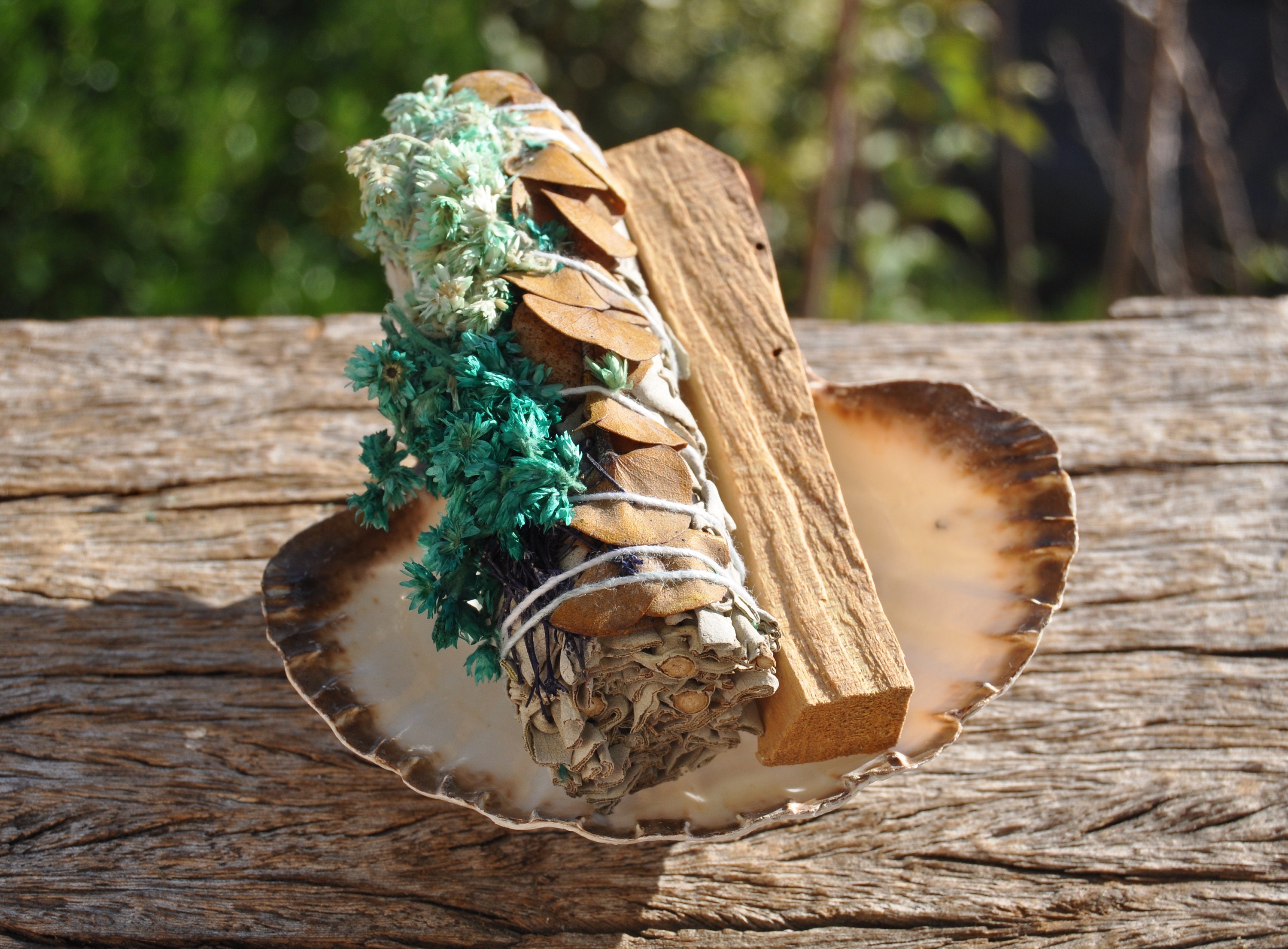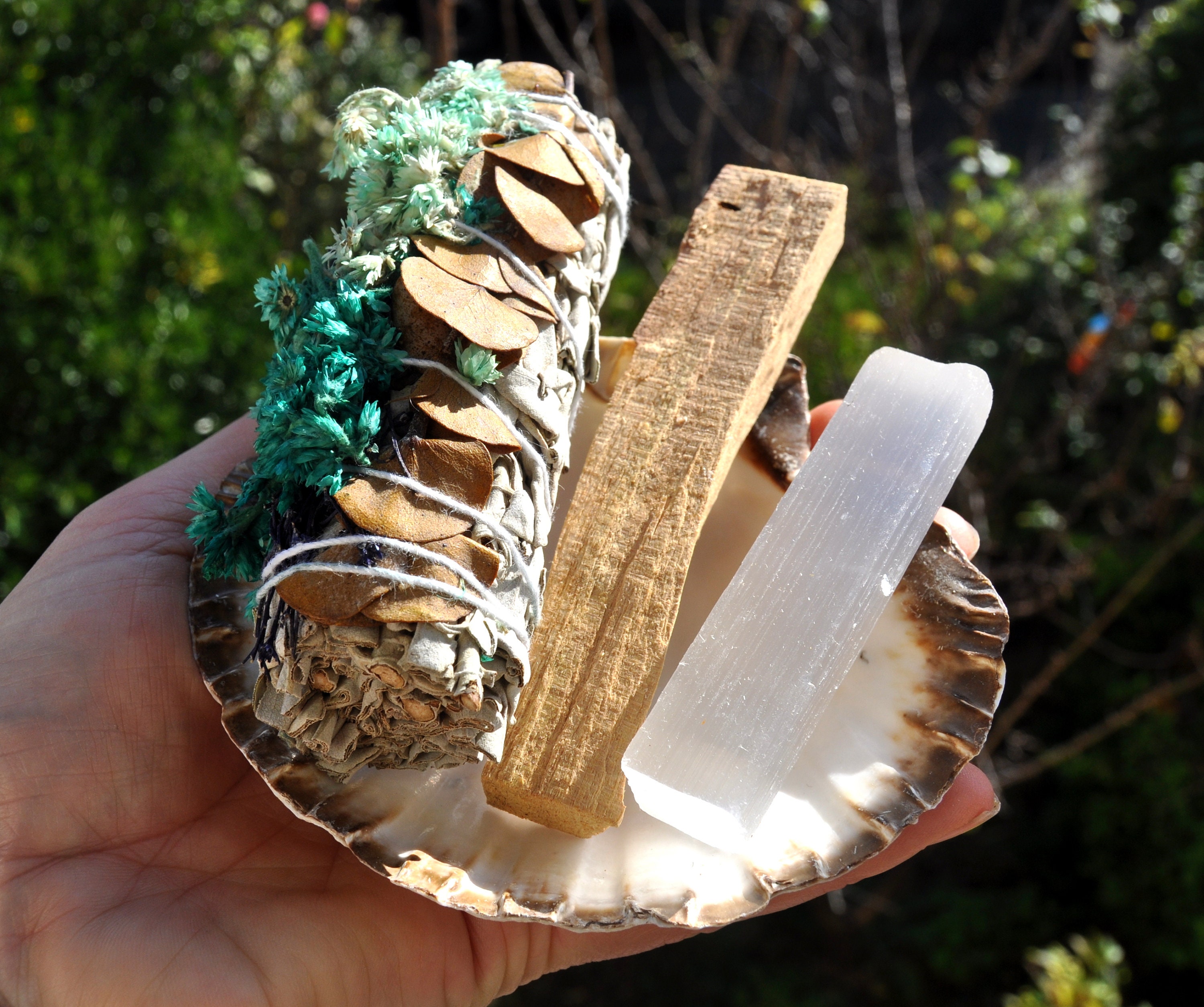 A lovely cleansing and purification set with a White Sage with dried Eucalyptus and Verbascum bundle, Palo Santo stick and natural recycled Shell. White Sage bundle is approx. 10 cm and average weight is 40 gram / 1.41 Oz. The shell is approx. 11 cm / 4.33 inches wide.