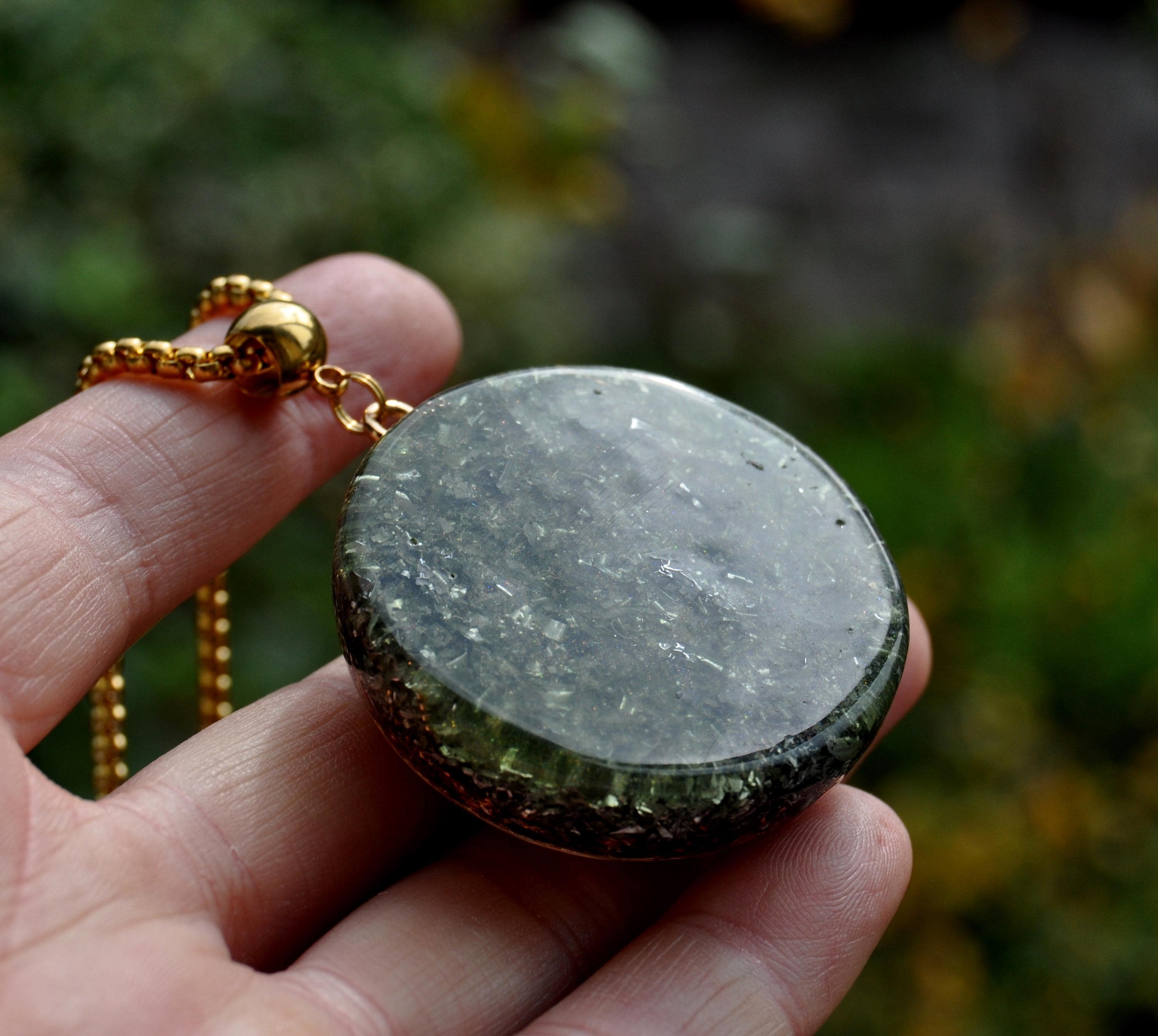 With its deep, forest-green color, swirly patterns, and glassy texture, Moldavite looks like it came straight from a sci-fi movie – and many believe it carries the universe's high-vibe energy. The large Moldavite piece in this pendant delivers a strong dose of its transformative power right at your heart. It's often called the "Stone of the Holy Grail" or "Moldavite Flush" for its intense effects. People who work with it report powerful experiences like vivid dreams, sudden insights, emotional releases, and even synchronicities (those "meant-to-be" moments). It's super popular for accelerating spiritual growth, helping you shed old patterns, and opening up to higher consciousness.