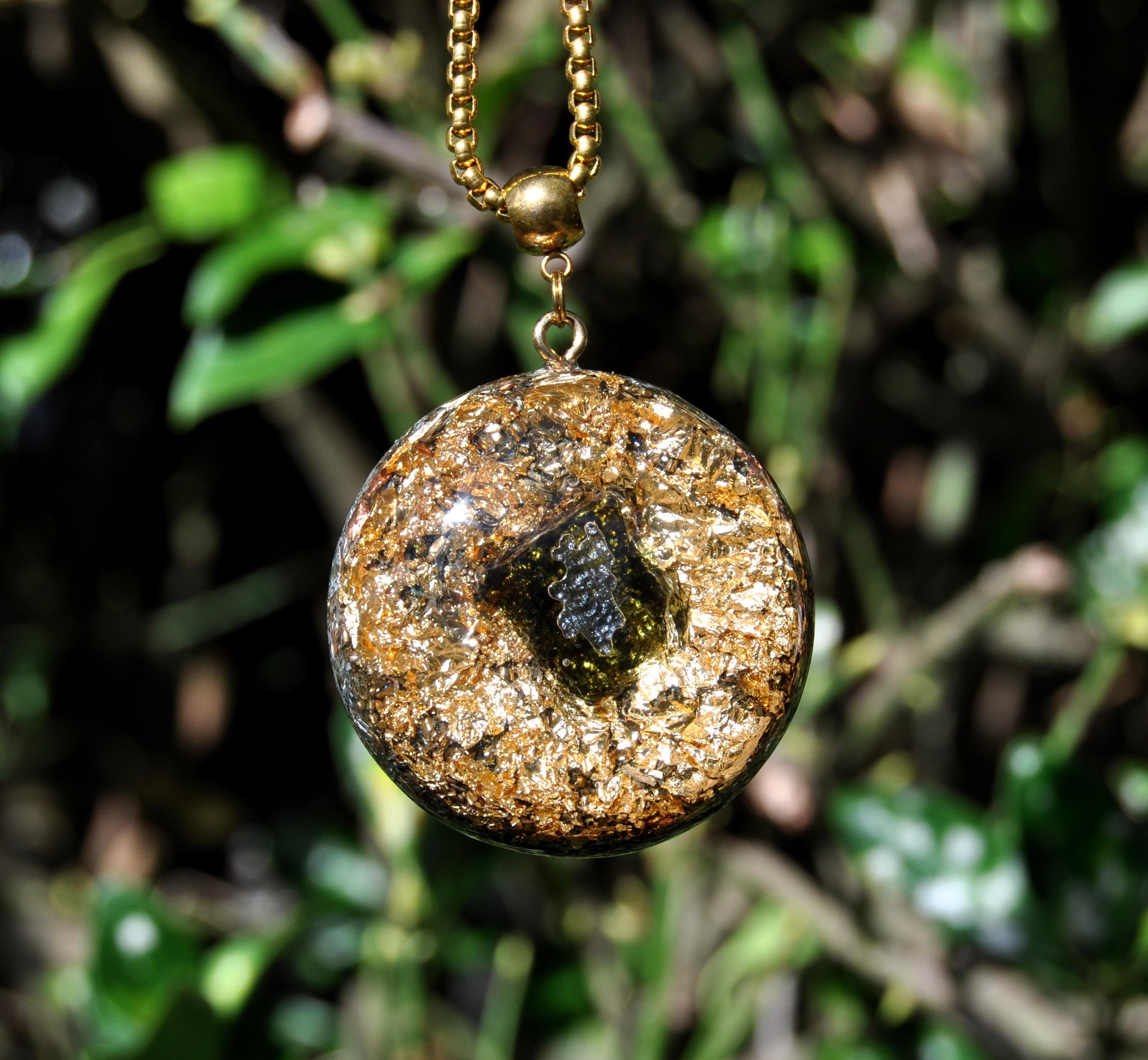 Everything's set in a tough resin base loaded with at least 50% metal shavings. That's key for true orgonite, inspired by Wilhelm Reich's ideas on orgone energy – it helps transform negative vibes into positive ones, with that big Moldavite piece adding extra power.