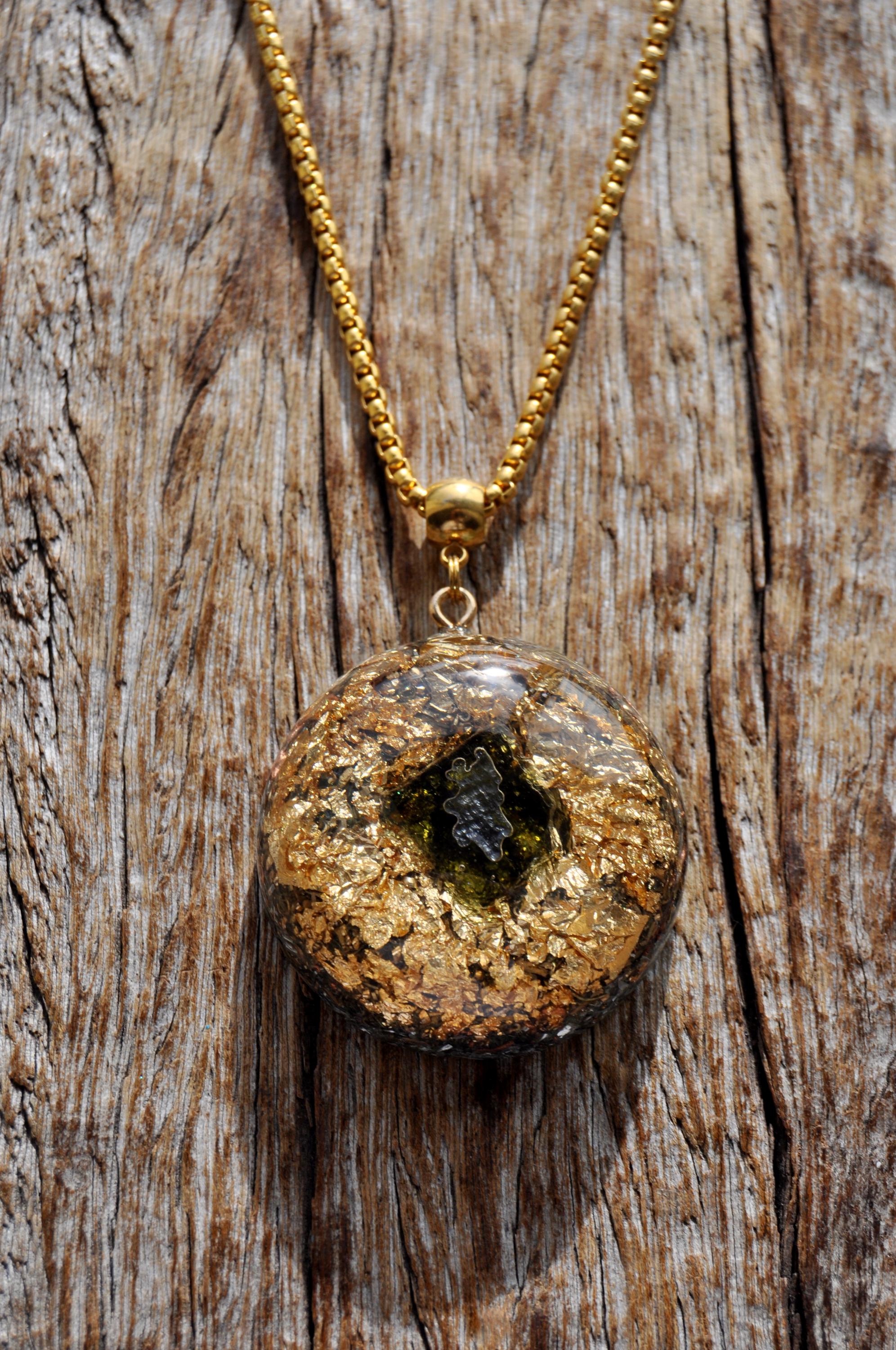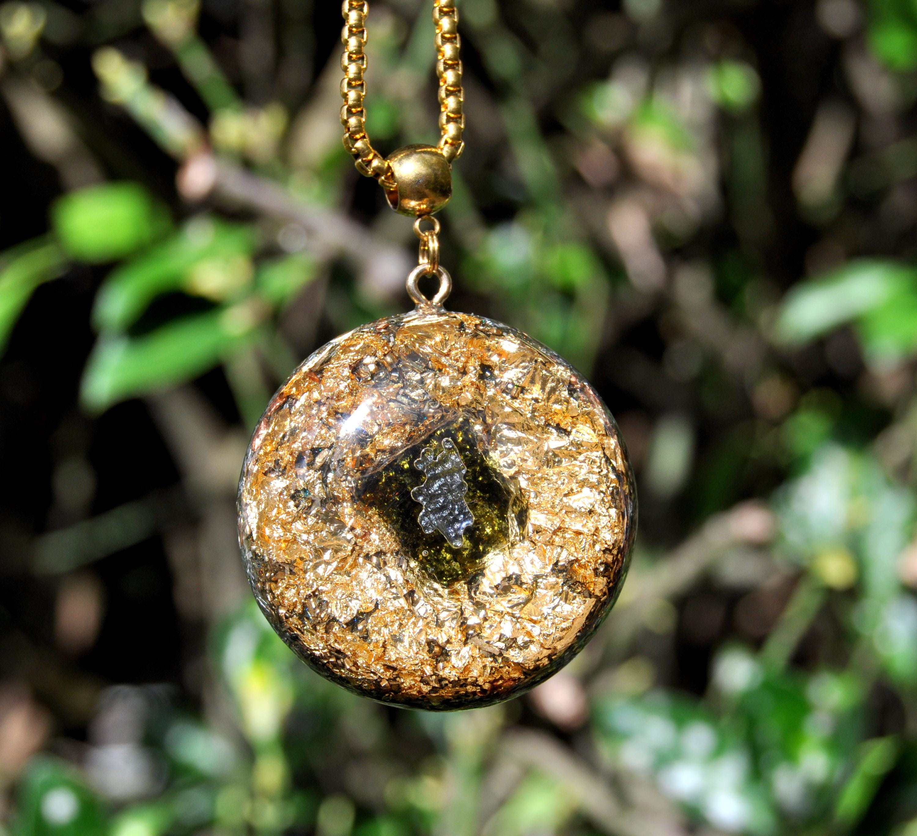 You'll get the exact pendant you see in the photos – no surprises. This stunning piece measures about 4.2 cm (1.65 inches) and features a large 7.65 Carat real raw chunk of Moldavite from the Czech Republic – a generous piece that brings serious cosmic energy. It's surrounded by shiny 24K gold flakes for that extra sparkle and boost.
