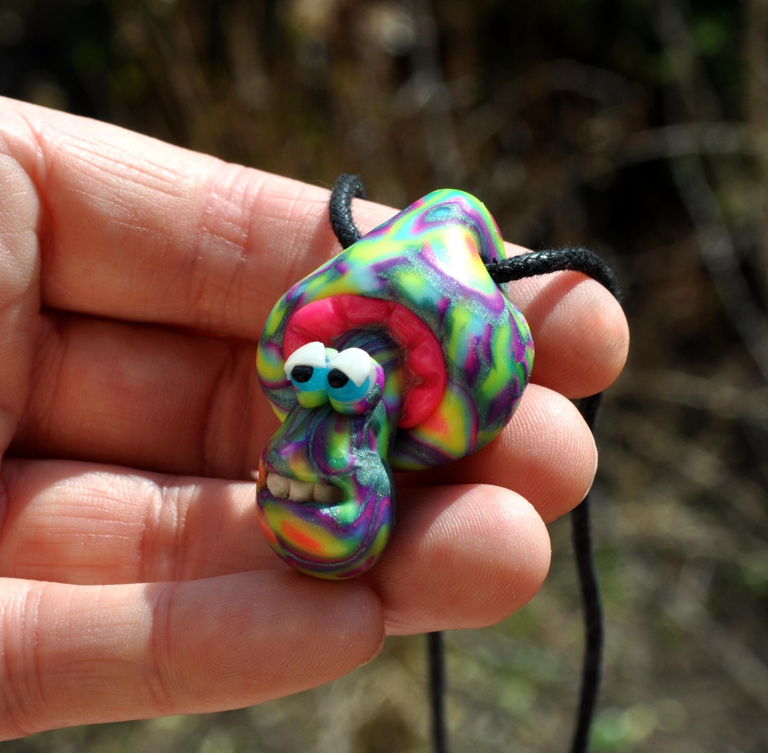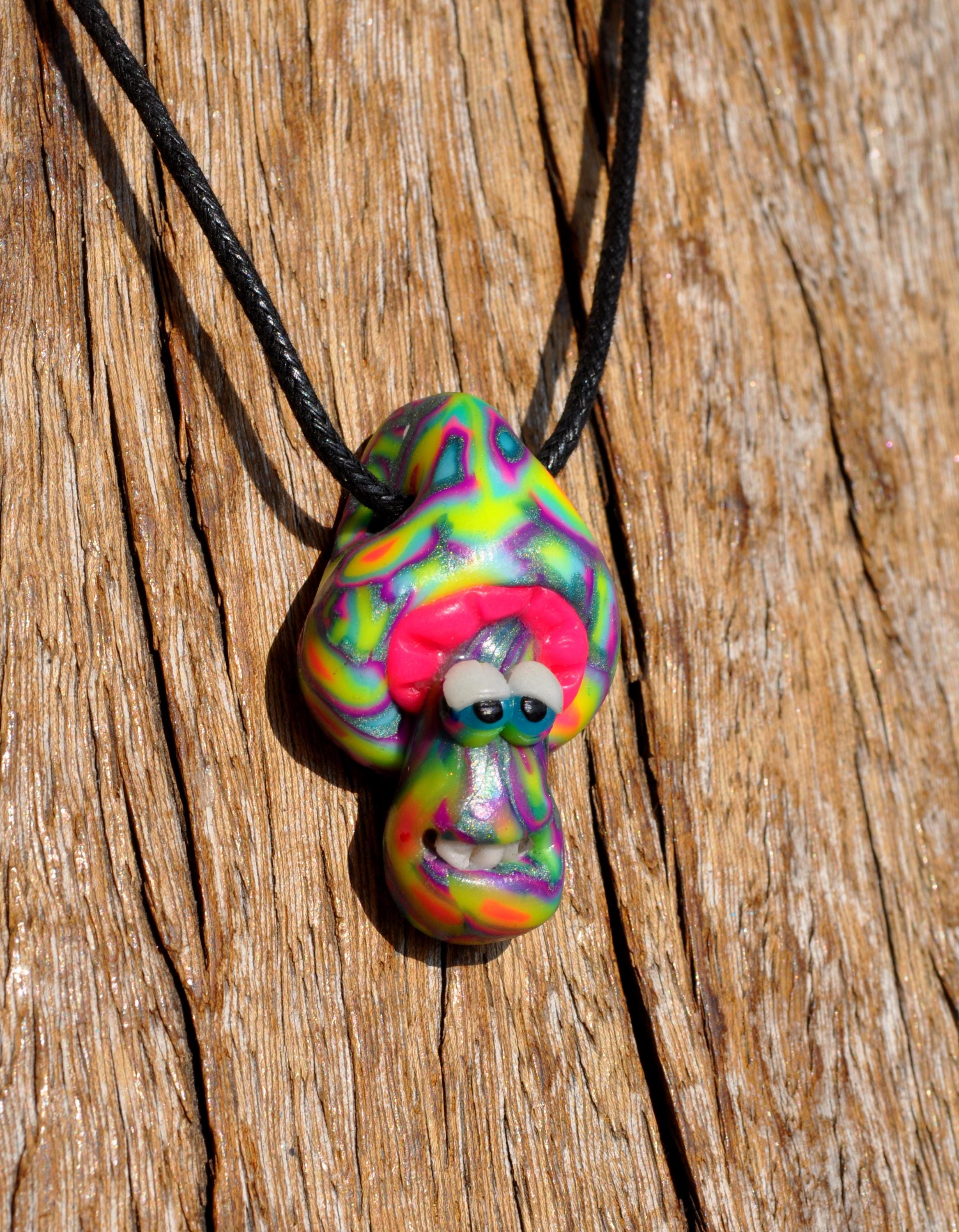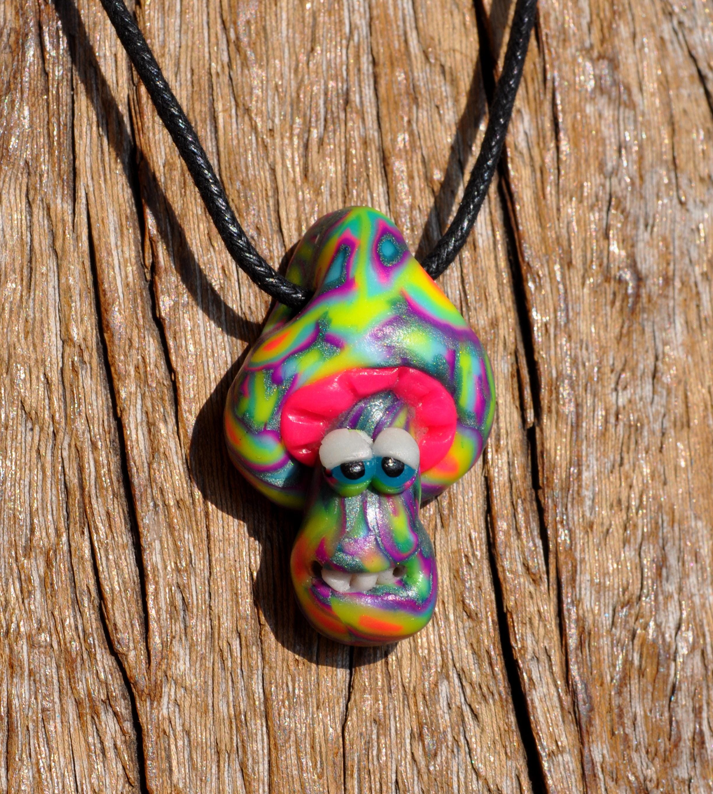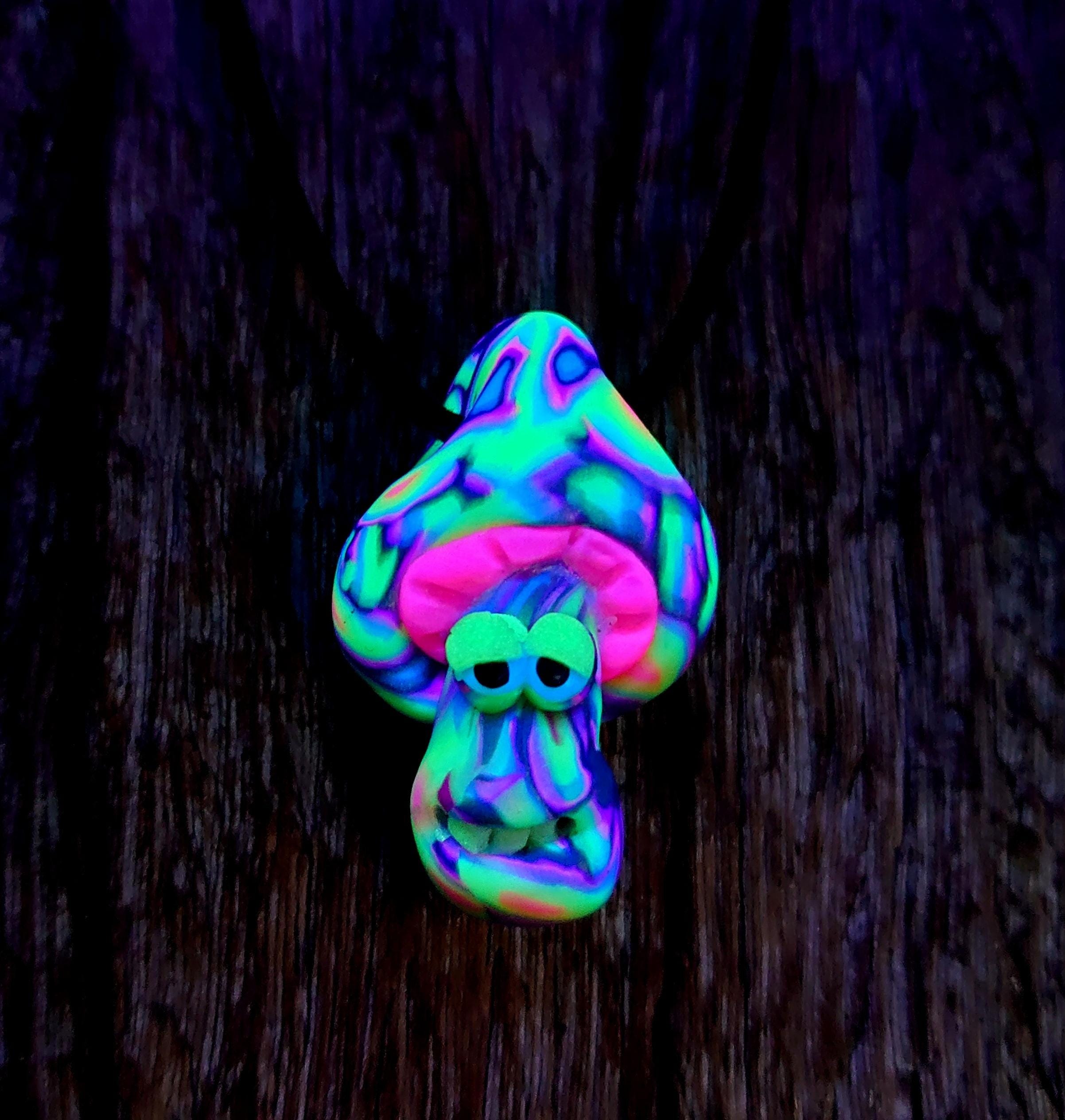 This cute mushroom is handsculpted out of durable good quality polymer clay. It looks nice during the day and it glows in blacklight.