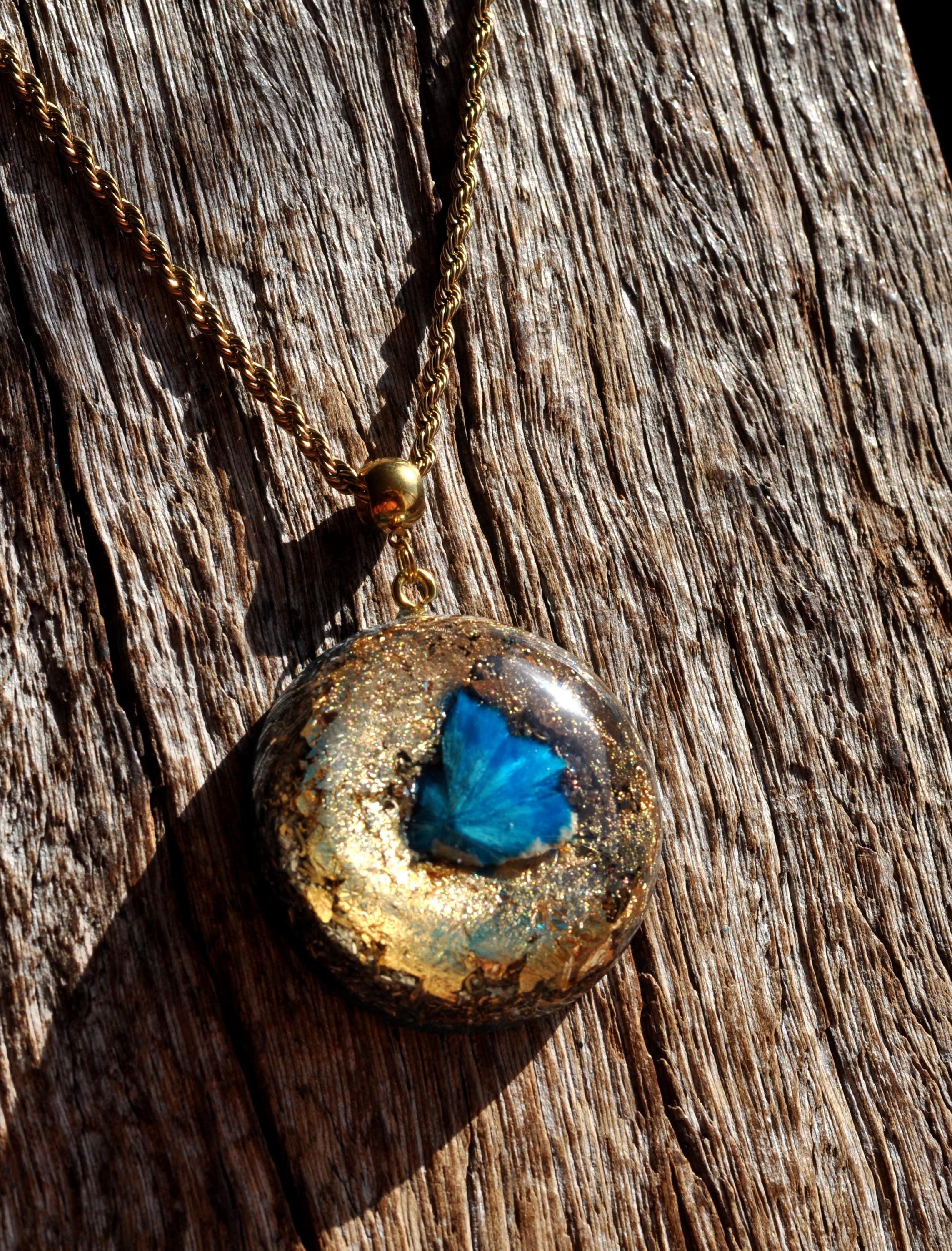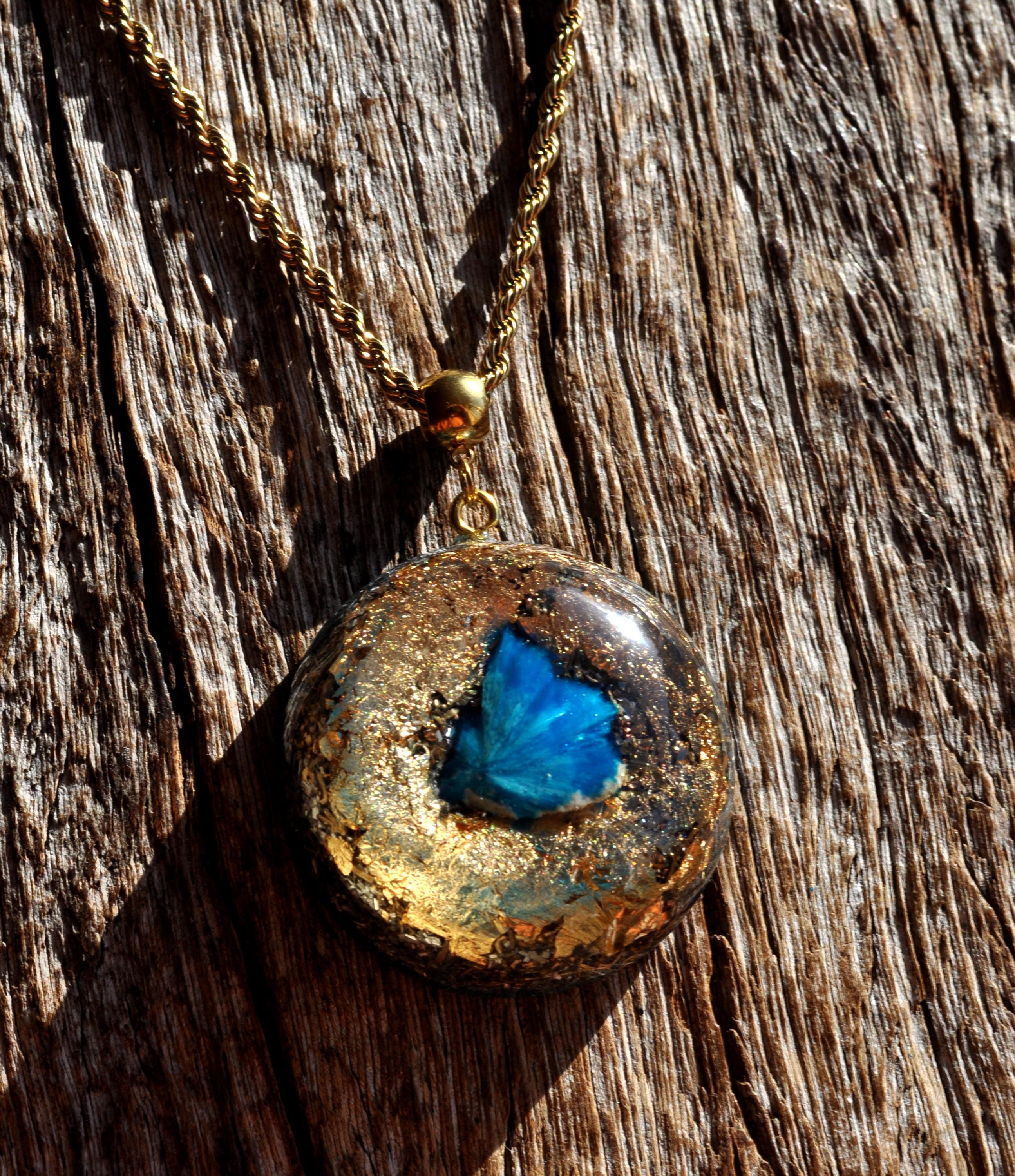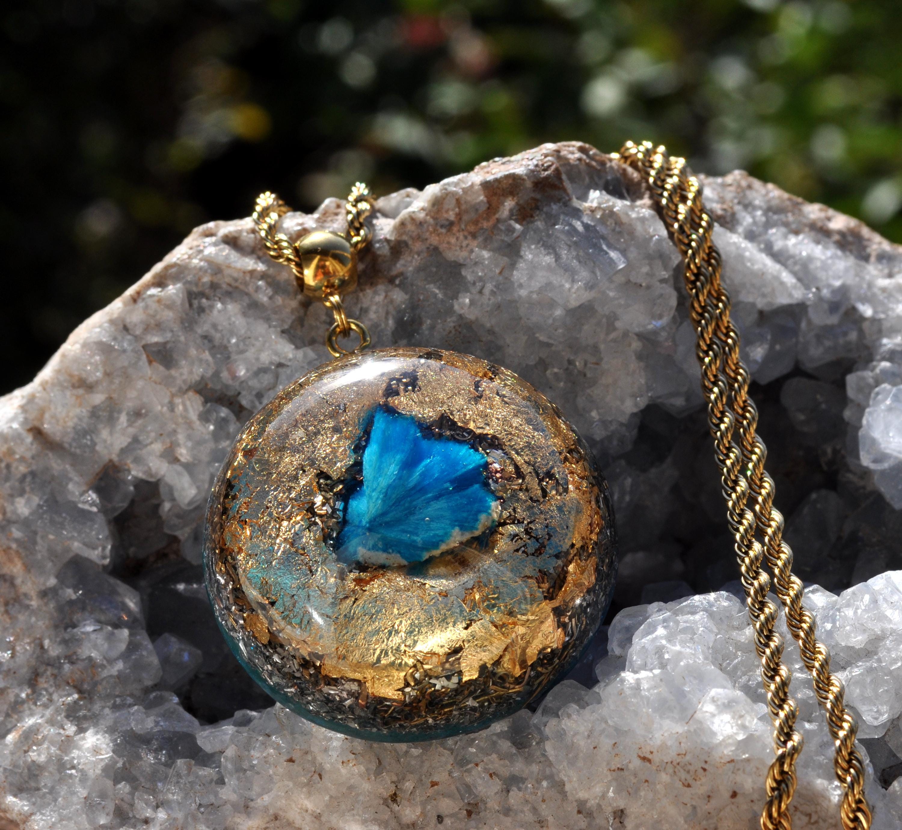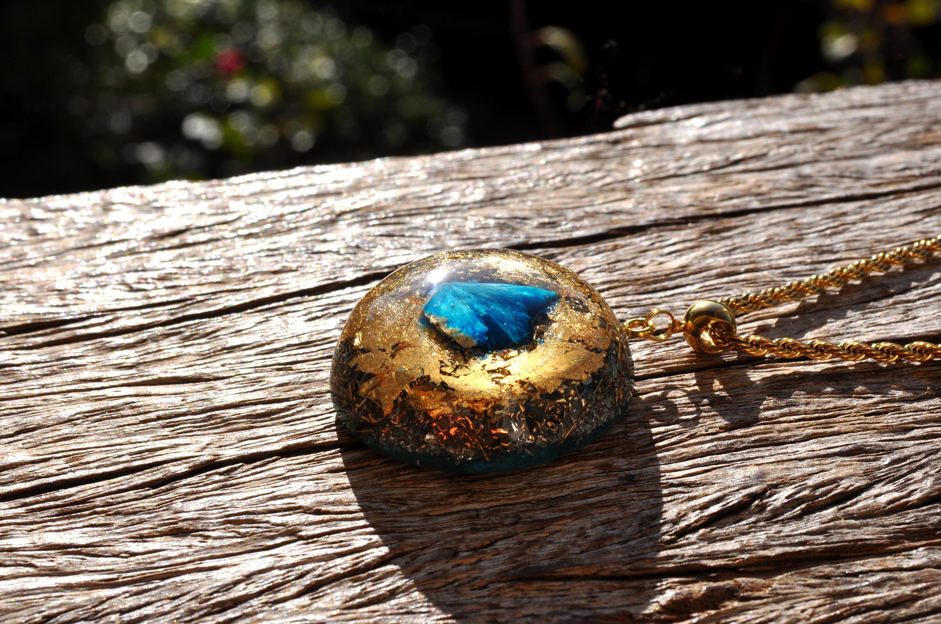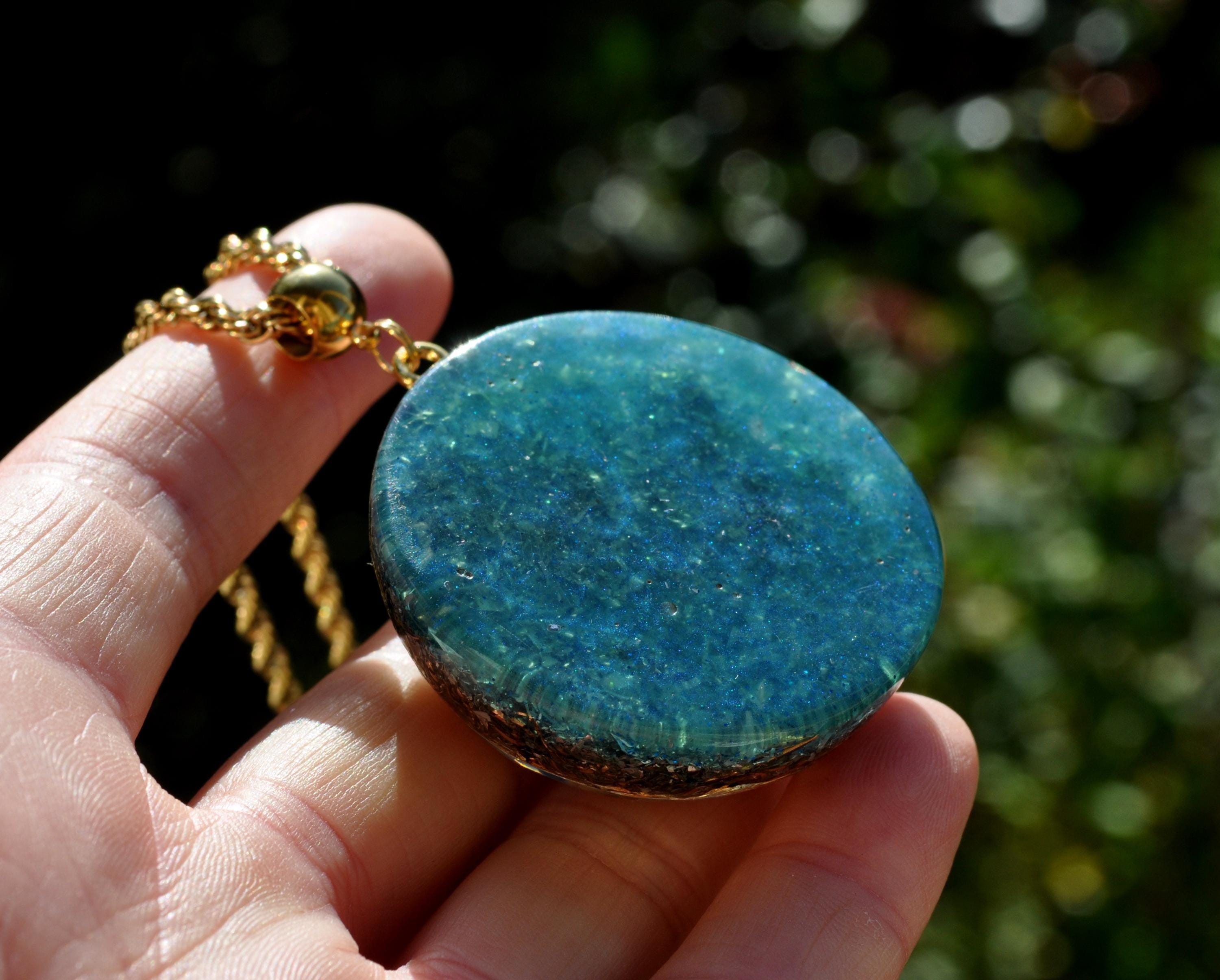 The pendant is designed with the principles of Orgone energy and Orgonite® in mind. Orgone, also referred to as Qi, Prana, Ether, or Akasha, is a universal life-force energy, and Orgonite® is a combination of resin, metal shavings, and quartz that is believed to harmonize and transform stagnant energy in your surroundings. The blend of organic resin and metal shavings attracts and balances energy, while the quartz contributes a piezoelectric effect, enhancing energy interaction within the piece.