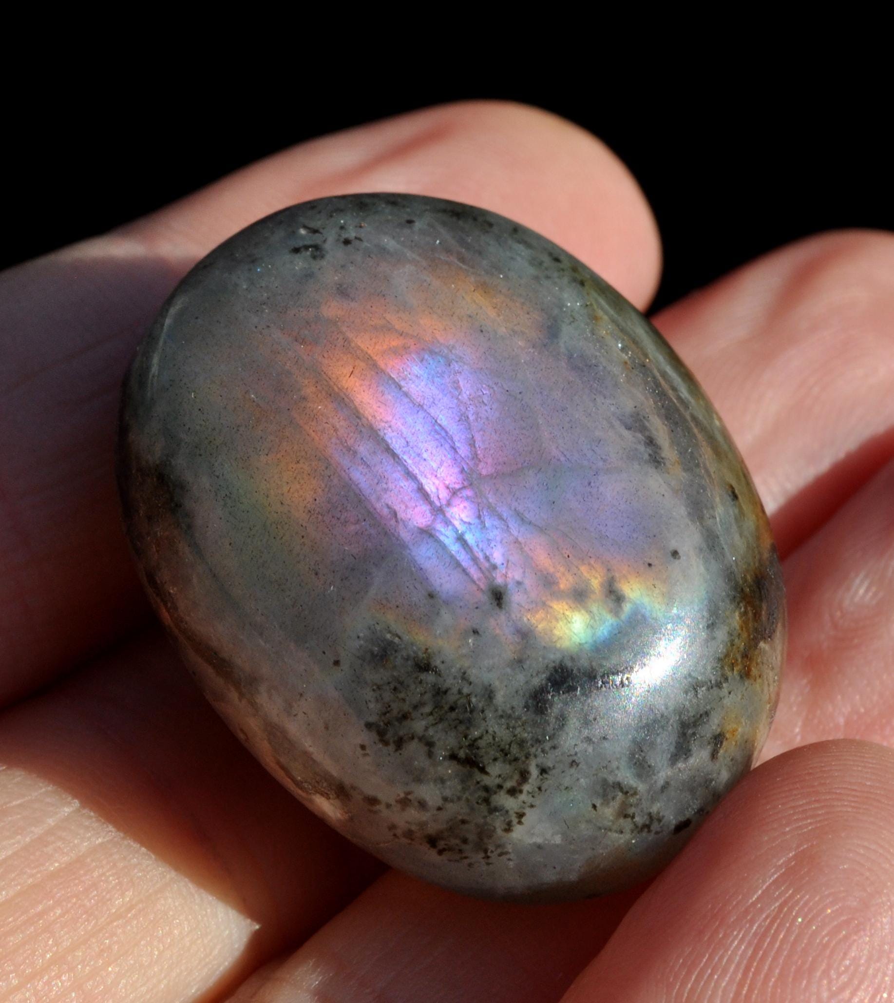 Lovely Labradorite pebble that has colorful flashes on both sides of the stone.