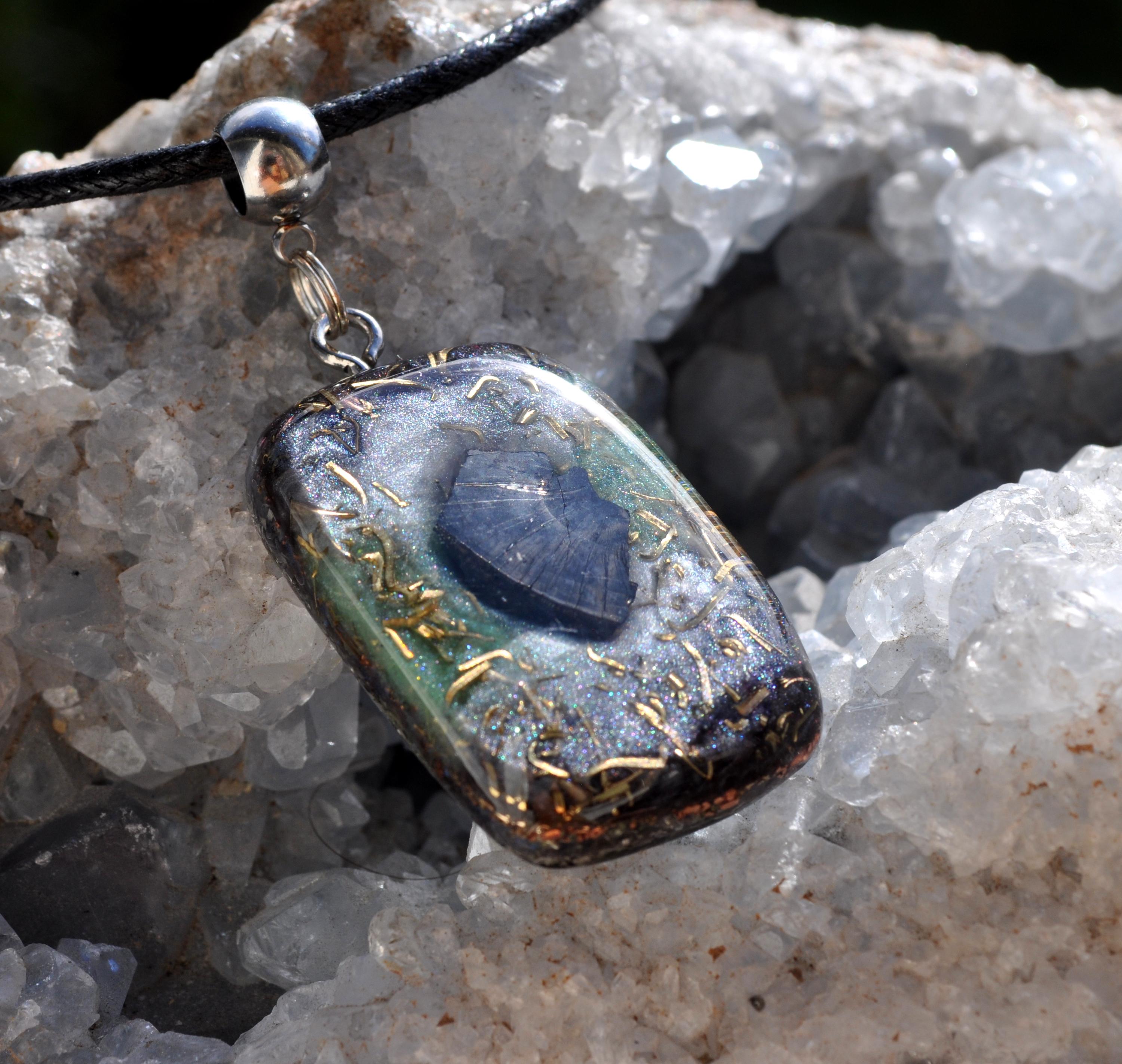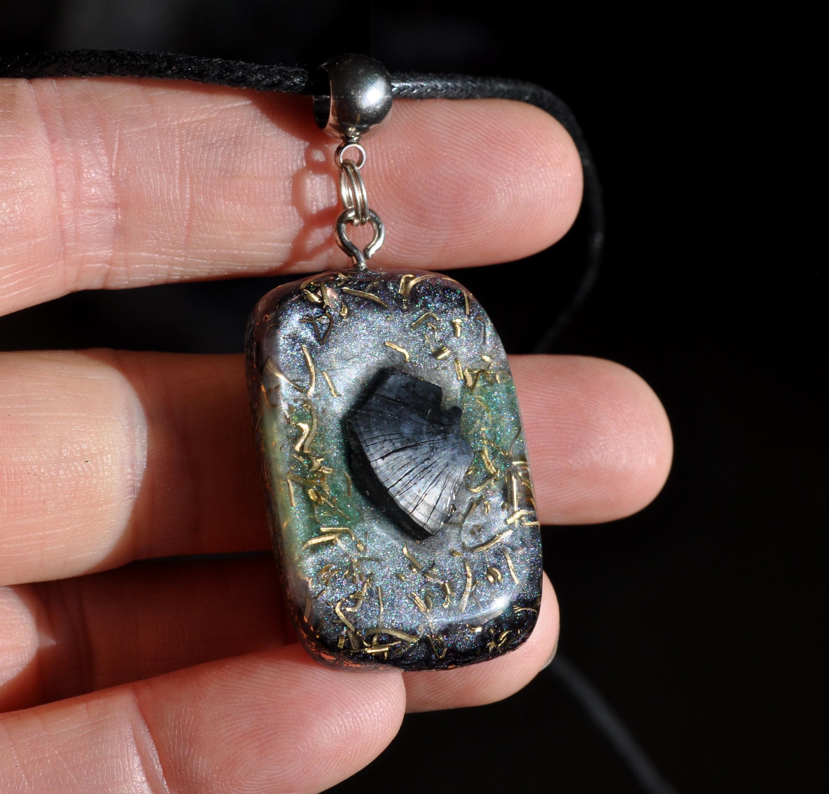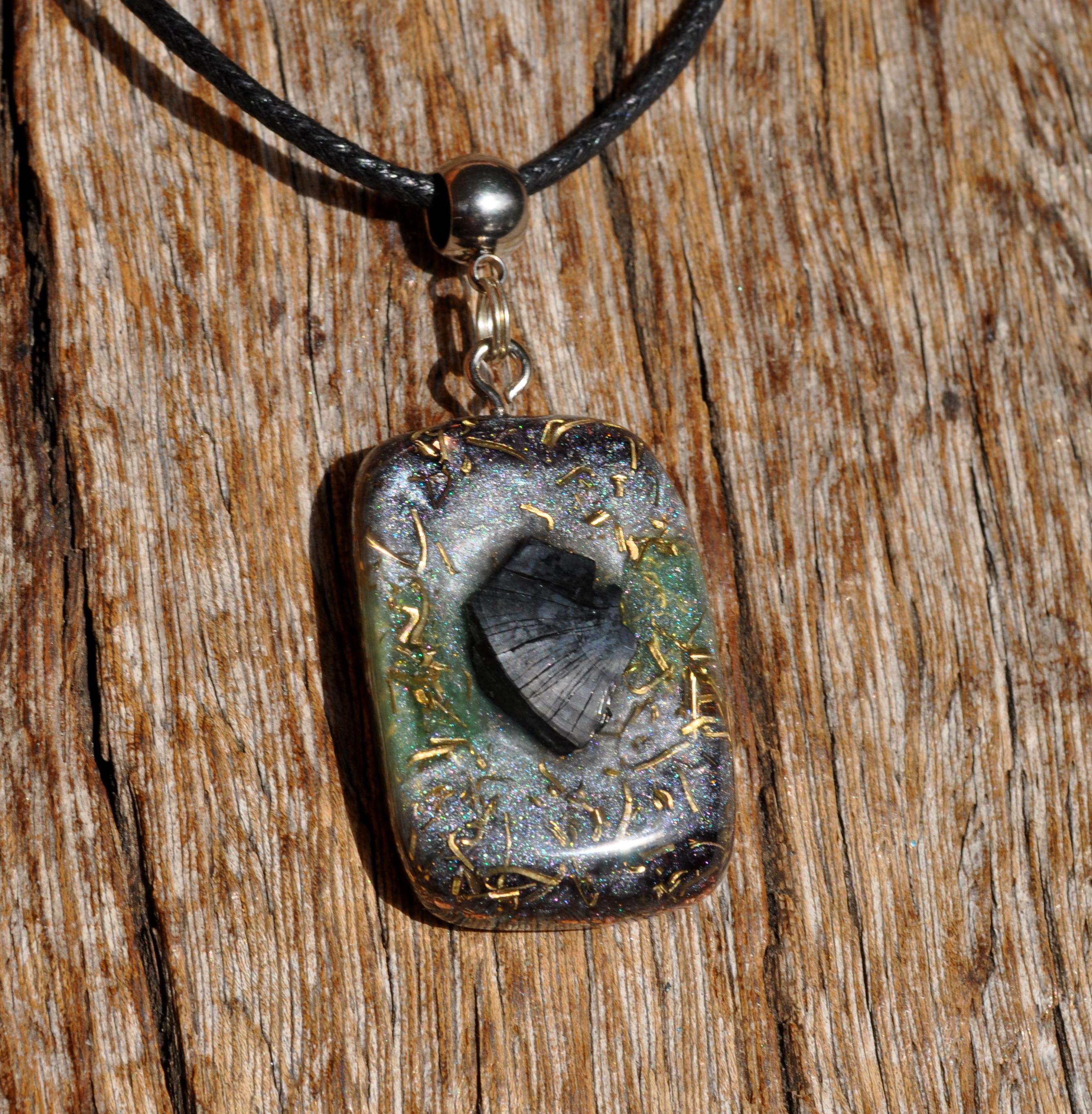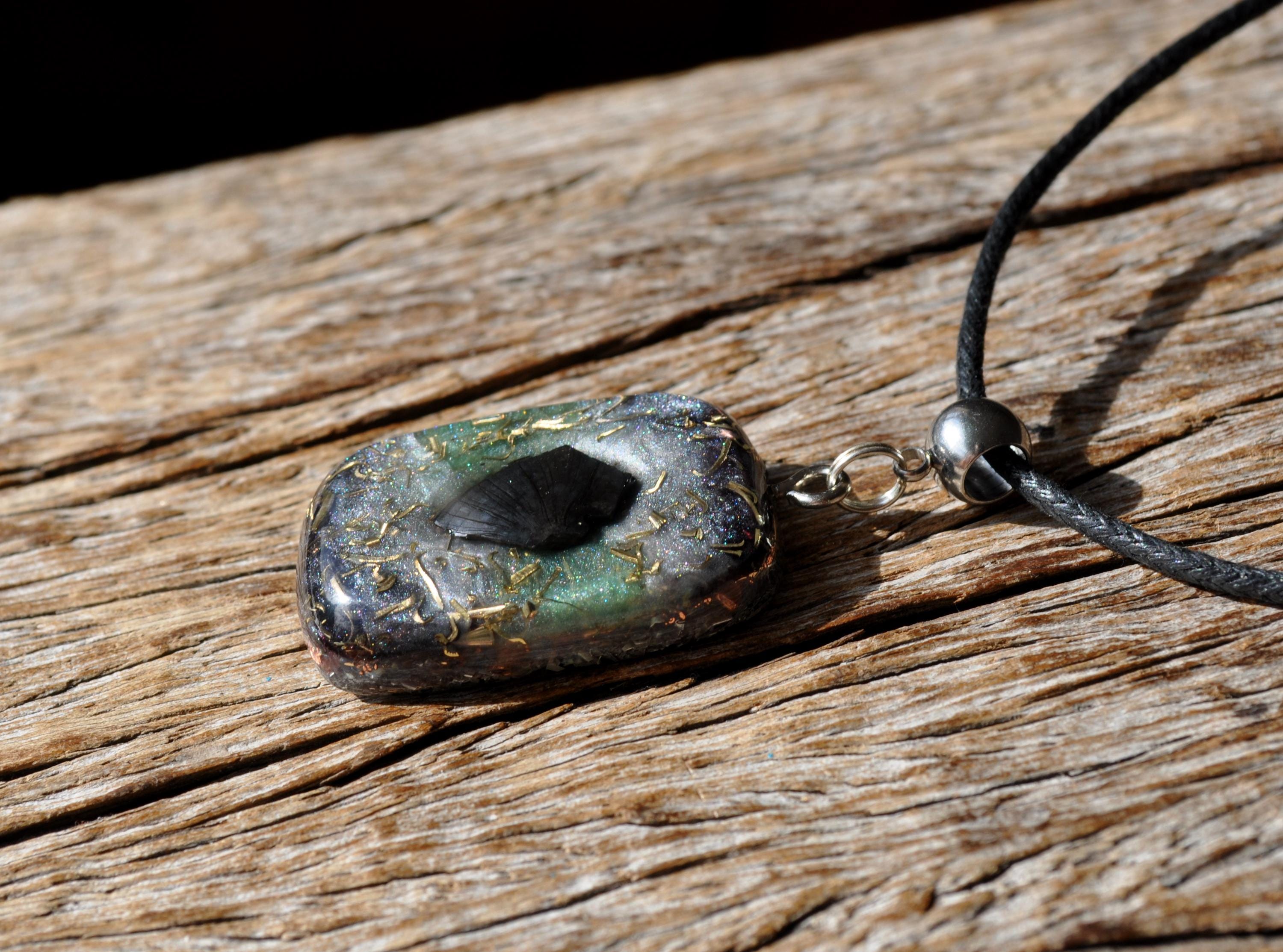 This one of a kind Orgonite® pendant features a raw Elite Shungite in the front laid in a some different colors. It contains brass, bronze, aluminium, copper shavings and comes on an adjustable strong cotton cord. The main stone is Elite Shungite crystals which you can see in the front. It furthermore consists of Rose Quartz (self - love), Pyrite (to enhance), black Tourmaline (to protect and ground excess energy), Selenite (to clean and charge), Rhodizite (to amplify the other crystals) and clear quartz (for piezo-electric effect) all within a durable resin setting.
