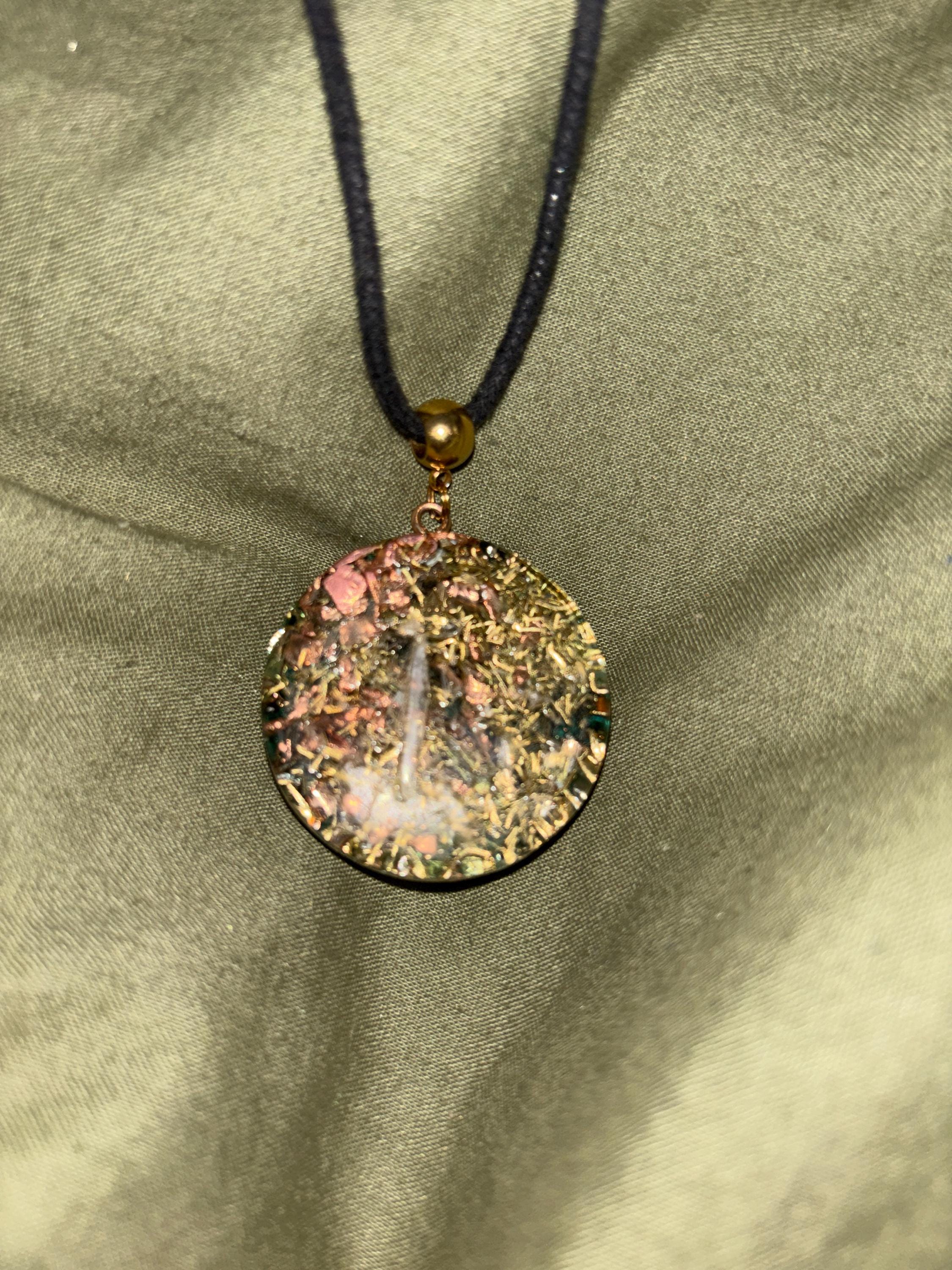 This orgonite pendant features a unique blend of crystals, each chosen for their beauty and energetic qualities: