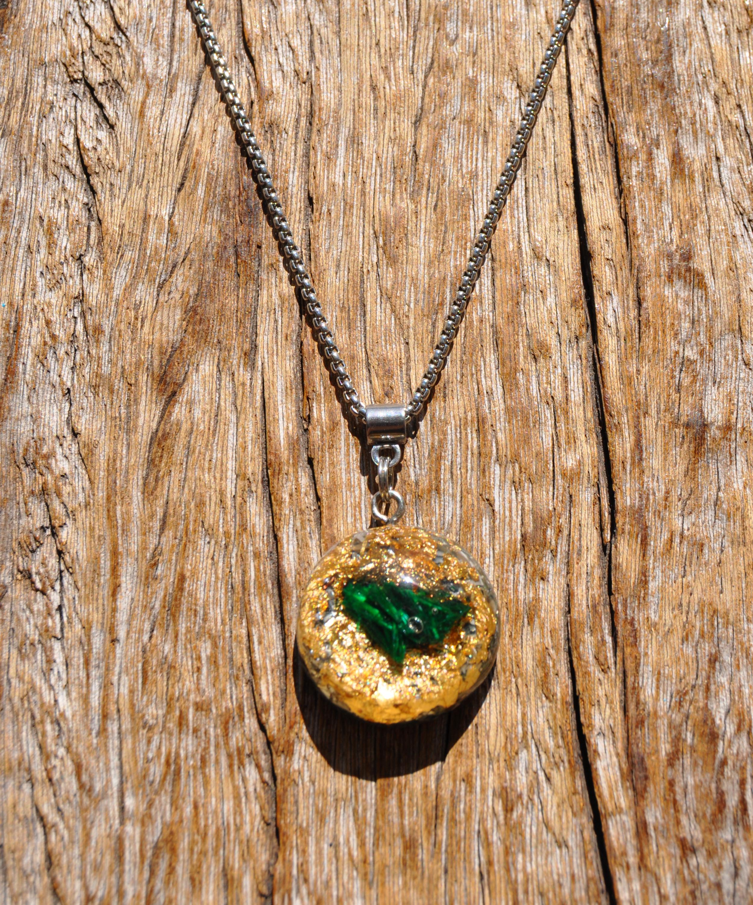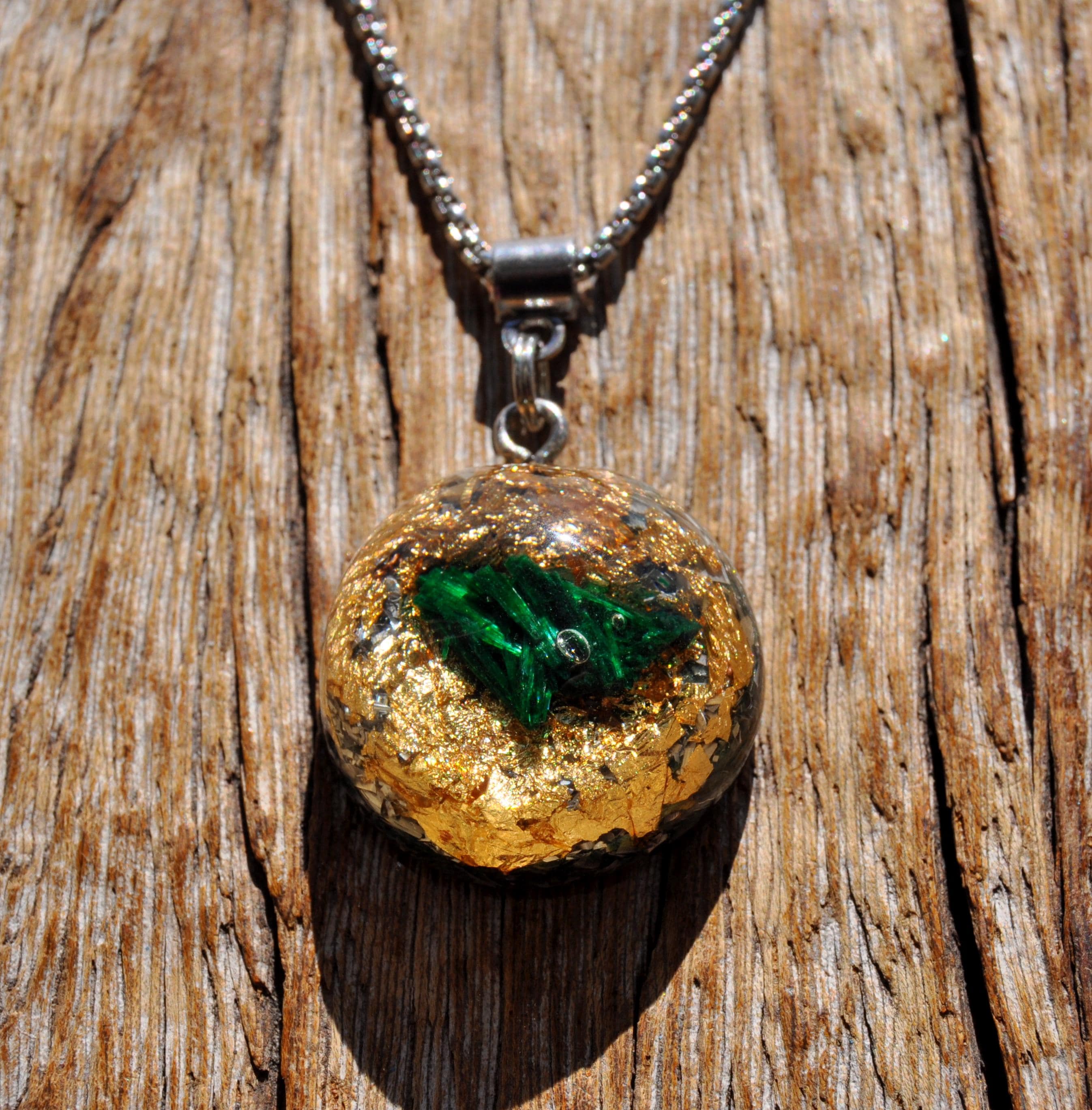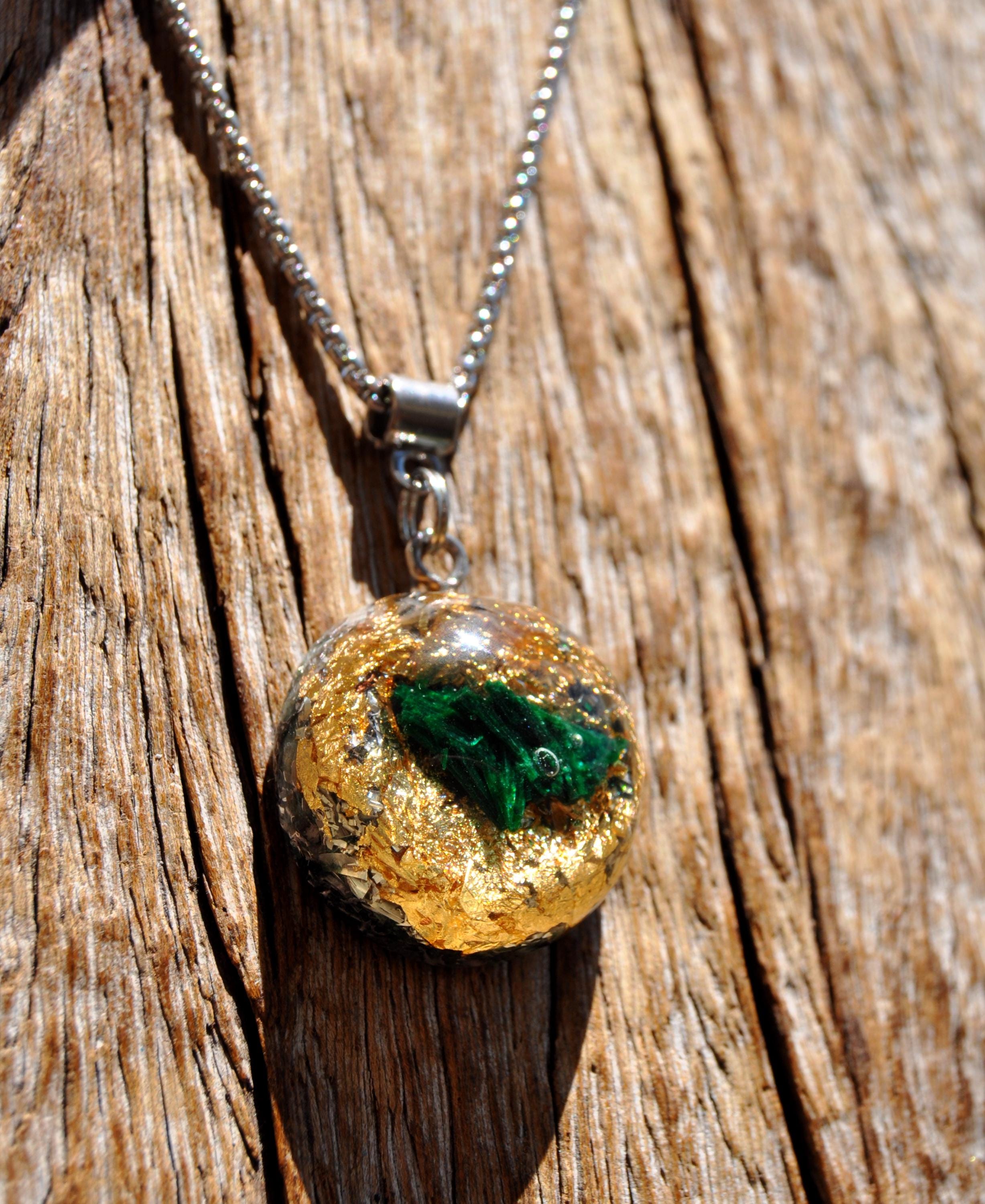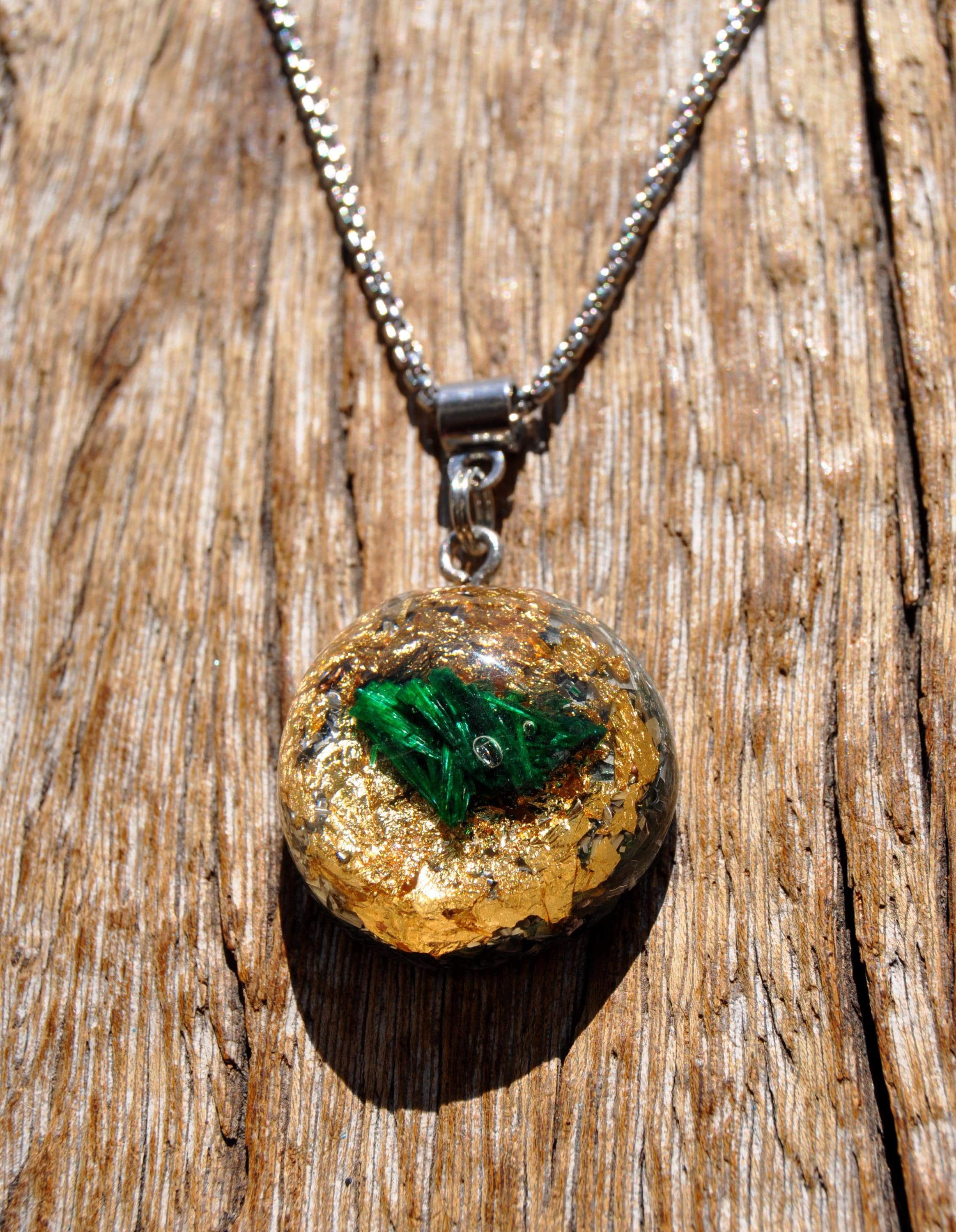 This handmade Orgonite® pendant features a beautiful silky malachite stone in the center, decorated with real 24K gold leaf. Each pendant is carefully crafted to create a piece that feels unique, natural, and full of character.