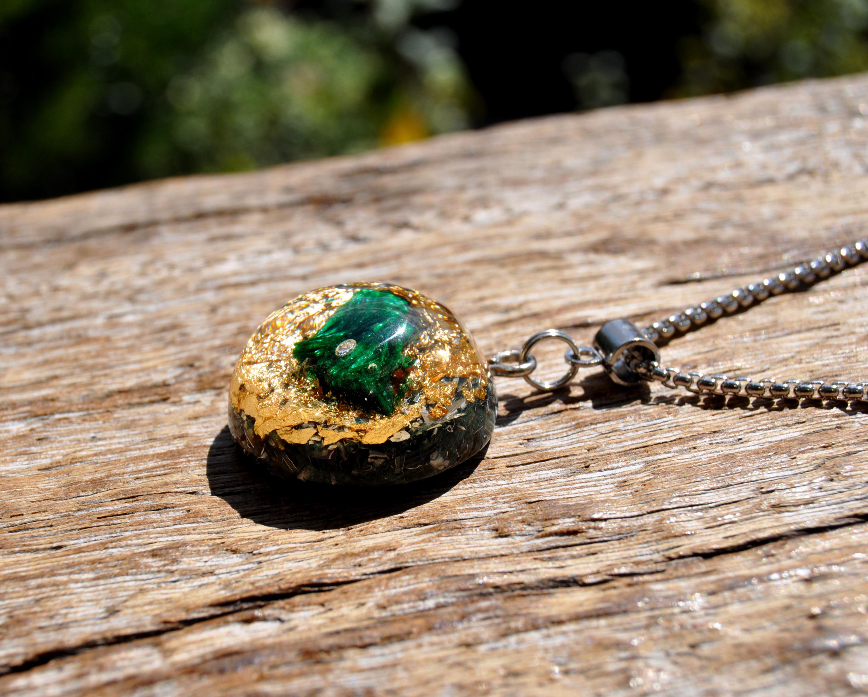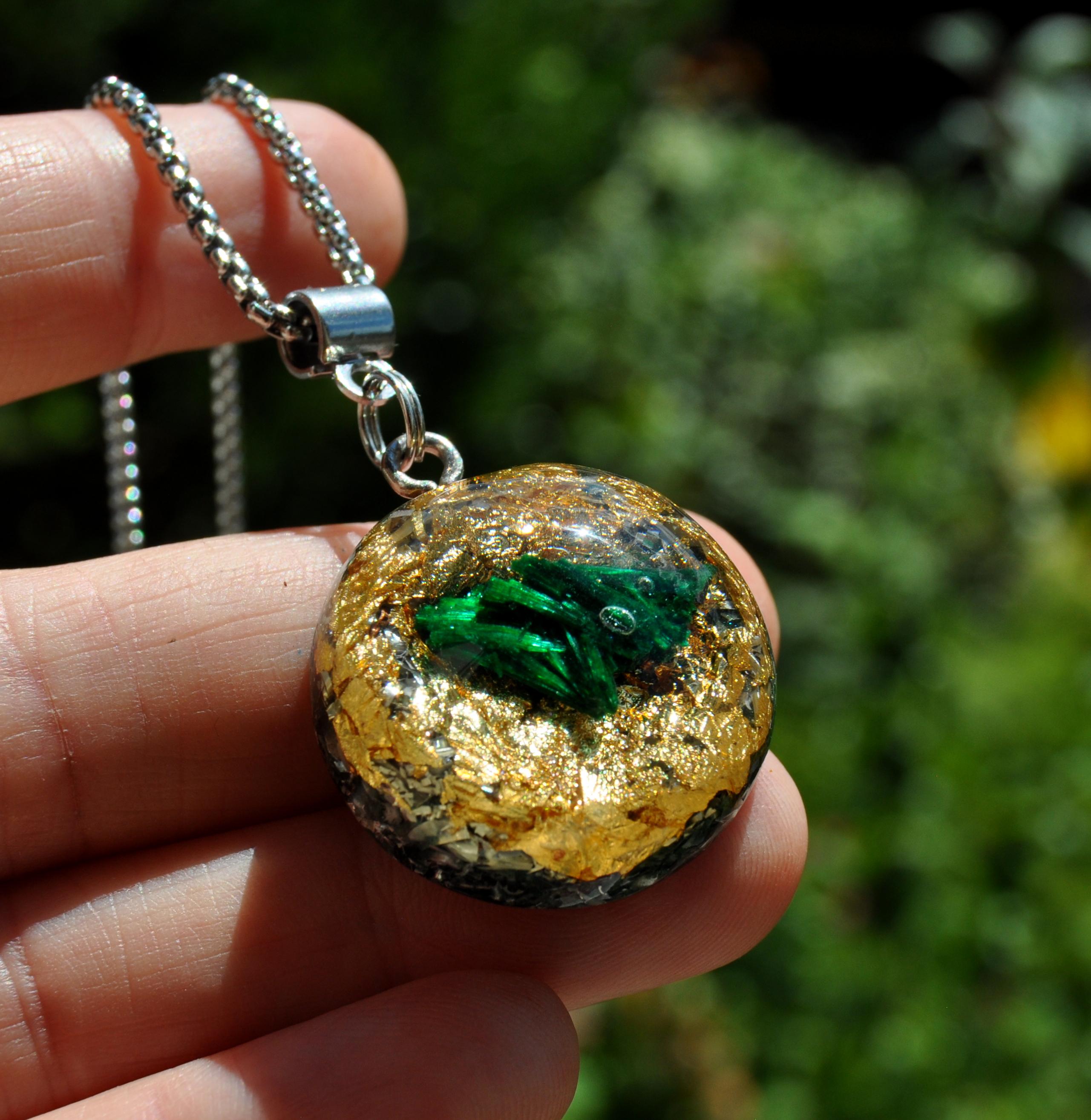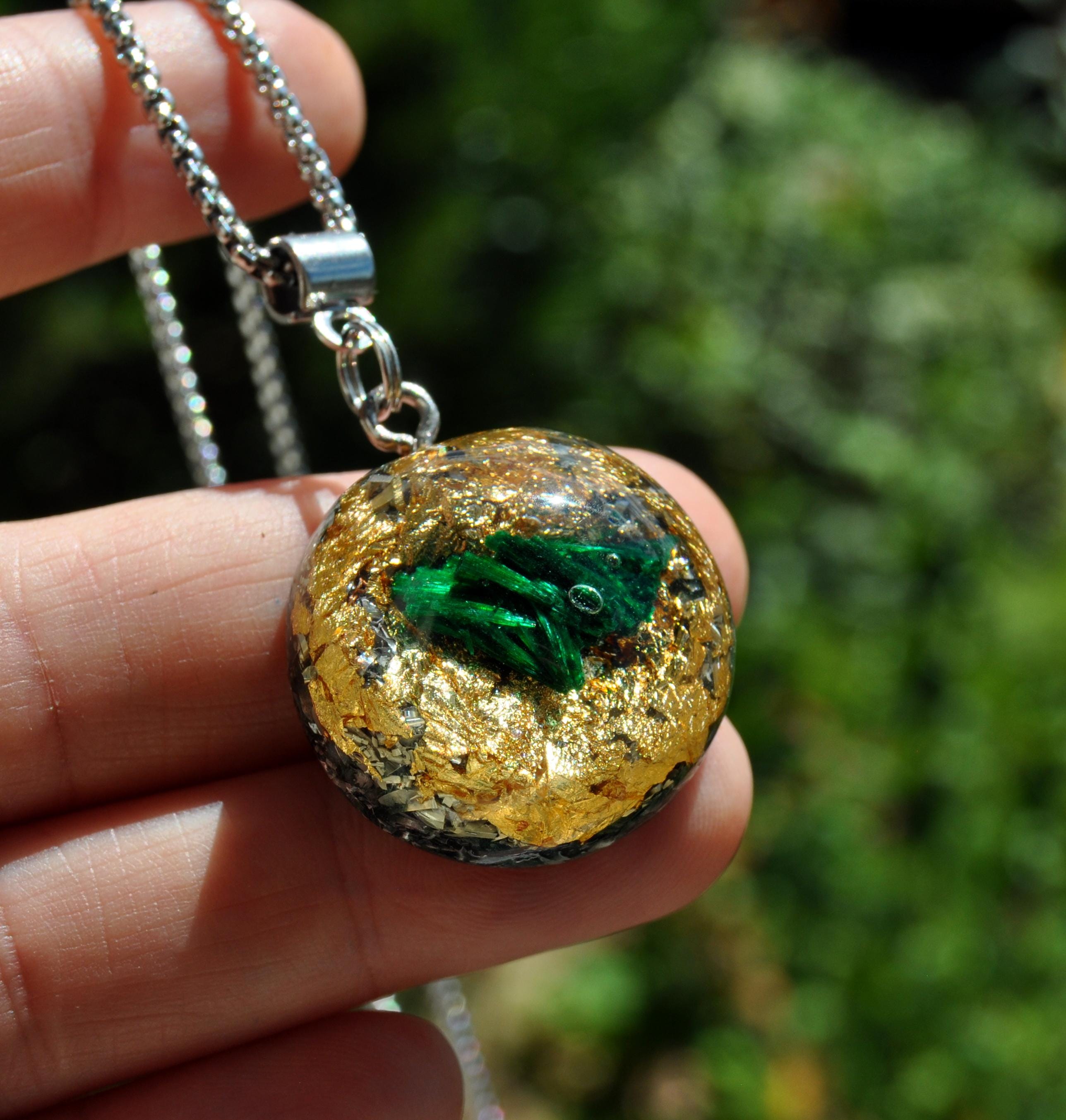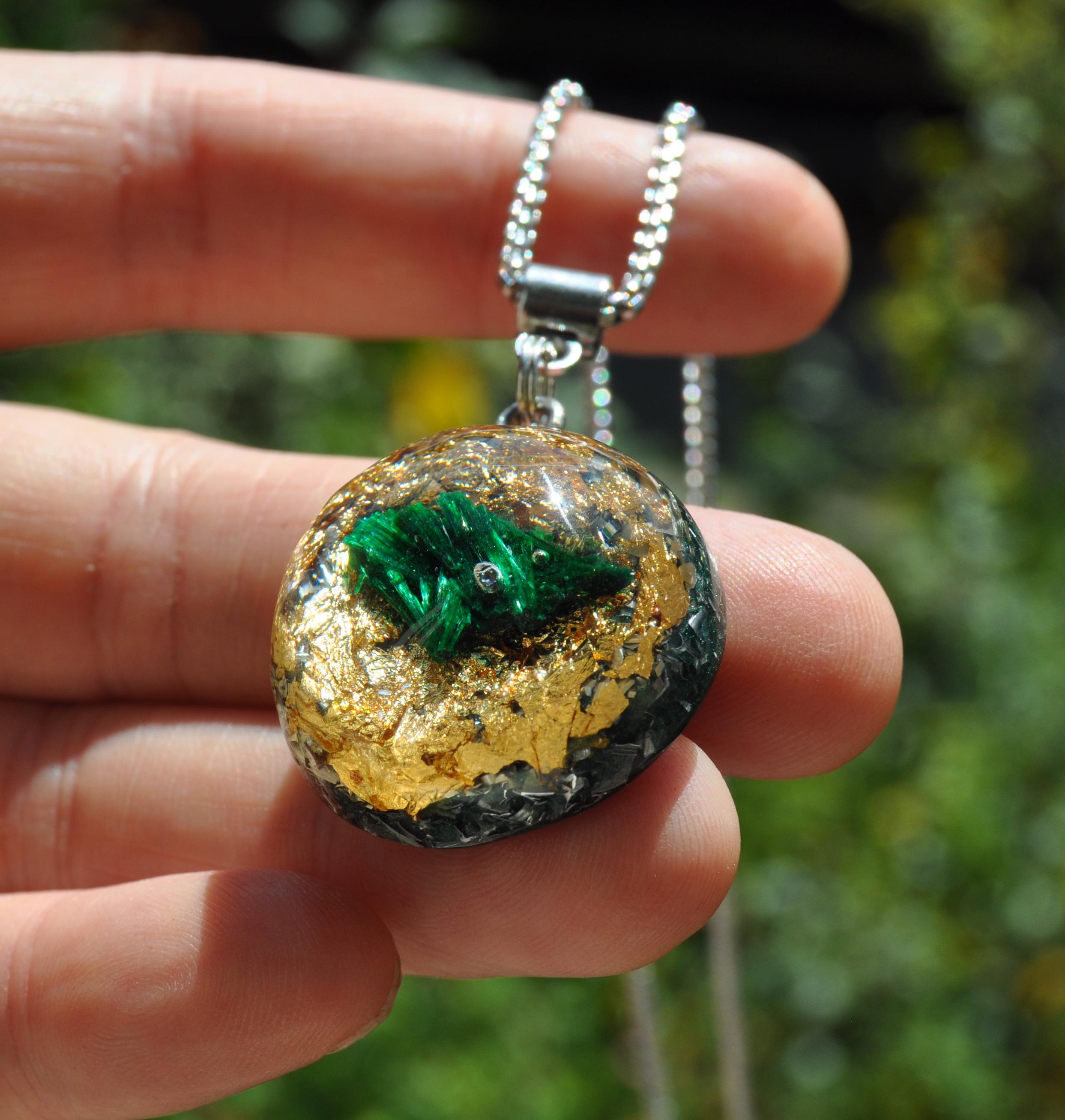 This silky malachite Orgonite® pendant is perfect for crystal lovers, spiritual jewelry collectors, or anyone looking for a beautiful, unique necklace with natural stones and energy-inspired design.