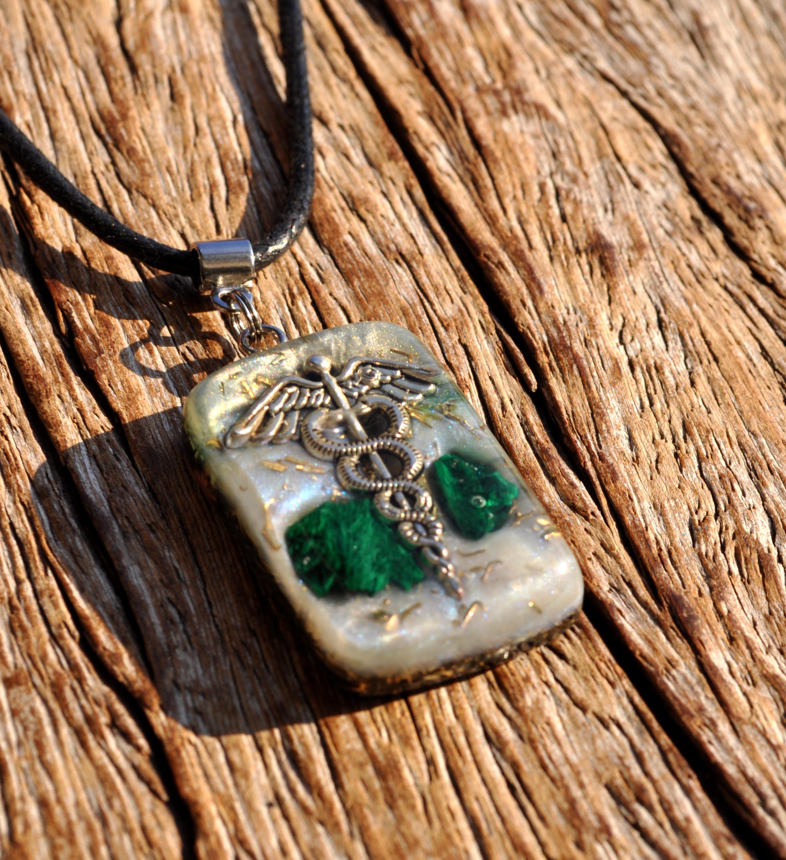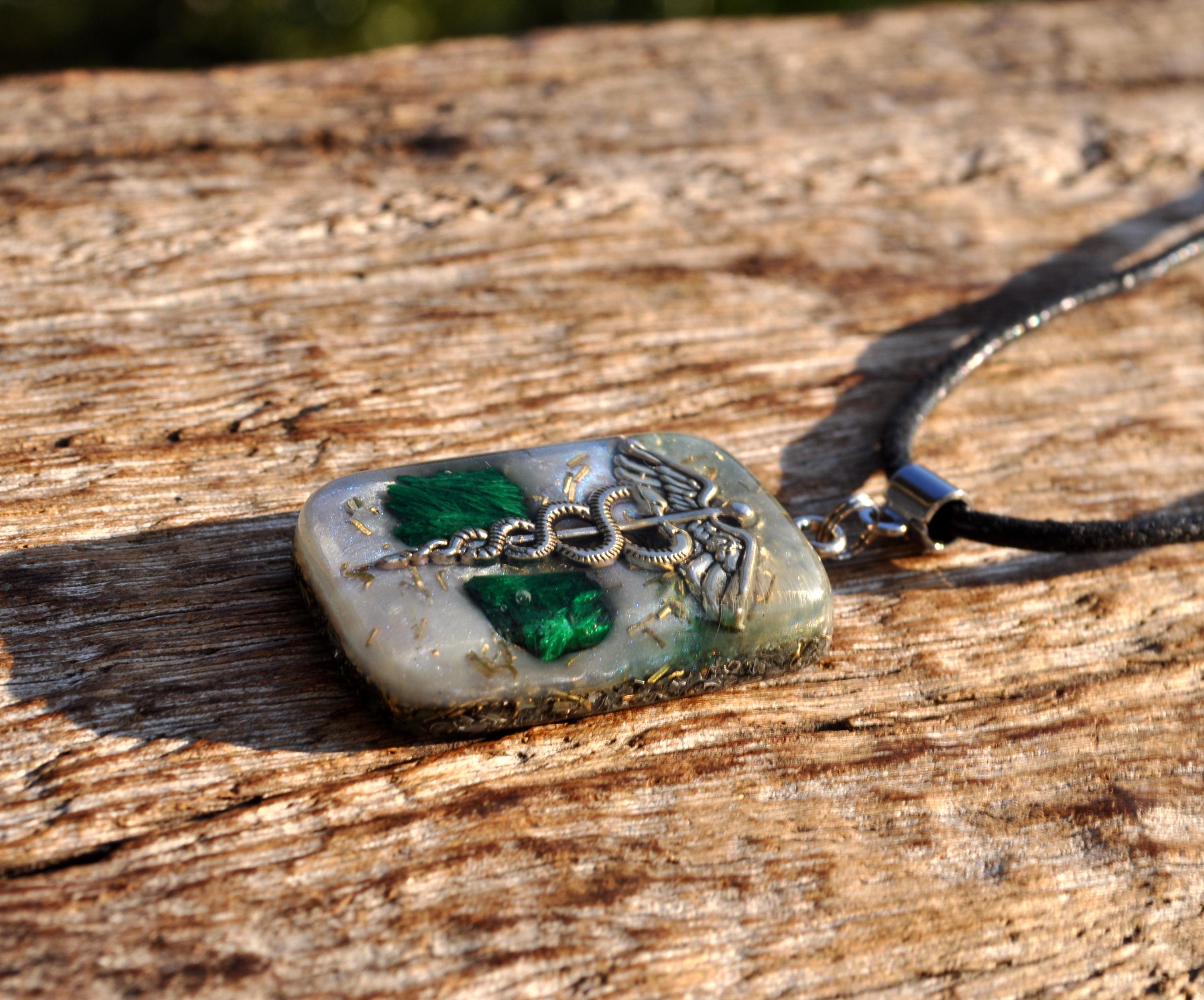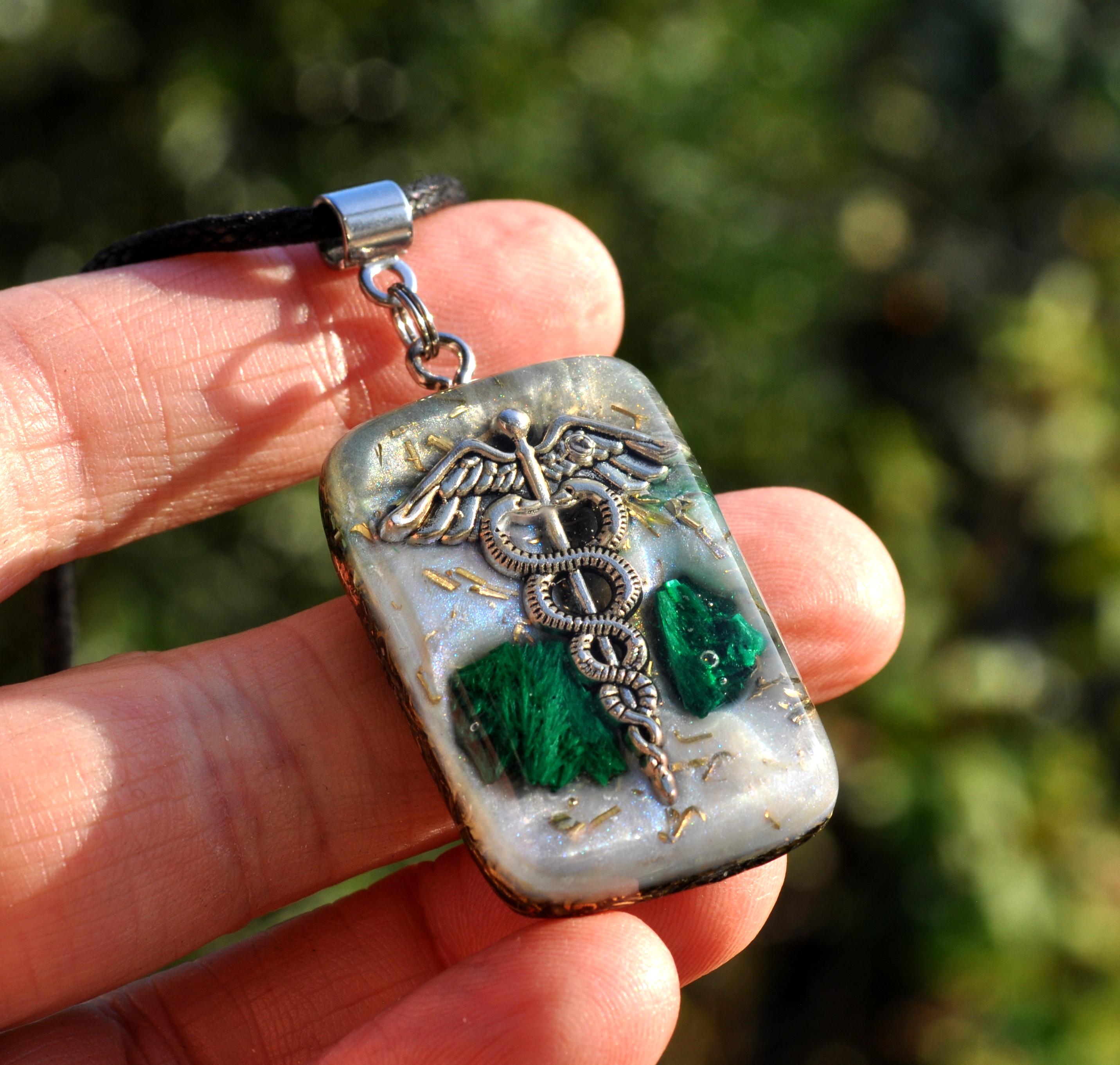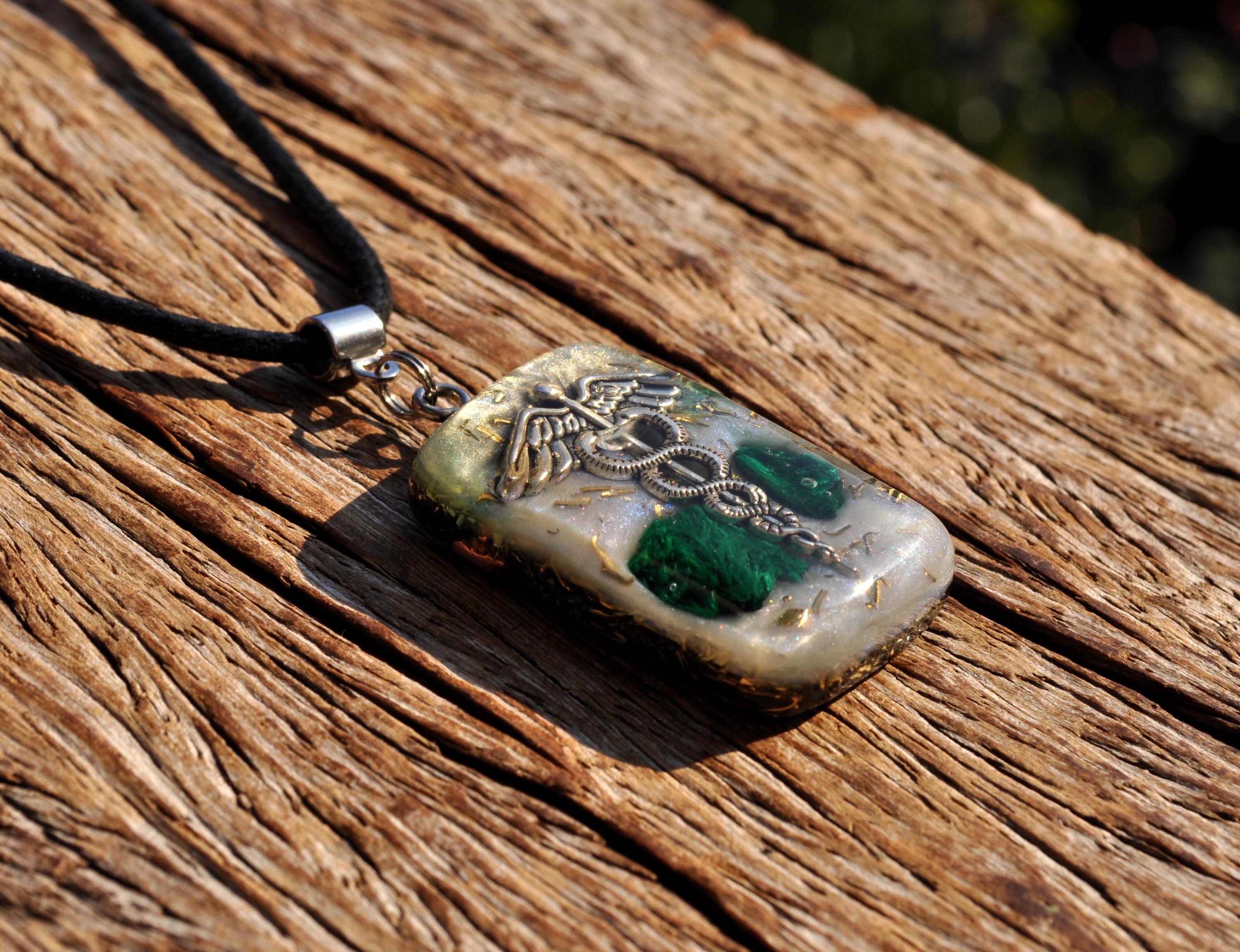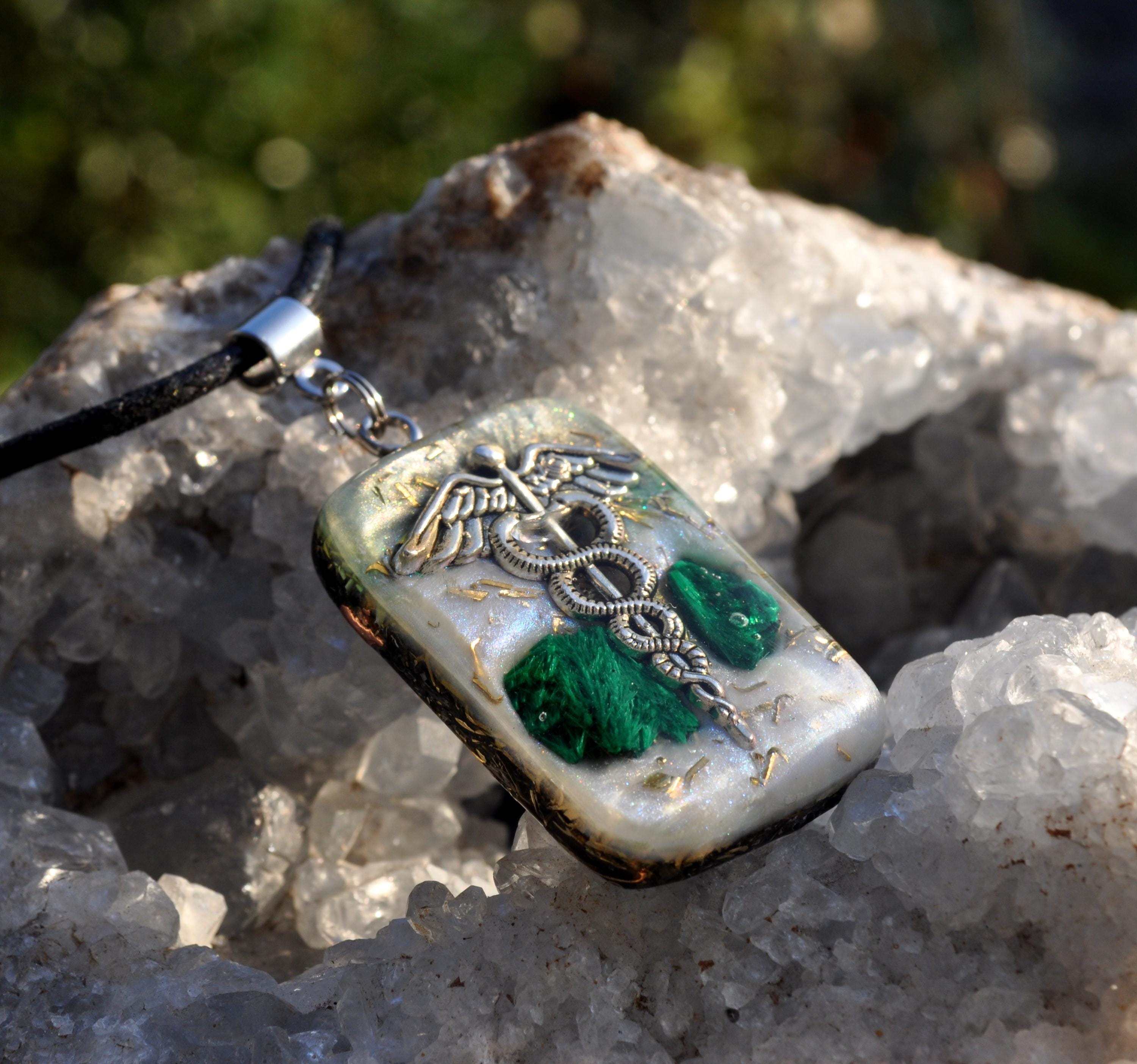 Discover a truly unique pendant featuring two stunning raw silk malachite crystals set prominently at the front, beautifully complementing the intricately designed Caduceus symbol—also known as Kundalini. This eye-catching pendant is encased in durable, high-quality resin, creating a vibrant, multicolored backdrop reminiscent of an abstract painting. Crafted with a blend of powerful crystals and metal shavings, this pendant functions as an orgonite device inspired by Wilhelm Reich’s research, designed to promote energetic balance and harmony.