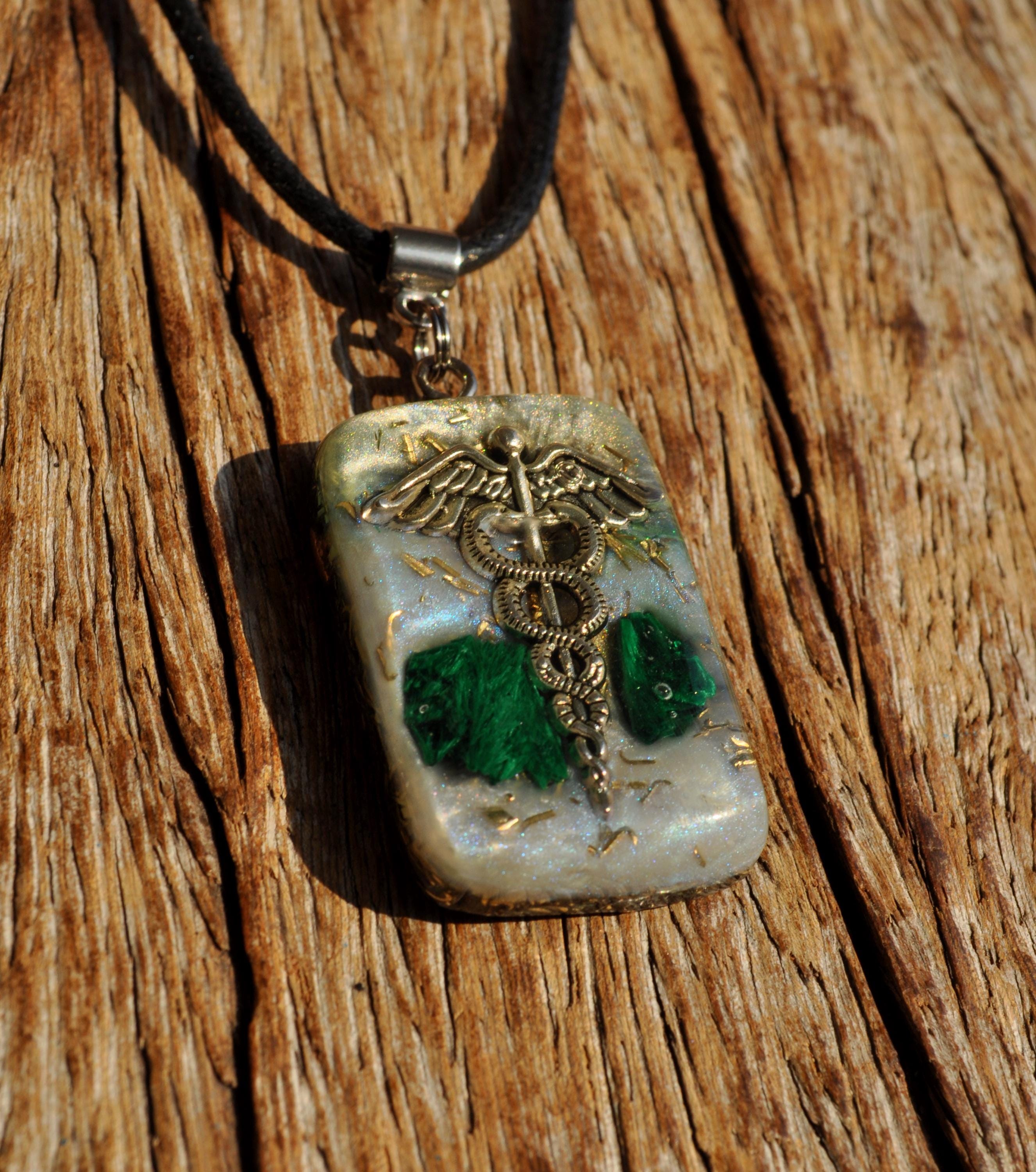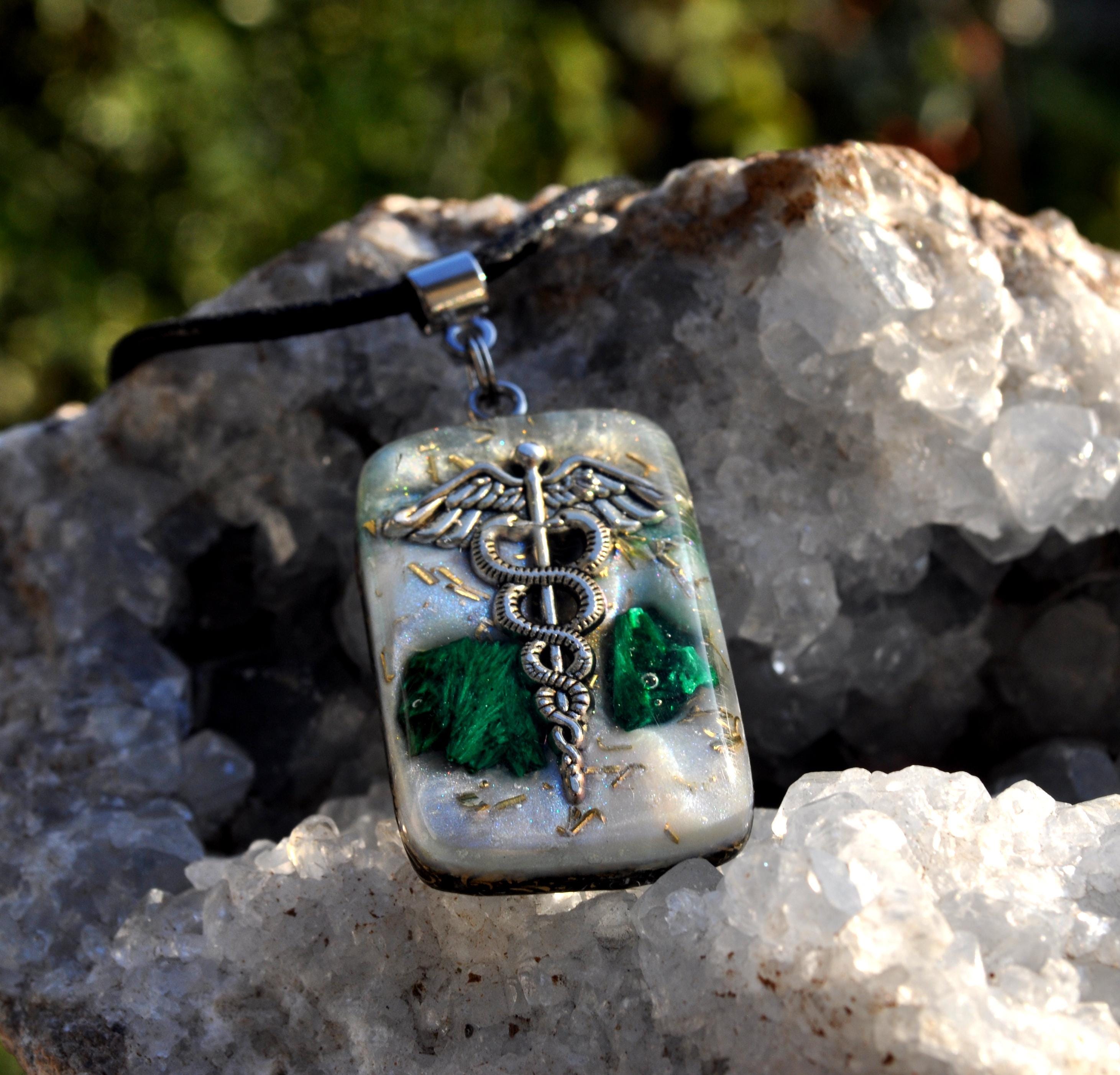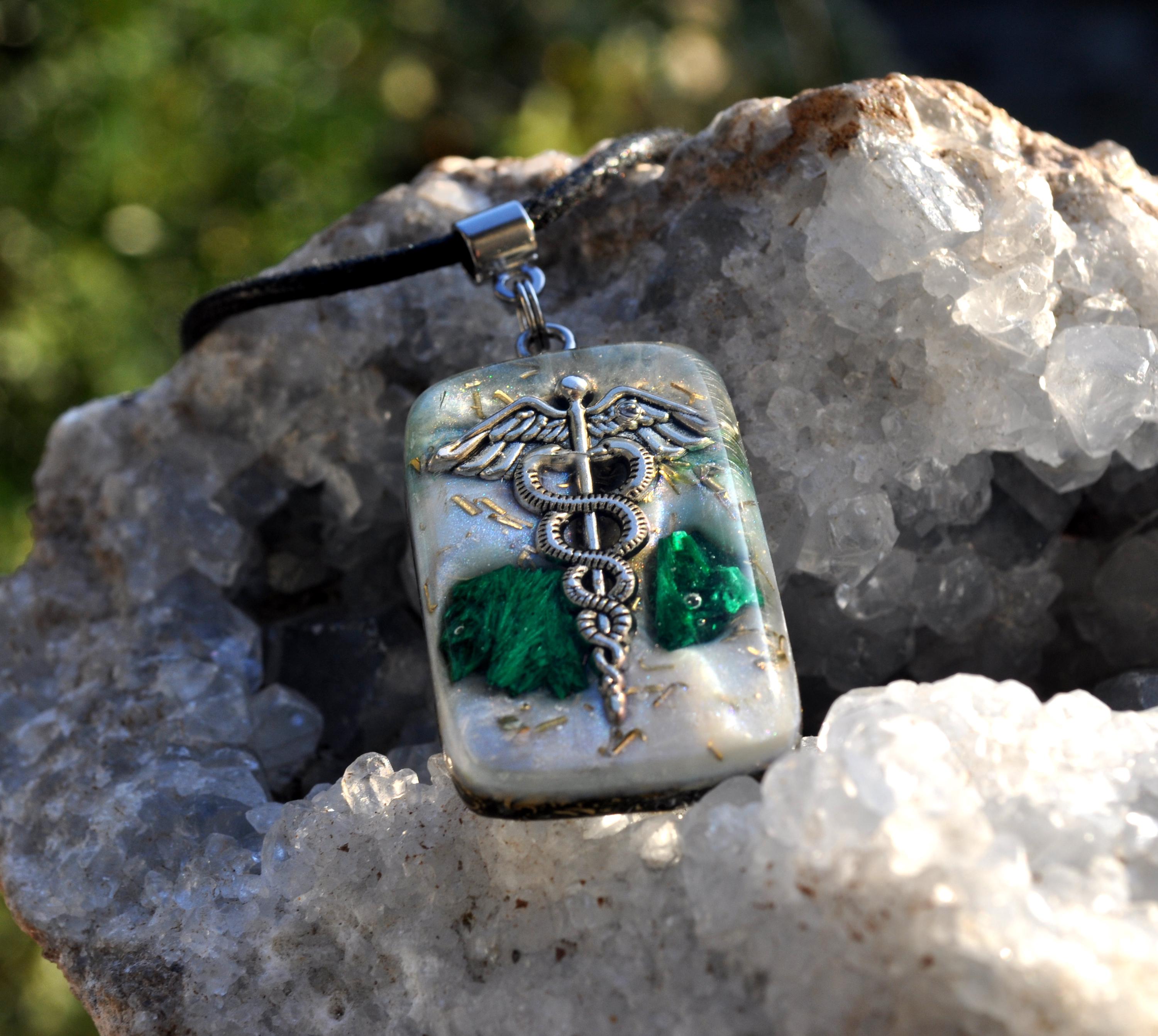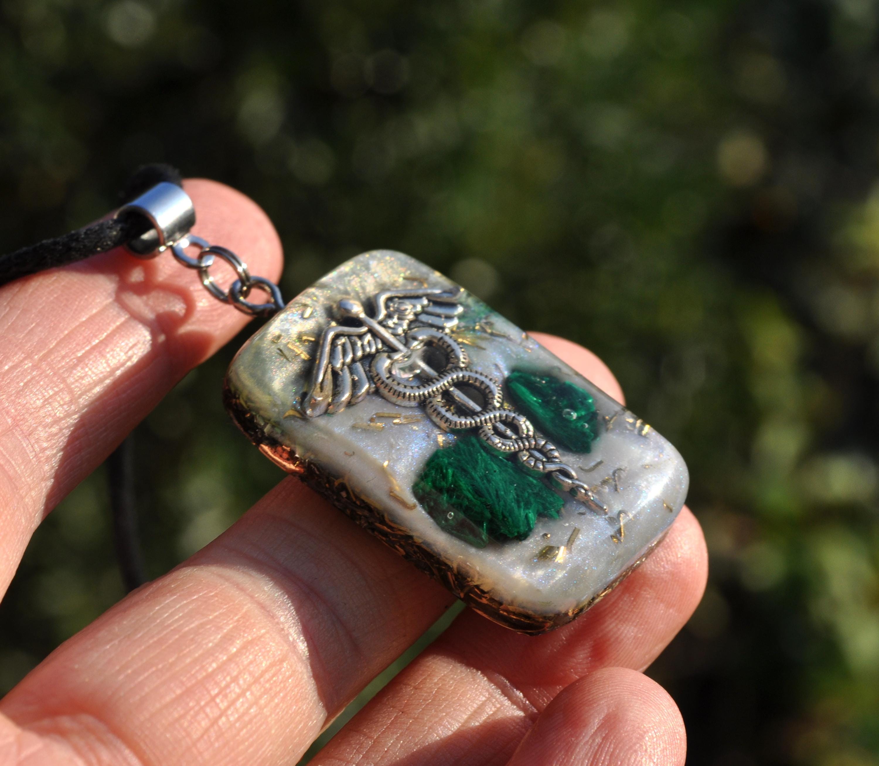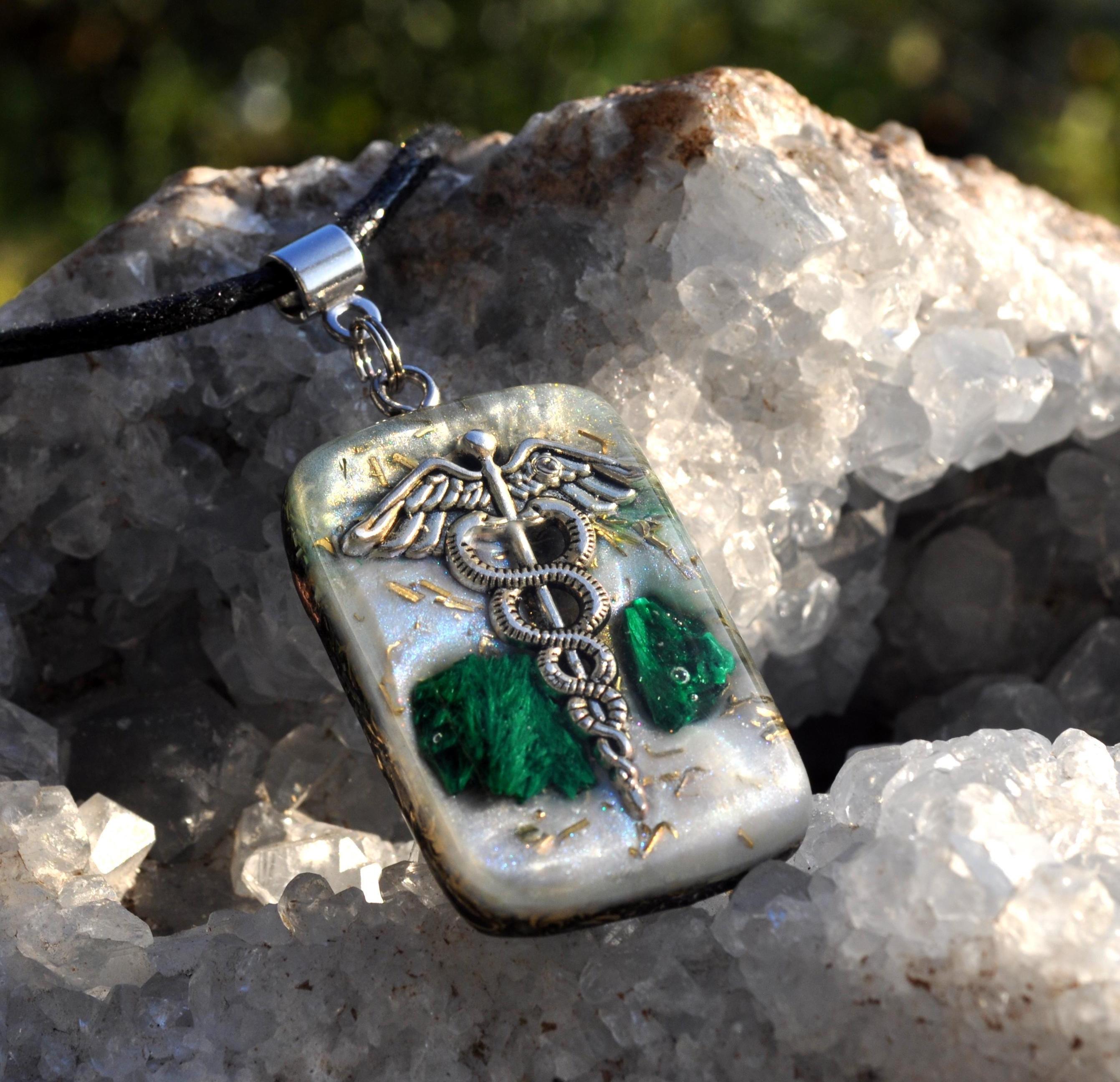 Discover a truly unique pendant featuring two stunning raw silk malachite crystals set prominently at the front, beautifully complementing the intricately designed Caduceus symbol—also known as Kundalini. This eye-catching pendant is encased in durable, high-quality resin, creating a vibrant, multicolored backdrop reminiscent of an abstract painting. Crafted with a blend of powerful crystals and metal shavings, this pendant functions as an orgonite device inspired by Wilhelm Reich’s research, designed to promote energetic balance and harmony.