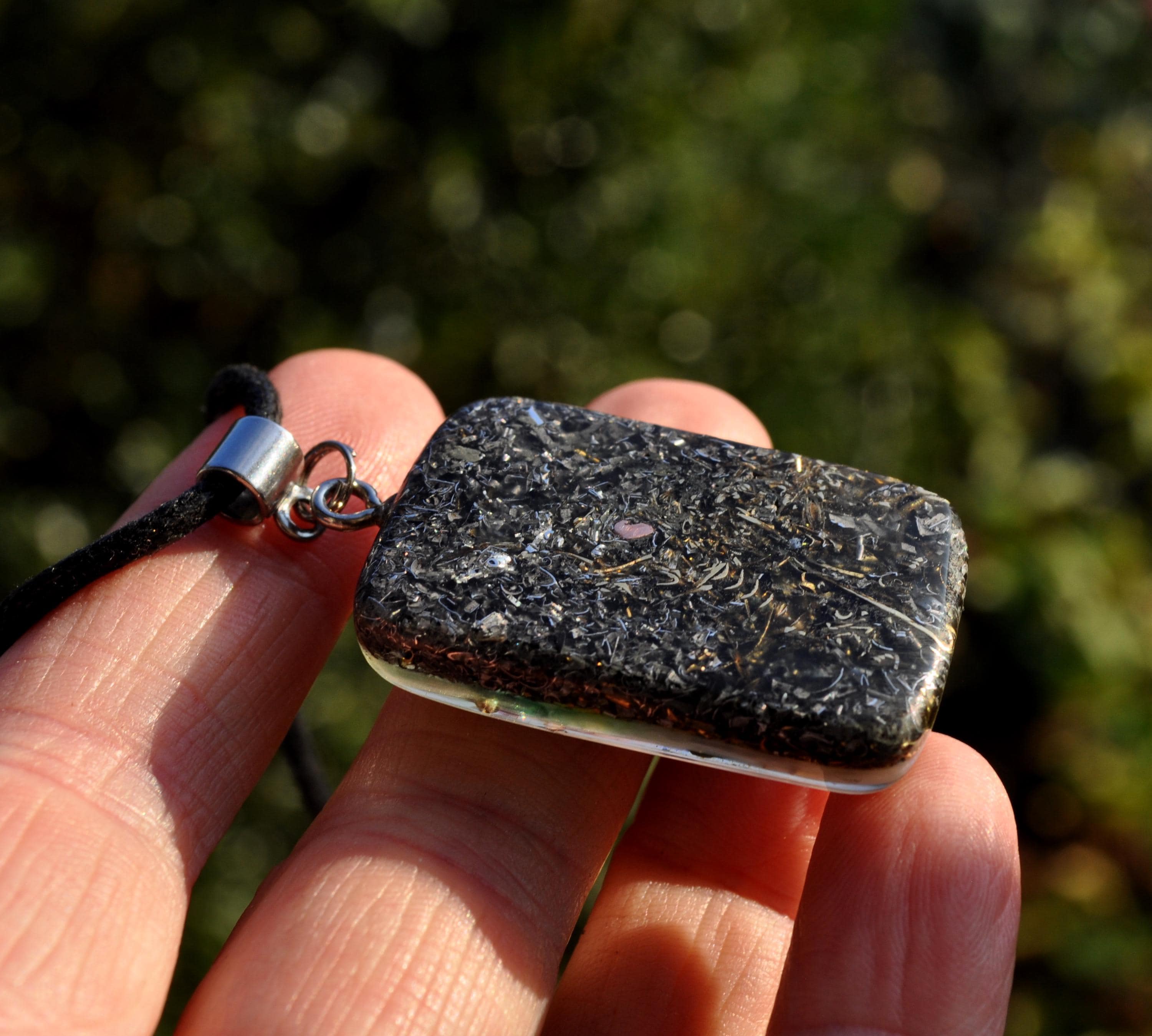 Surrounding the malachite, the pendant contains an array of carefully selected crystals including Black Tourmaline, Pyrite, Elite Shungite, Rhodizite, Selenite, and Clear Quartz. Together with the metal components embedded in the resin, these elements create a dynamic energetic synergy. The metal shavings, essential for orgonite’s function, work by attracting and repelling energy, keeping the flow fresh and vibrant. The inclusion of quartz crystal enhances this effect by channeling and amplifying energy through its natural piezoelectric qualities.