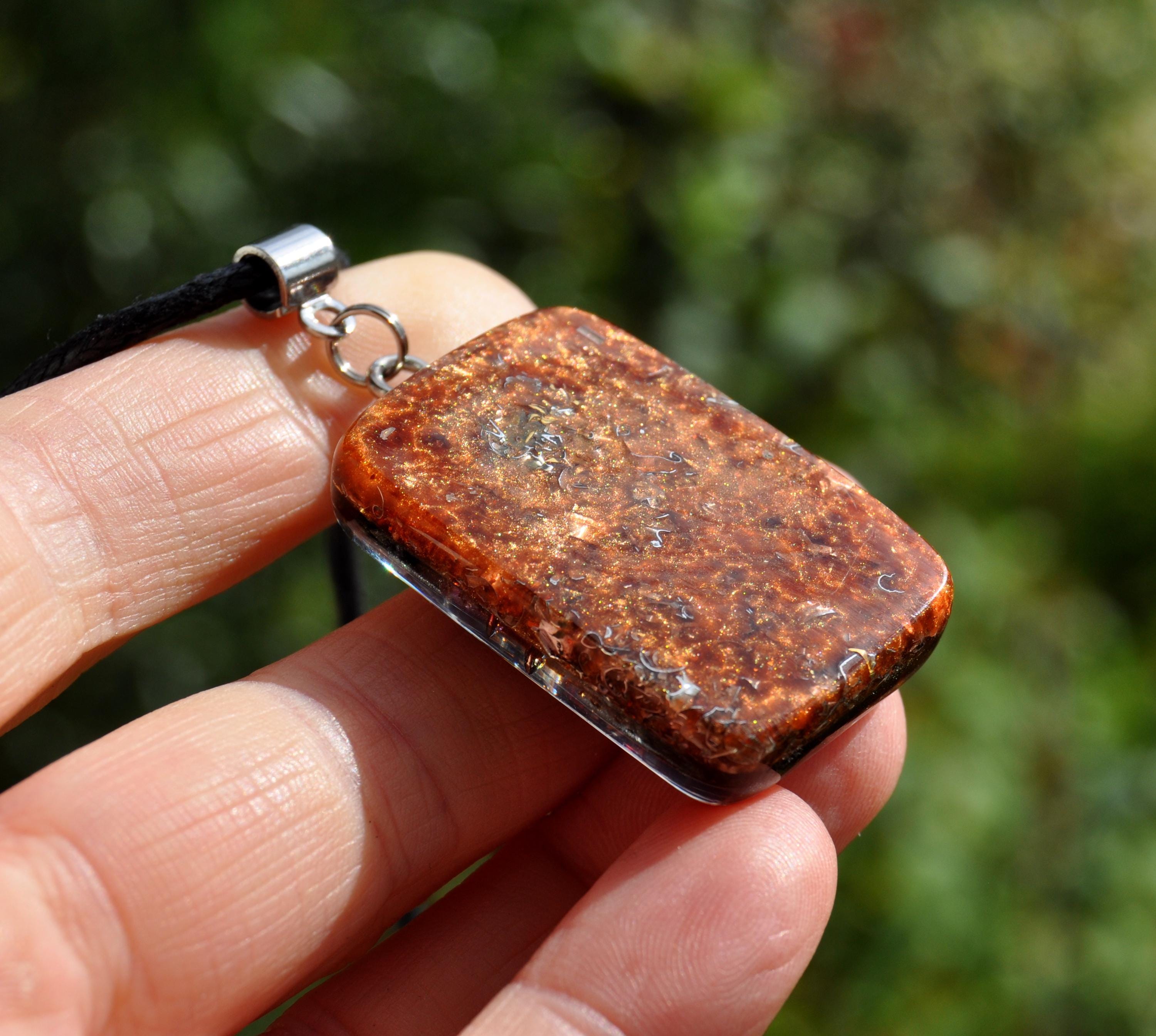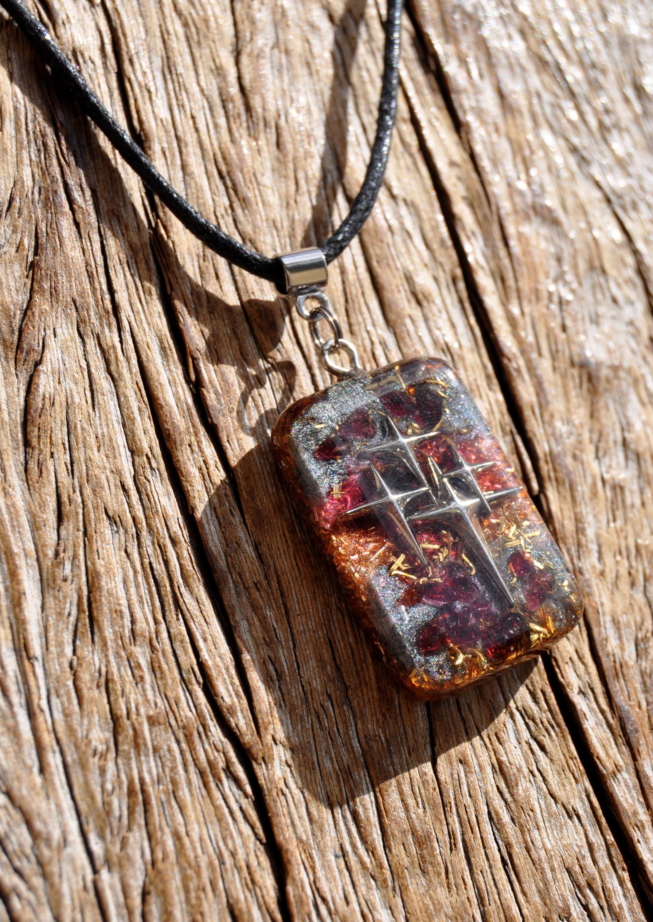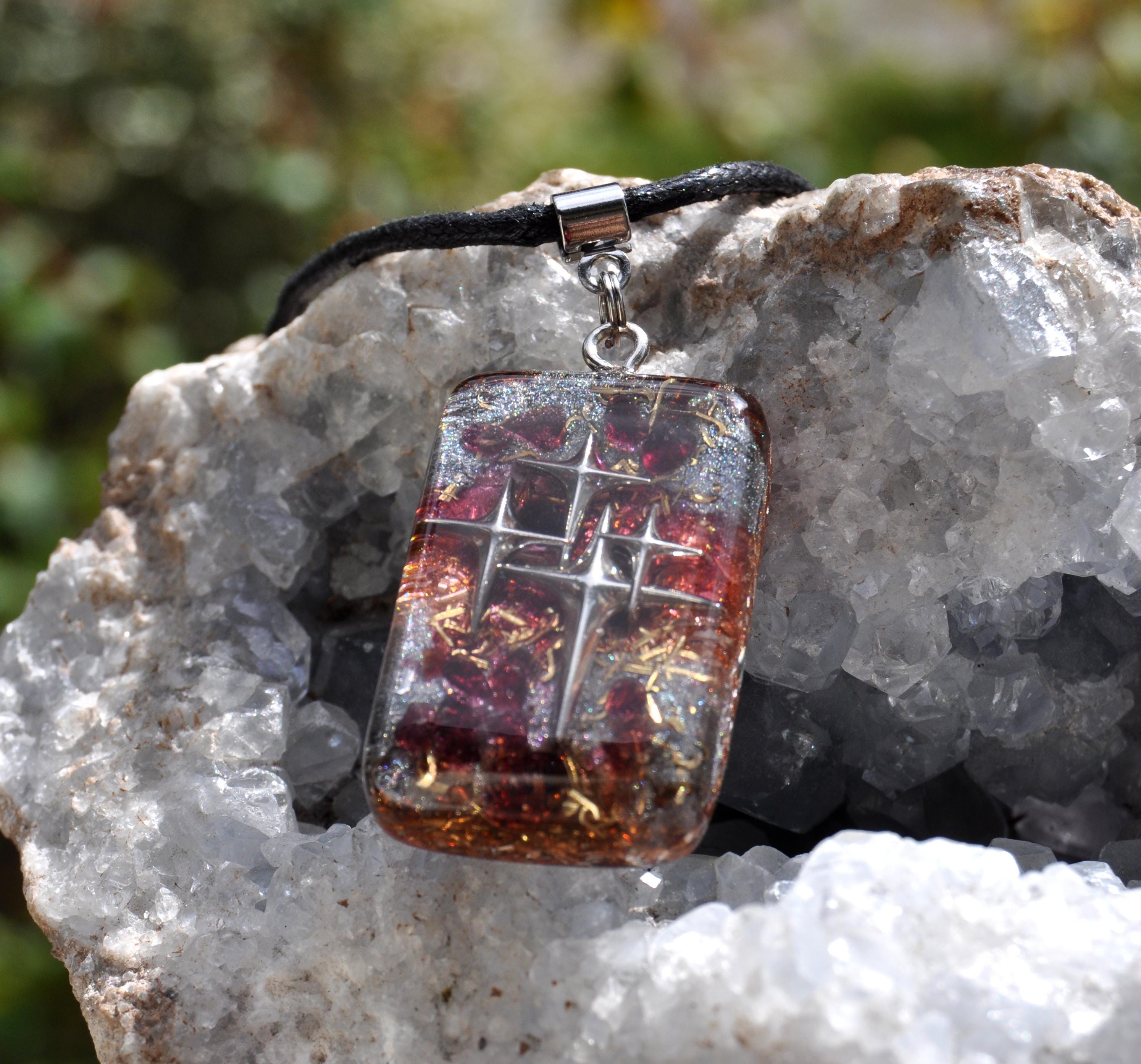 This Orgonite® pendant is handmade using natural stones, resin, and metal components.