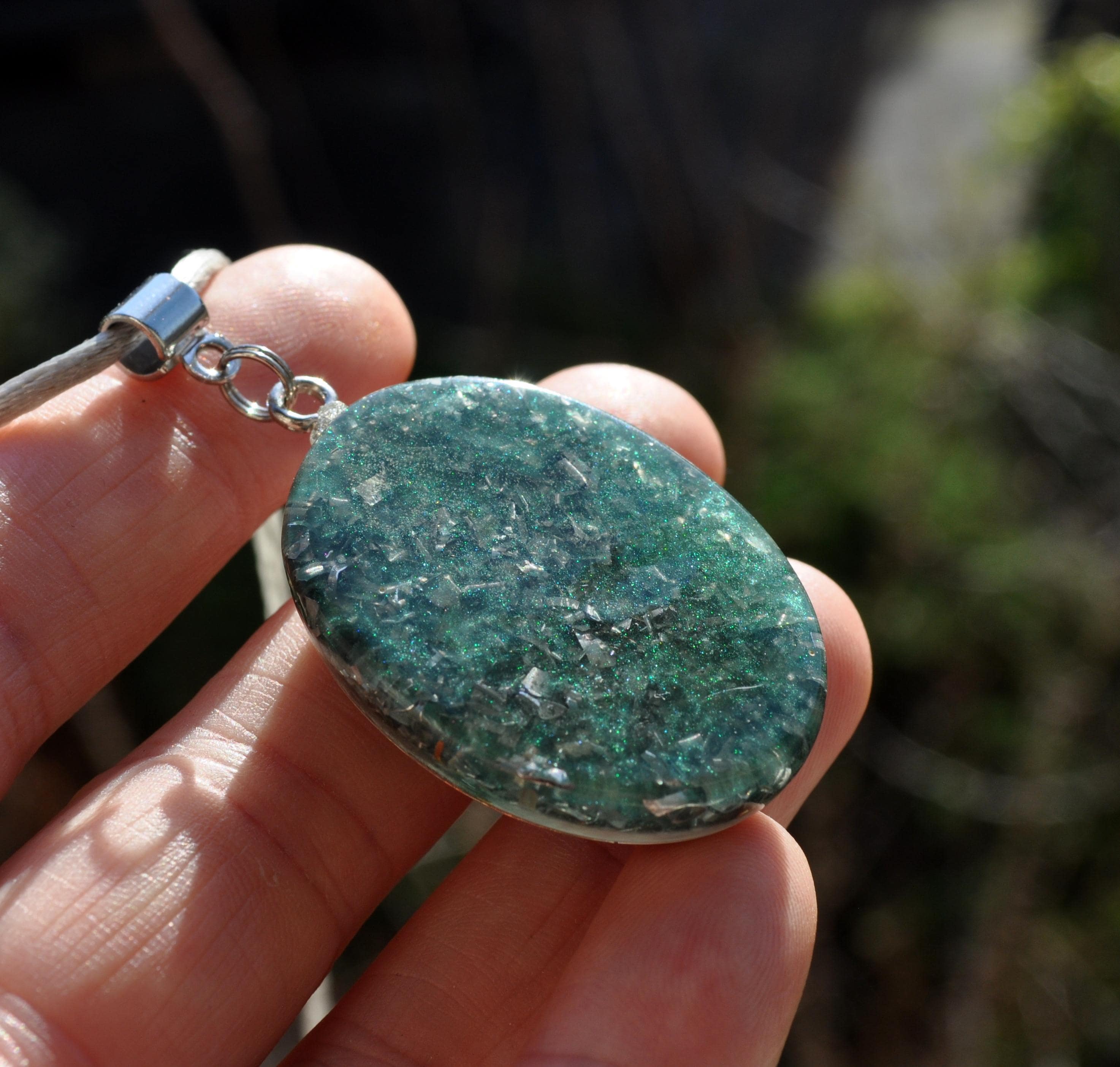 This handmade Orgonite® pendant features a metal horseshoe on the front and shimmering silver and light blue colors on the back. Each piece is poured by hand using a 50/50 blend of resin and metal shavings for a balanced and eye-catching look. The pendant measures about 3.6 cm (1.4") tall and comes with an adjustable satin cord for everyday wear.