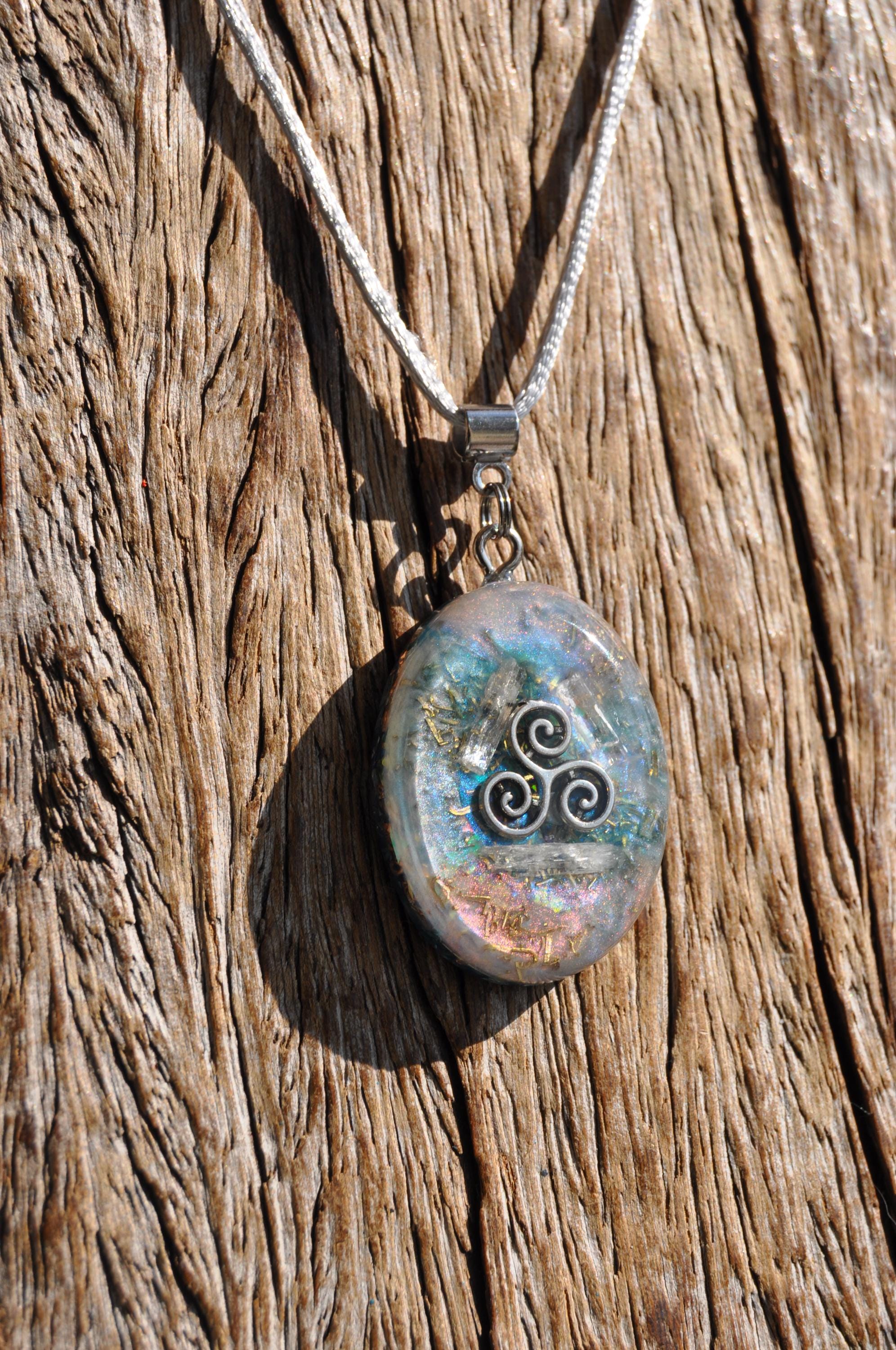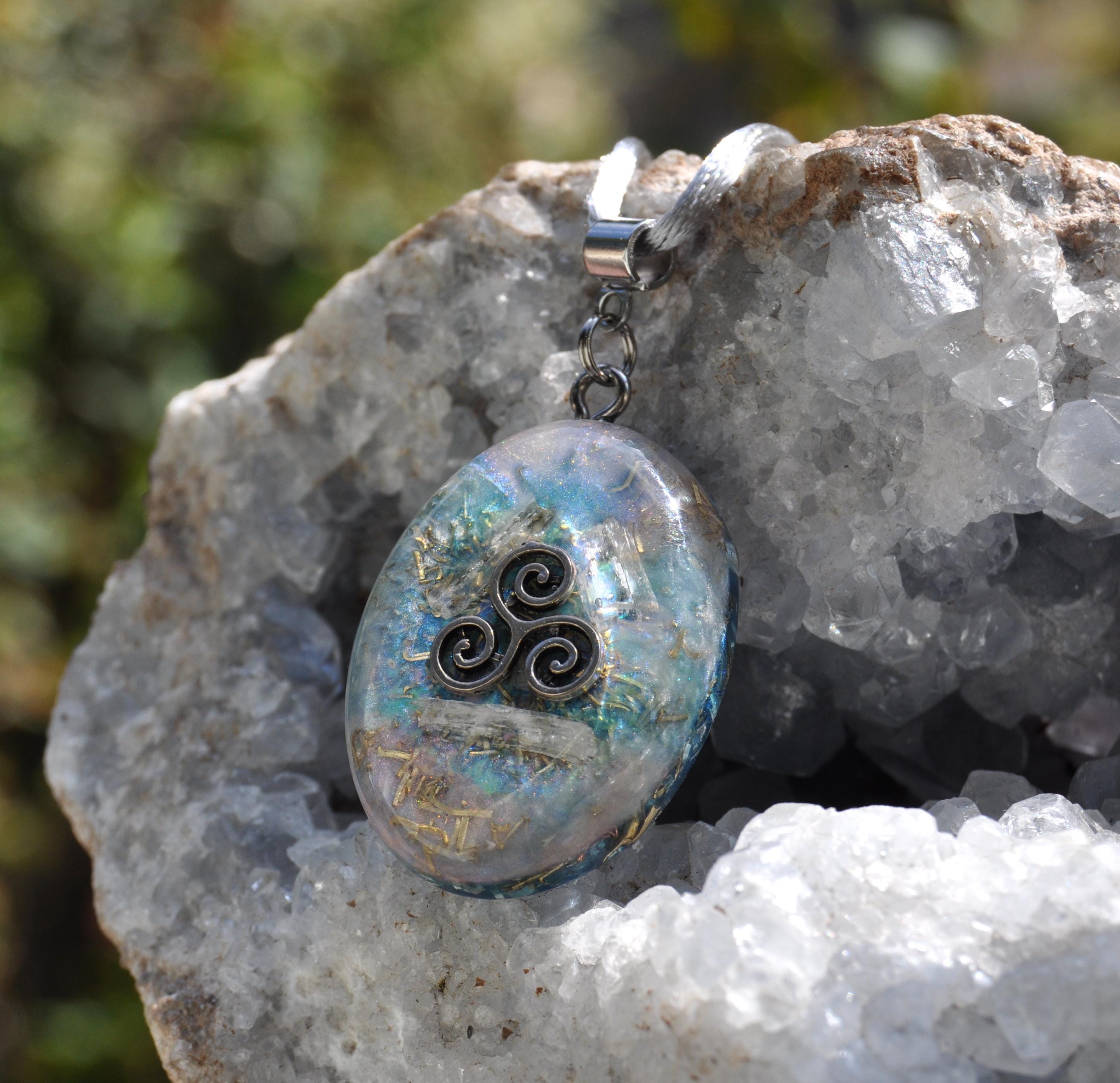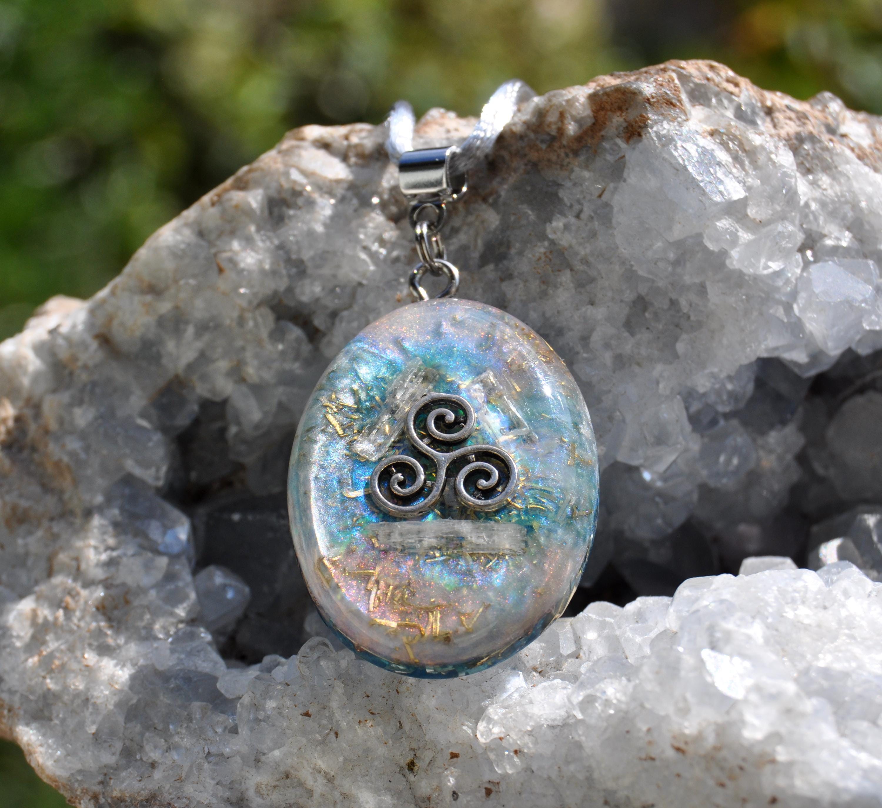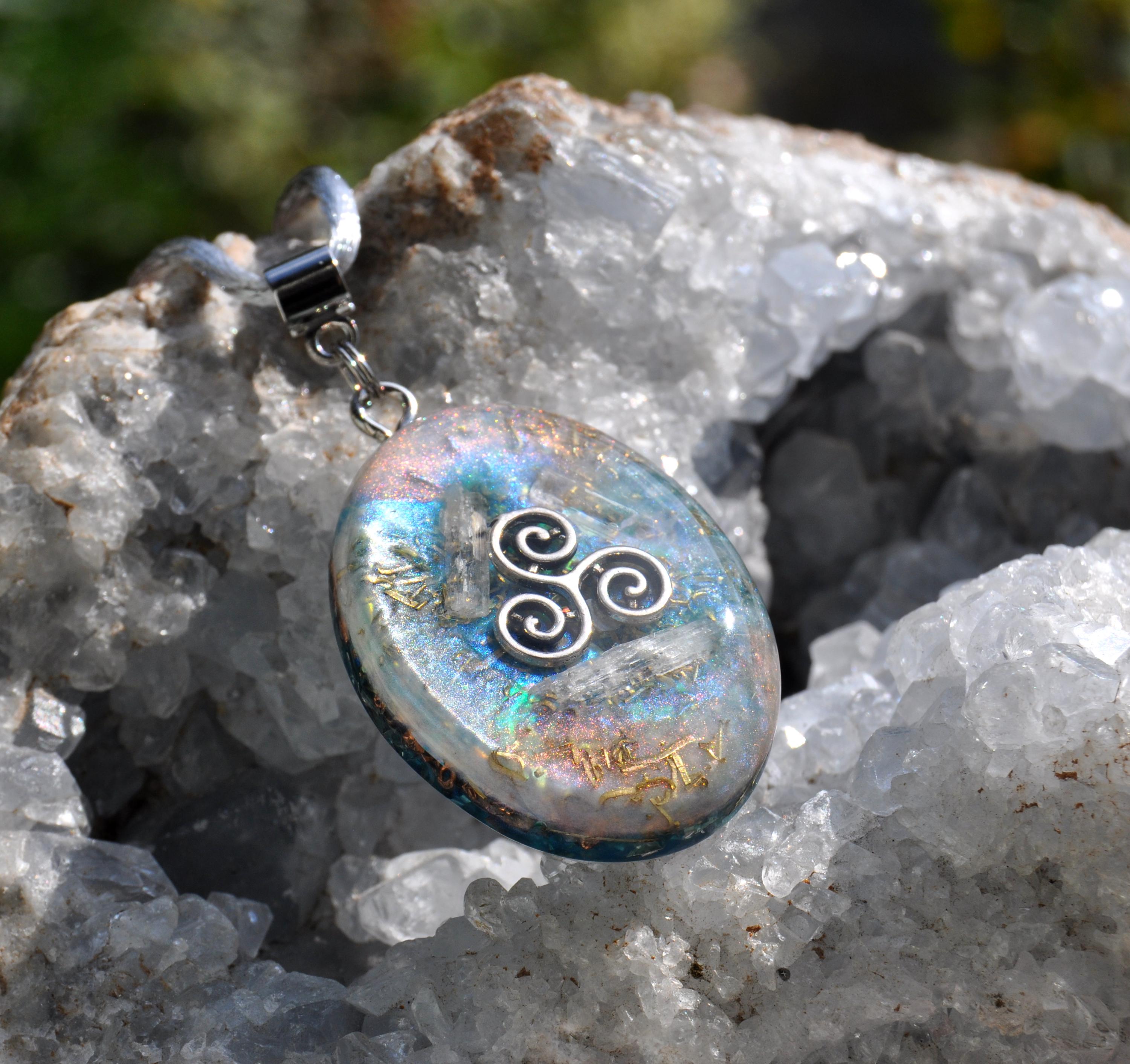 Transparent Raw Kunzite Orgonite® Pendant – Handcrafted Crystal Jewelry with Triskelion Symbol & Energy Harmonizing Design