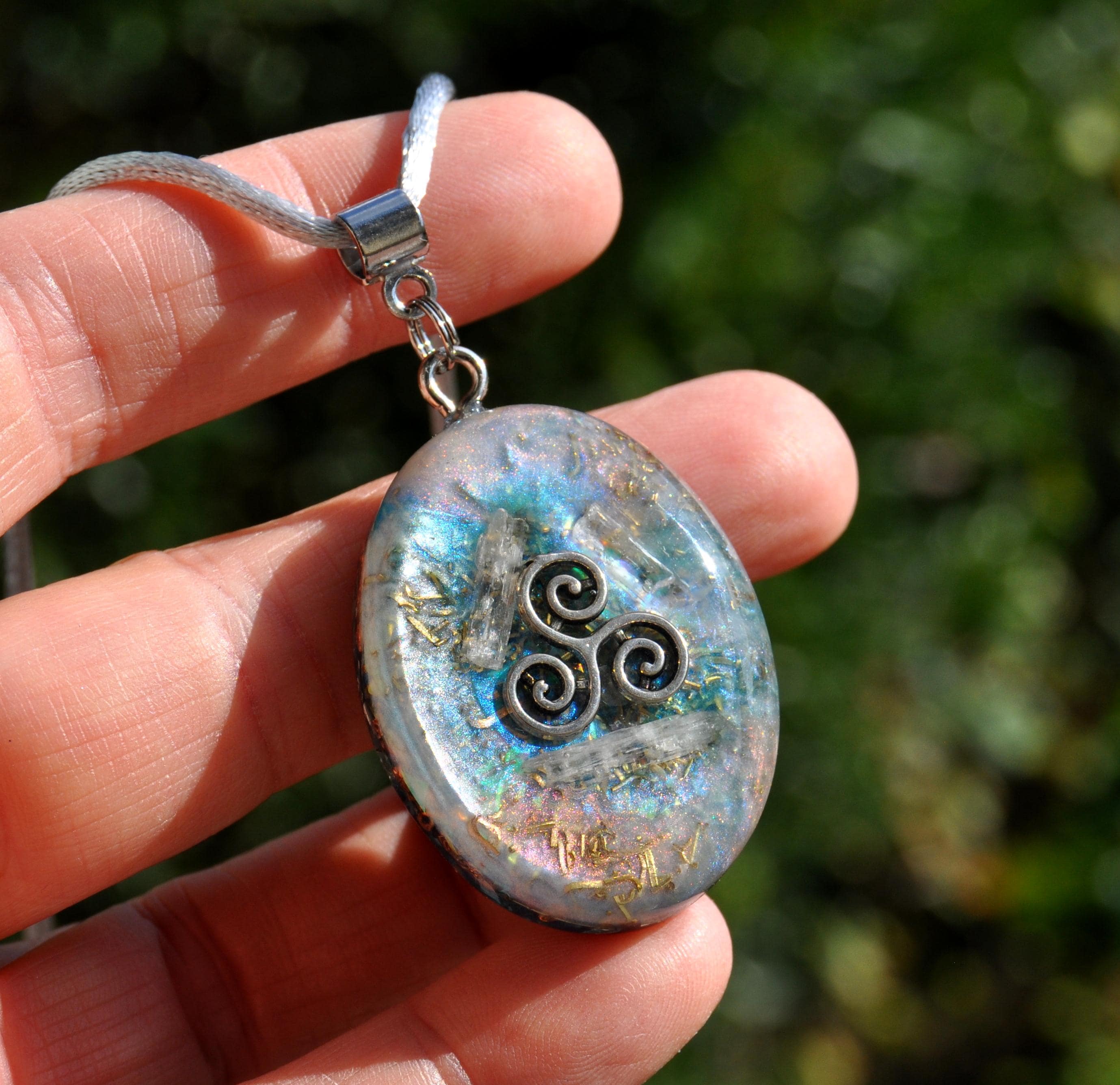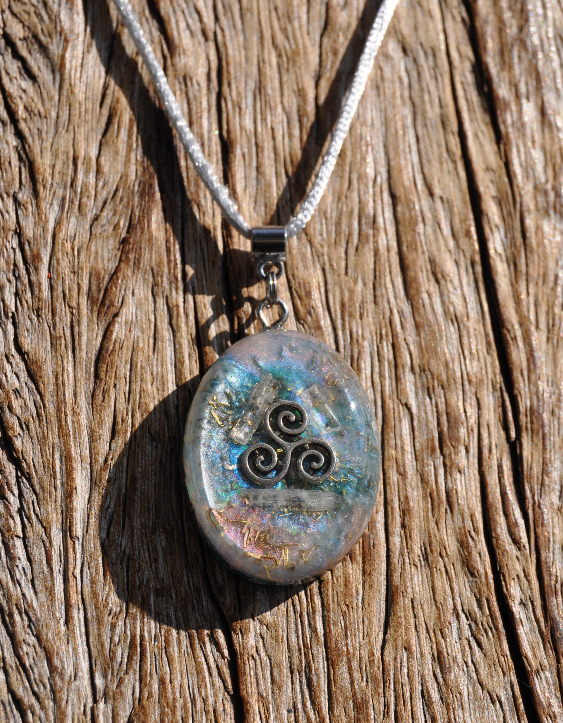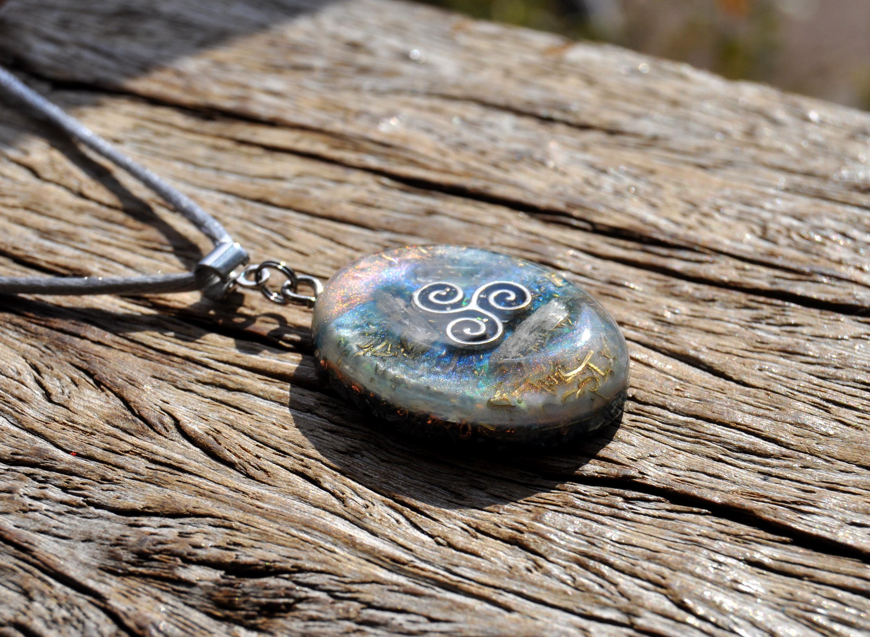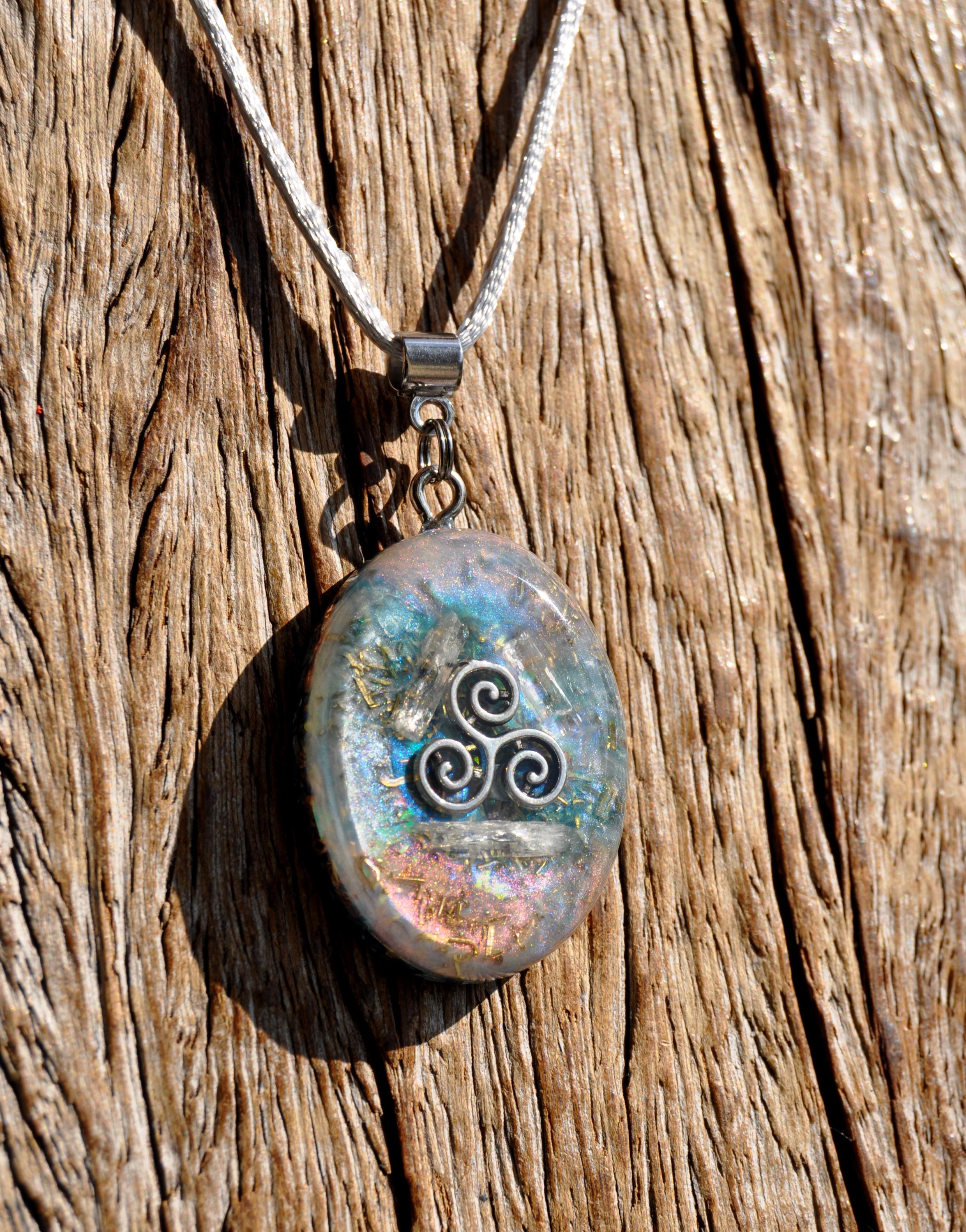Transparent Raw Kunzite Orgonite® Pendant – Handcrafted Crystal Jewelry with Triskelion Symbol & Energy Harmonizing Design