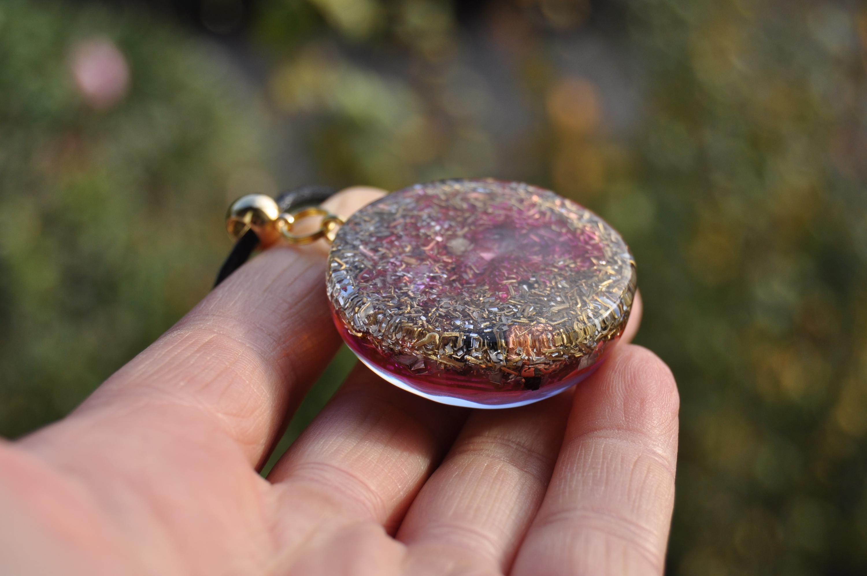 Elevate your style and energy with this handmade orgonite pendant, featuring a stunning copper-plated Lakhovsky Multi-Wave Oscillator (MWO) on the front. Crafted with magenta resin, abundant metal shavings, and a powerful blend of healing crystals, this one-of-a-kind pendant is both a beautiful accessory and a tool for positive energy. Perfect for those who love spiritual jewelry, EMF protection, or simply unique handmade designs!