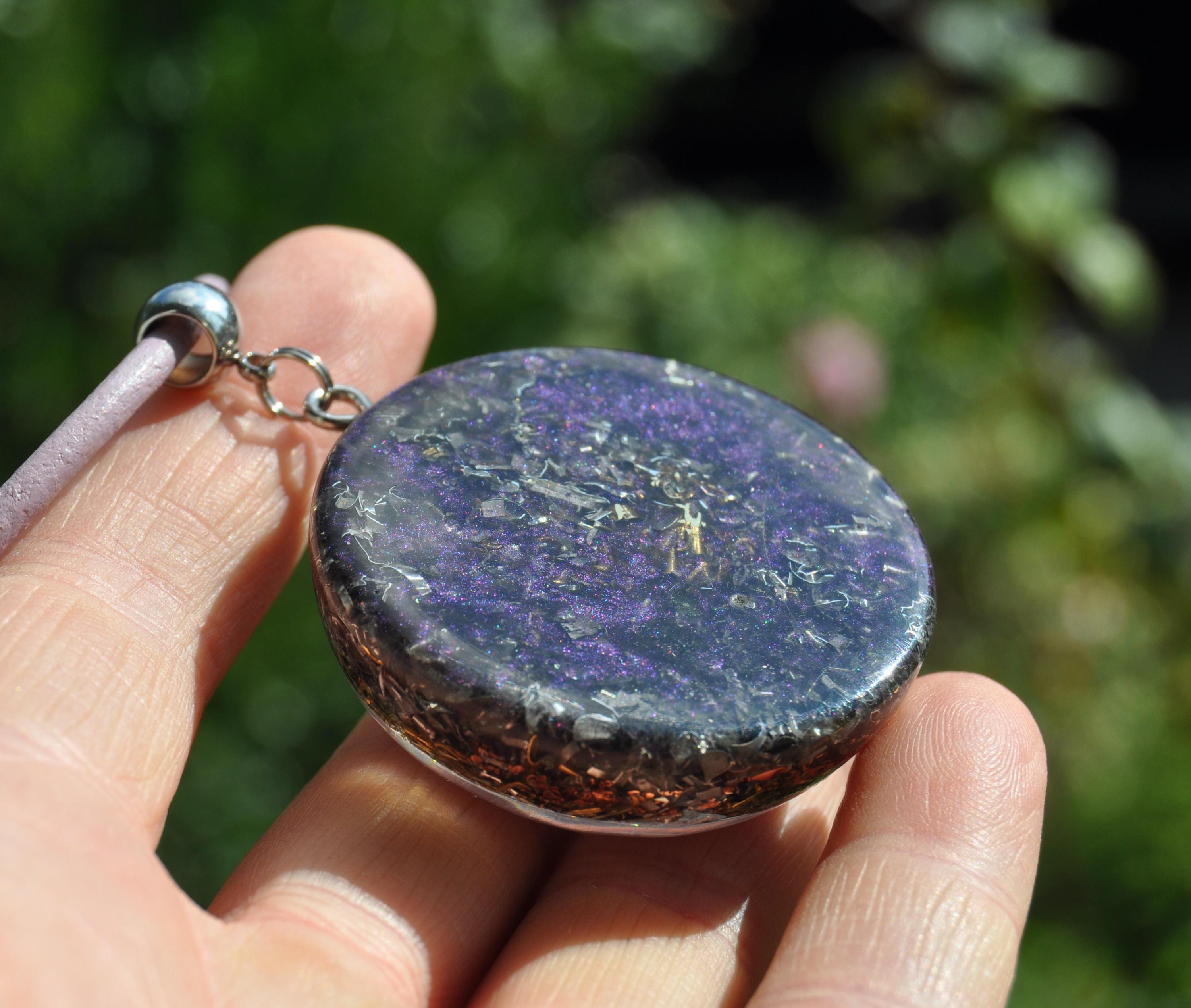 This handcrafted Orgonite® pendant (approx. 4.2 cm / 1.65" in diameter) blends beauty, craftsmanship, and spiritual intention. Designed for lovers of unique, healing, and boho-inspired jewelry, it features a harmonious mix of crystals and metals within a smooth, polished resin dome.
