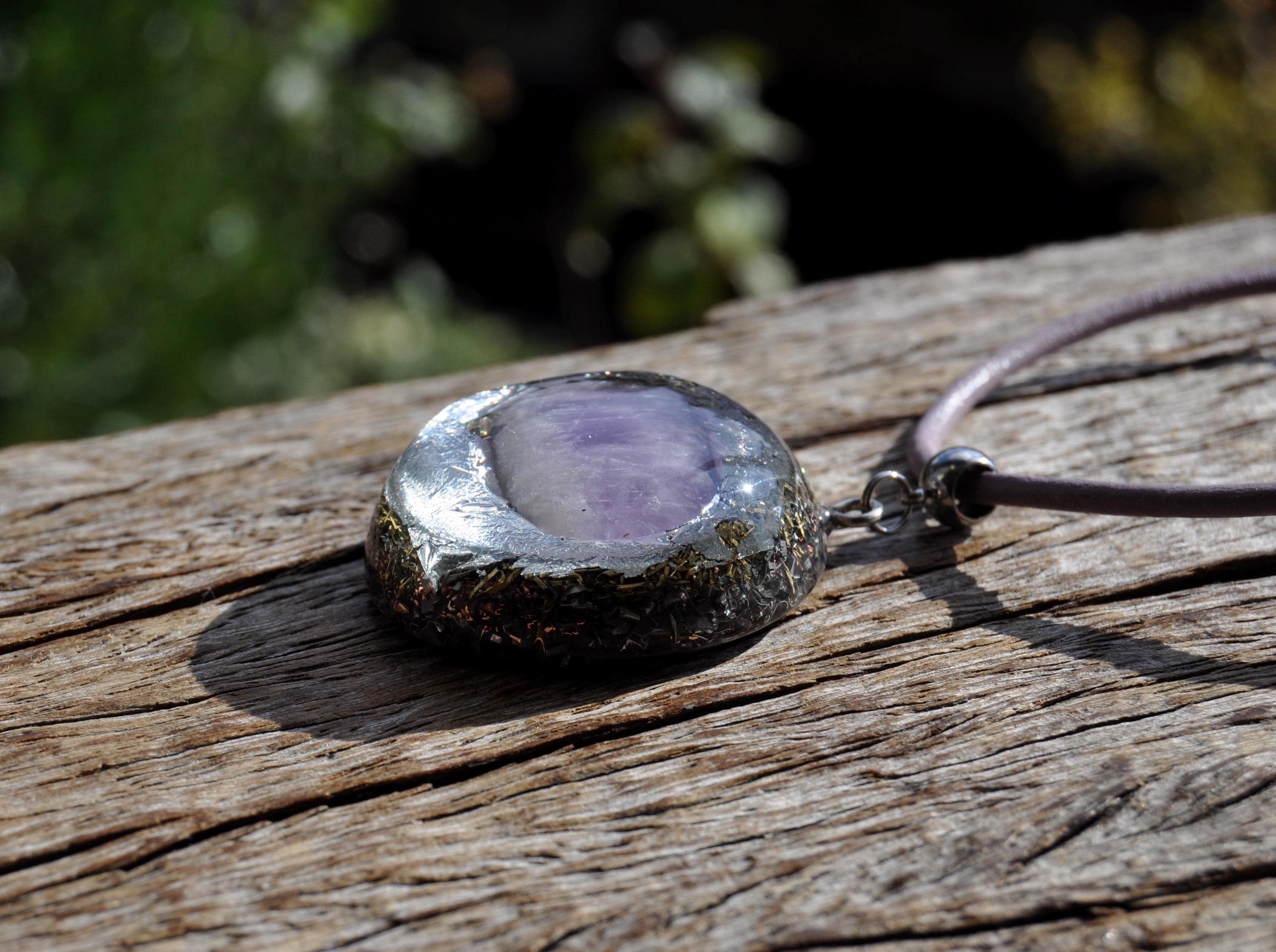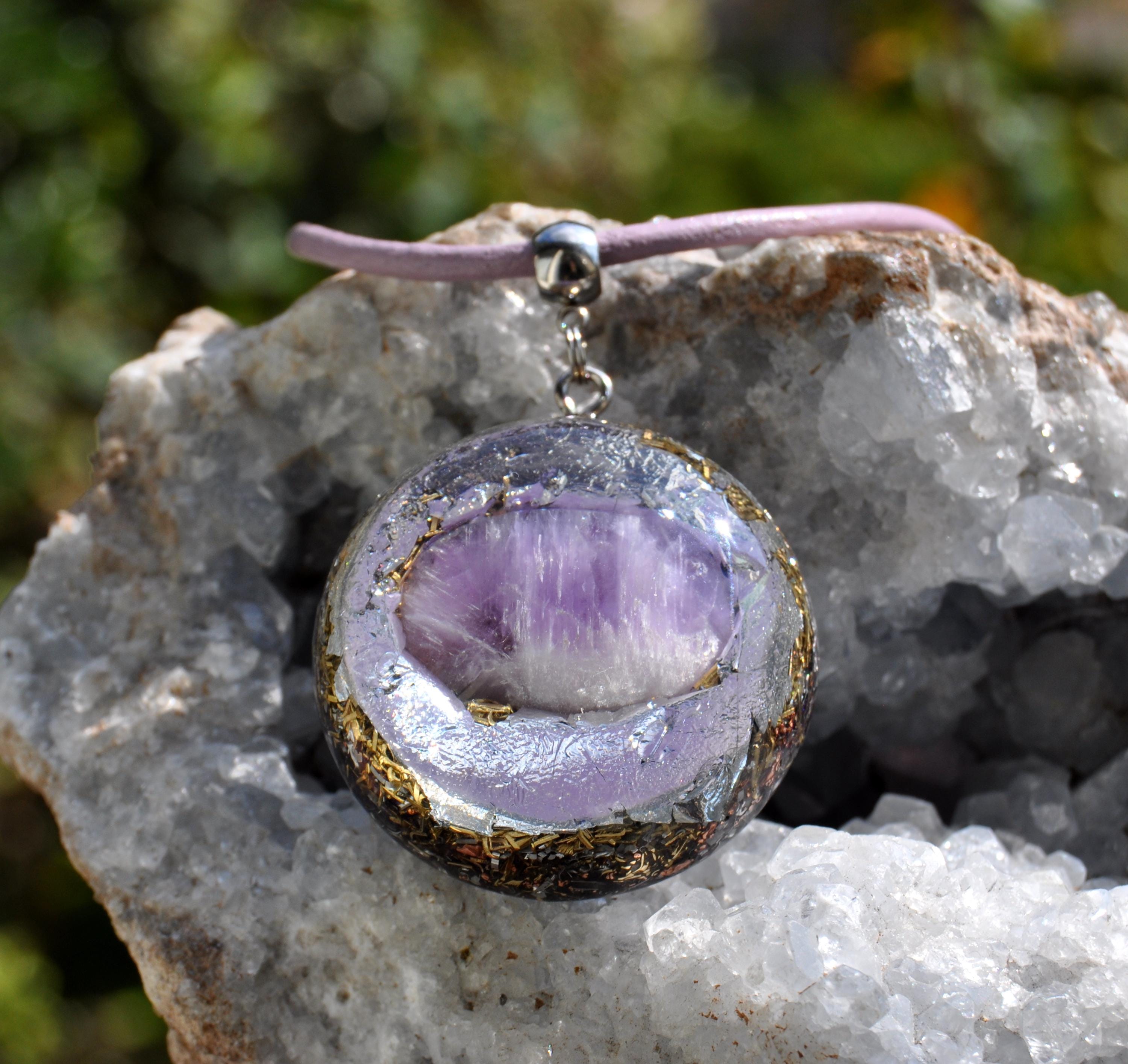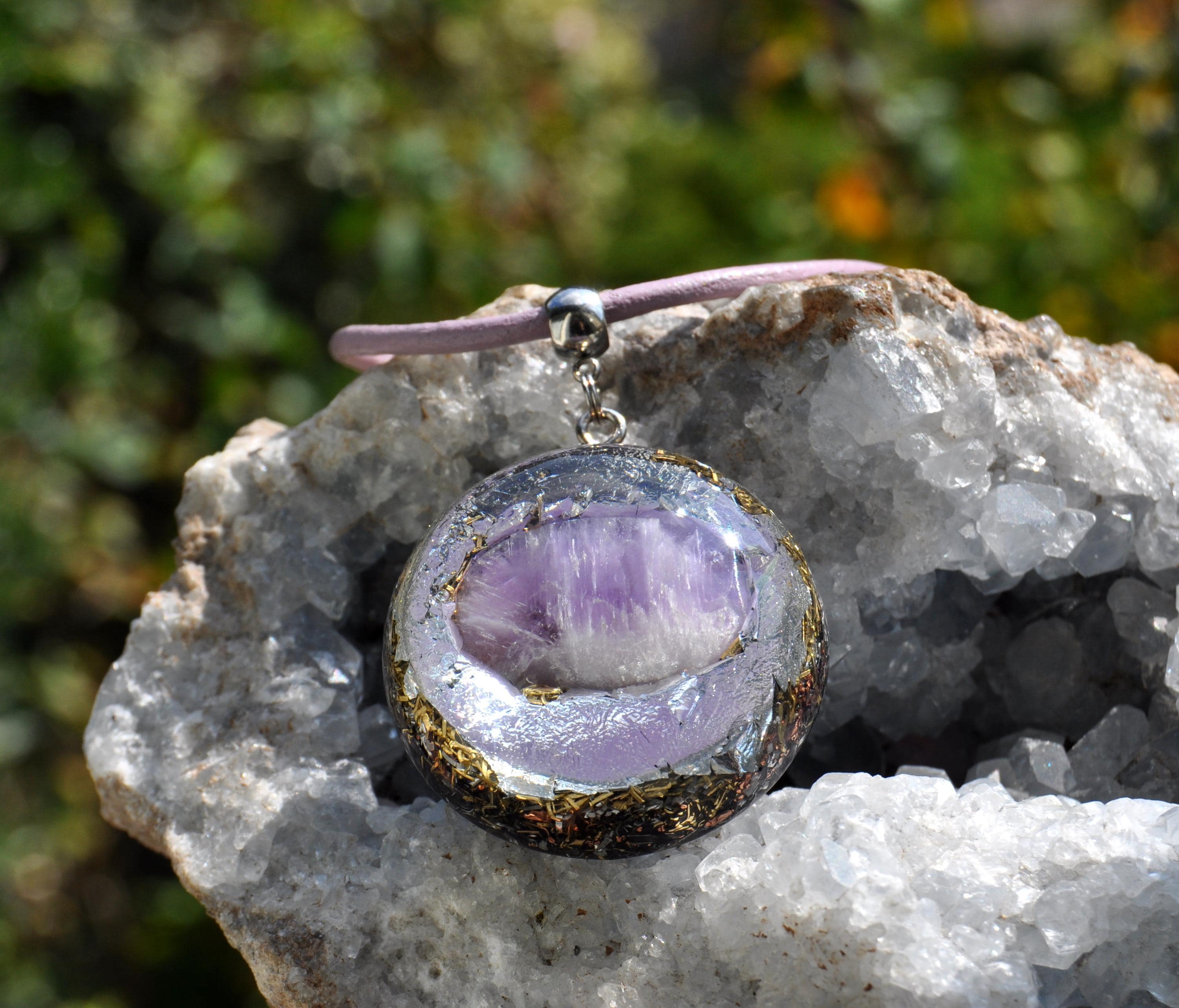 Surrounding the Amethyst are Rose Quartz, Black Tourmaline, Elite Shungite, Selenite, Rhodizite, and Clear Quartz, all embedded within the Orgonite® matrix of resin and metal shavings. This combination not only gives the pendant its vibrant energy and rich texture but also its unique visual depth.