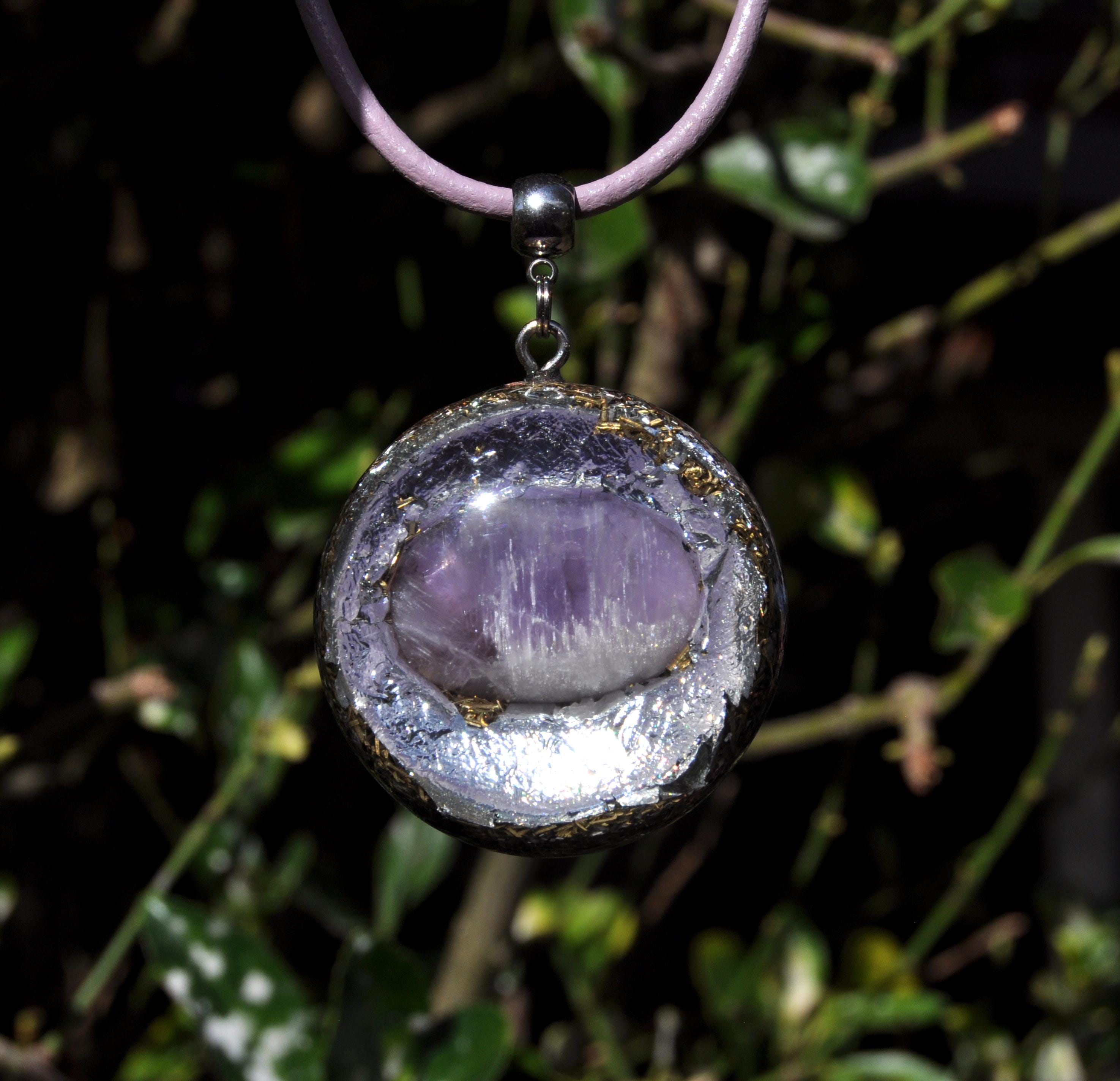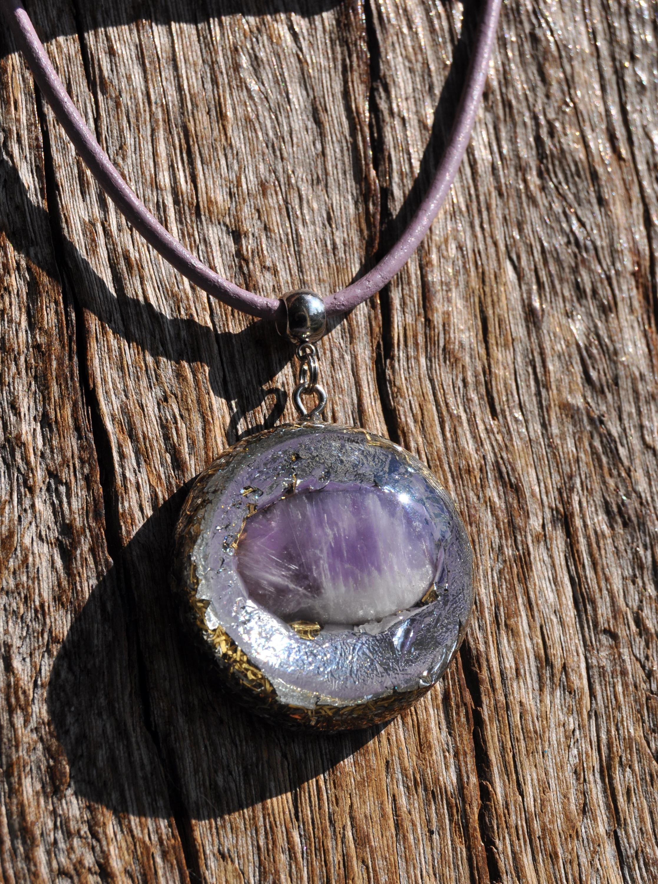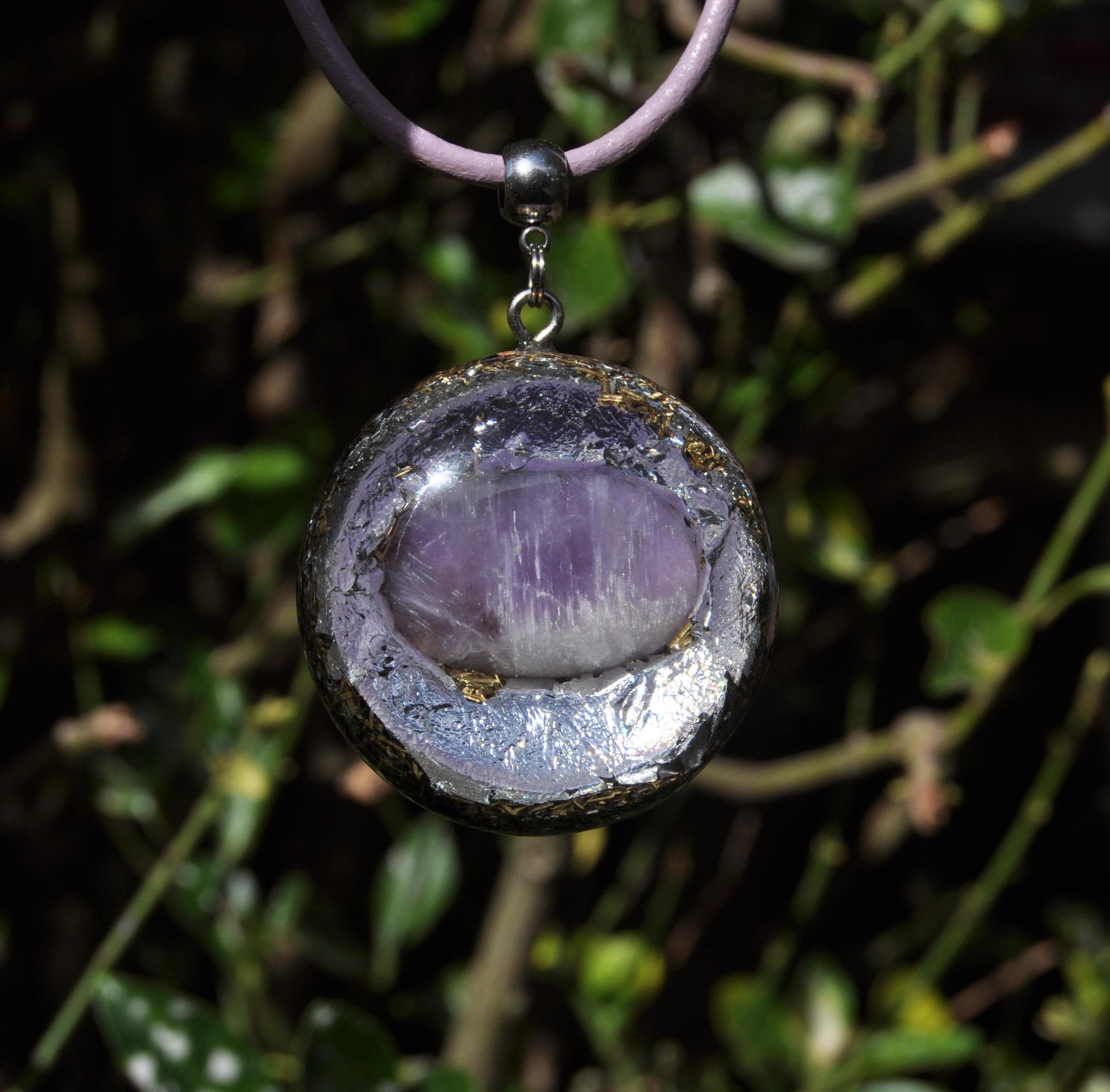 Surrounding the Amethyst are Rose Quartz, Black Tourmaline, Elite Shungite, Selenite, Rhodizite, and Clear Quartz, all embedded within the Orgonite® matrix of resin and metal shavings. This combination not only gives the pendant its vibrant energy and rich texture but also its unique visual depth.