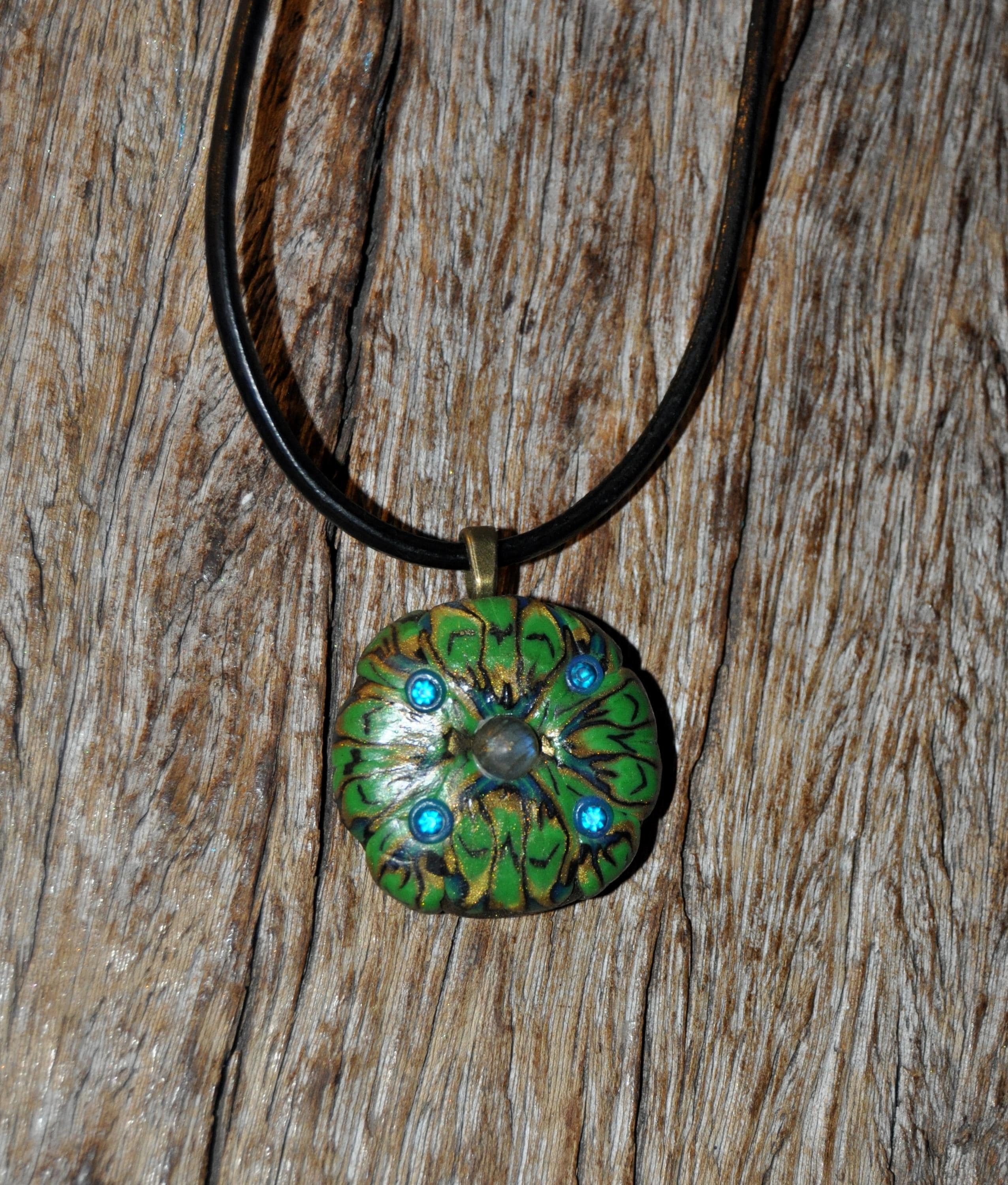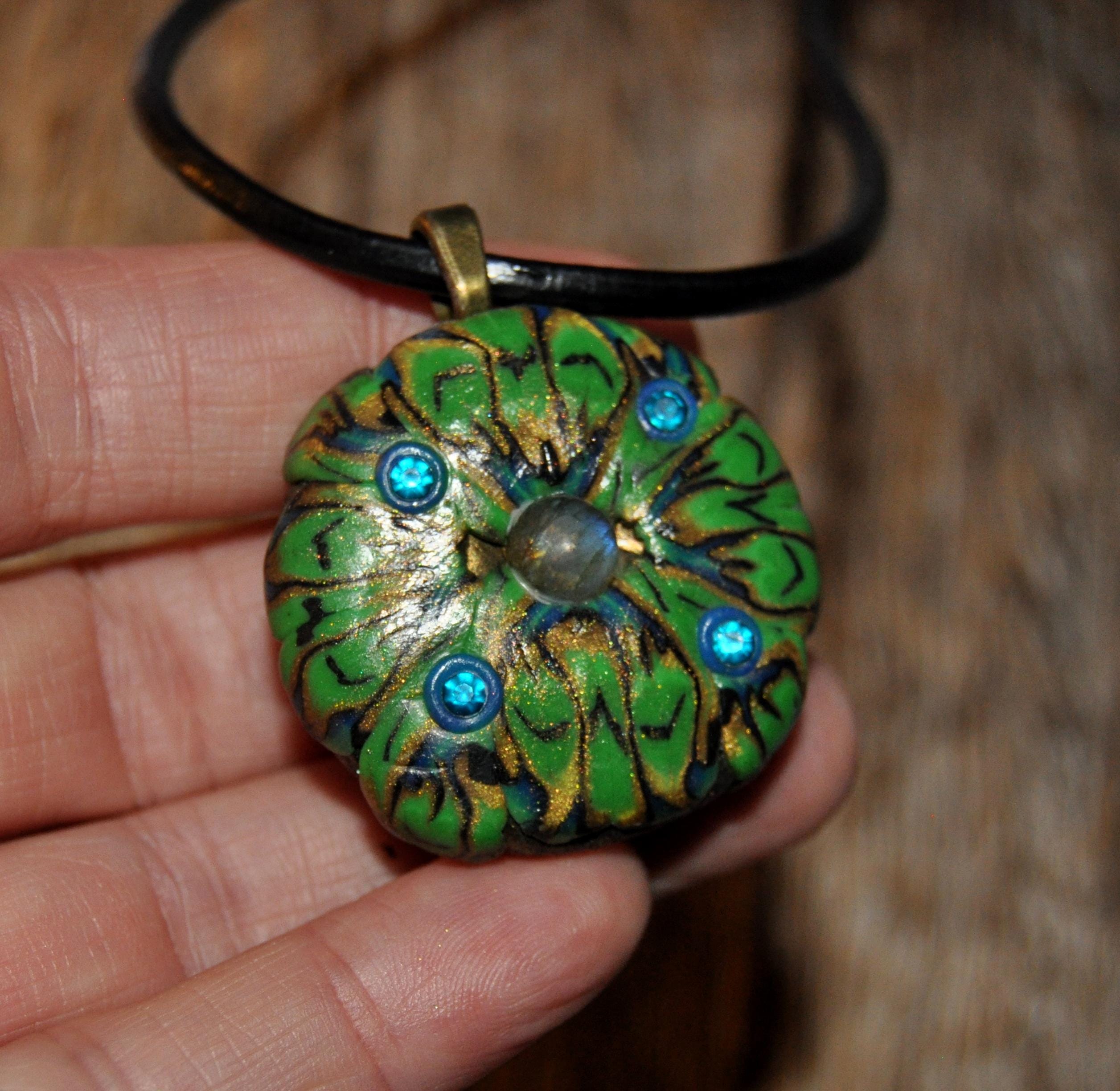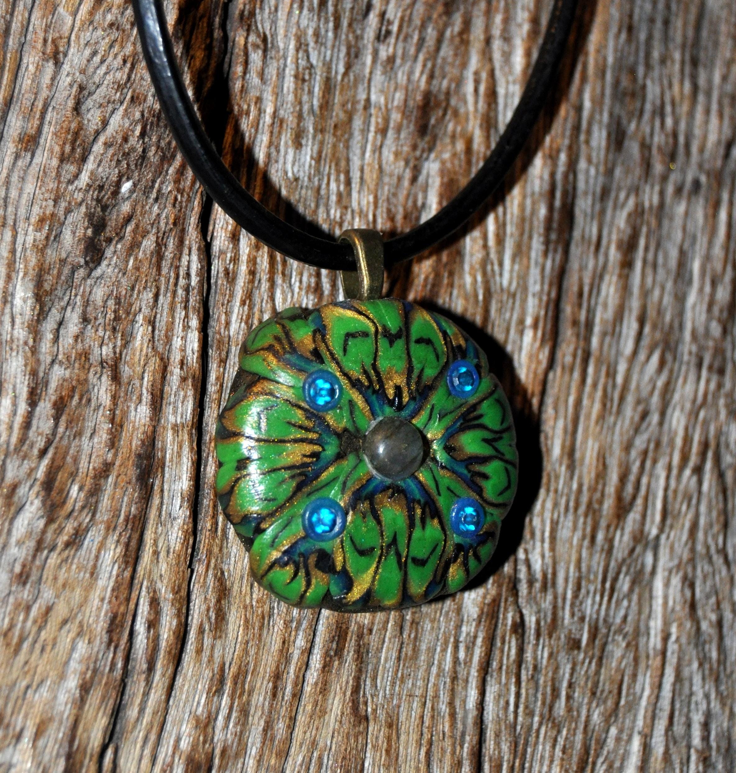This hand-sculpted clay pendant features a small Labradorite stone in the center, set against a beautiful green, blue, and gold color palette. Its UV-active clay makes it glow under a uv blacklight. It looks also nice in daylight.