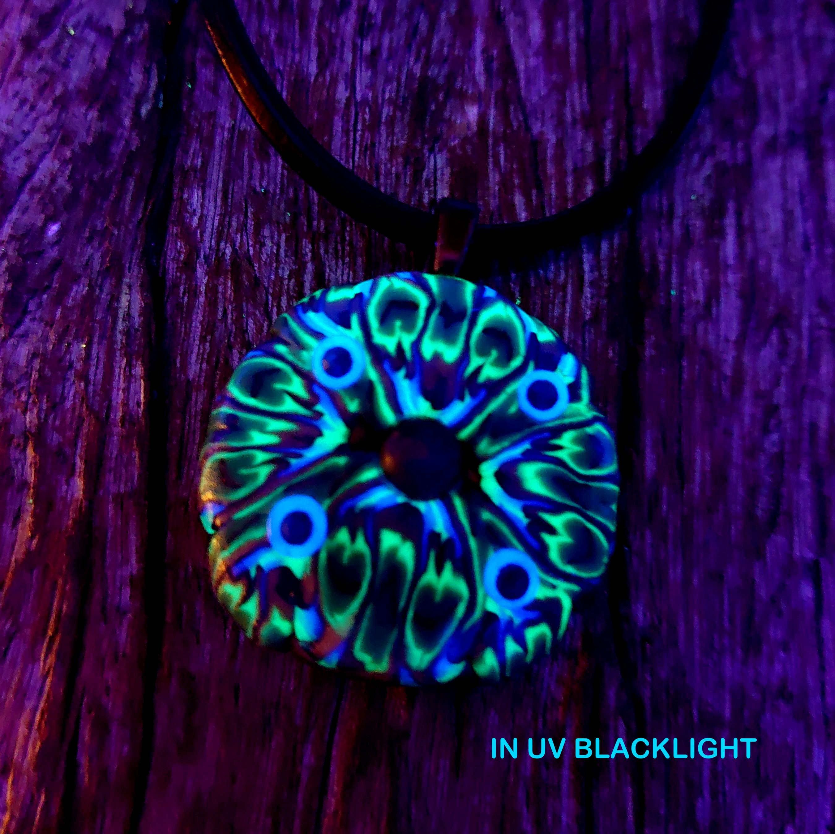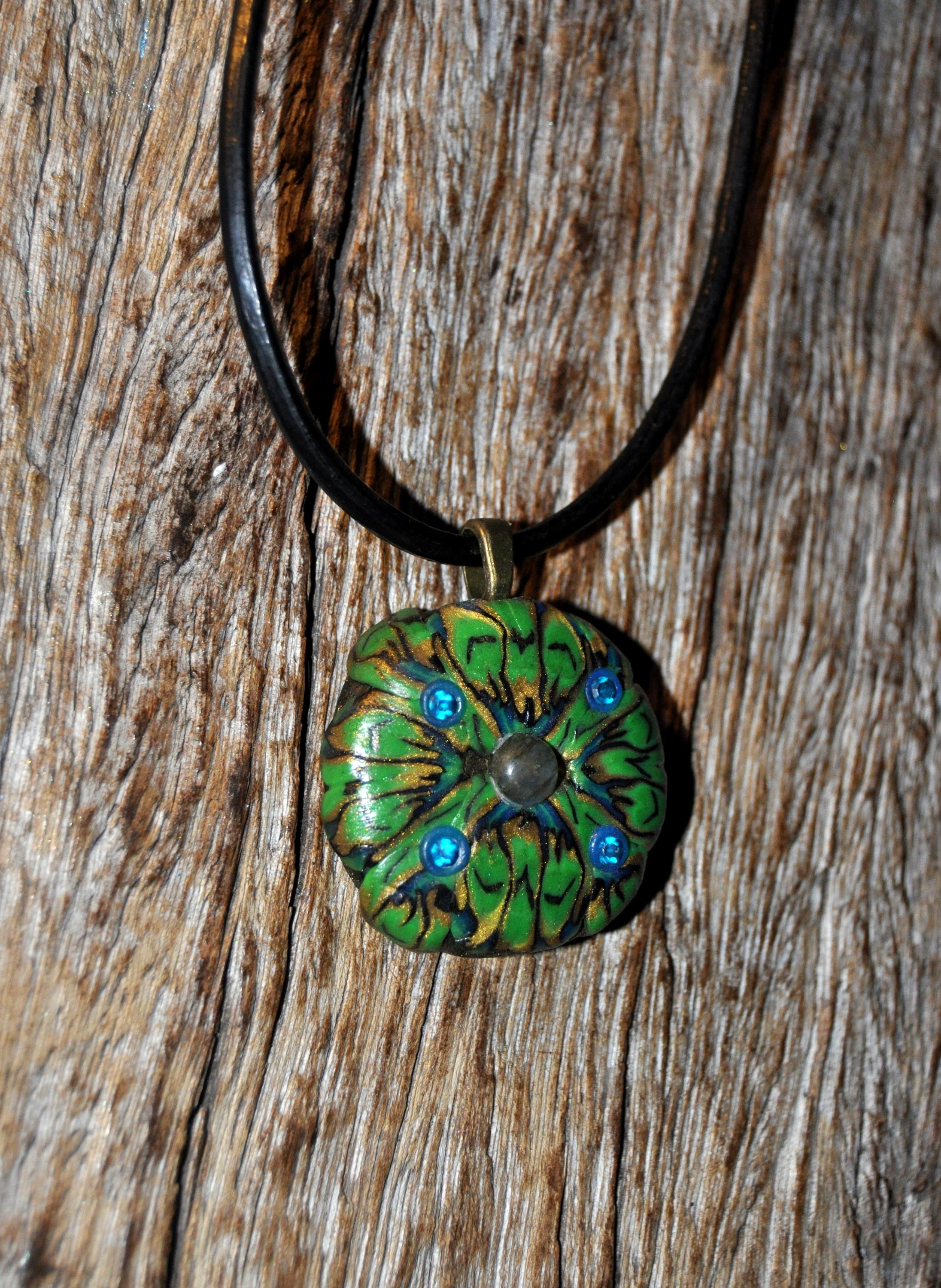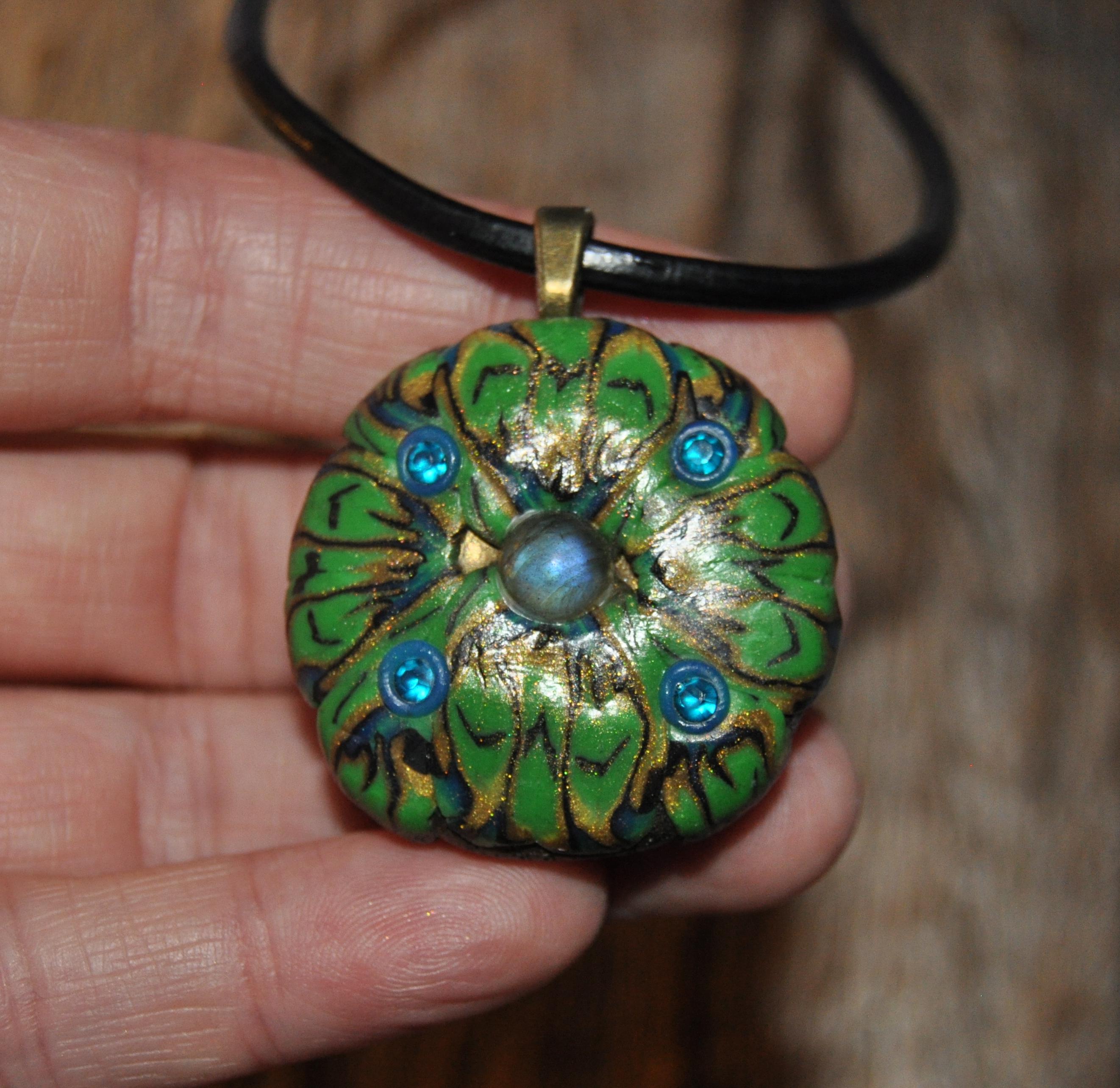 This hand-sculpted clay pendant features a small Labradorite stone in the center, set against a beautiful green, blue, and gold color palette. Its UV-active clay makes it glow under a uv blacklight. It looks also nice in daylight.