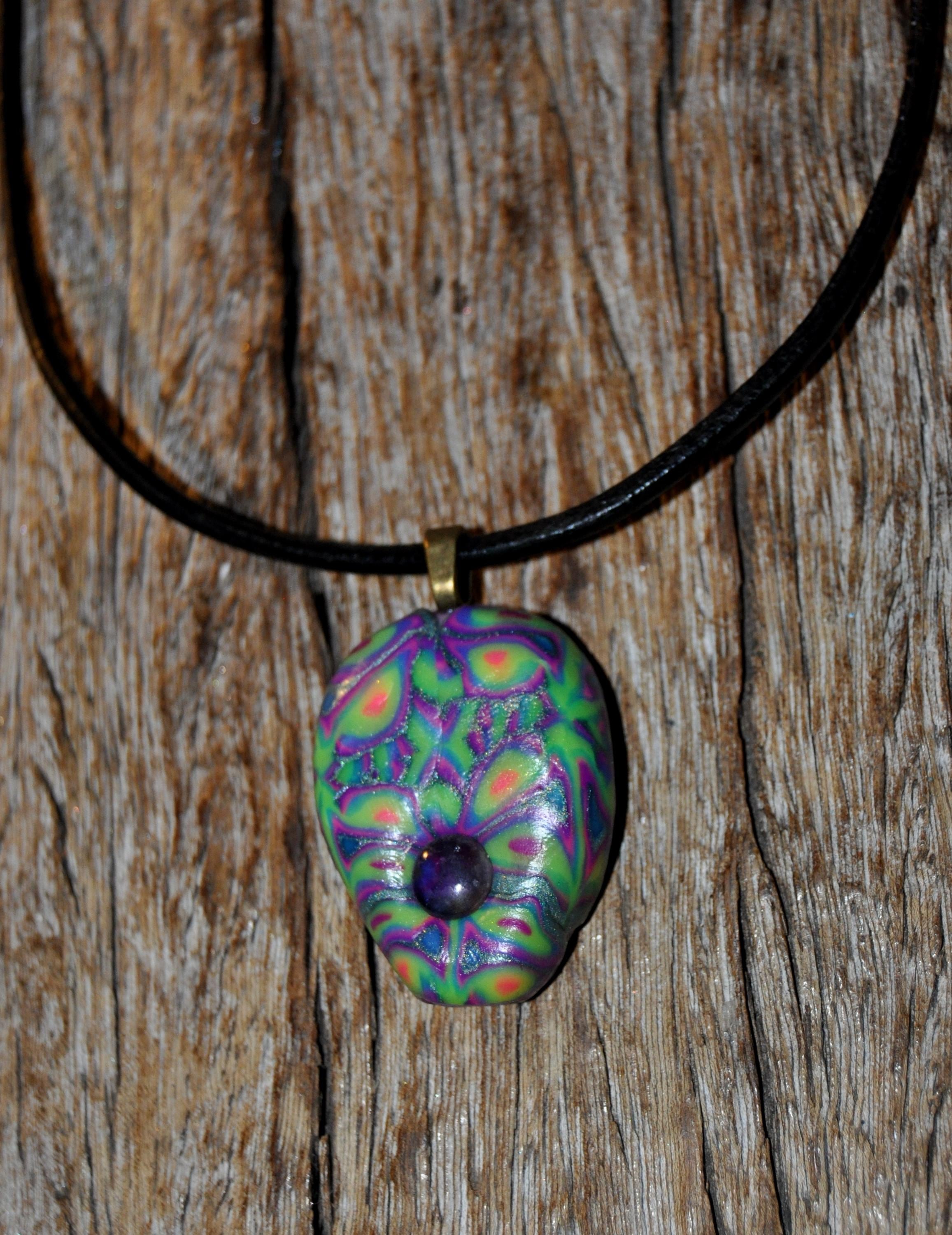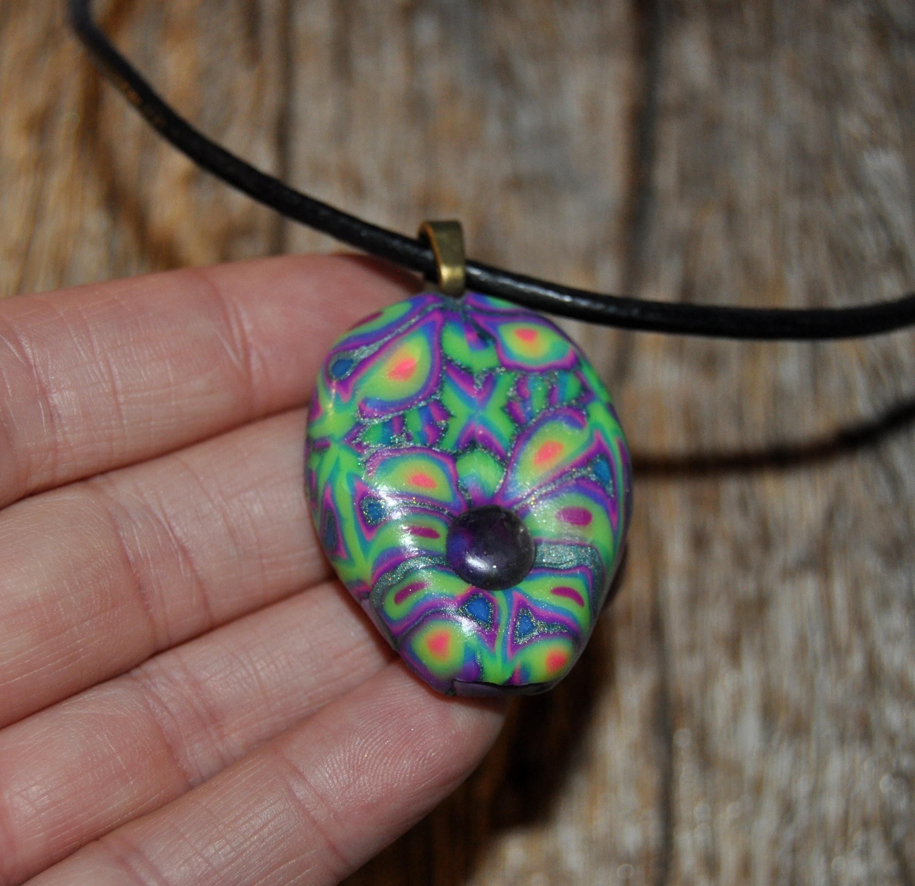 This hand-sculpted clay pendant features a small Amethyst stone in the front, surrounded by a psychedelic pattern of mainly green and purple colors. Its vibrant design glows under UV blacklight and looks also nice in daylight.