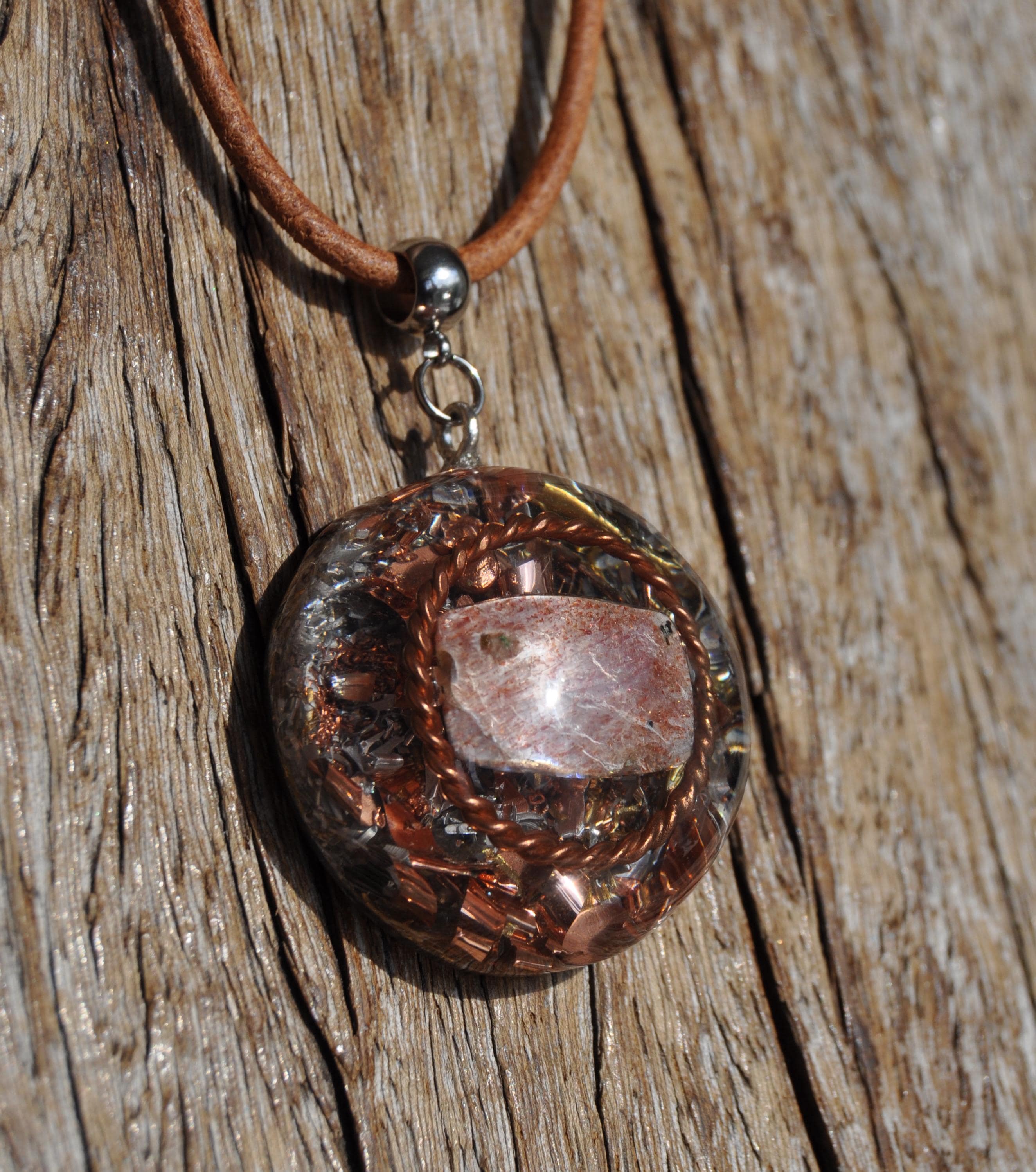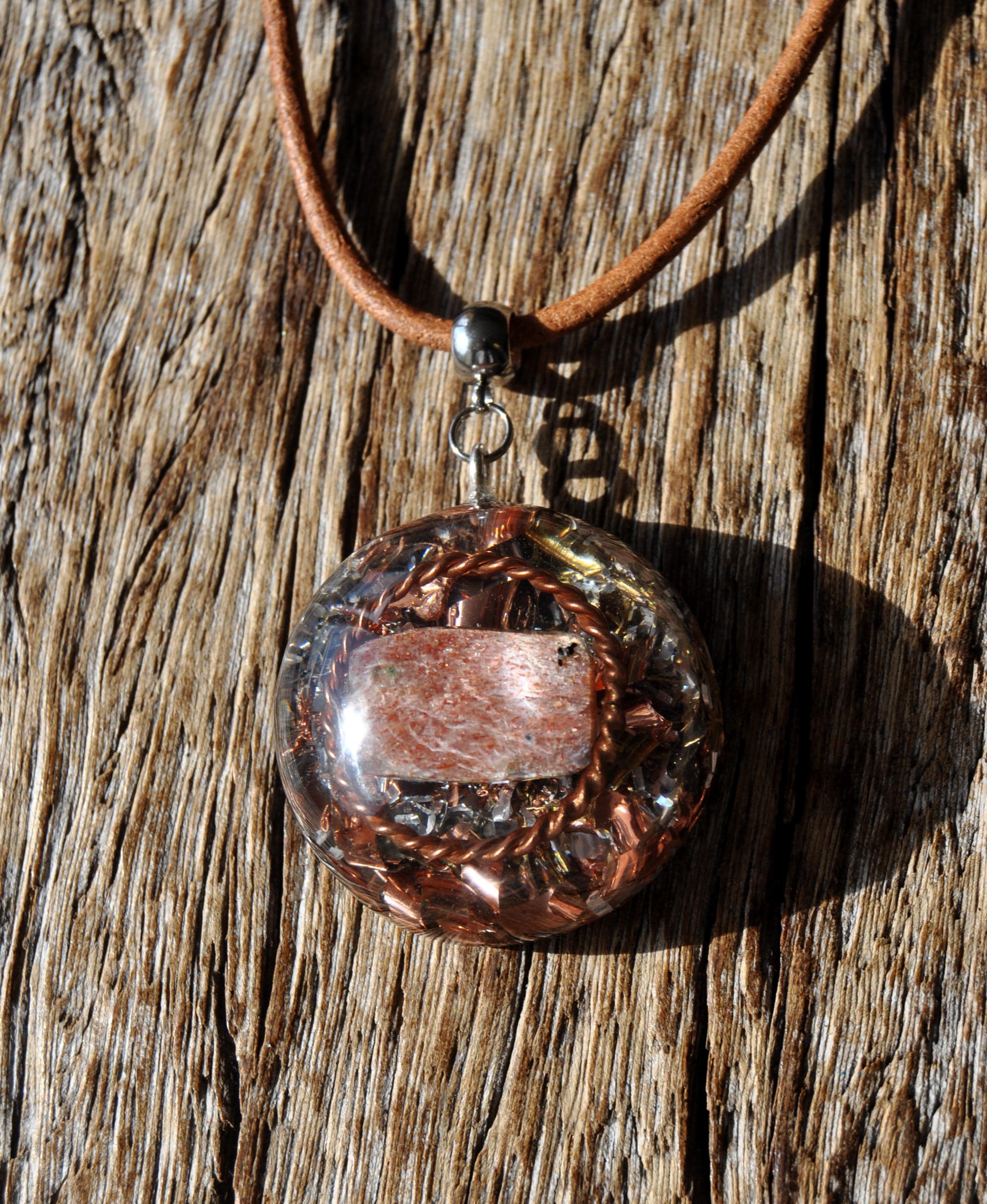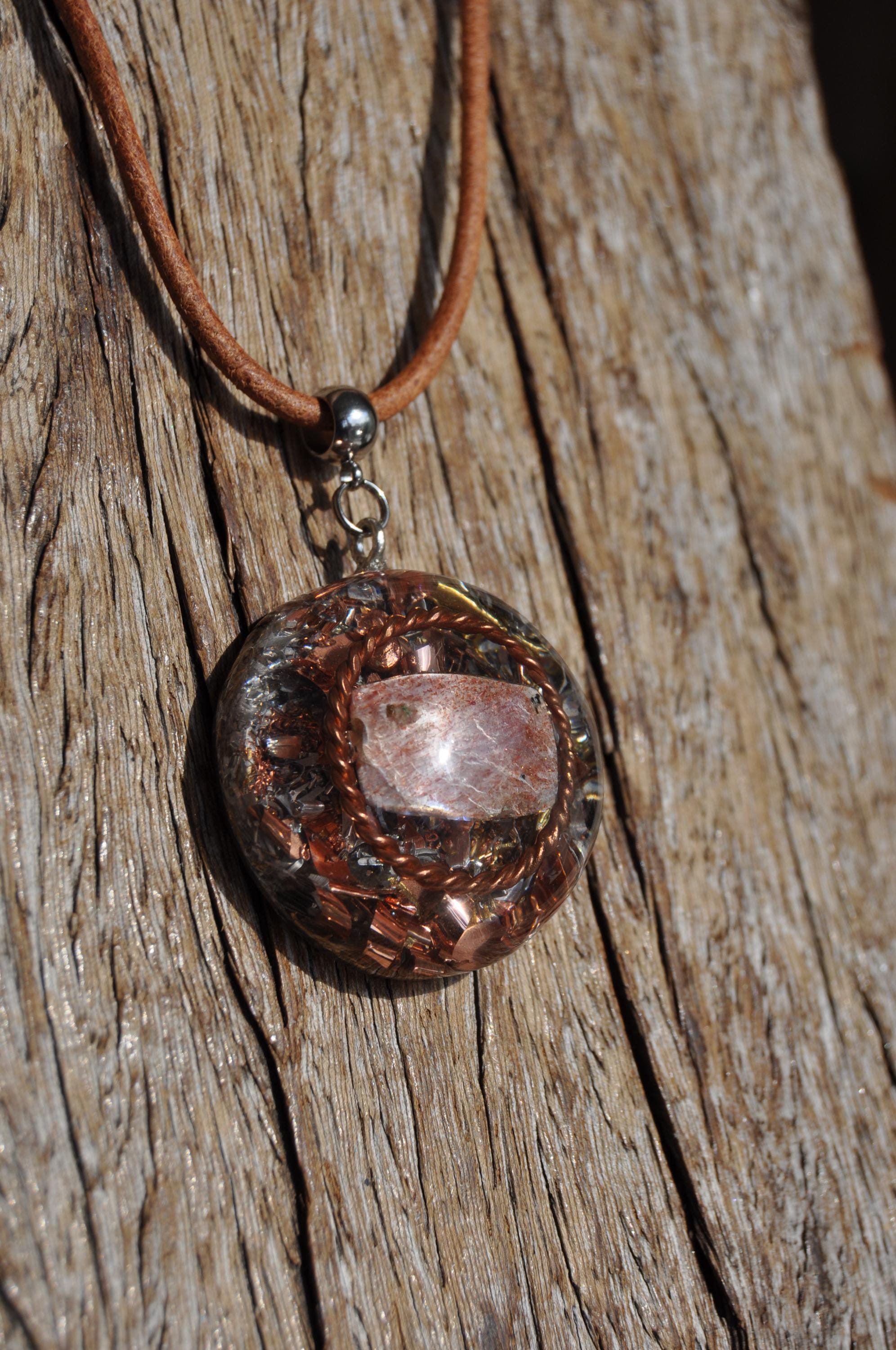 This handmade orgonite necklace features a beautifully polished Sunstone gemstone encircled by a Copper Tensor Ring, lovingly crafted with care and positive intention.