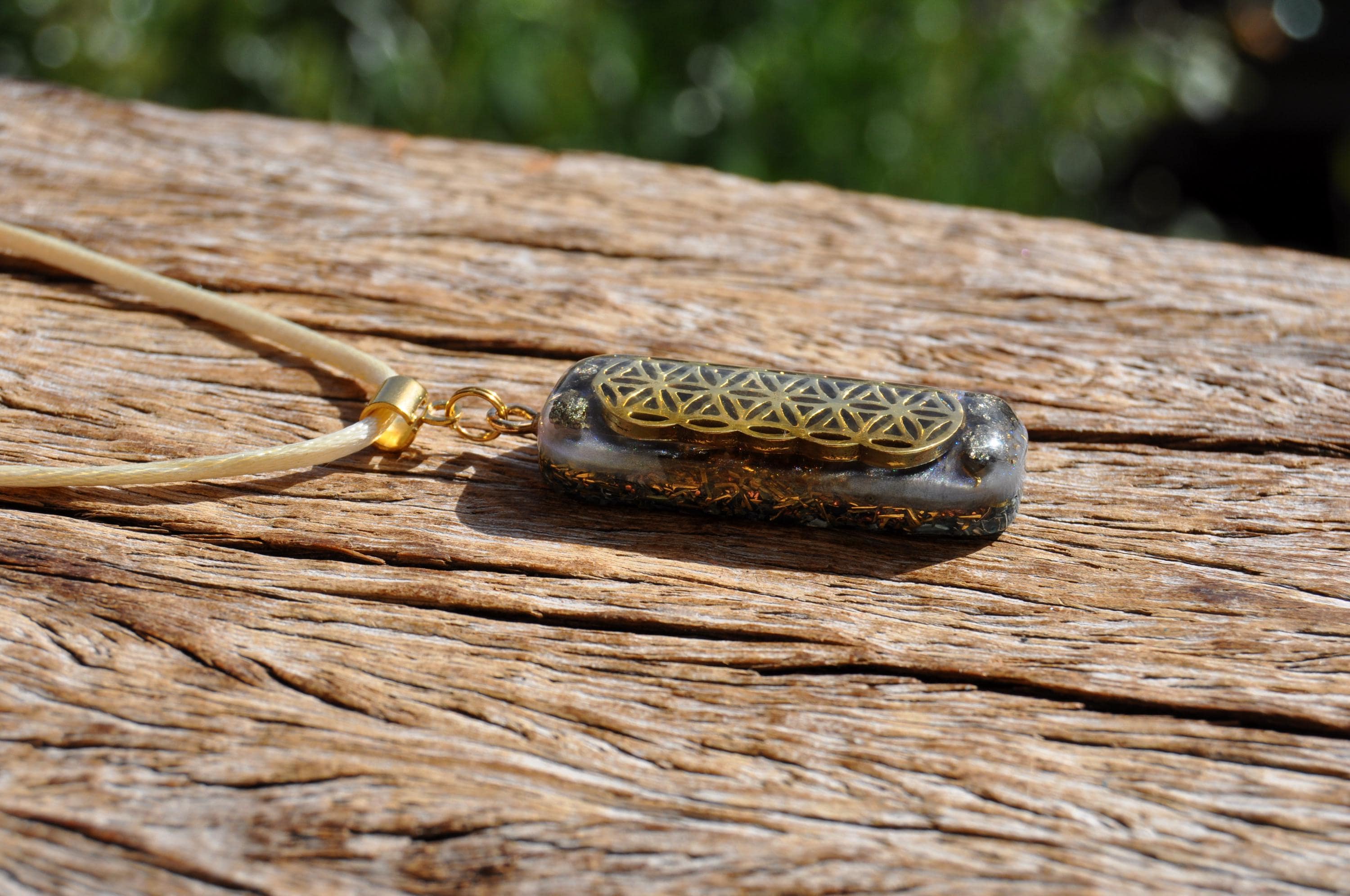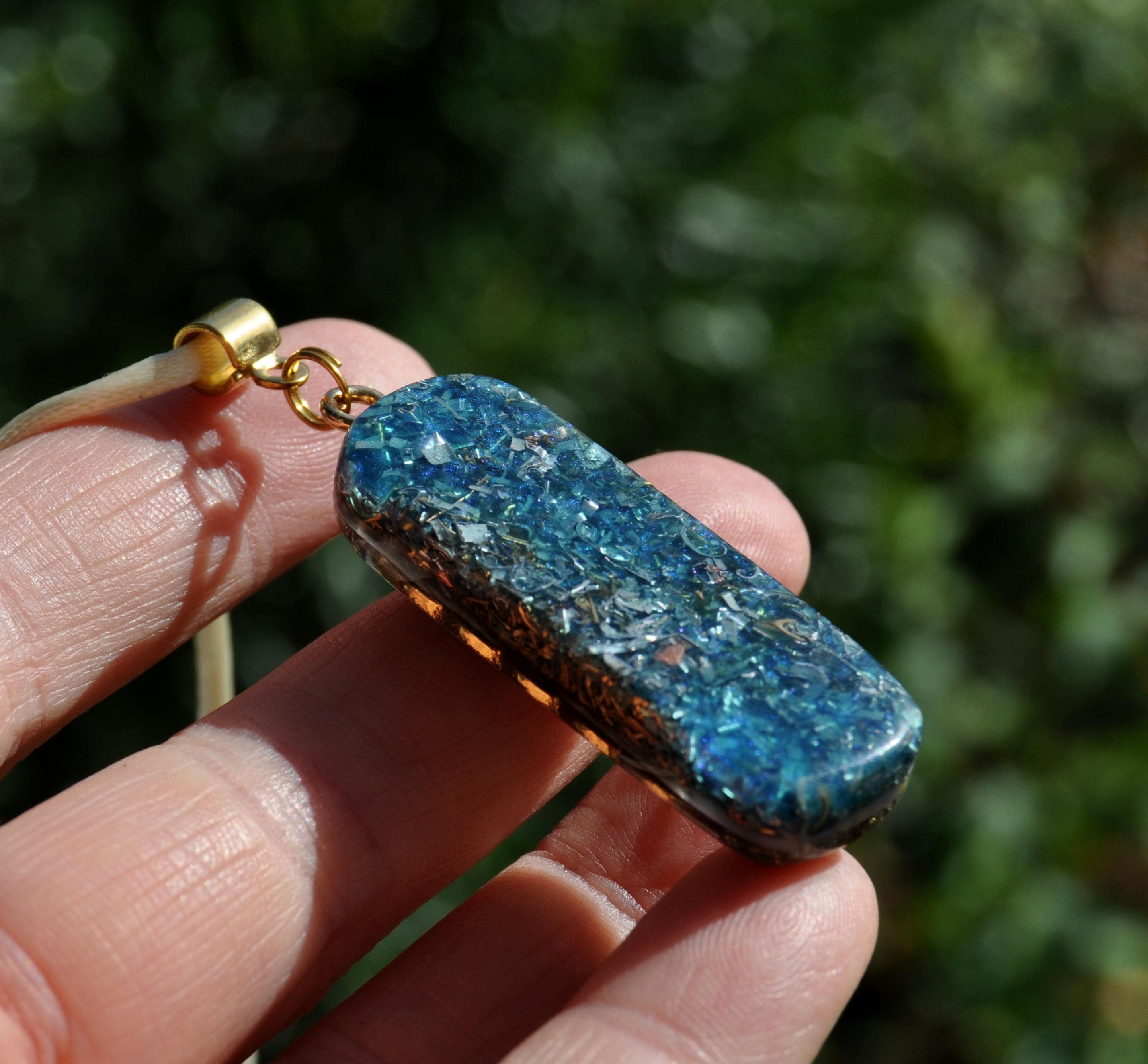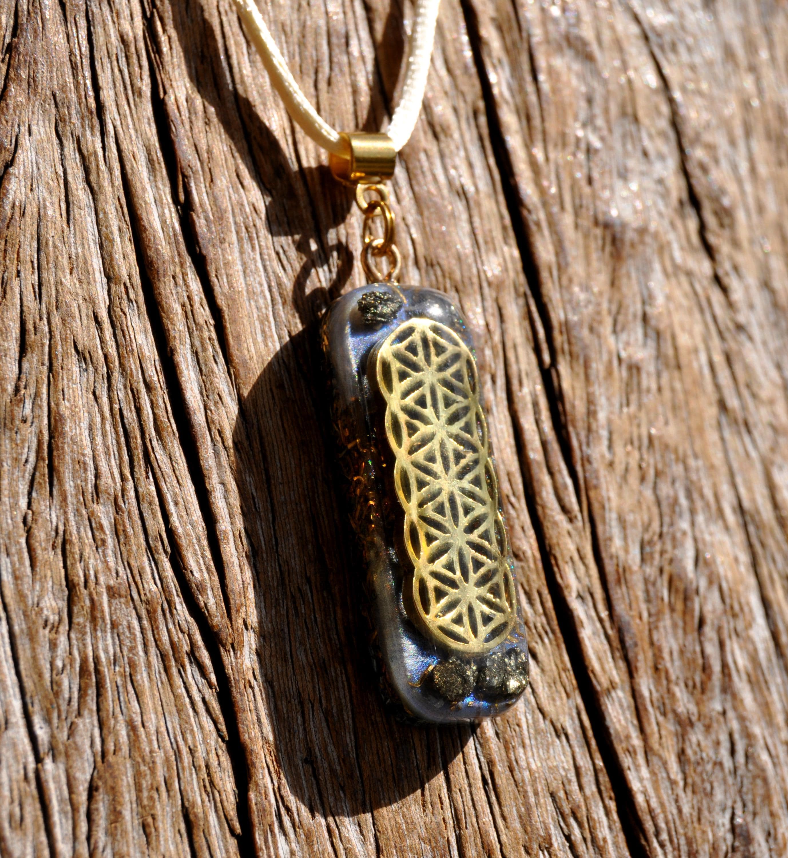 Incorporating Pyrite clusters into an Orgonite® pendant is believed to strengthen the piece’s natural harmony and enhance its overall energetic resonance.