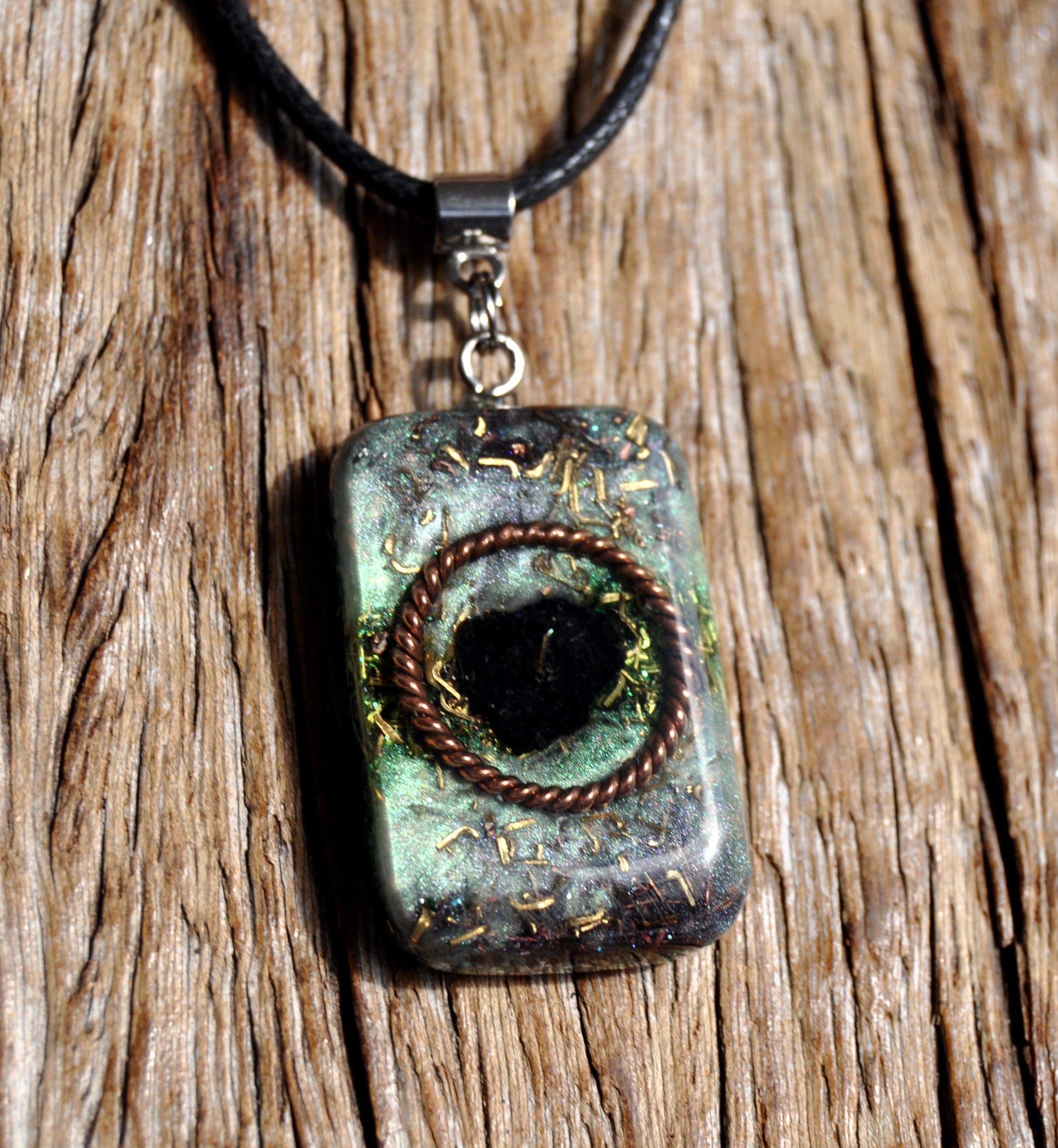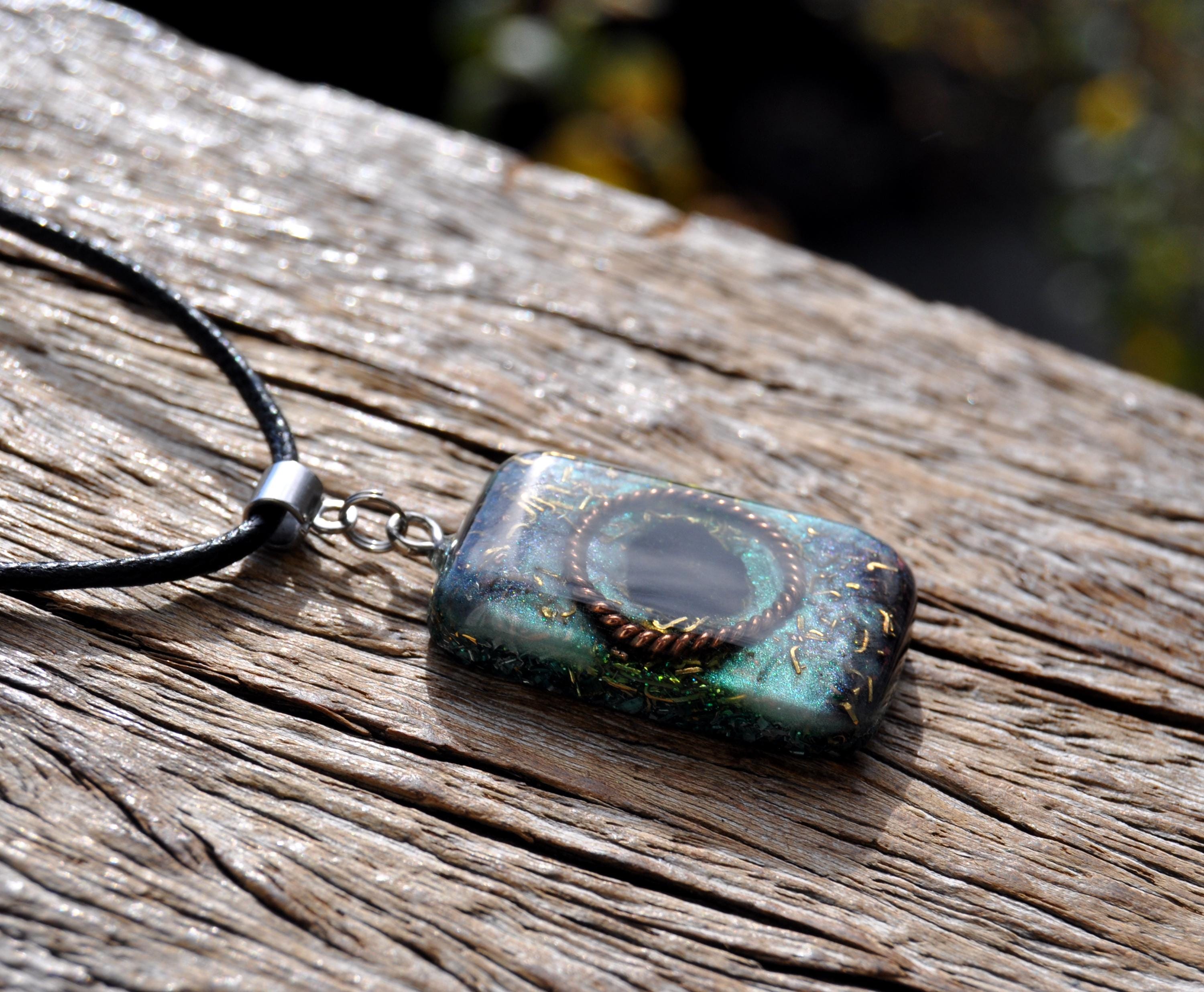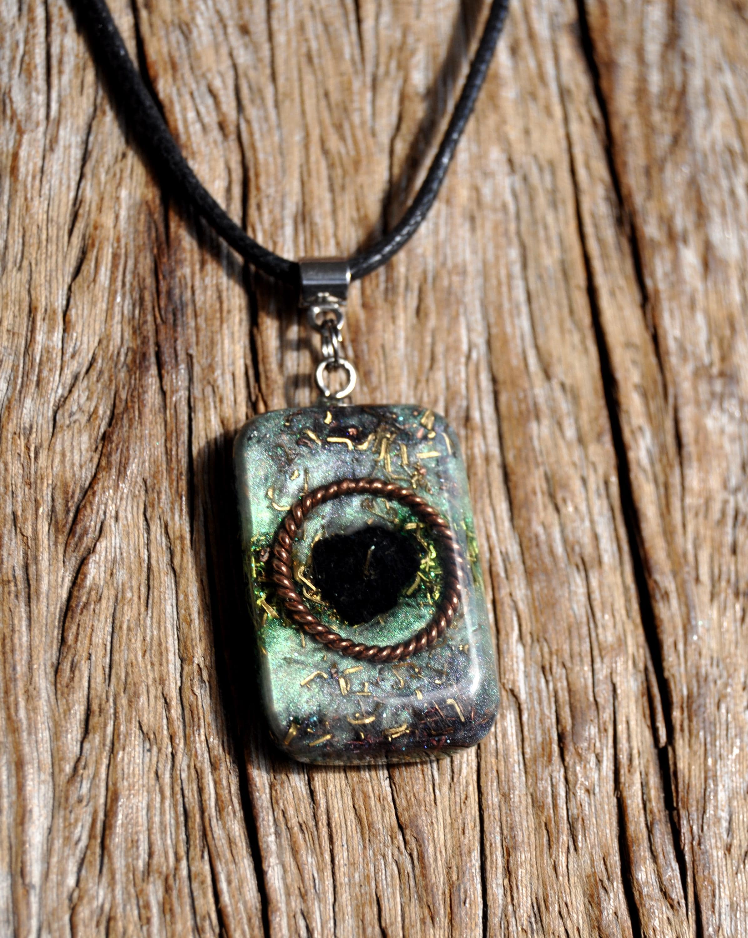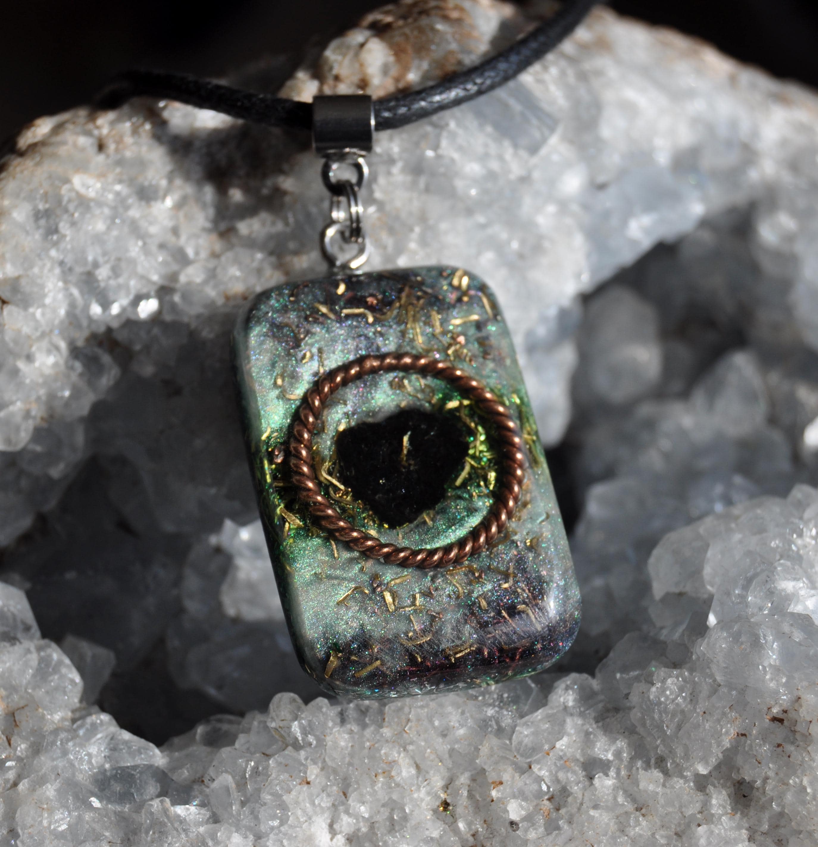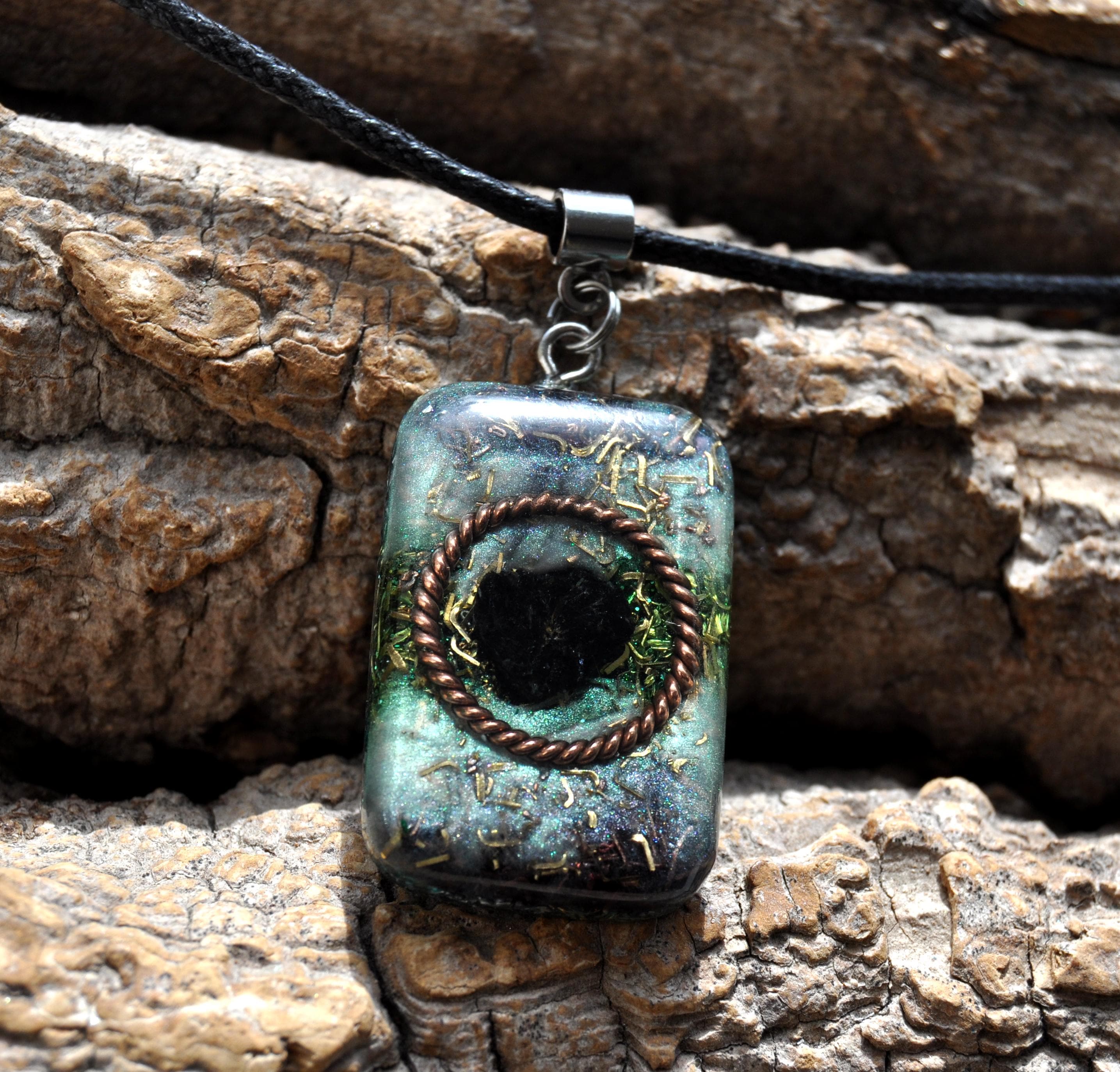 This Orgonite® pendant centers around a genuine piece of Nuummite, one of the oldest and rarest minerals on Earth — over 3 billion years old and found only in Greenland. Often called the “Sorcerer’s Stone” in metaphysical traditions, Nuummite has long been associated with ancient Earth energy, deep grounding, and personal transformation. Its appearance is typically dark, rich, and opaque, reflecting its primal energy and deep connection to the elements.