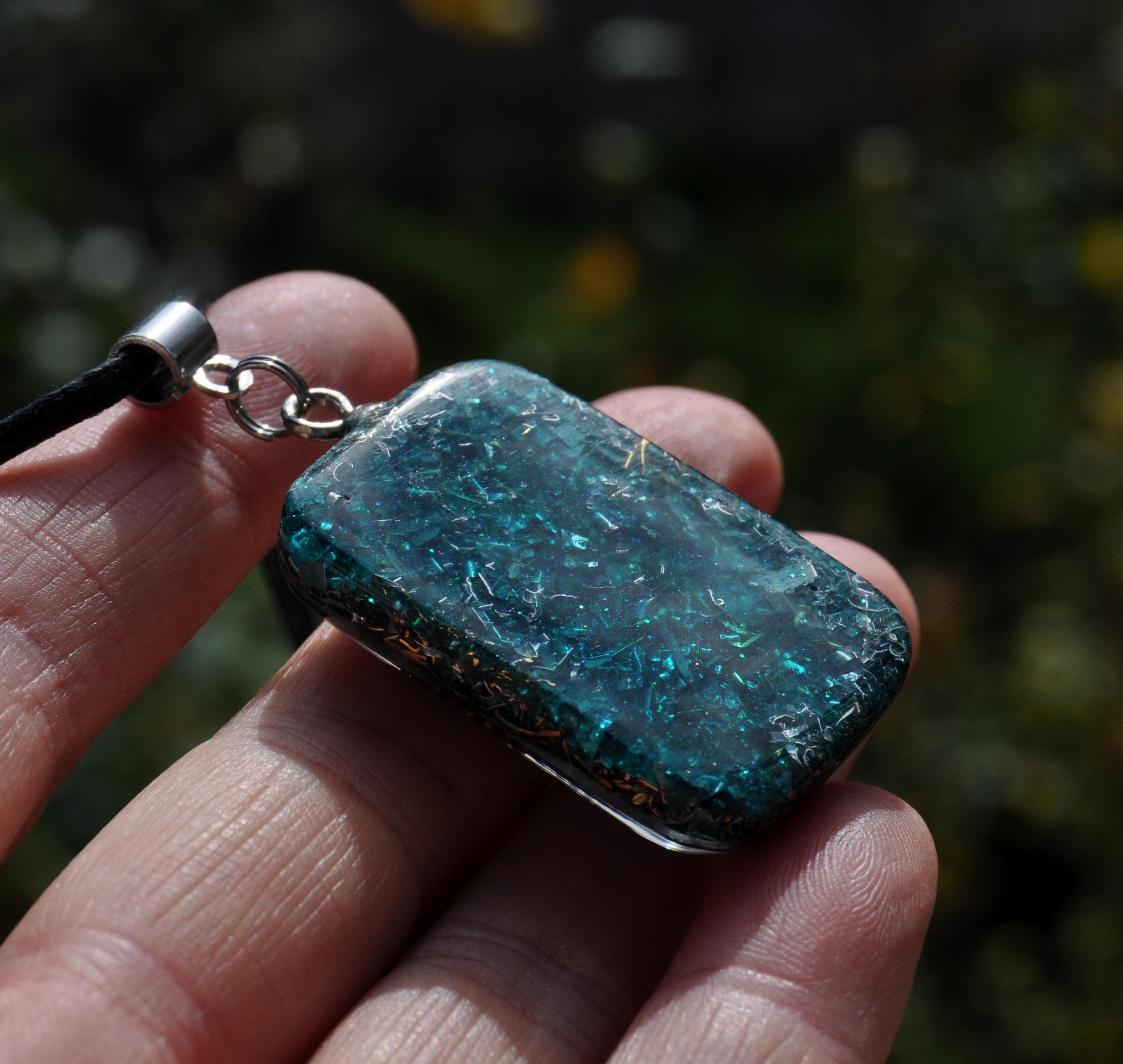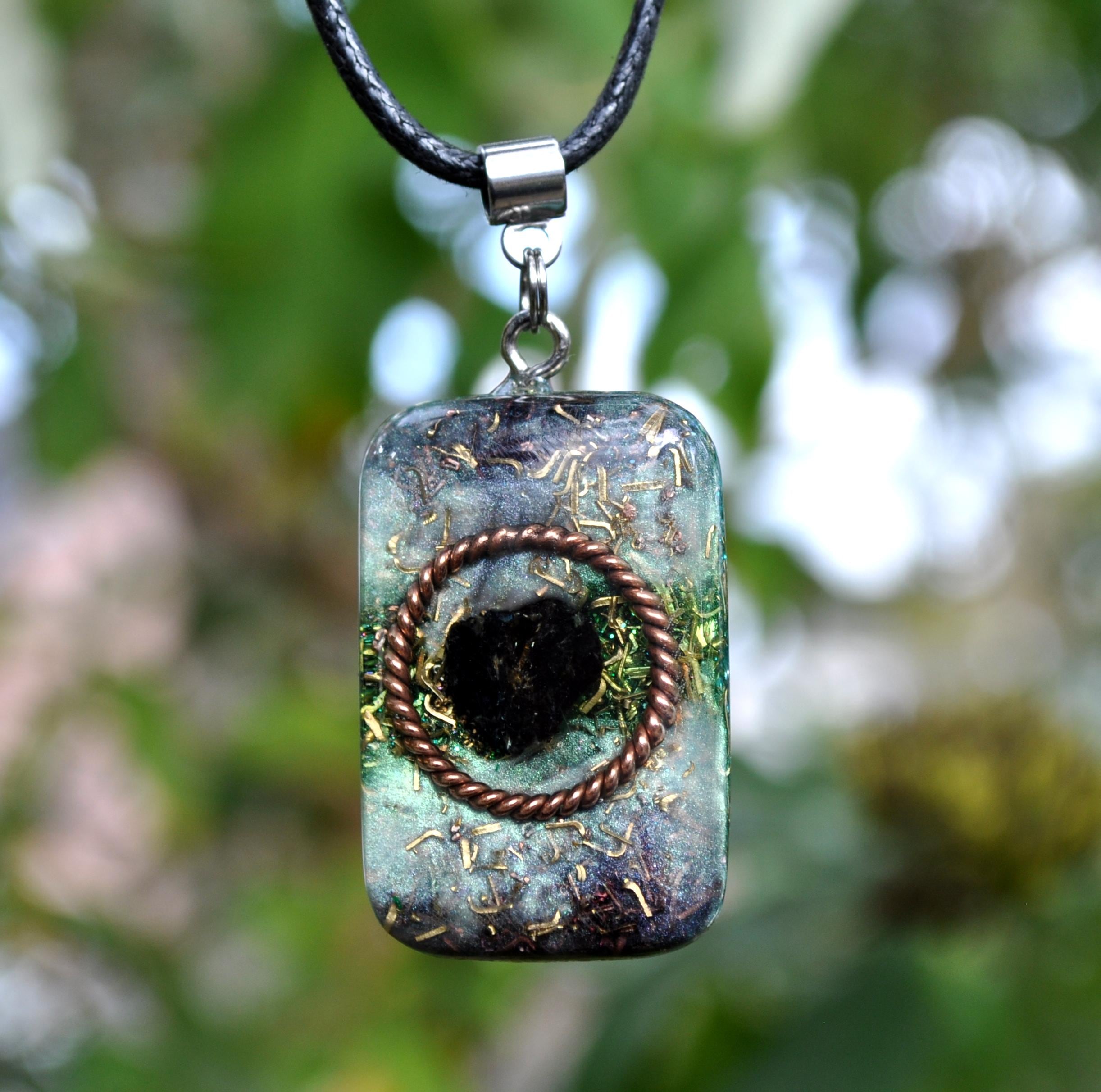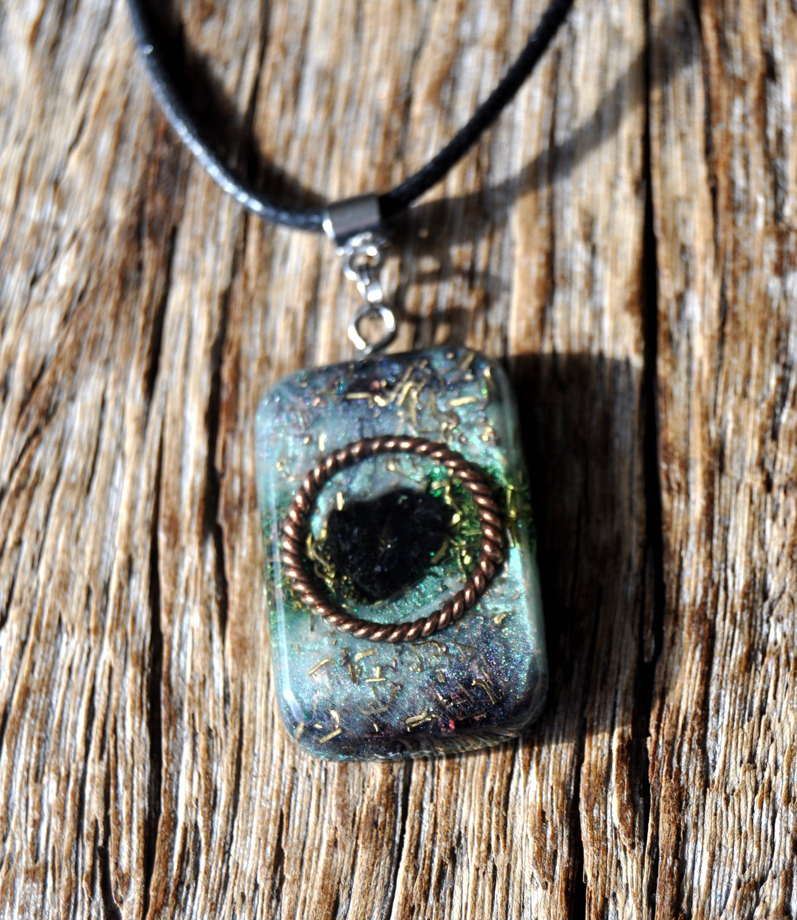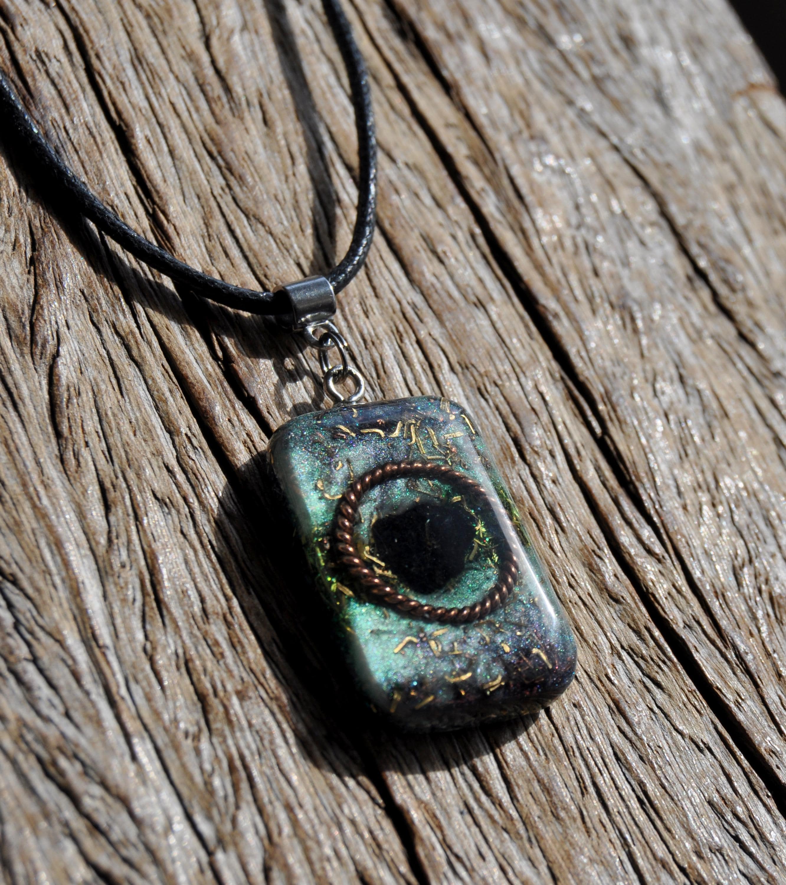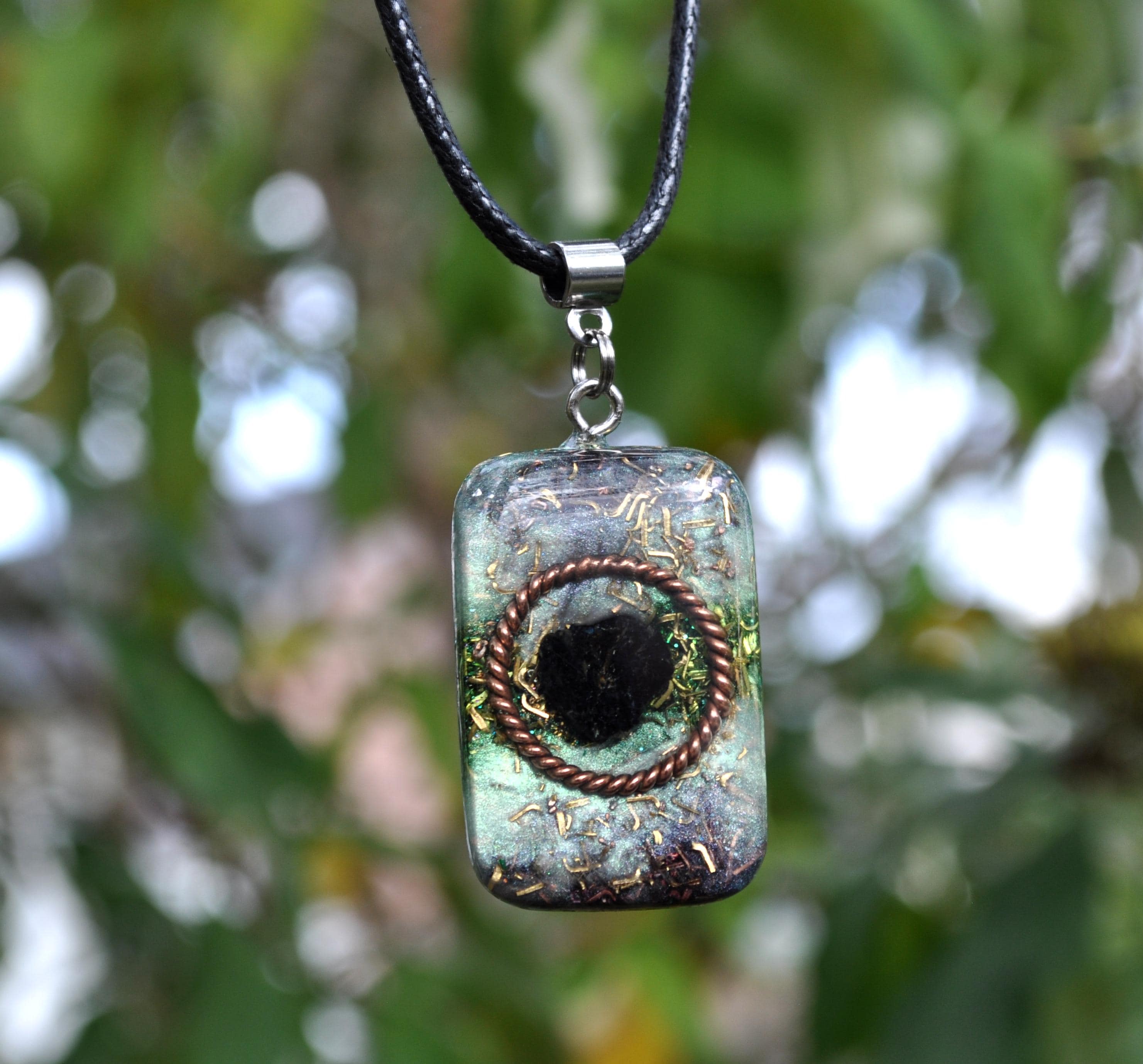 This Orgonite® pendant centers around a genuine piece of Nuummite, one of the oldest and rarest minerals on Earth — over 3 billion years old and found only in Greenland. Often called the “Sorcerer’s Stone” in metaphysical traditions, Nuummite has long been associated with ancient Earth energy, deep grounding, and personal transformation. Its appearance is typically dark, rich, and opaque, reflecting its primal energy and deep connection to the elements.