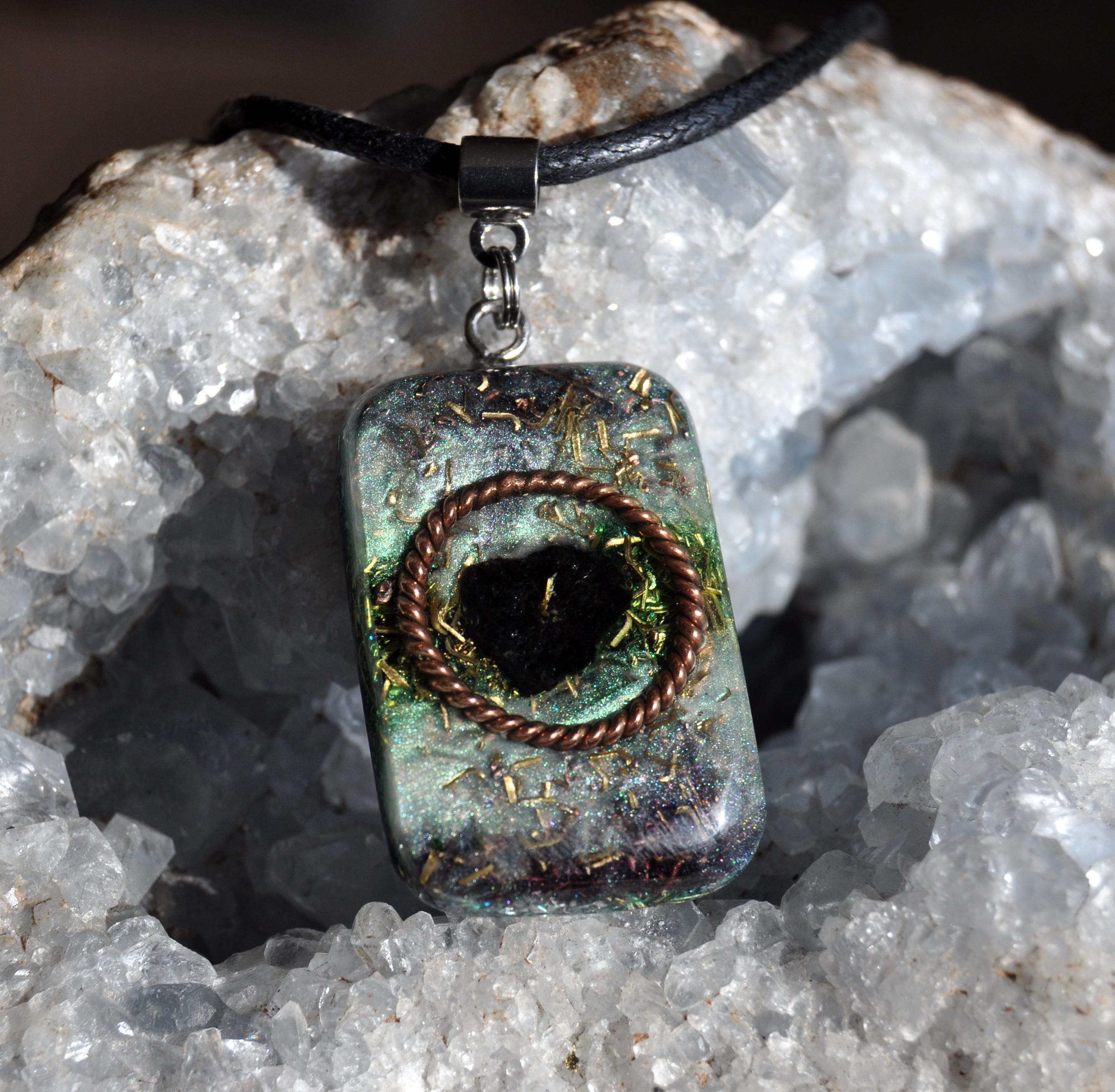 The stone is encased within a handcrafted copper tensor ring, amplifying and harmonizing its subtle energy. Combined with an Orgonite® matrix of resin and metal shavings (copper, brass, bronze, and aluminum) plus a synergistic blend of crystals — Elite Shungite, Rhodizite, Selenite, and Clear Quartz — the result is a powerful yet balanced pendant that blends natural materials and intentional design.