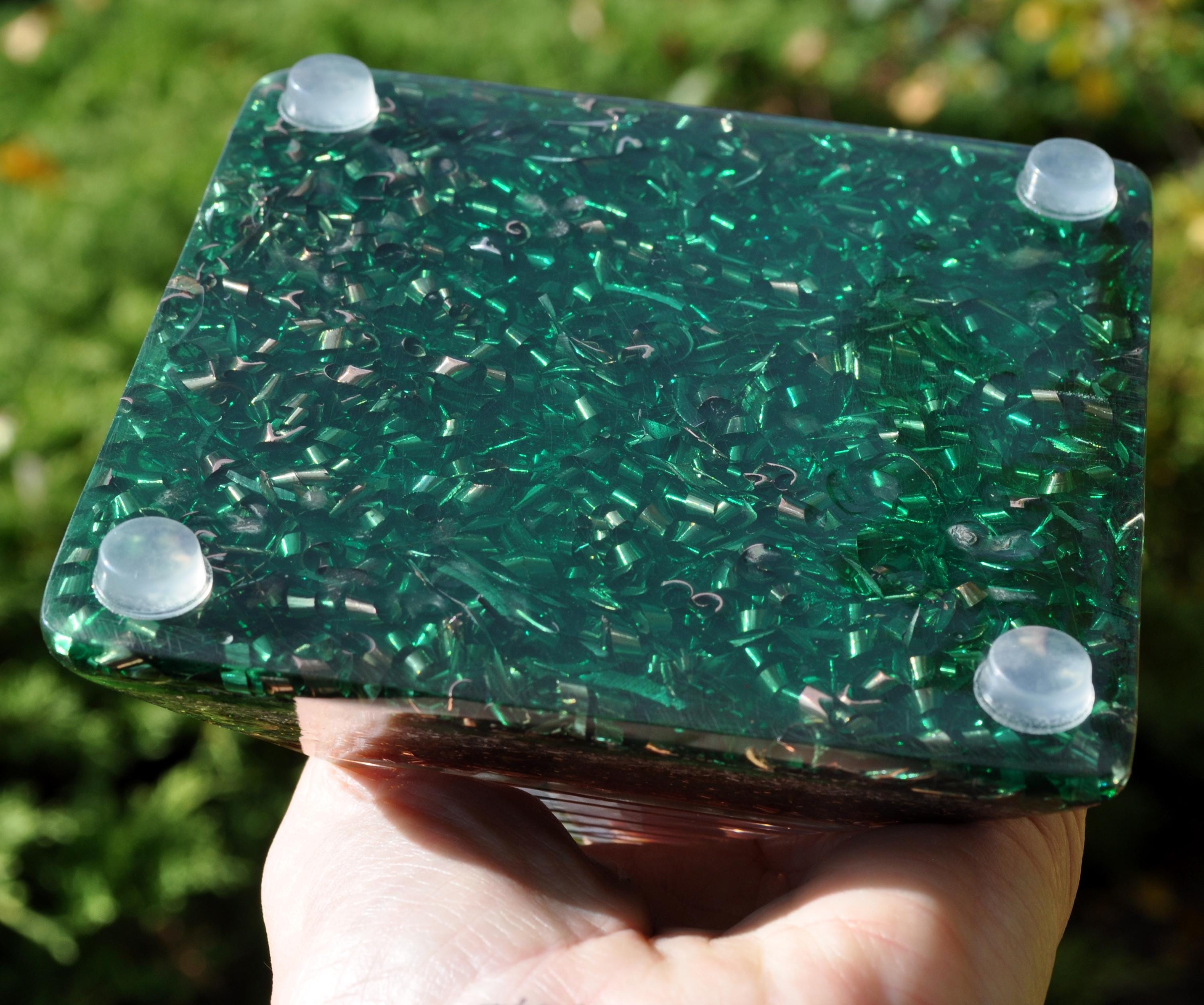 The upper layer is composed of Green Aventurine, a stone often associated with abundance, growth, and harmony. Four Green Tourmaline points are embedded in each corner for balance. Beneath the stones are layers of aluminum, bronze, copper, and brass, based on principles originally explored by Dr. Wilhelm Reich, who studied how organic and inorganic materials interact to attract and transform subtle energy.