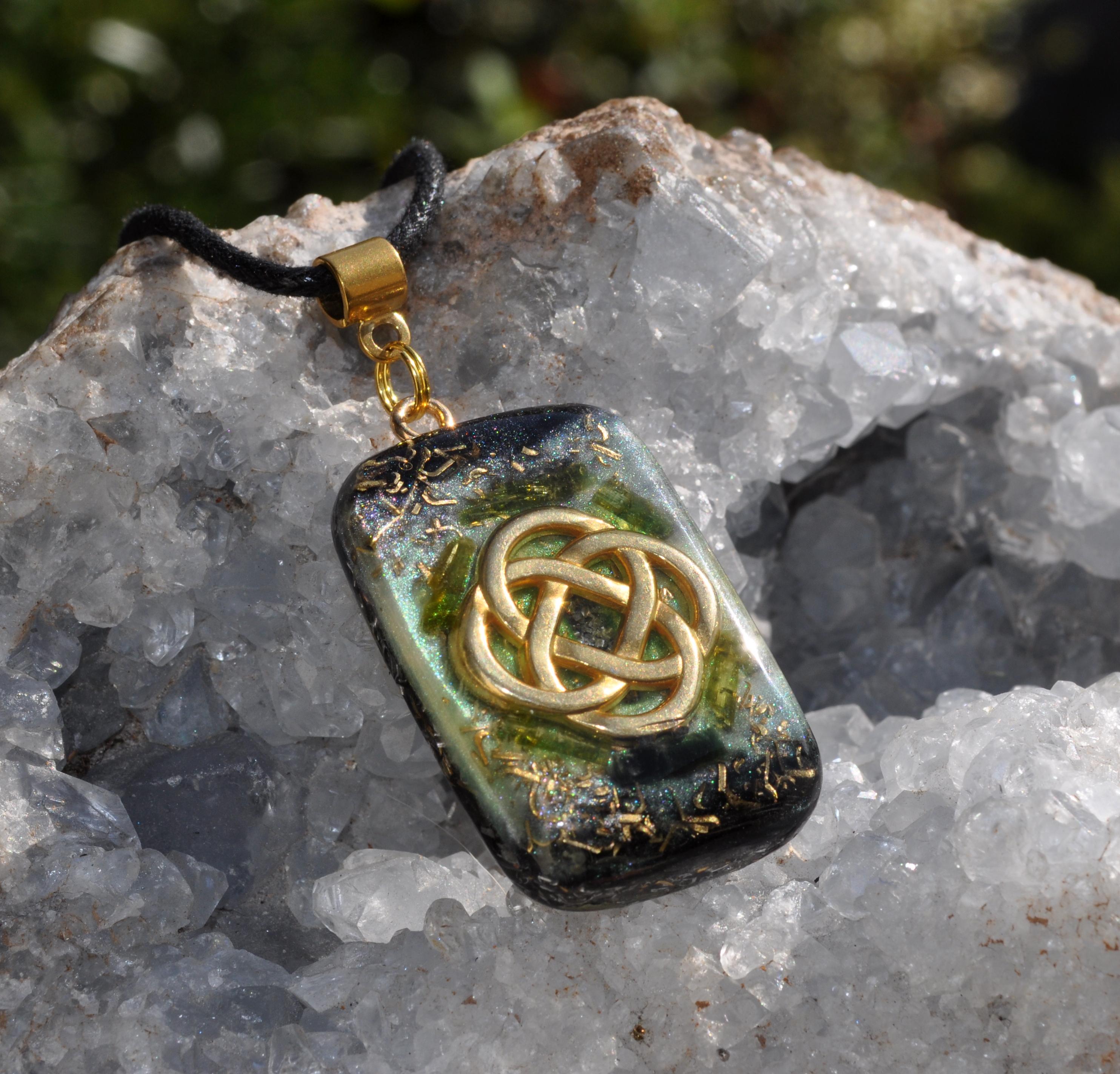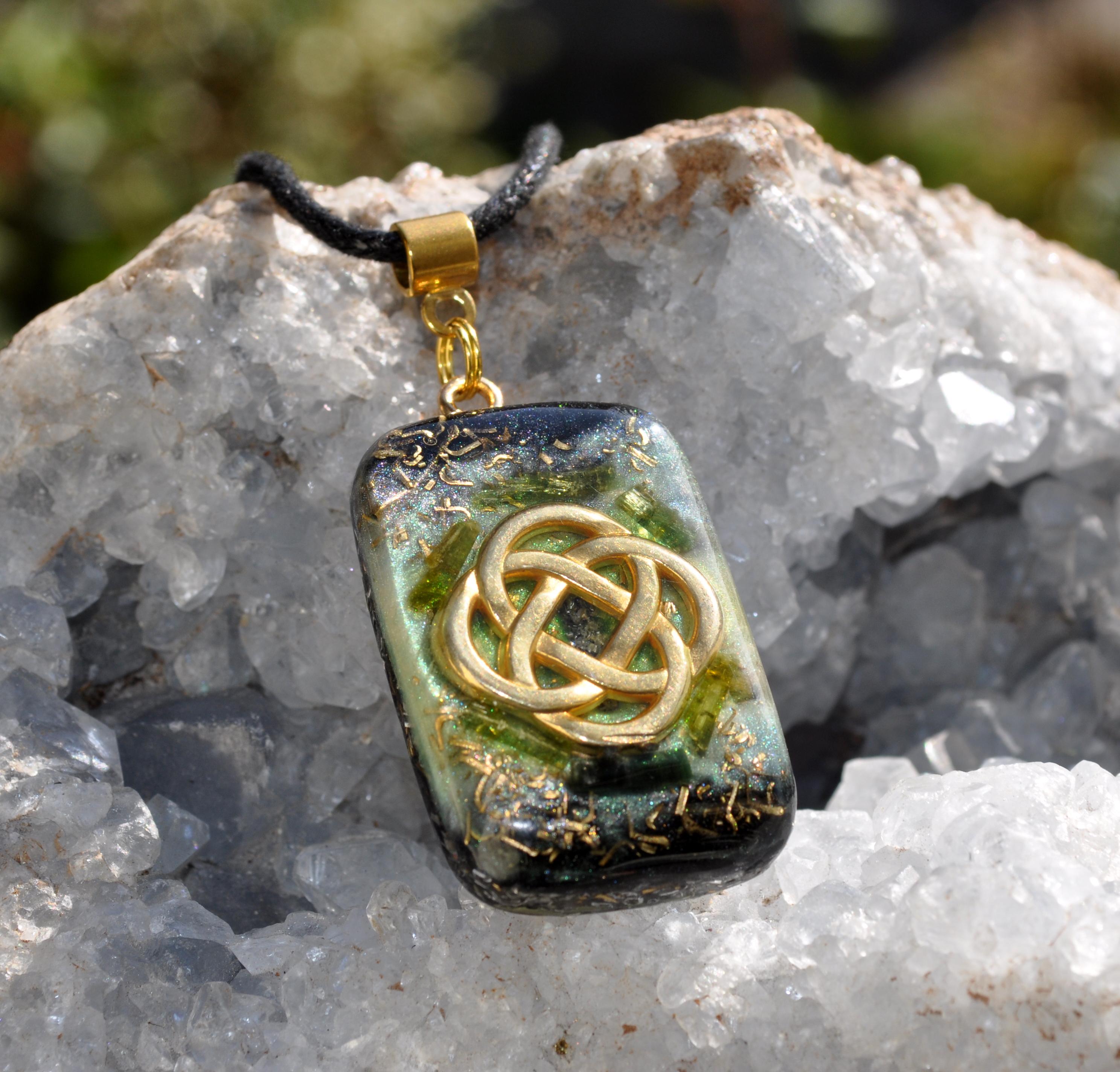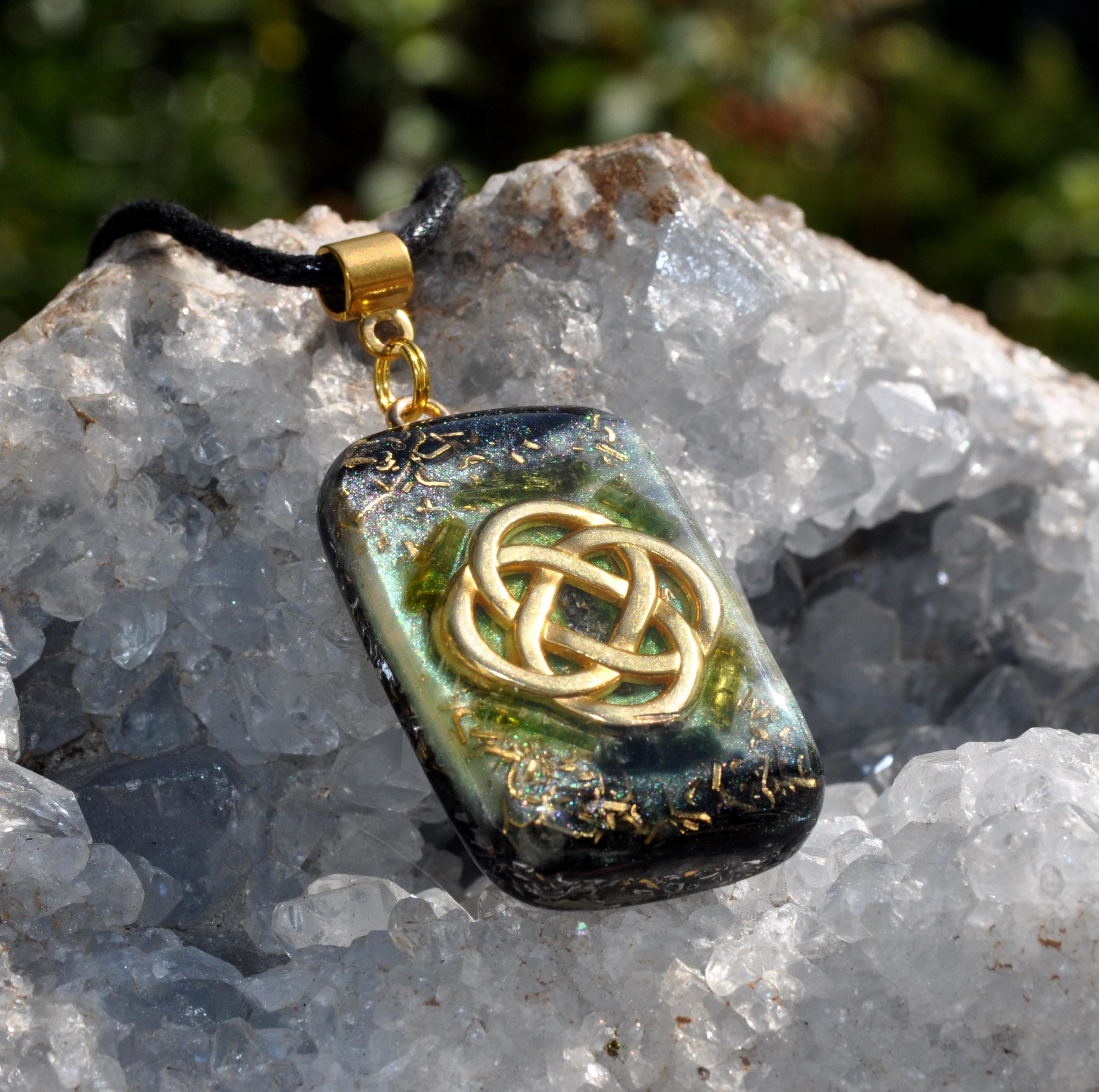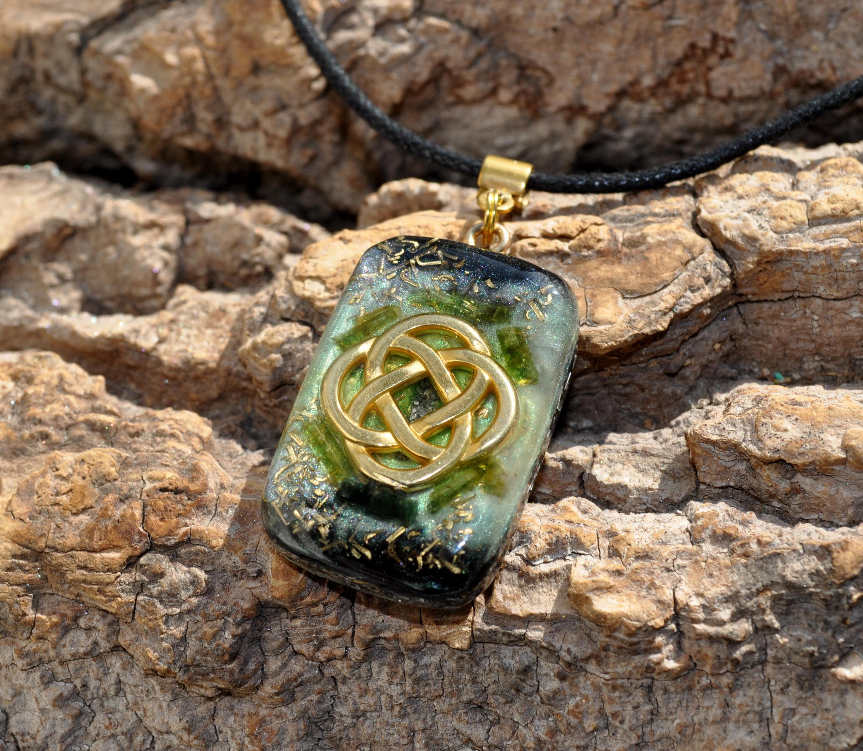 Handmade Orgonite® Celtic Knot Pendant with Green Tourmaline, Rose Quartz & Black Obsidian – Energy Harmonizing Jewelry