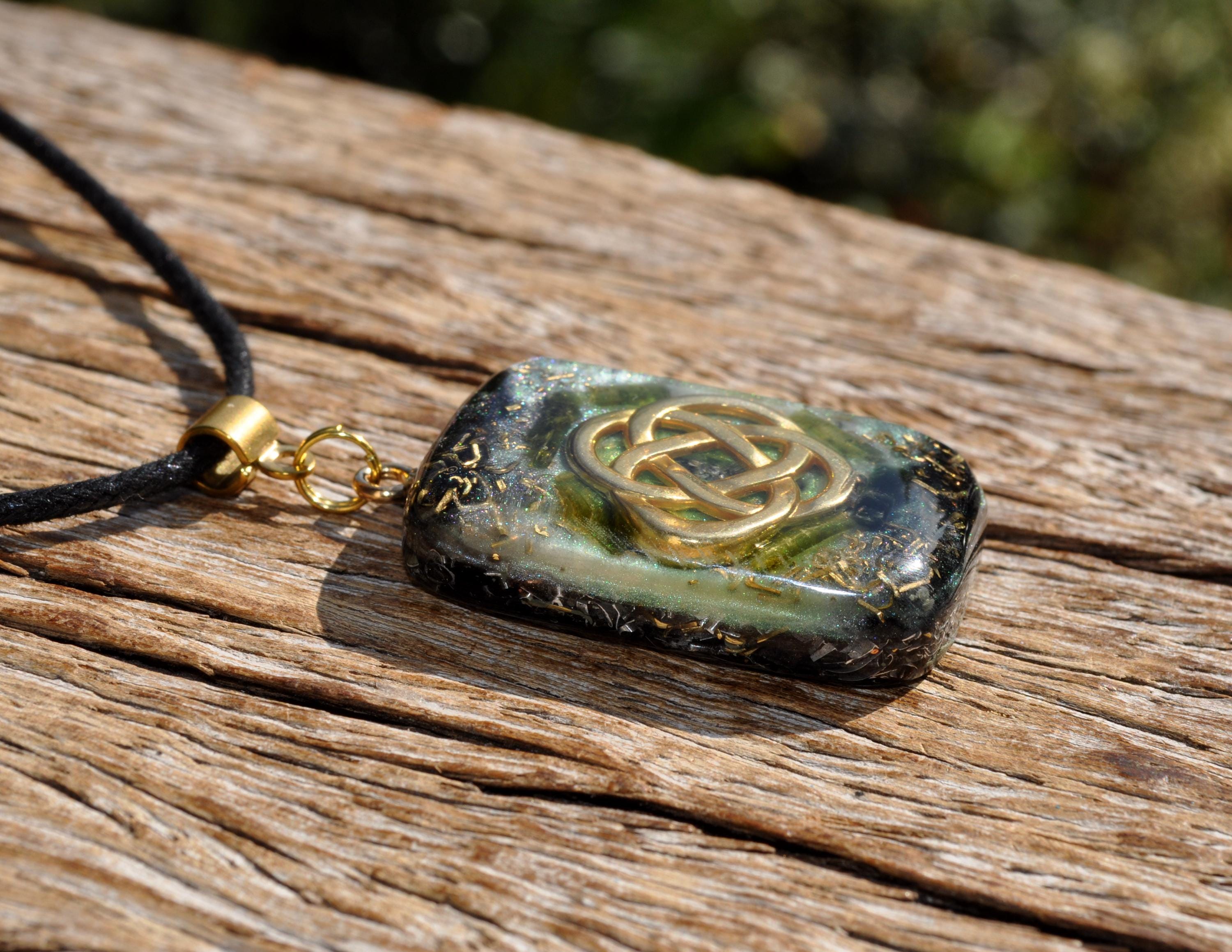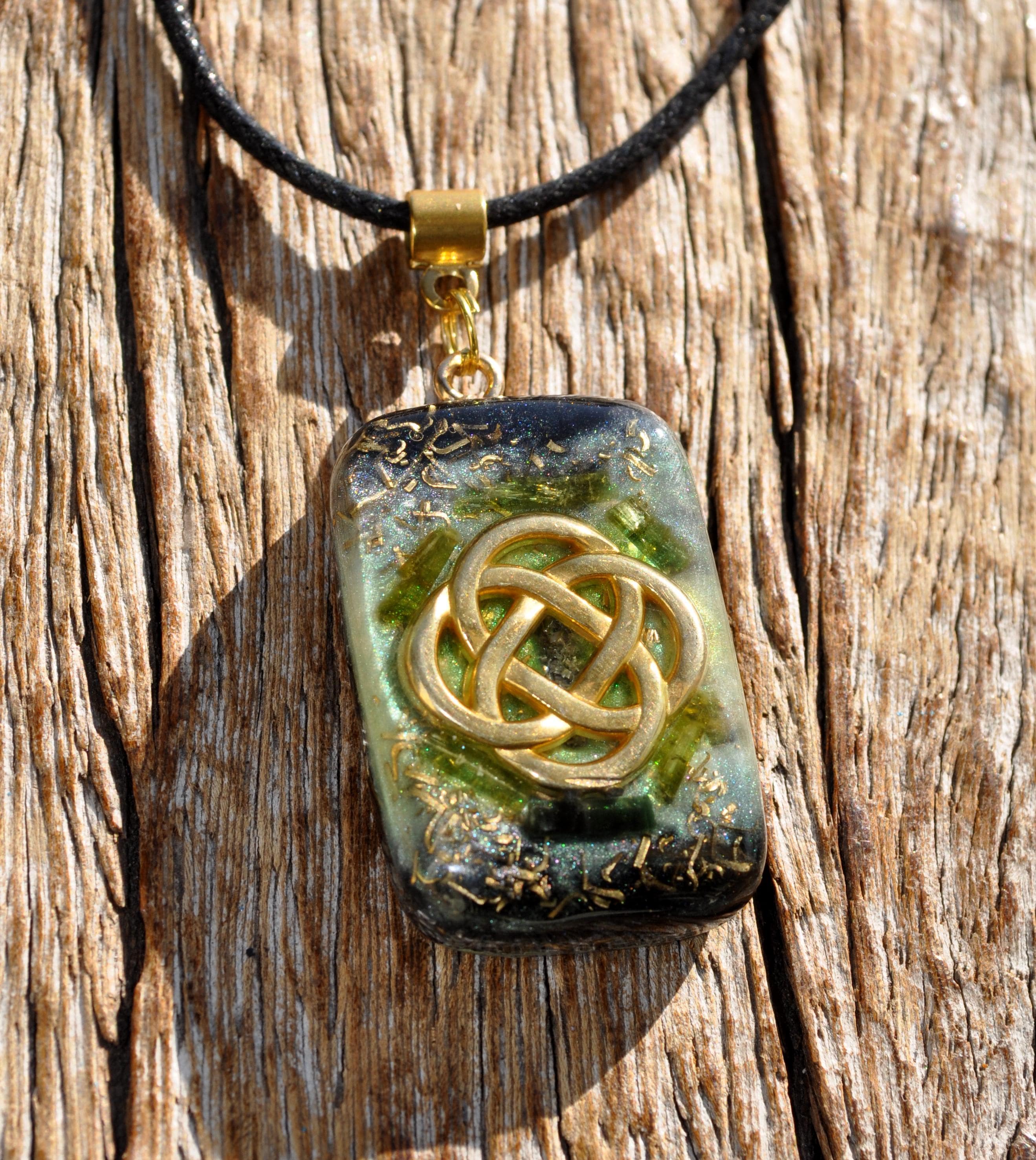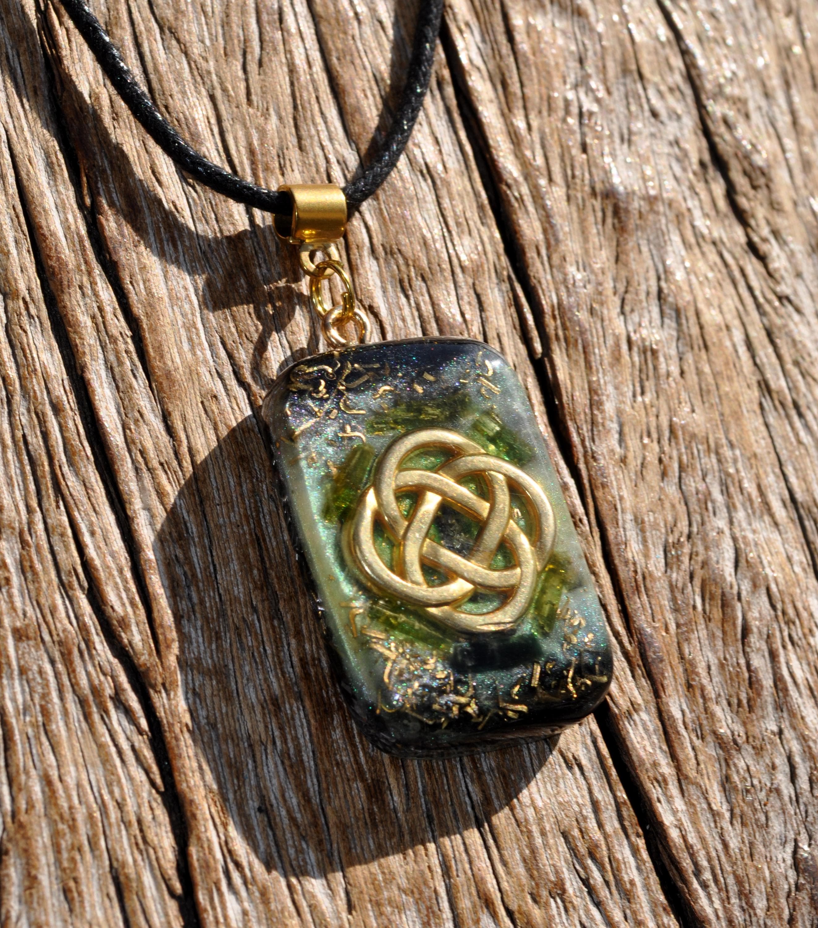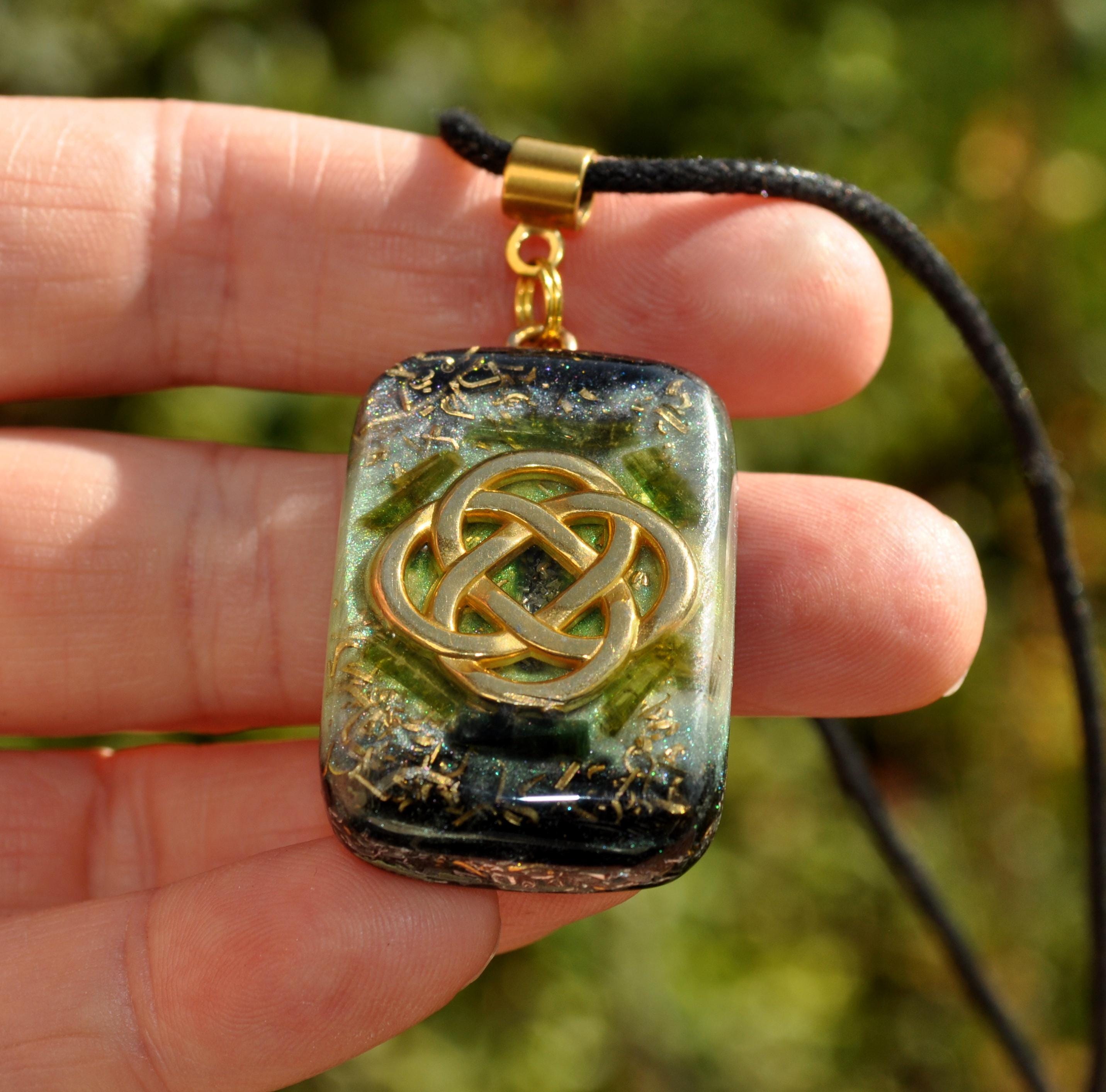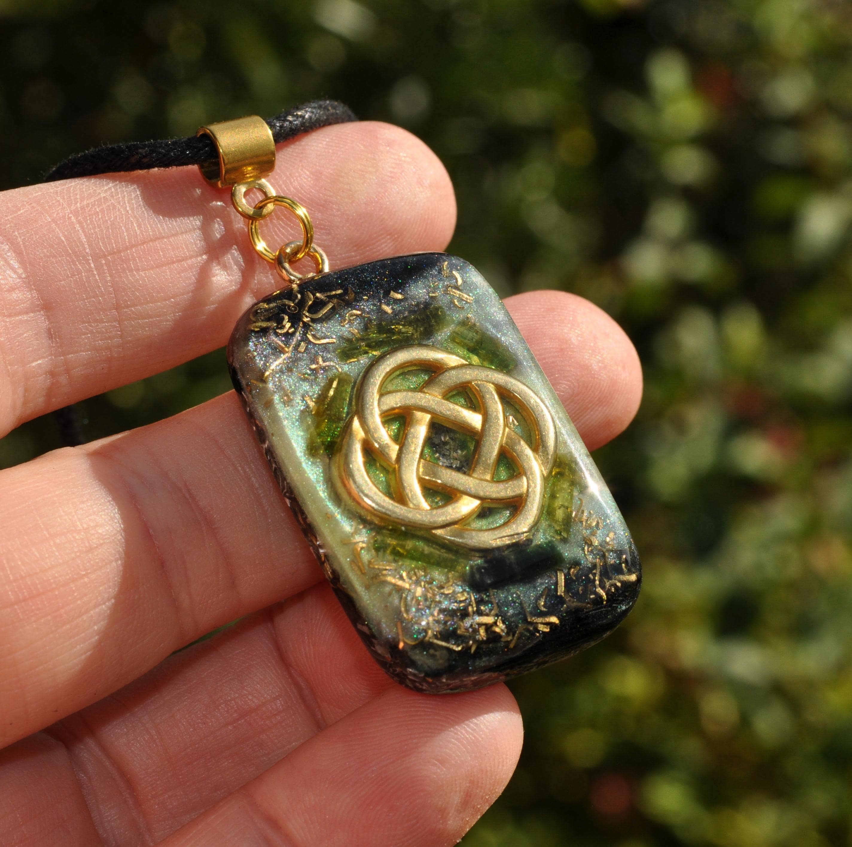 Handmade Orgonite® Celtic Knot Pendant with Green Tourmaline, Rose Quartz & Black Obsidian – Energy Harmonizing Jewelry