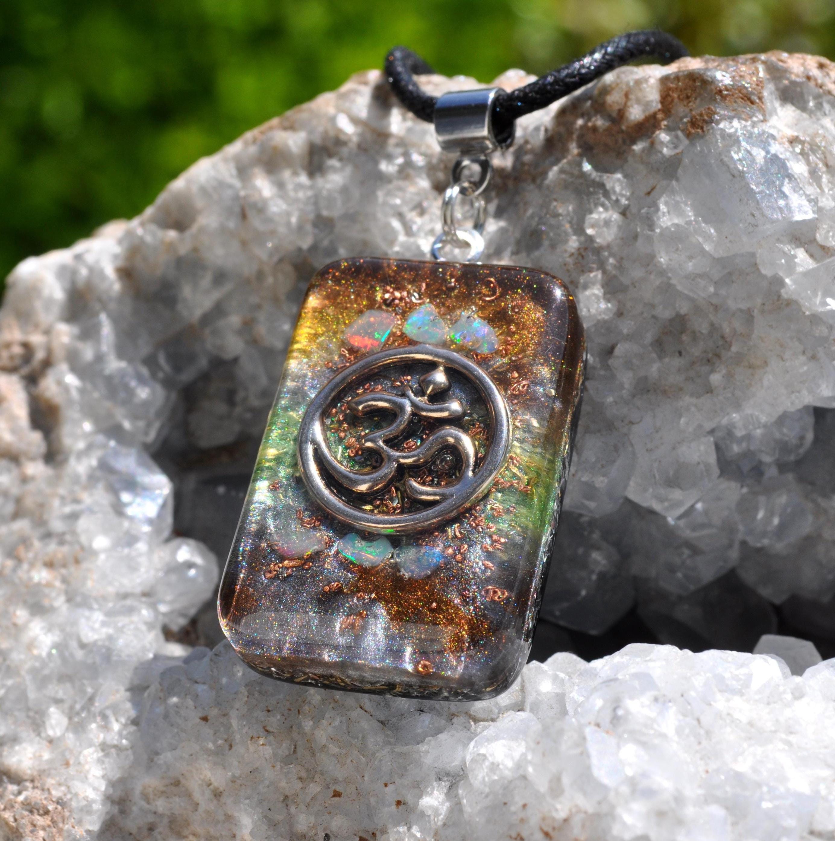 This handcrafted pendant combines symbolism, beauty, and energy. At its center is a detailed metal AUM symbol, surrounded by six hand-laid raw Welo Opals. Each piece is carefully encased in clear resin and finished by hand, blending art and purpose in one meaningful design.