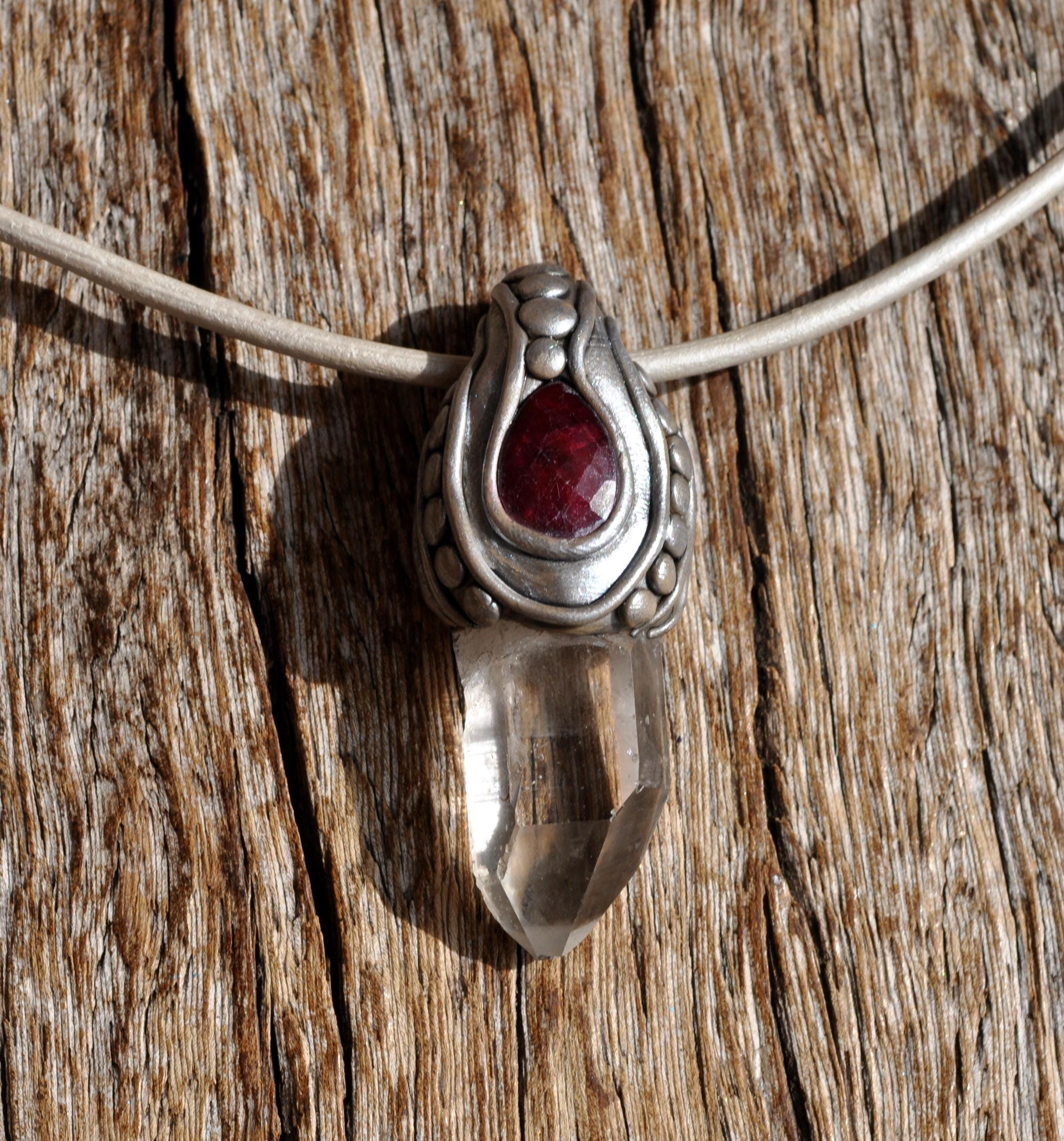 This unique pendant features a natural terminated Clear Quartz crystal paired with a faceted, color-enhanced natural Red Ruby. The stones are set securely in a durable, hand-sculpted clay setting, crafted with care and intention in my studio.