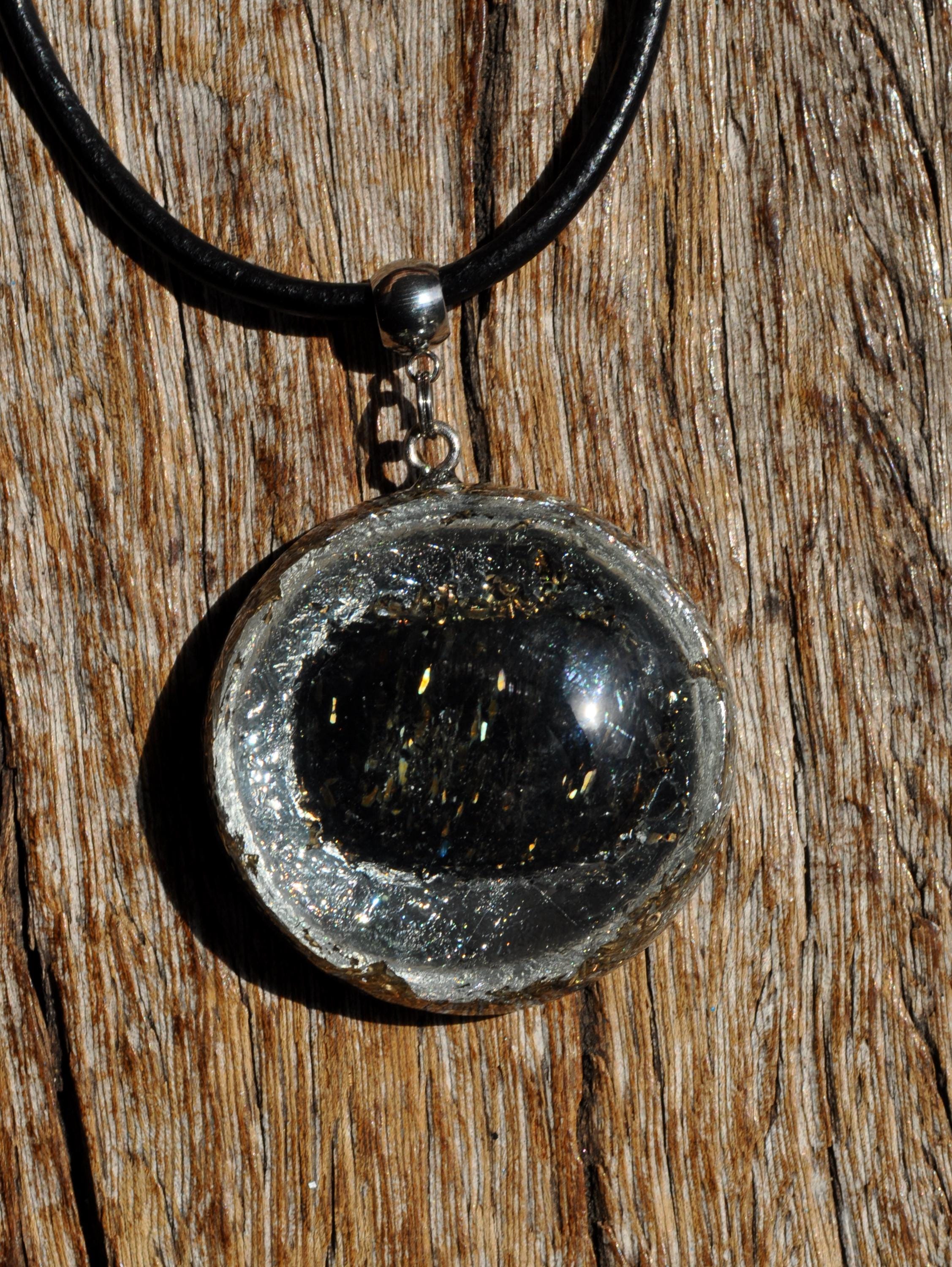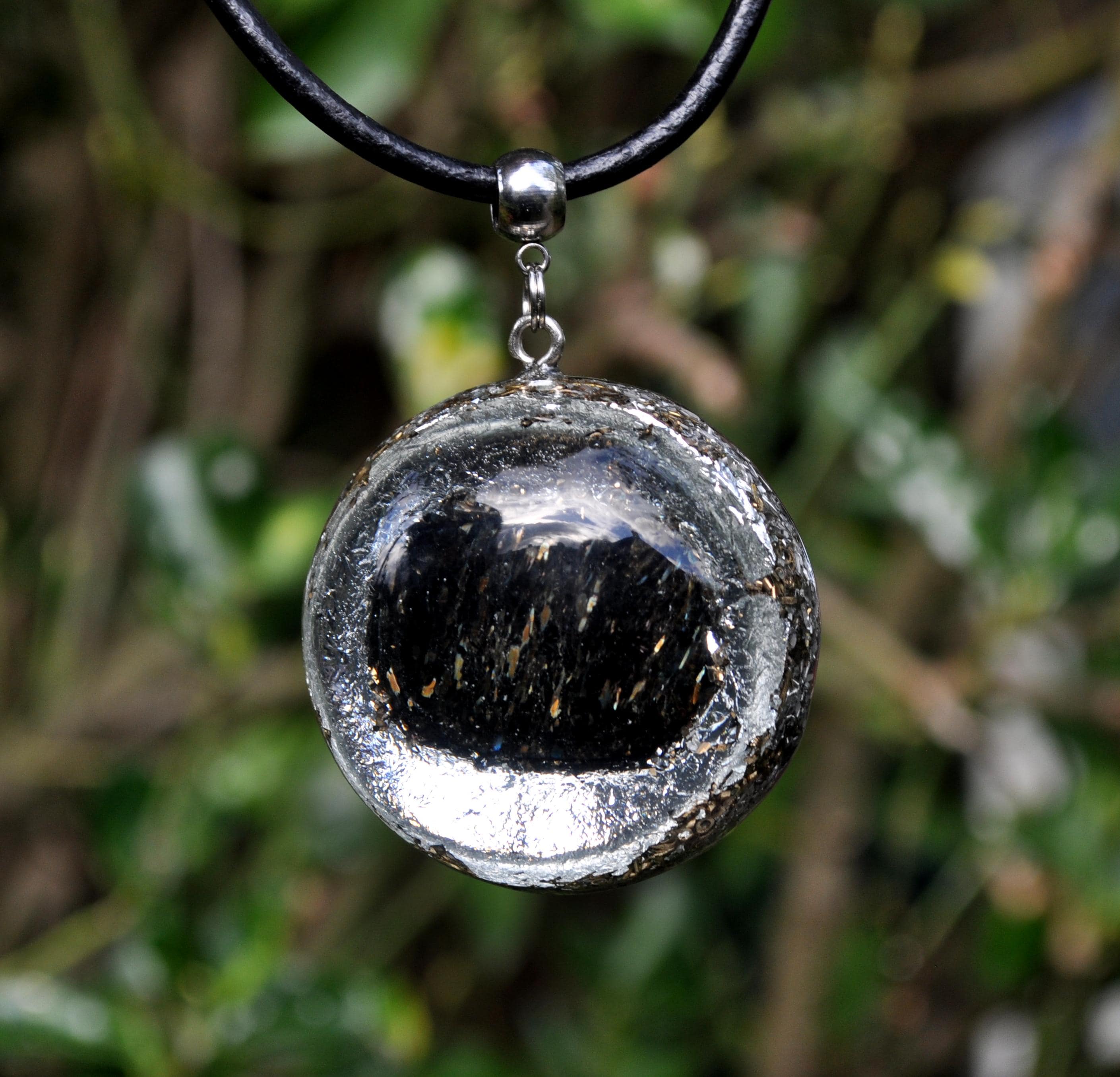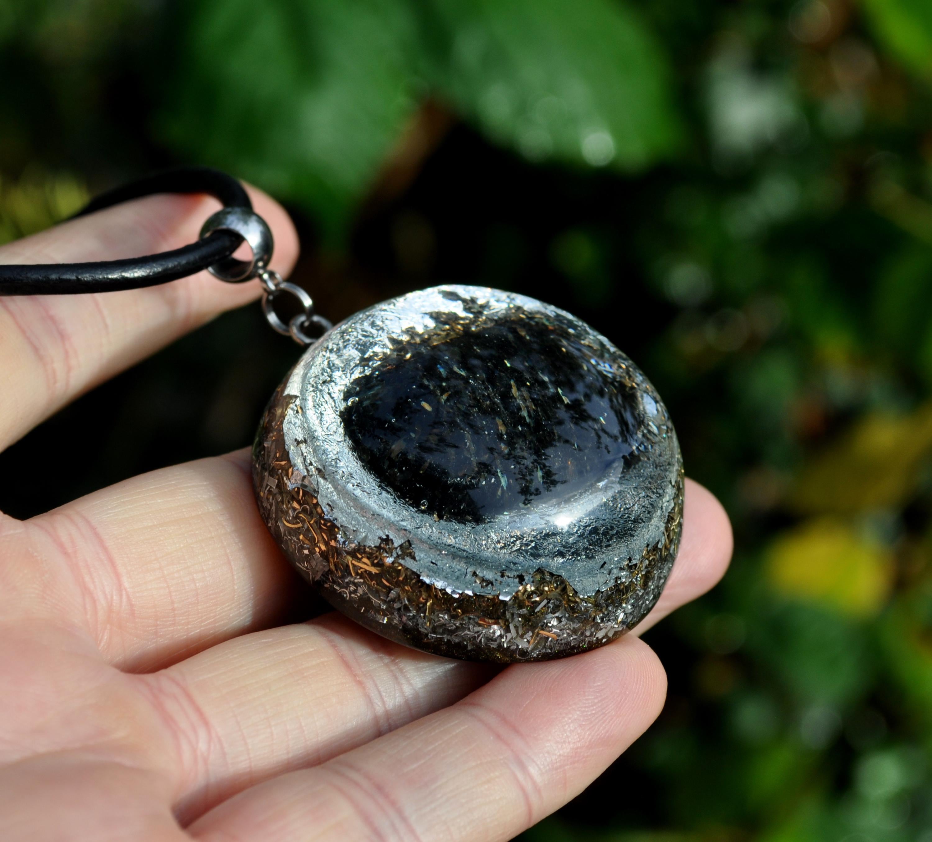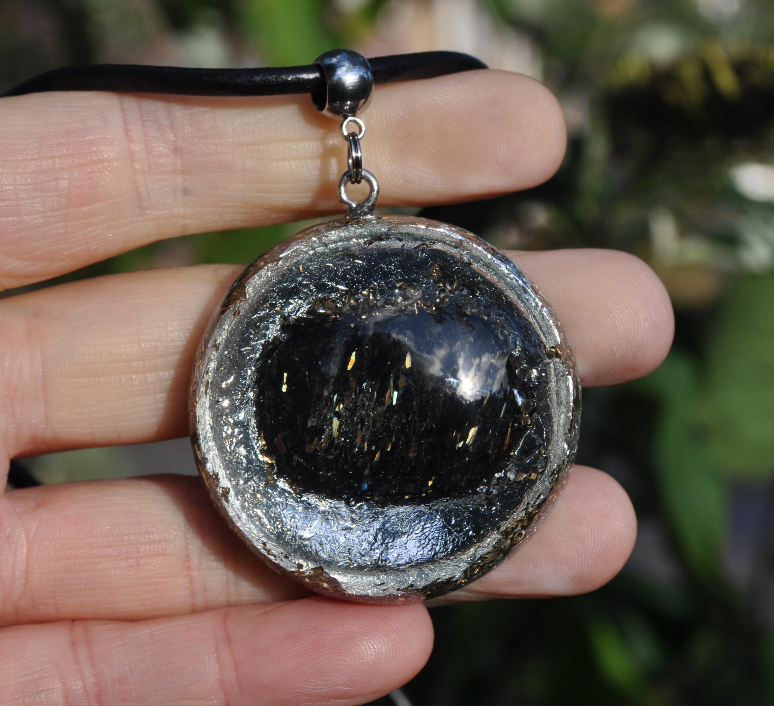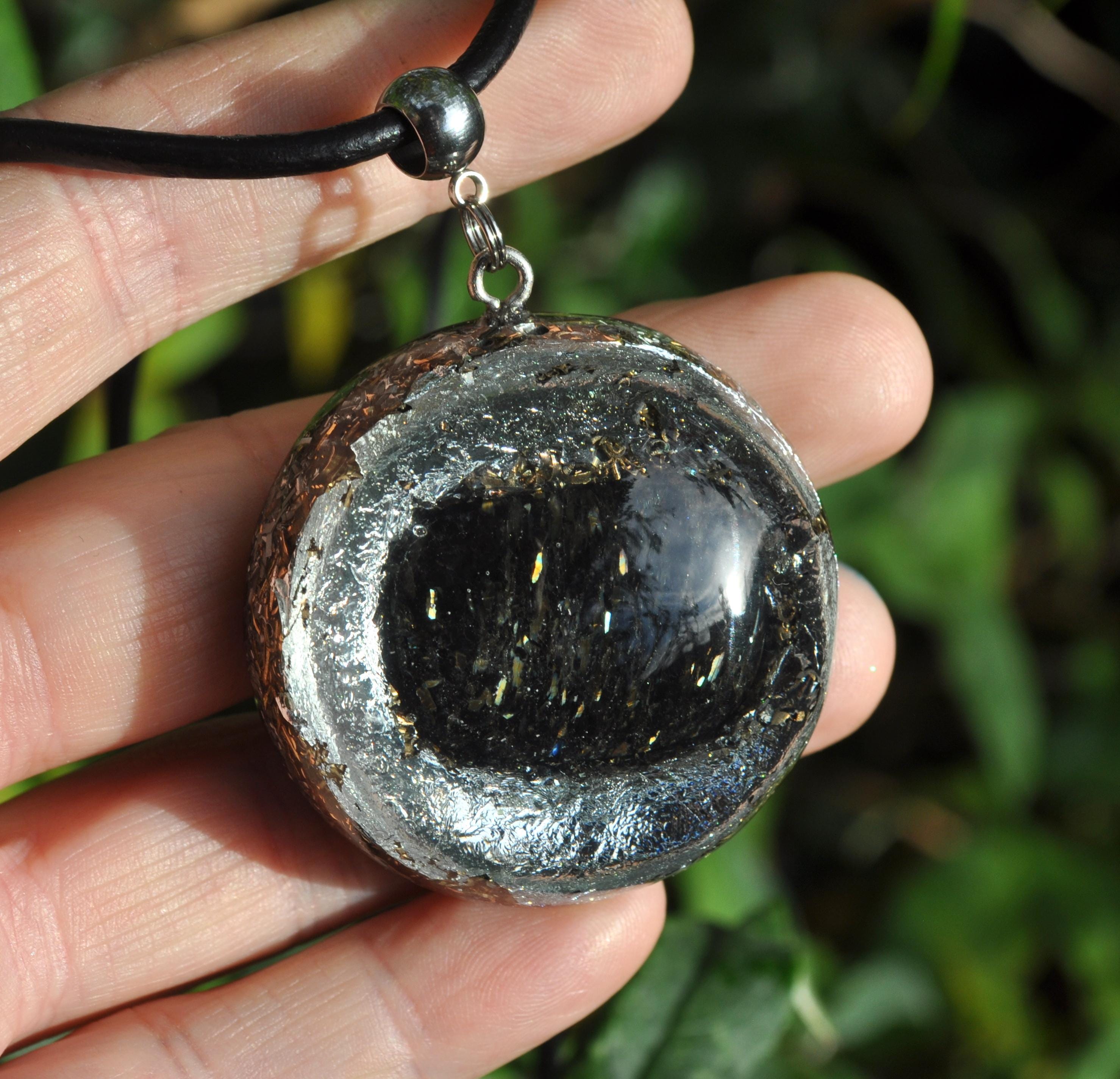 This unique orgone pendant is a striking combination of genuine Nuummite from Greenland, premium crystals, and metals, set in a durable hand-polished resin dome. At its heart lies a large artisan-cut Nuummite cabochon, handcrafted by lapidarist Stefan from raw to polished stone. This rare centerpiece, with its deep black surface and shimmering pure Silver leaf, makes the pendant both visually captivating and symbolically meaningful.