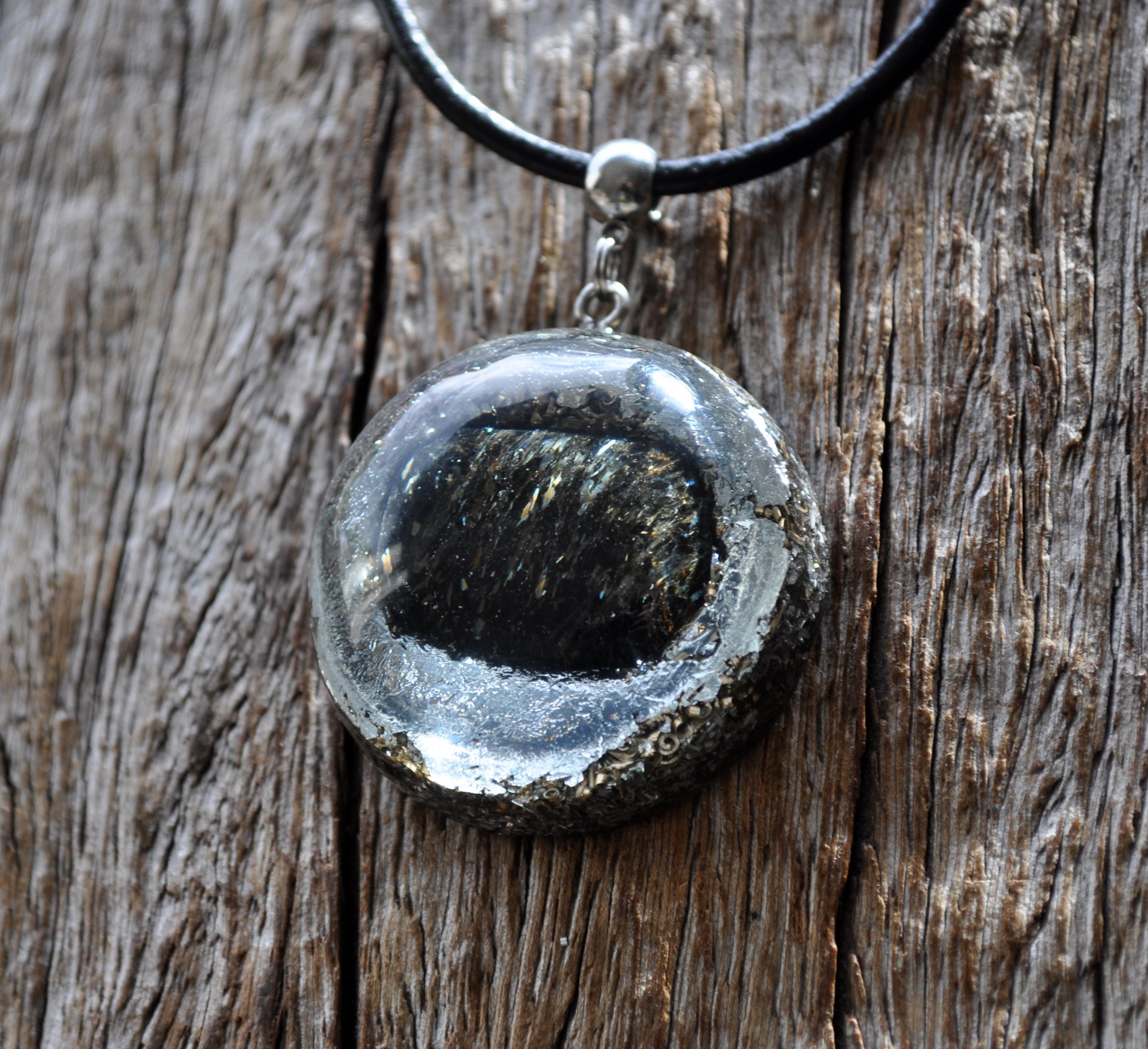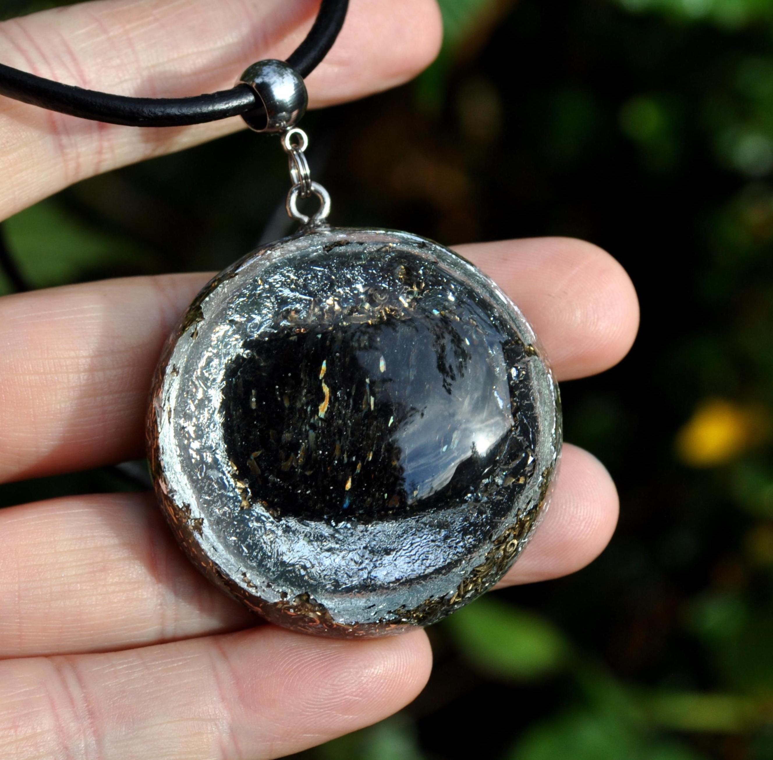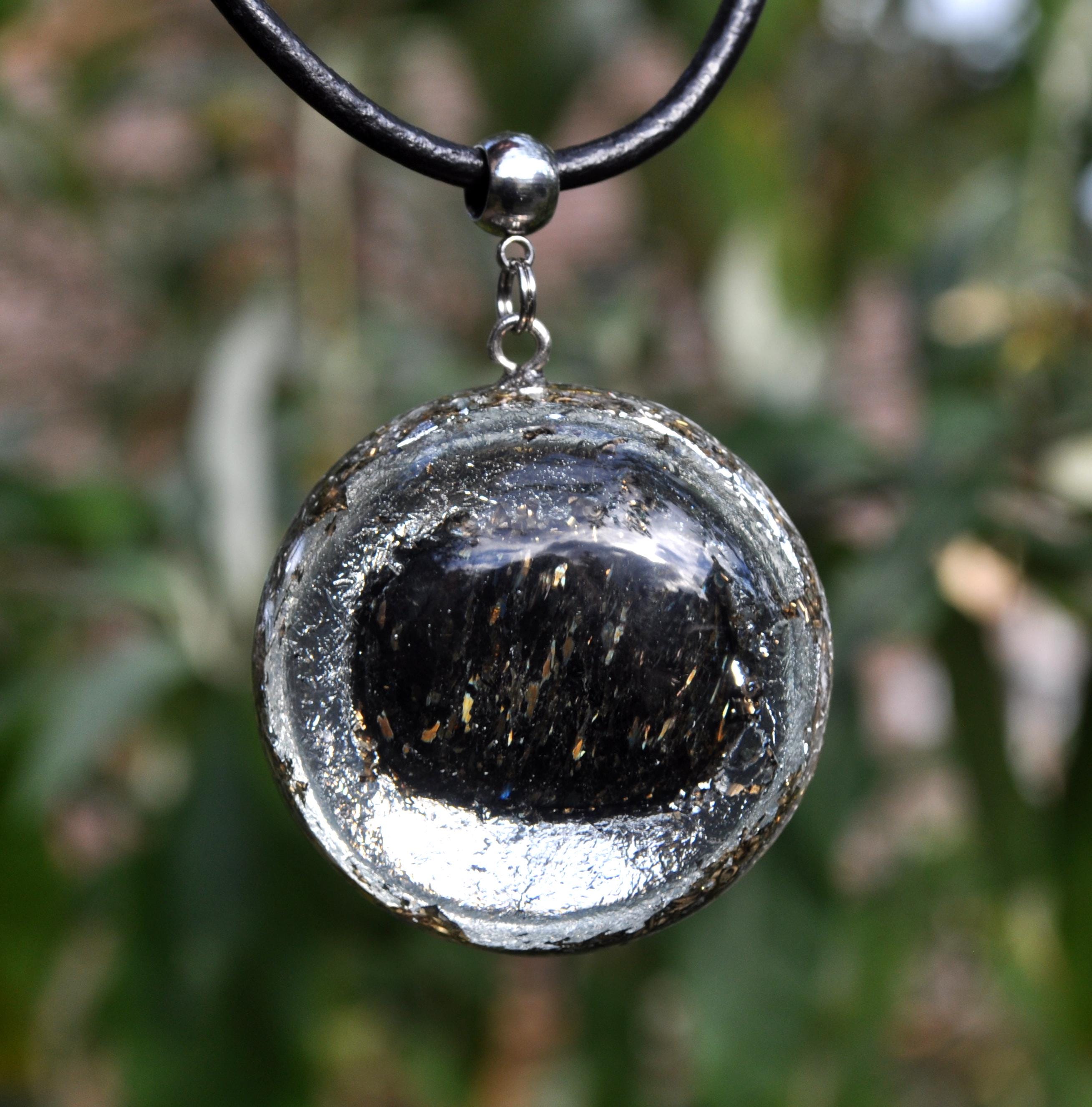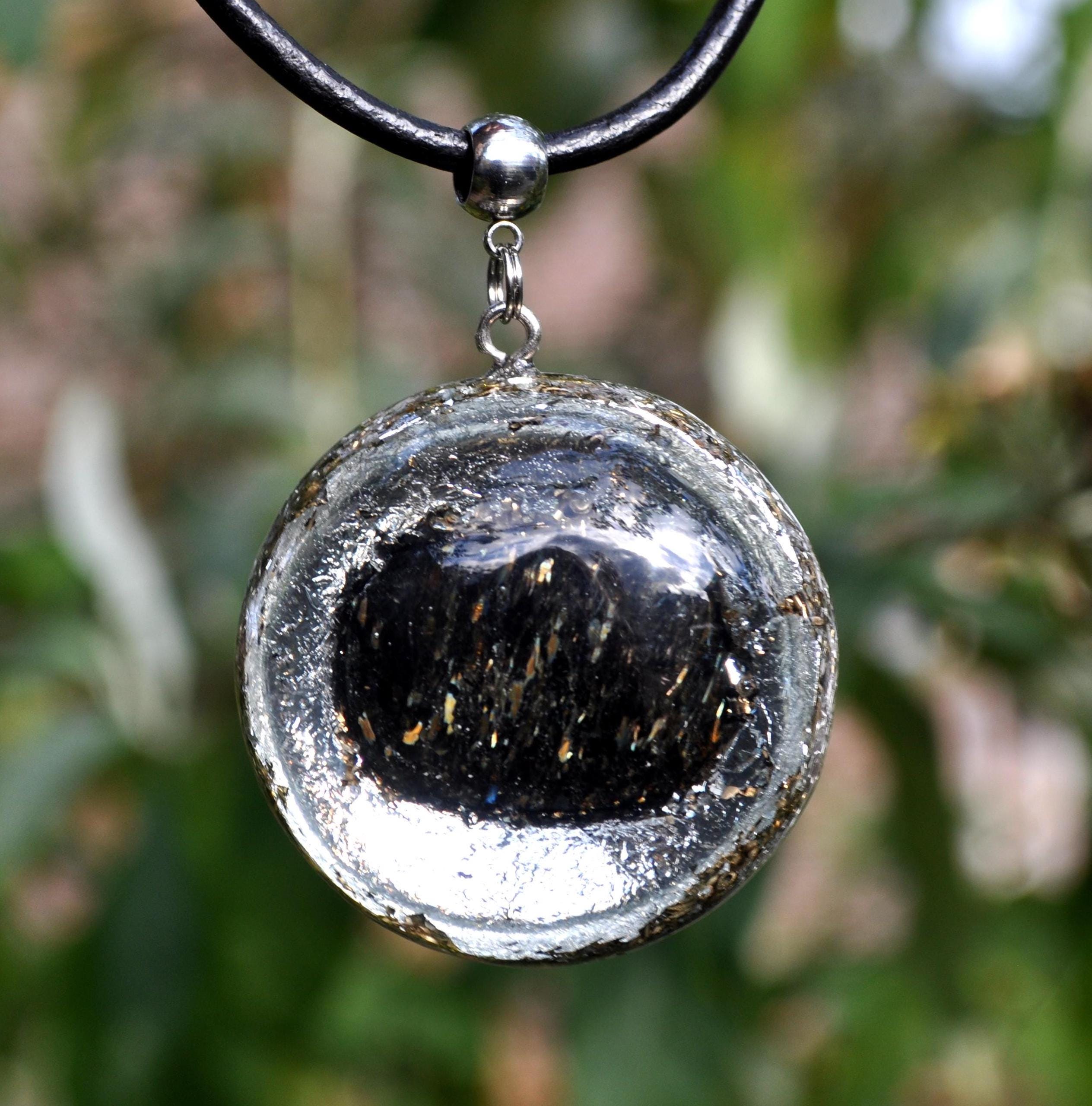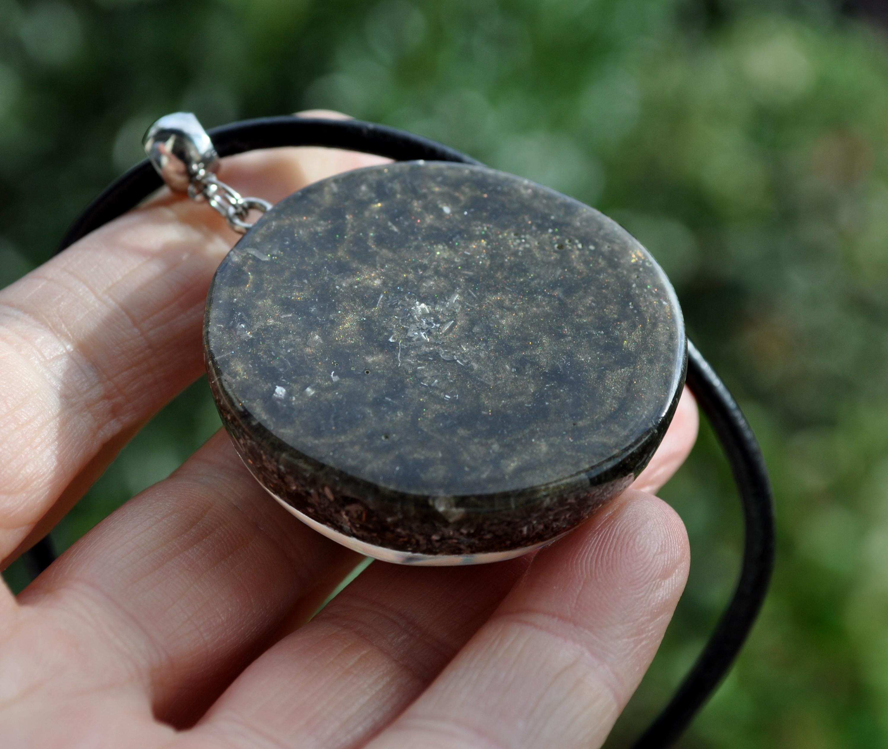 This unique orgone pendant is a striking combination of genuine Nuummite from Greenland, premium crystals, and metals, set in a durable hand-polished resin dome. At its heart lies a large artisan-cut Nuummite cabochon, handcrafted by lapidarist Stefan from raw to polished stone. This rare centerpiece, with its deep black surface and shimmering pure Silver leaf, makes the pendant both visually captivating and symbolically meaningful.