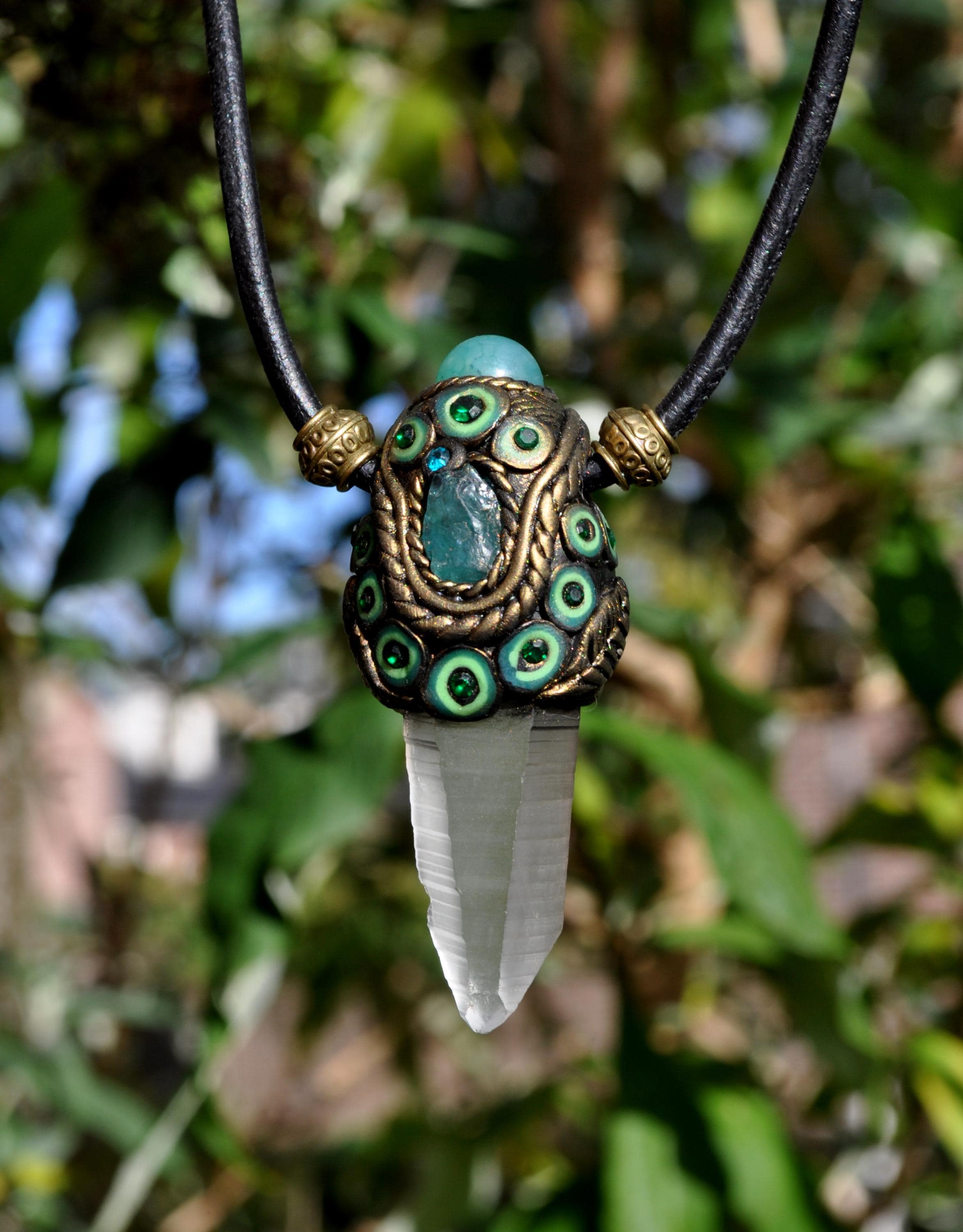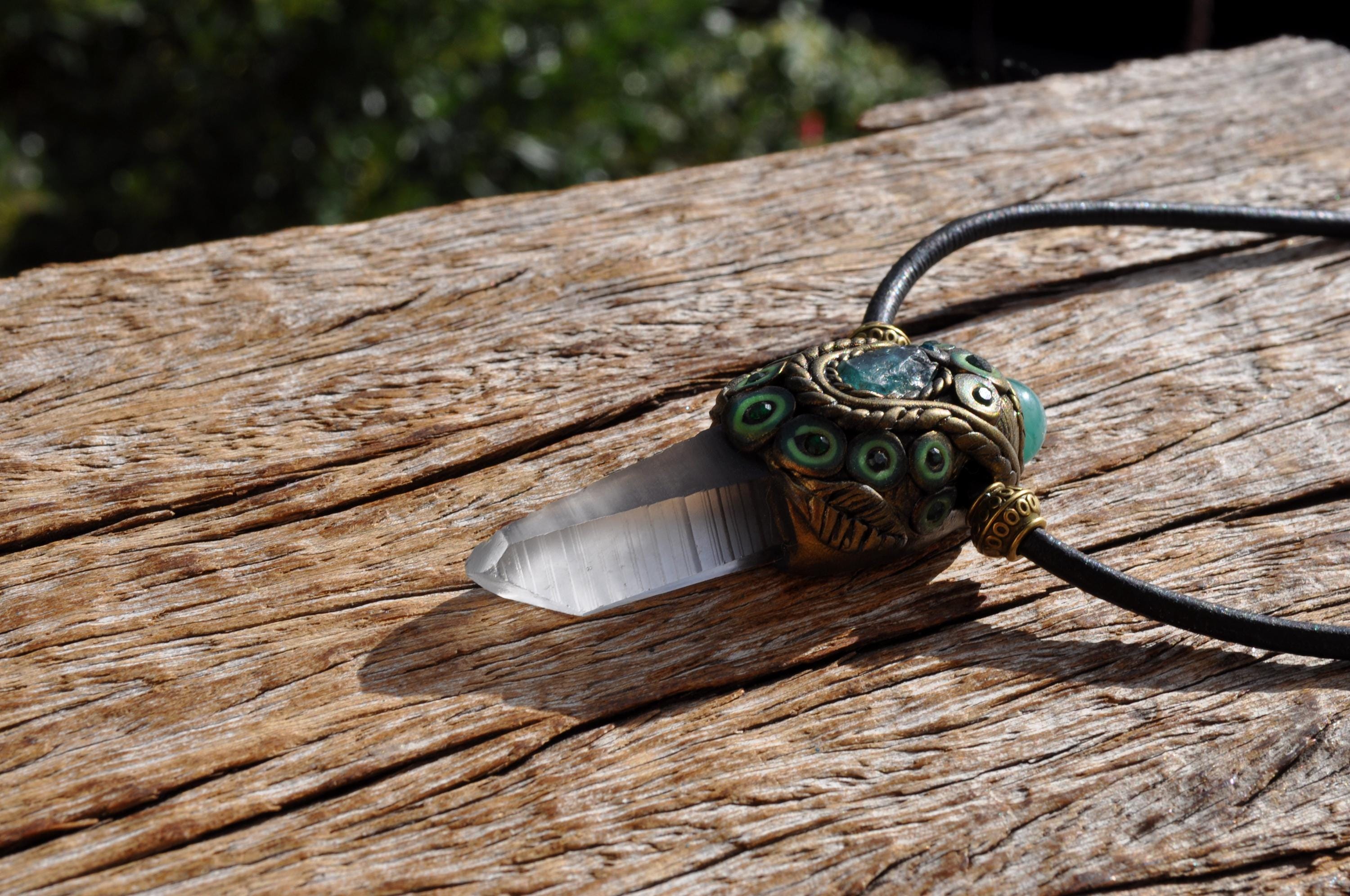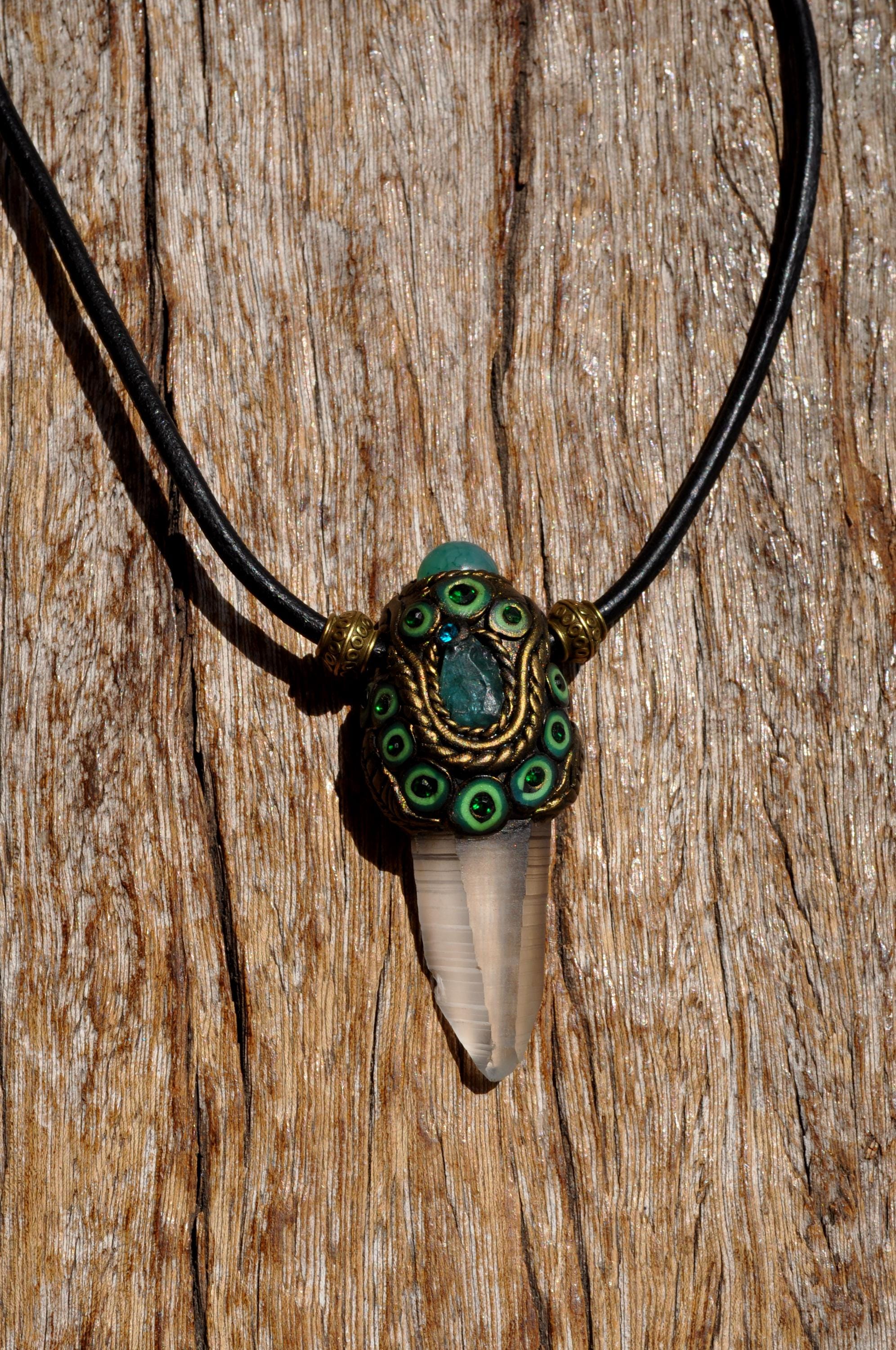 Materials: Lemurian Quartz, Raw Blue Apatite (UV-active green), Polished Agate, Suede Leather Cord