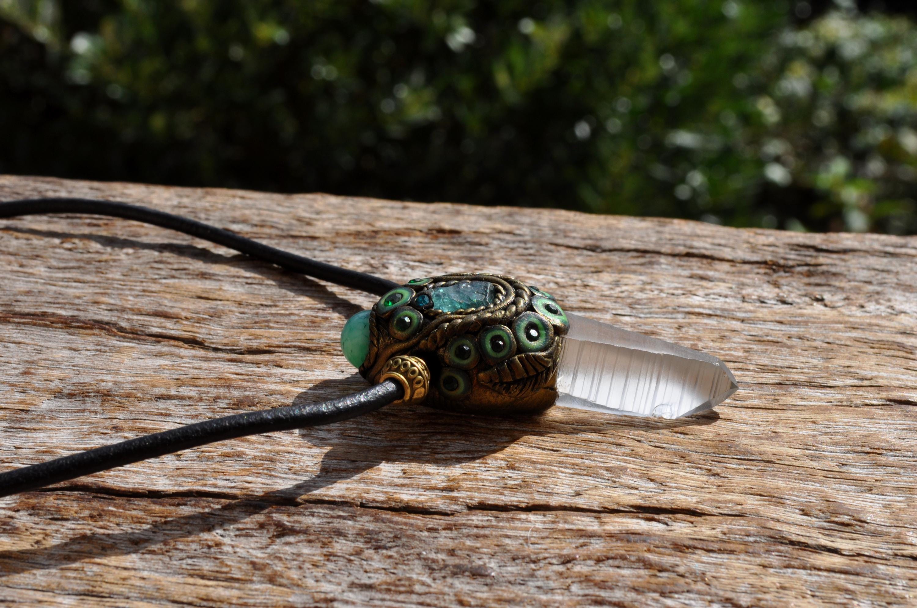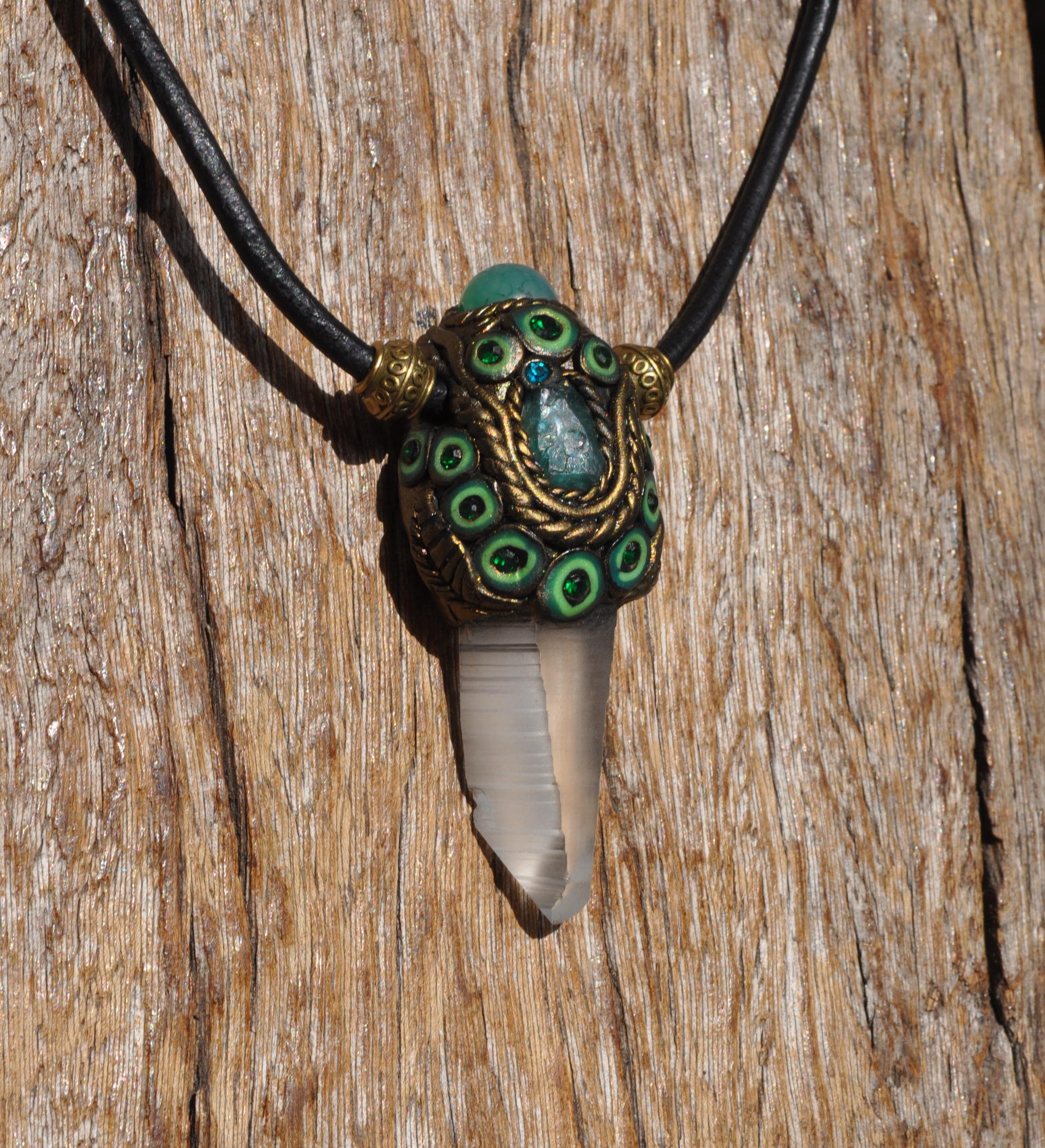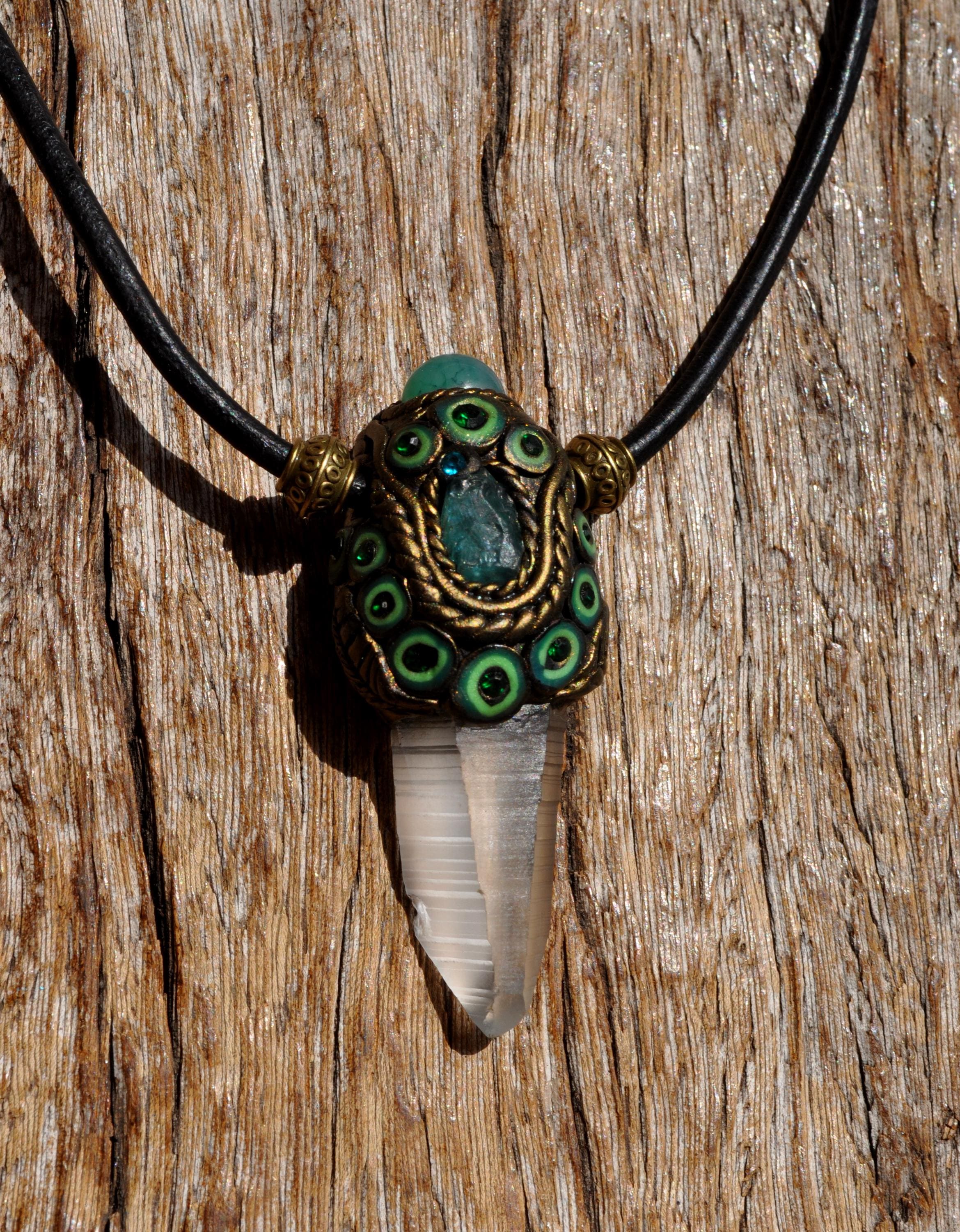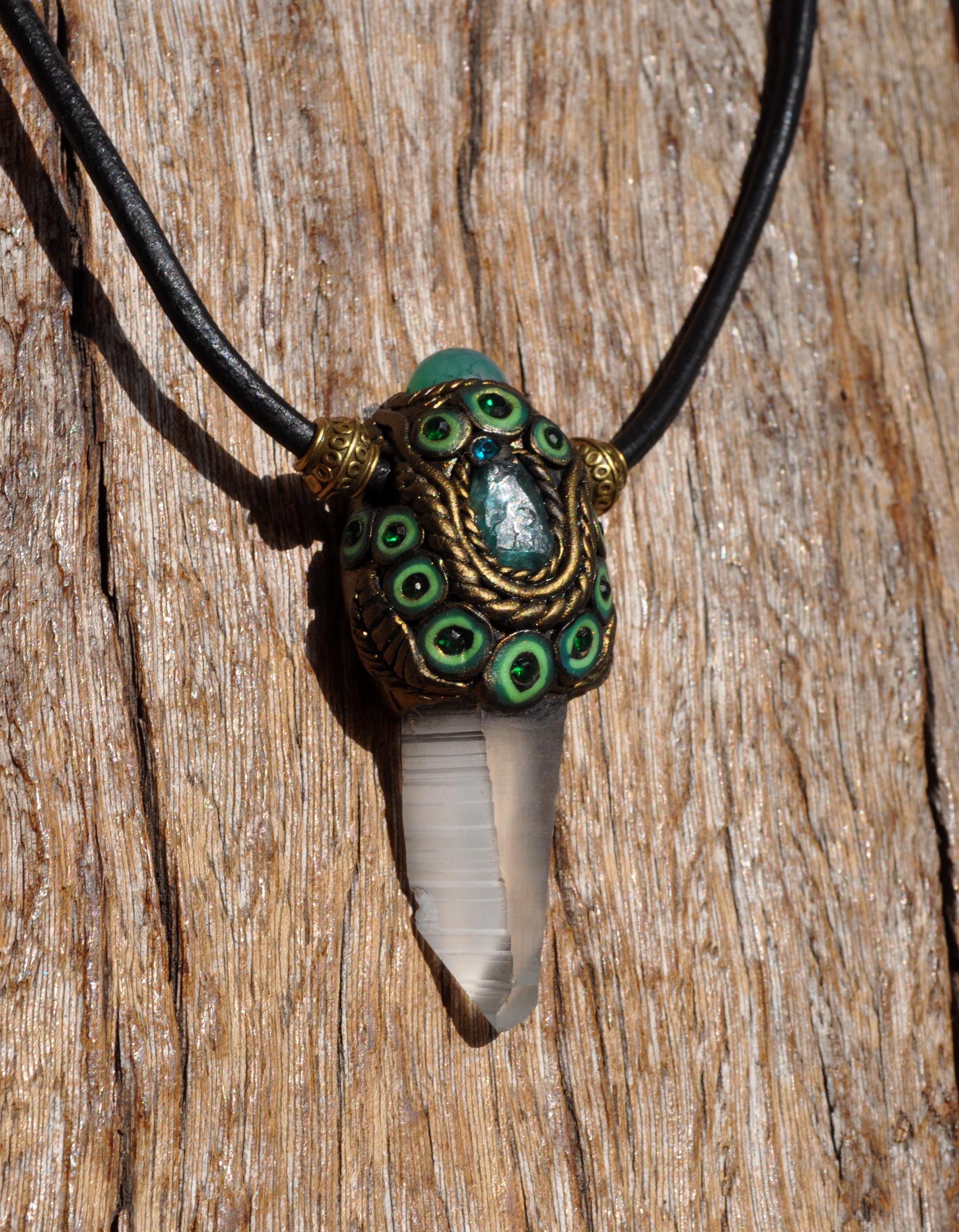 Materials: Lemurian Quartz, Raw Blue Apatite (UV-active green), Polished Agate, Suede Leather Cord