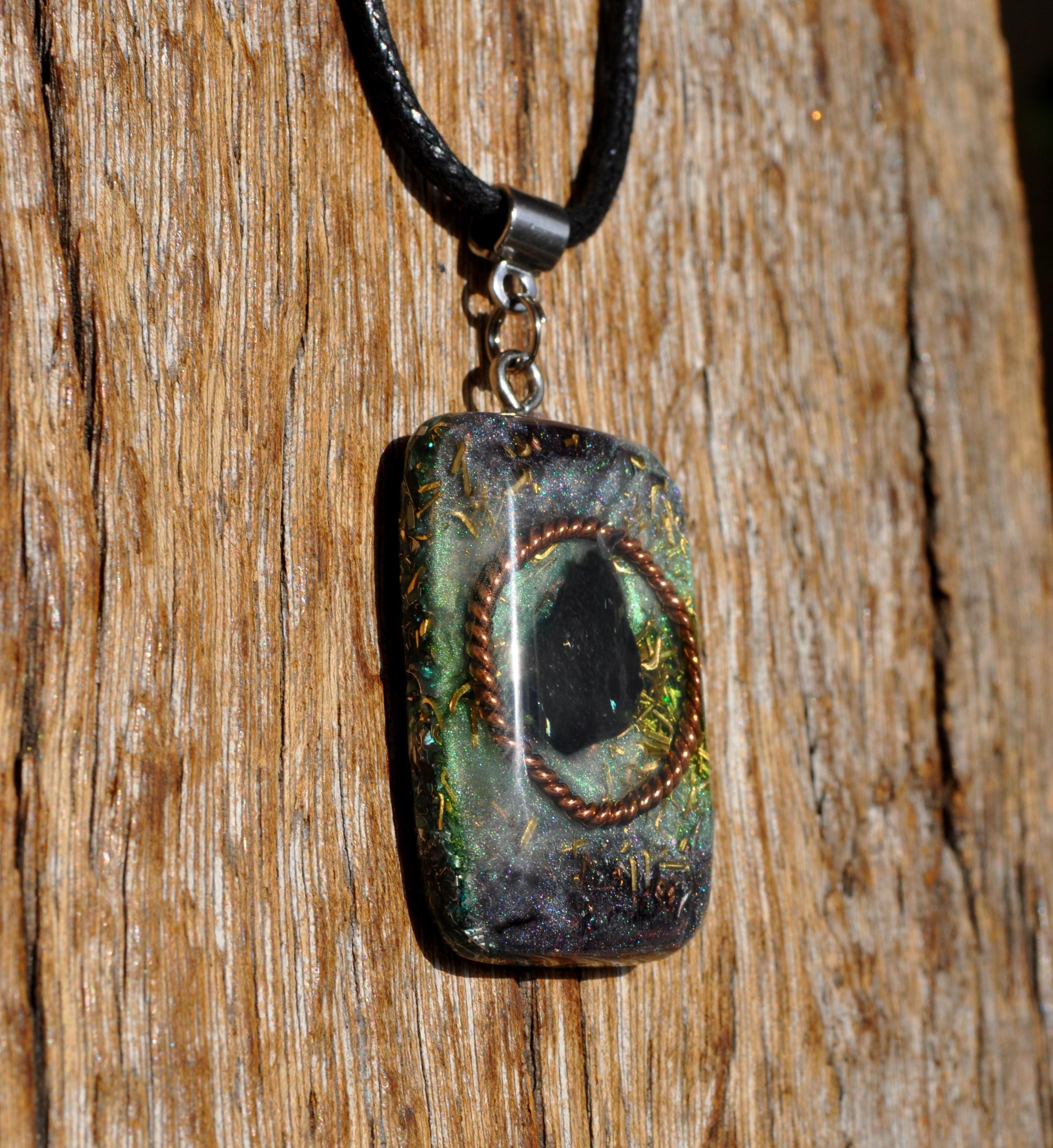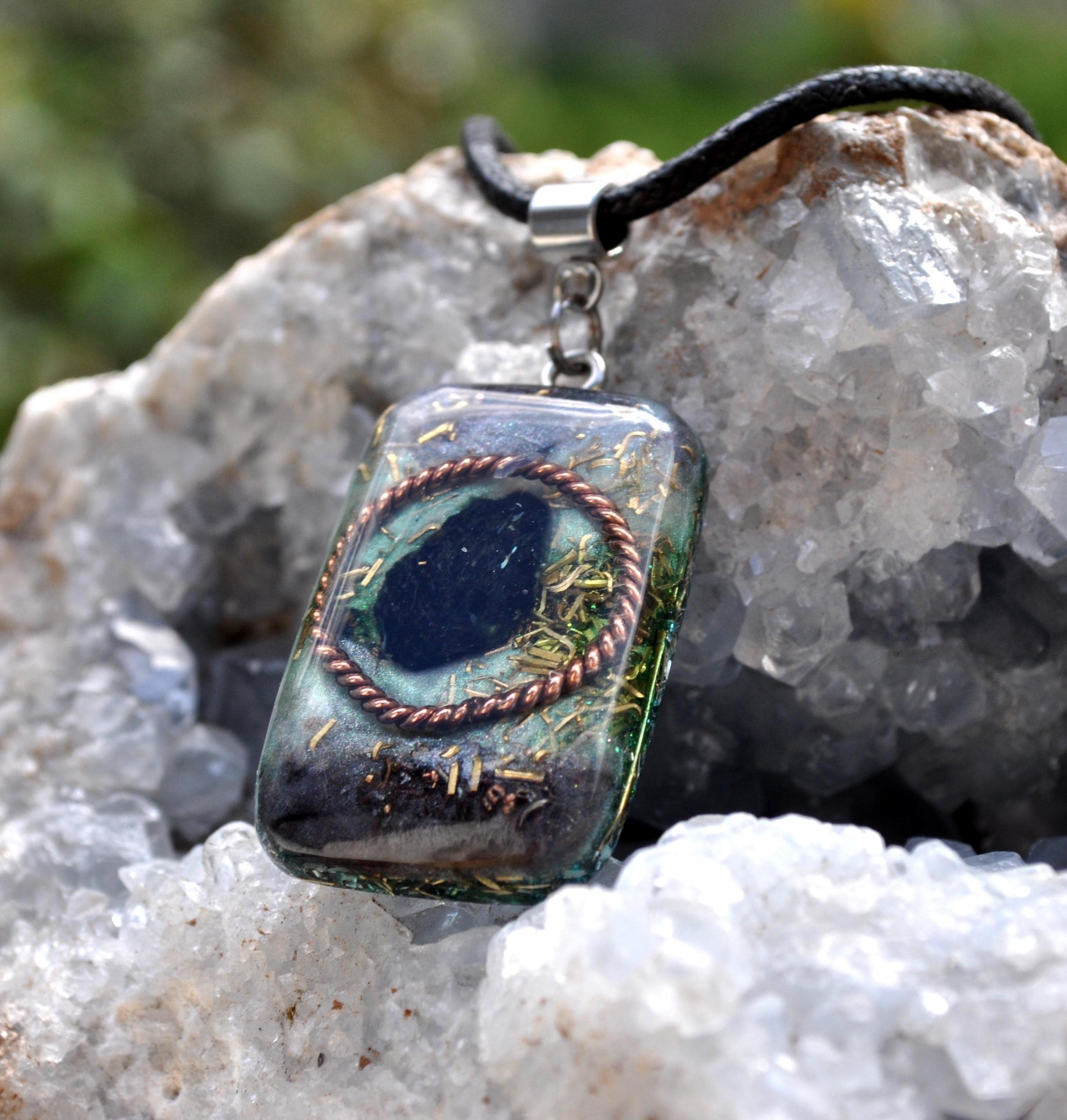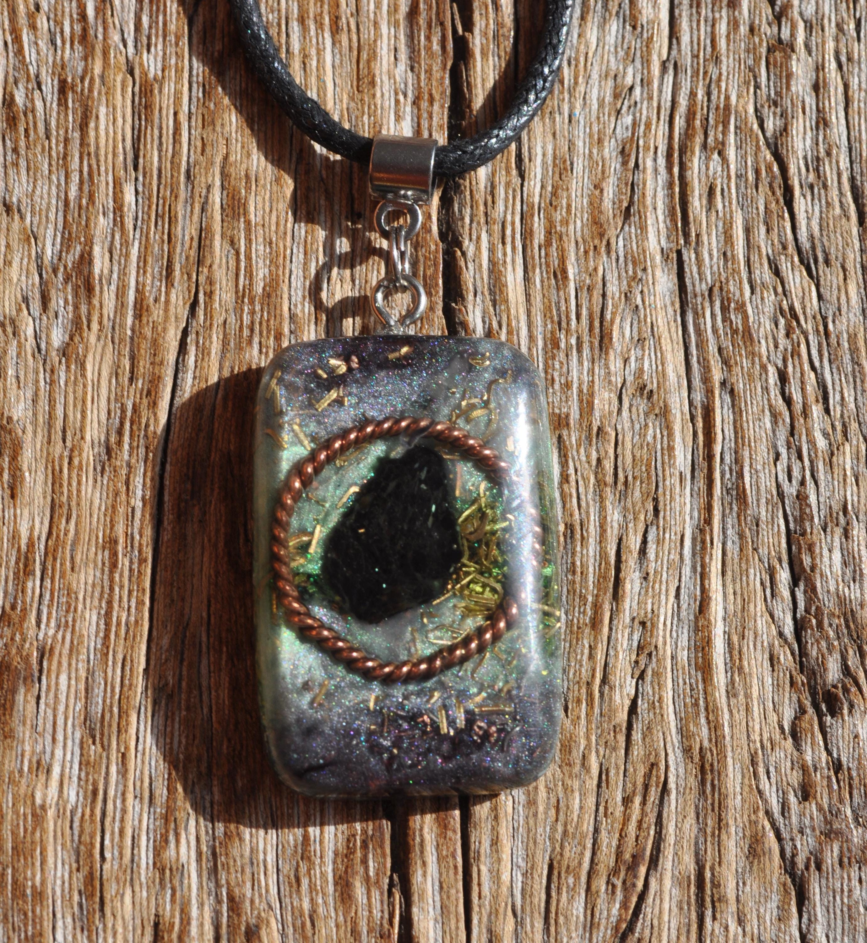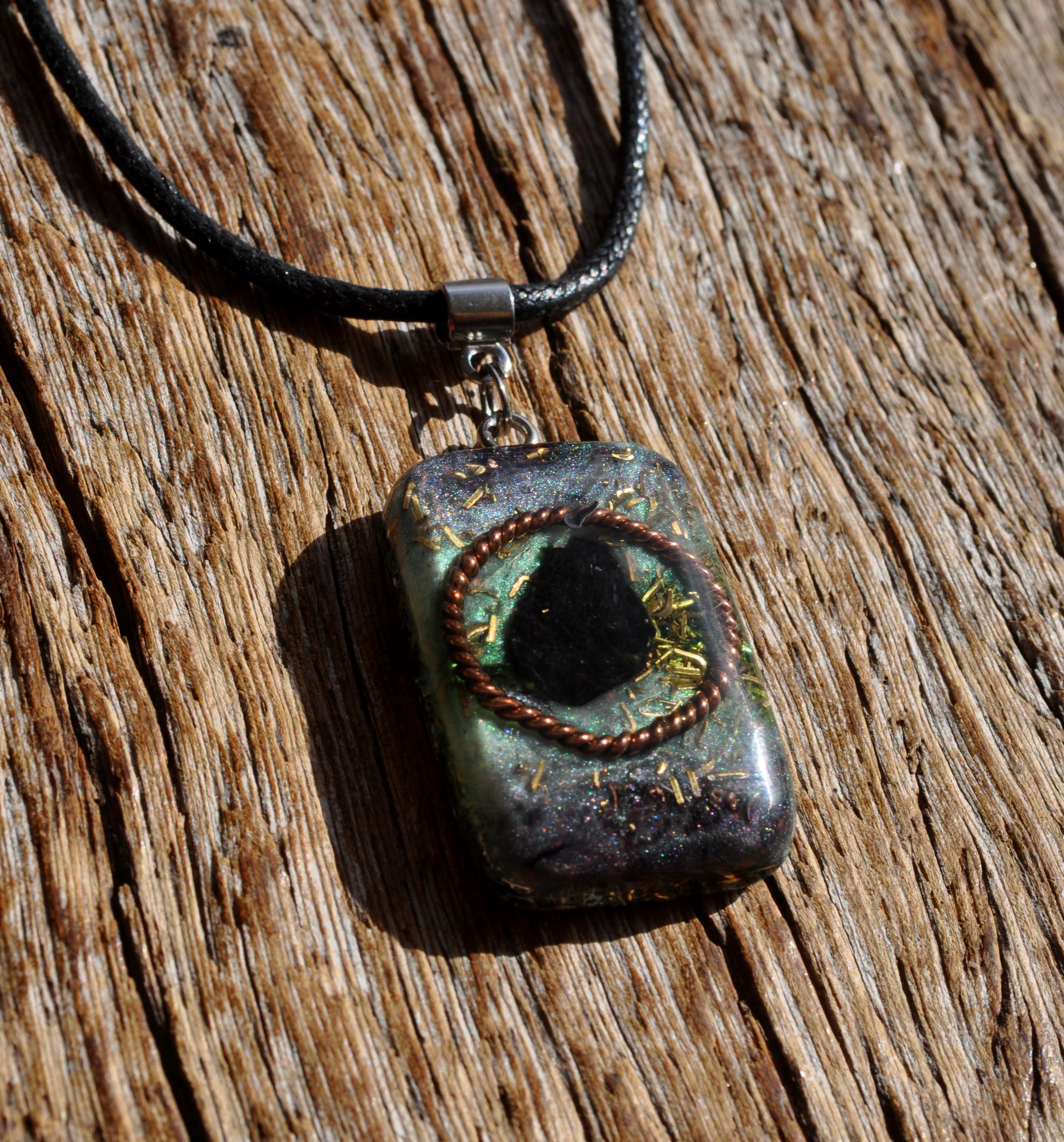 This Orgonite® pendant centers around a genuine piece of Nuummite, one of the oldest and rarest minerals on Earth — over 3 billion years old and found only in Greenland. Often called the “Sorcerer’s Stone” in metaphysical traditions, Nuummite has long been associated with ancient Earth energy, deep grounding, and personal transformation. Its appearance is typically dark, rich, and opaque, reflecting its primal energy and deep connection to the elements.