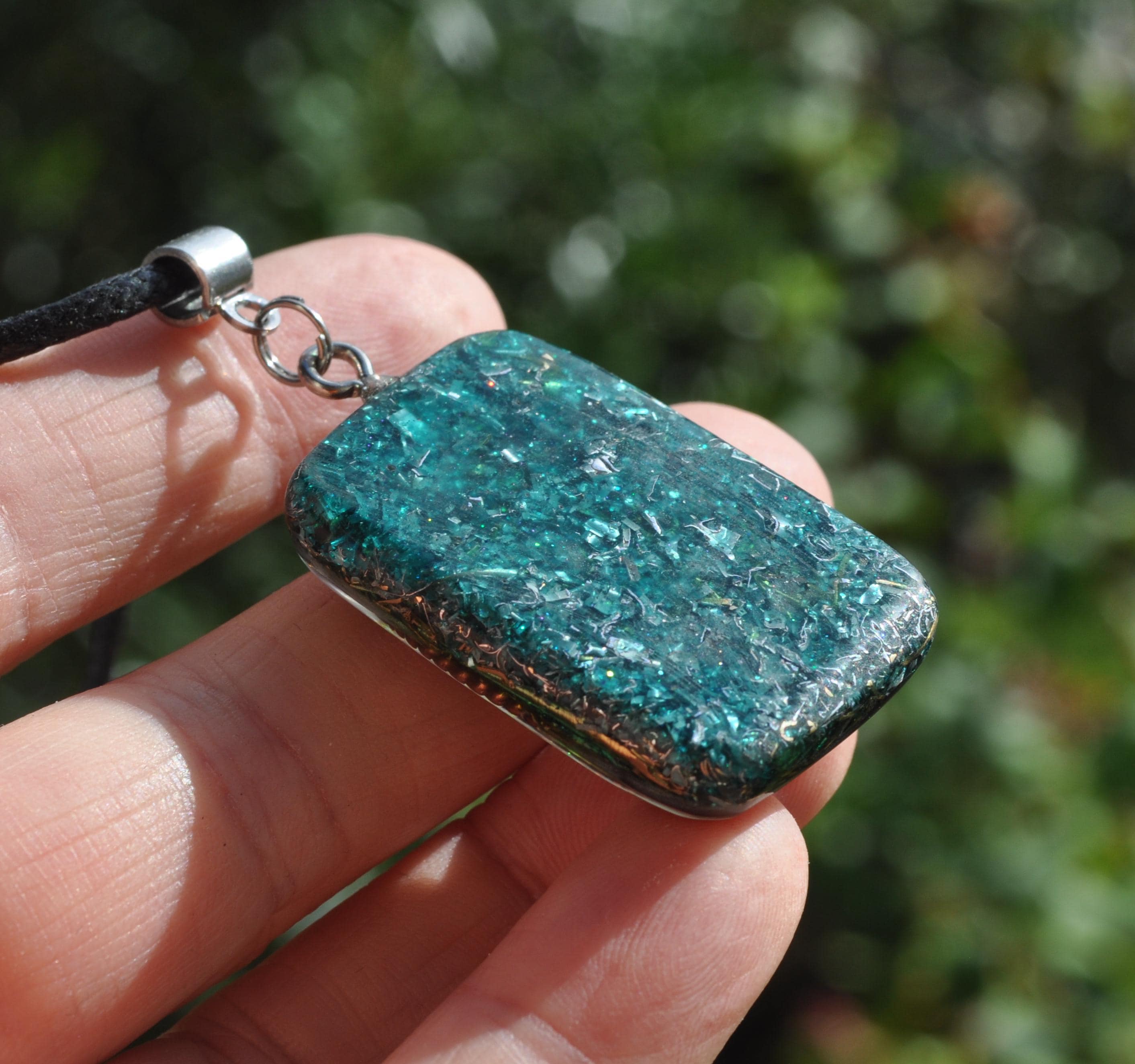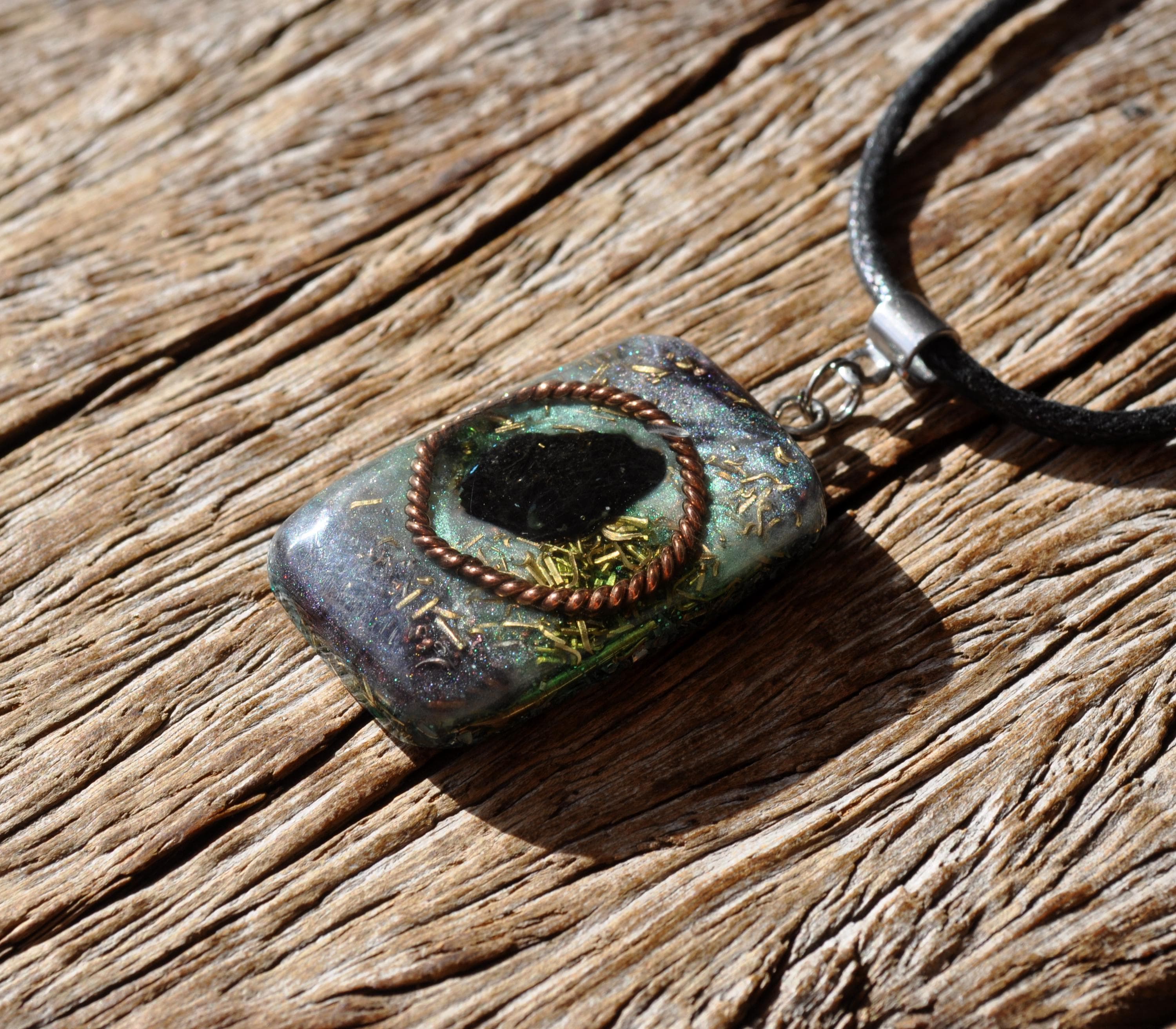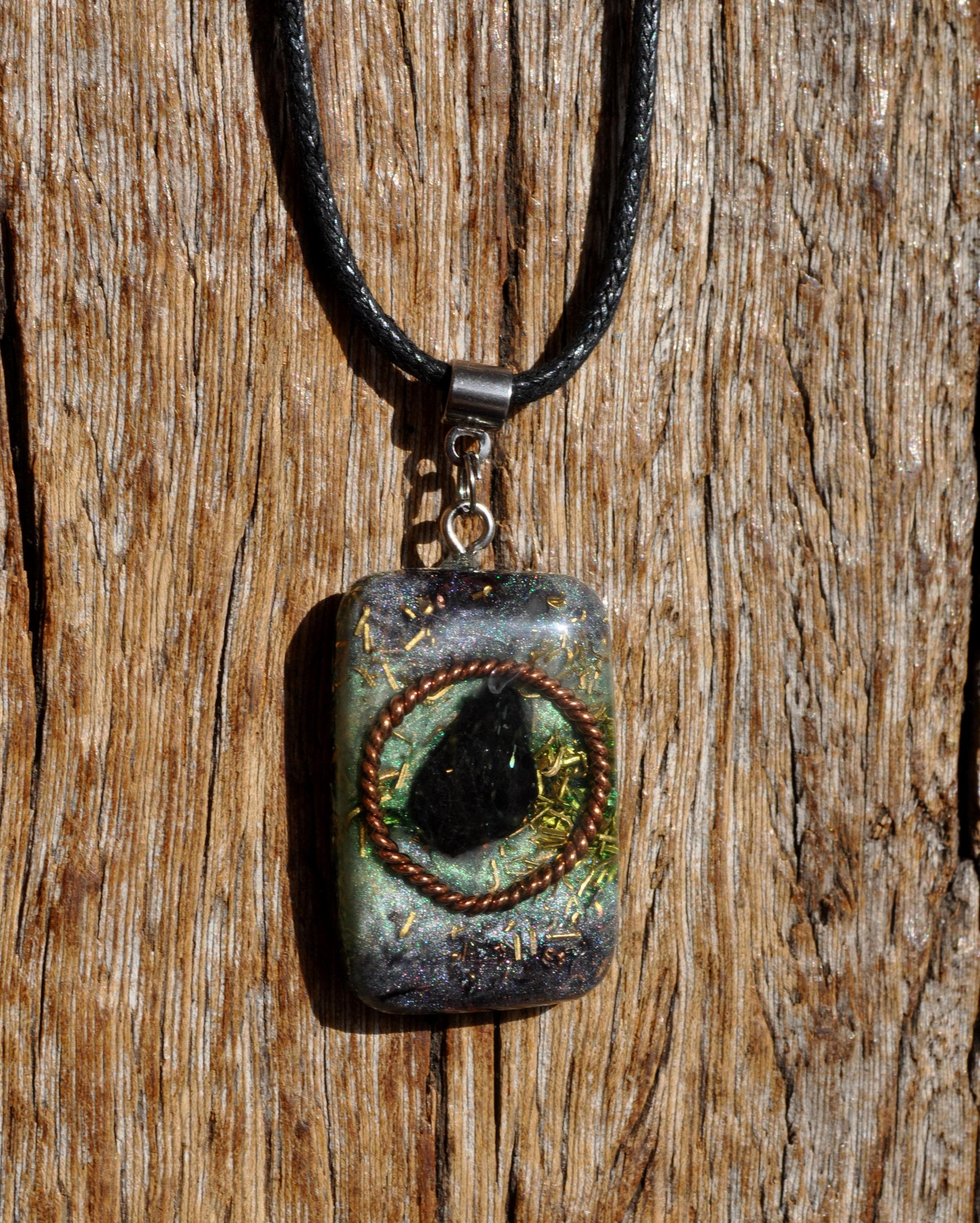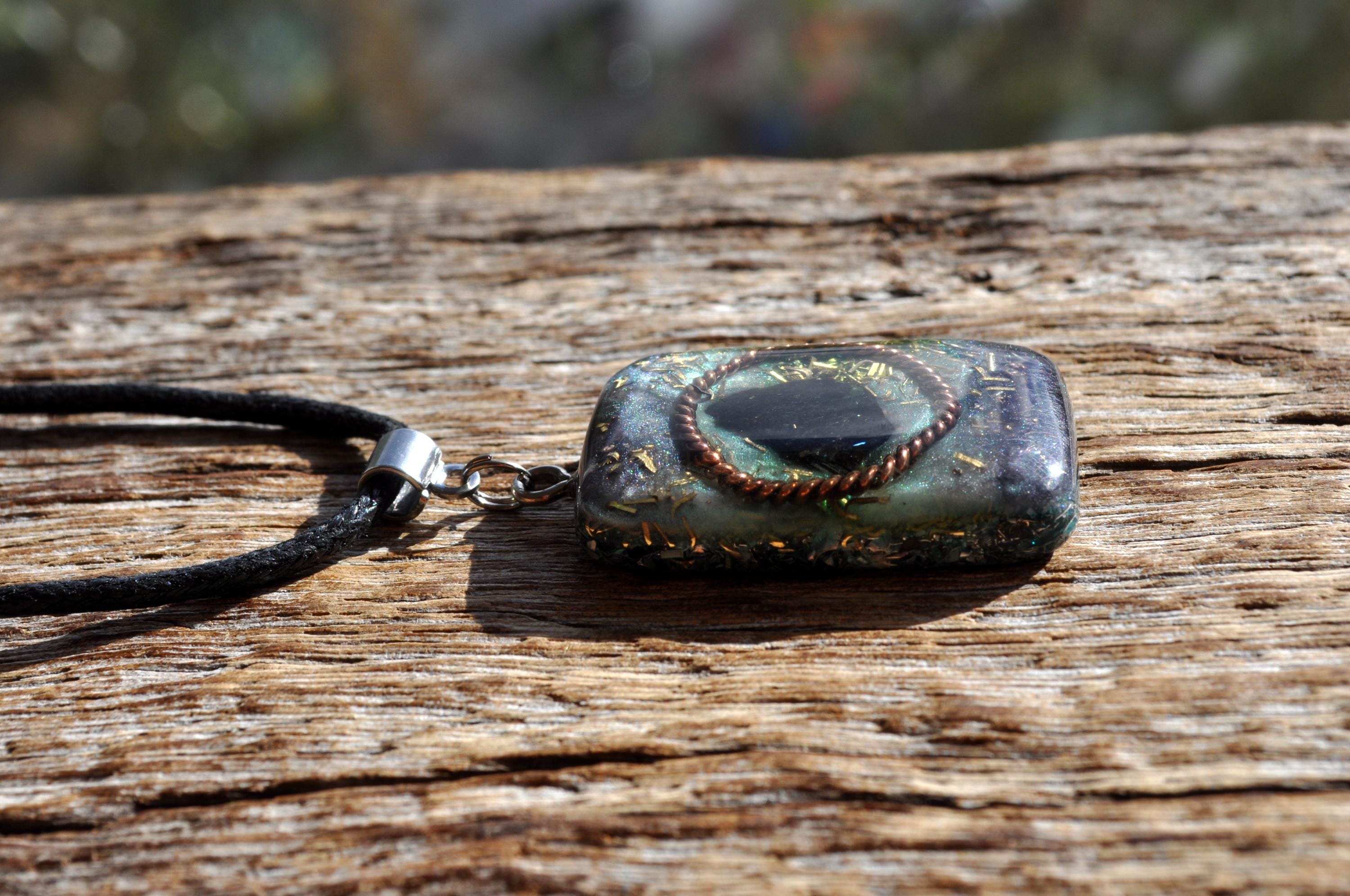This Orgonite® pendant centers around a genuine piece of Nuummite, one of the oldest and rarest minerals on Earth — over 3 billion years old and found only in Greenland. Often called the “Sorcerer’s Stone” in metaphysical traditions, Nuummite has long been associated with ancient Earth energy, deep grounding, and personal transformation. Its appearance is typically dark, rich, and opaque, reflecting its primal energy and deep connection to the elements.