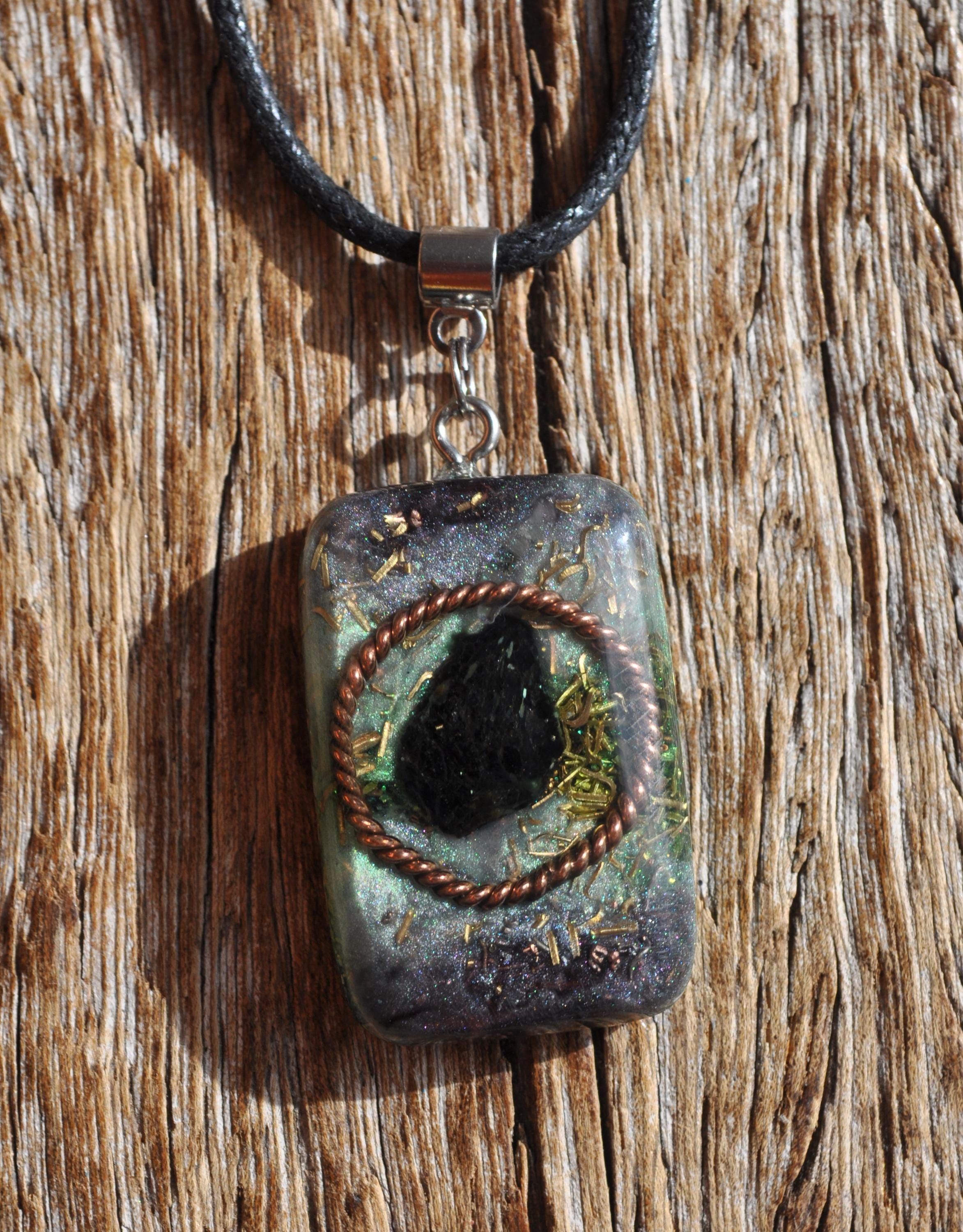 The stone is encased within a handcrafted copper tensor ring, amplifying and harmonizing its subtle energy. Combined with an Orgonite® matrix of resin and metal shavings (copper, brass, bronze, and aluminum) plus a synergistic blend of crystals — Elite Shungite, Rhodizite, Selenite, and Clear Quartz — the result is a powerful yet balanced pendant that blends natural materials and intentional design.