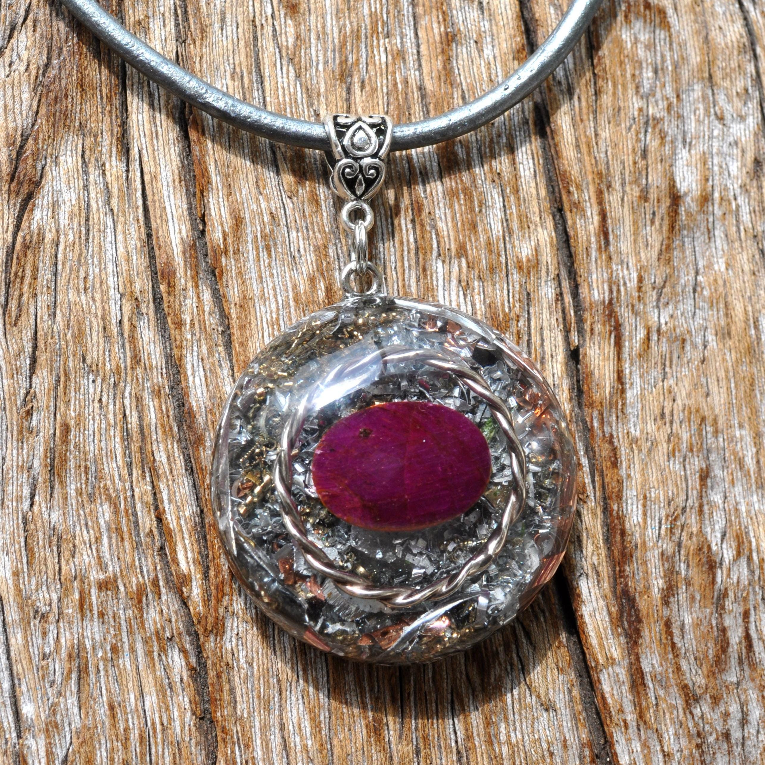 🌿 Orgonite Pendant with Red Ruby & Sterling Silver Tensor Ring