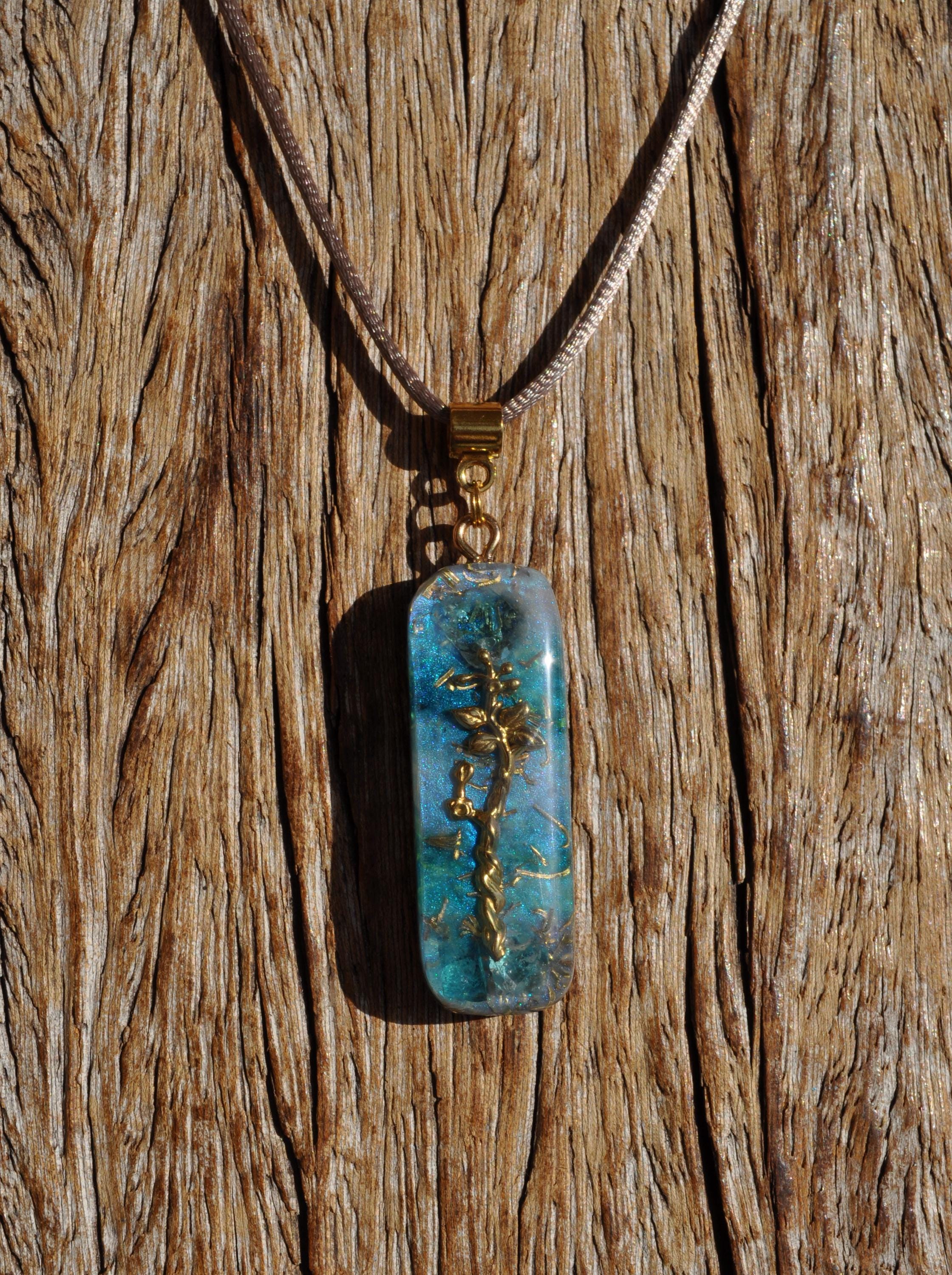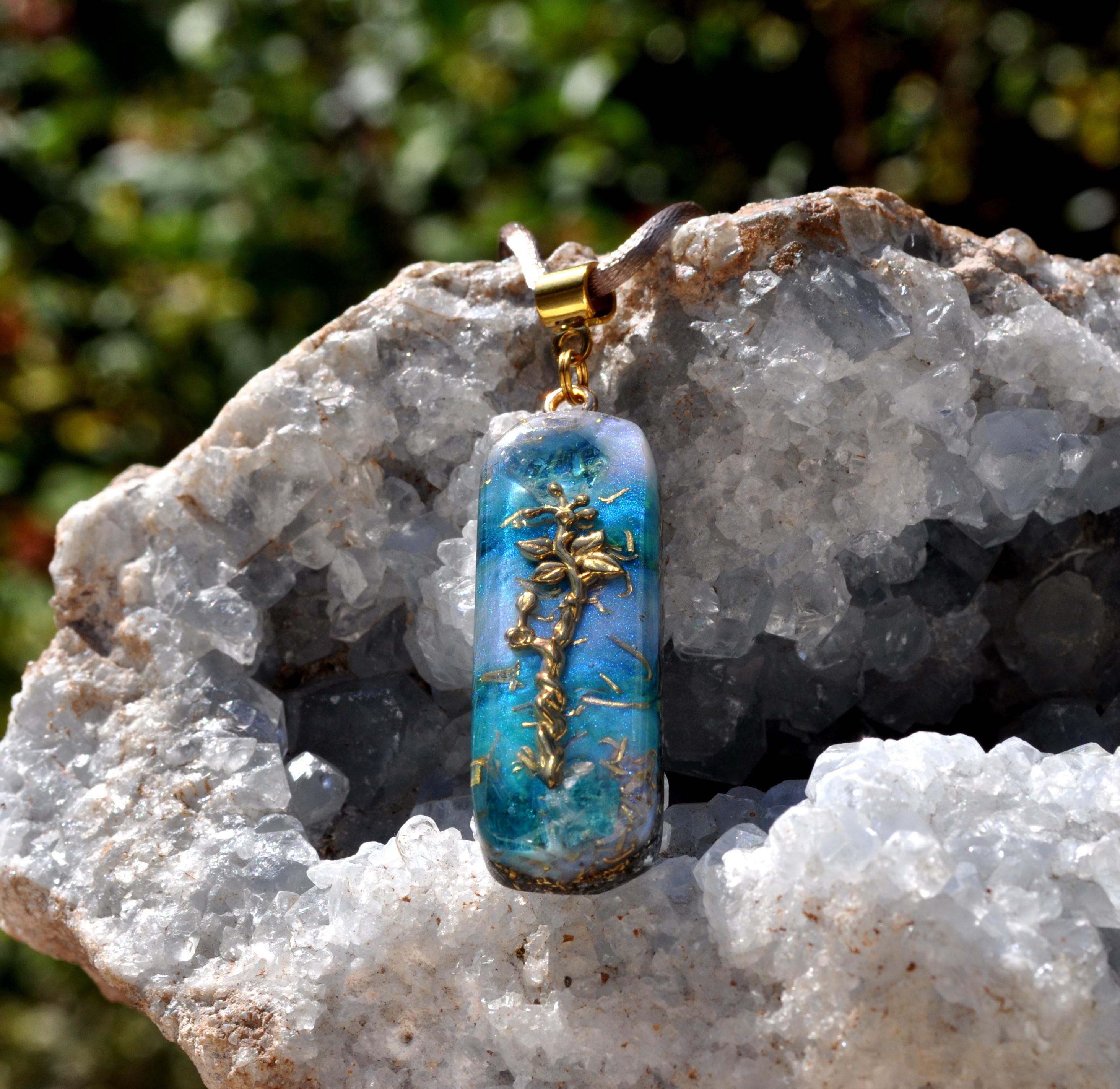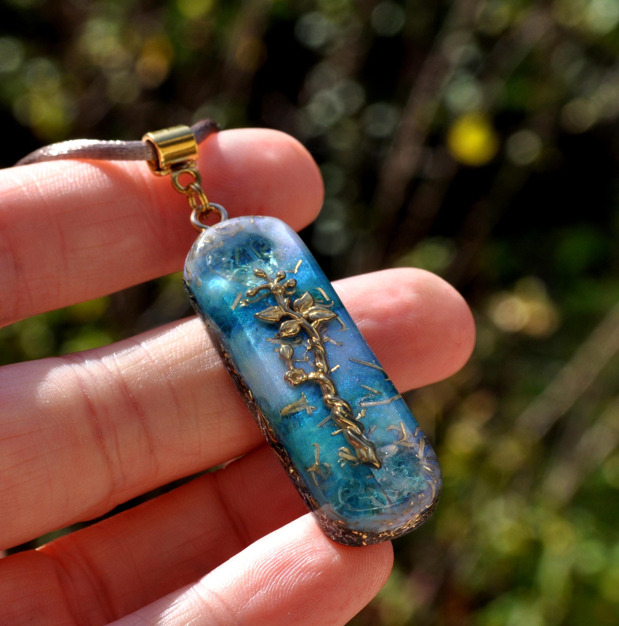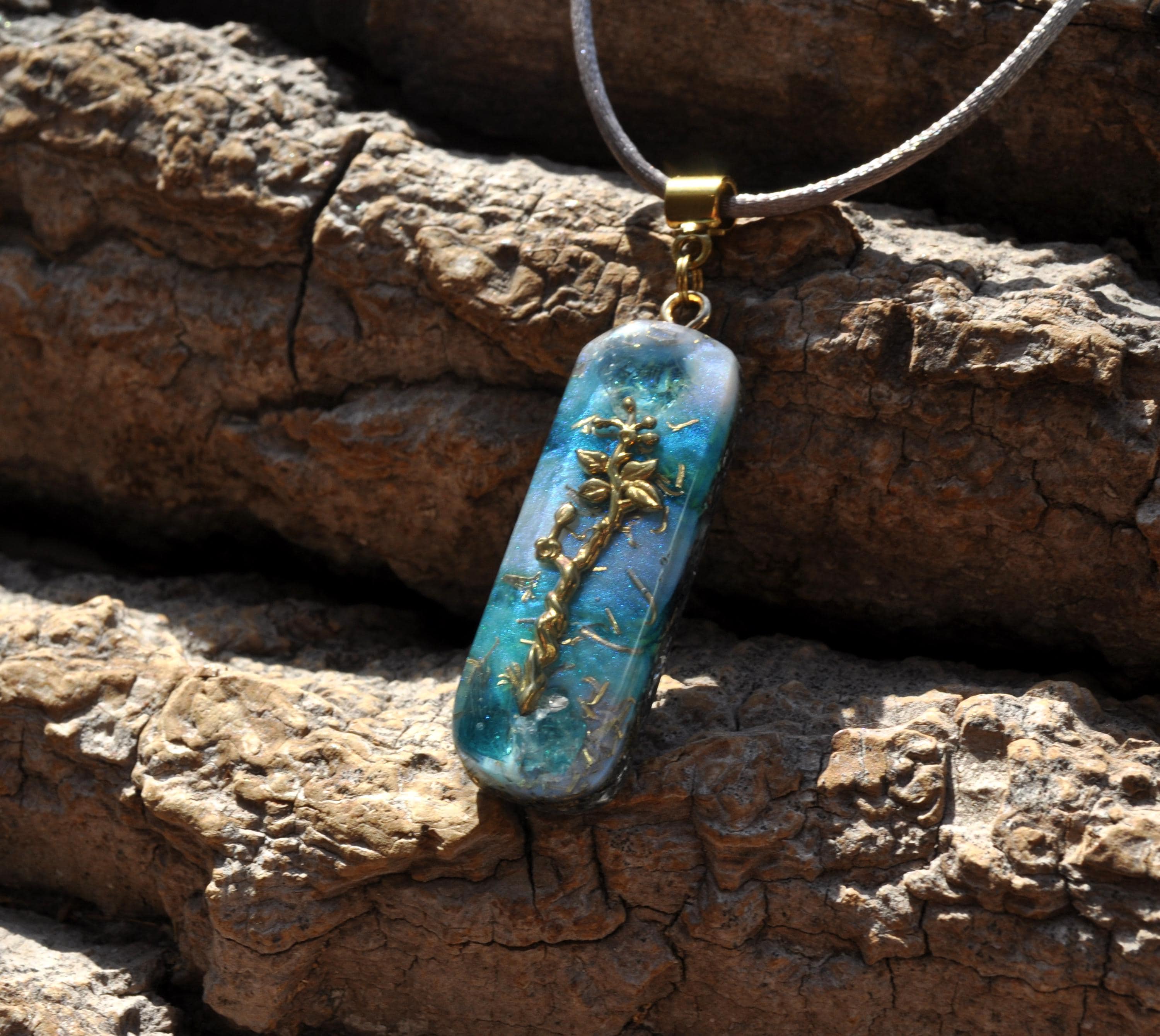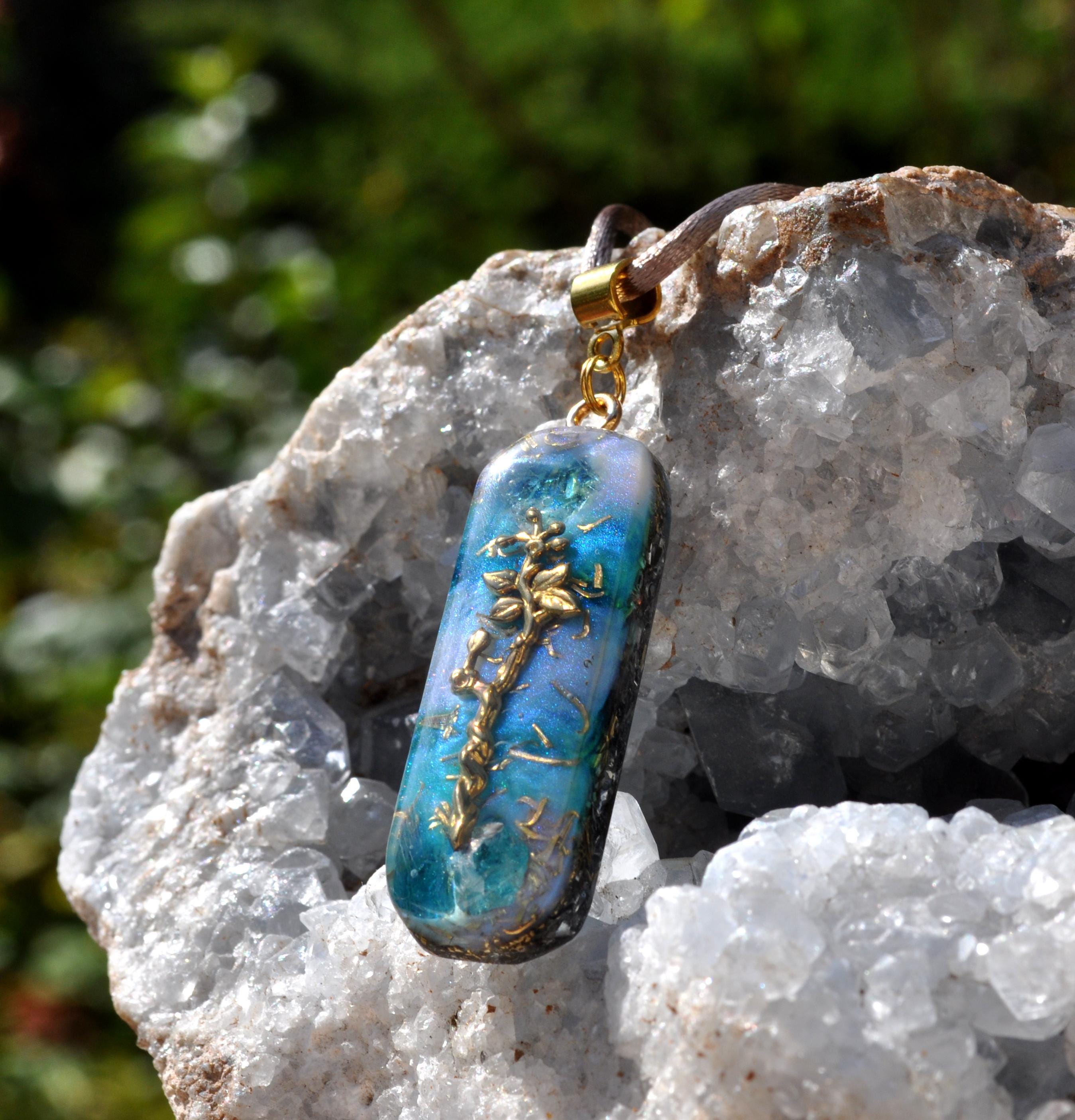 šæ Blue Apatite OrgoniteĀ® Pendant with Gold Flowery Plant Stem ā Handmade Energy Healing Jewelry, Spiritual Gift, Protection & Balance