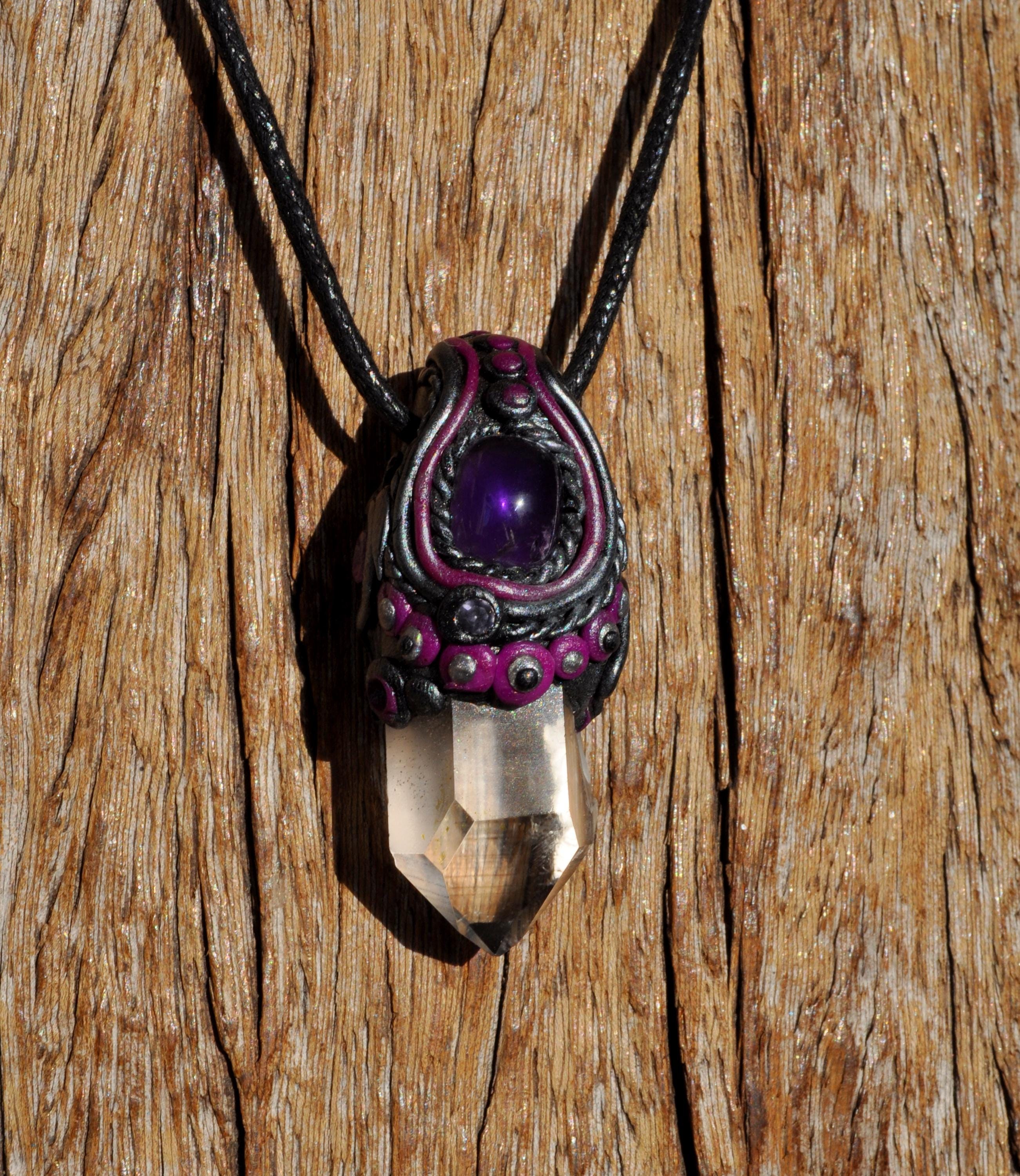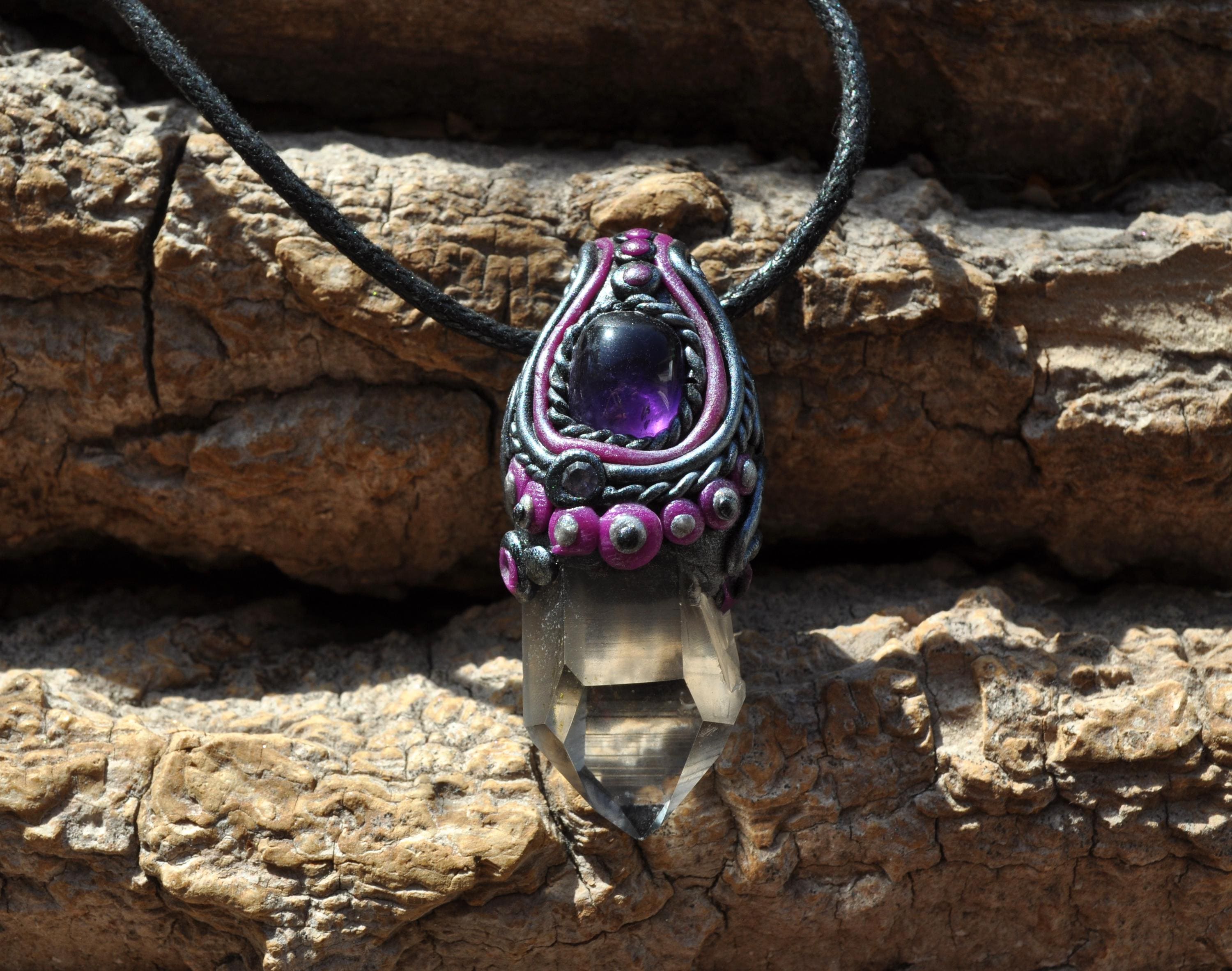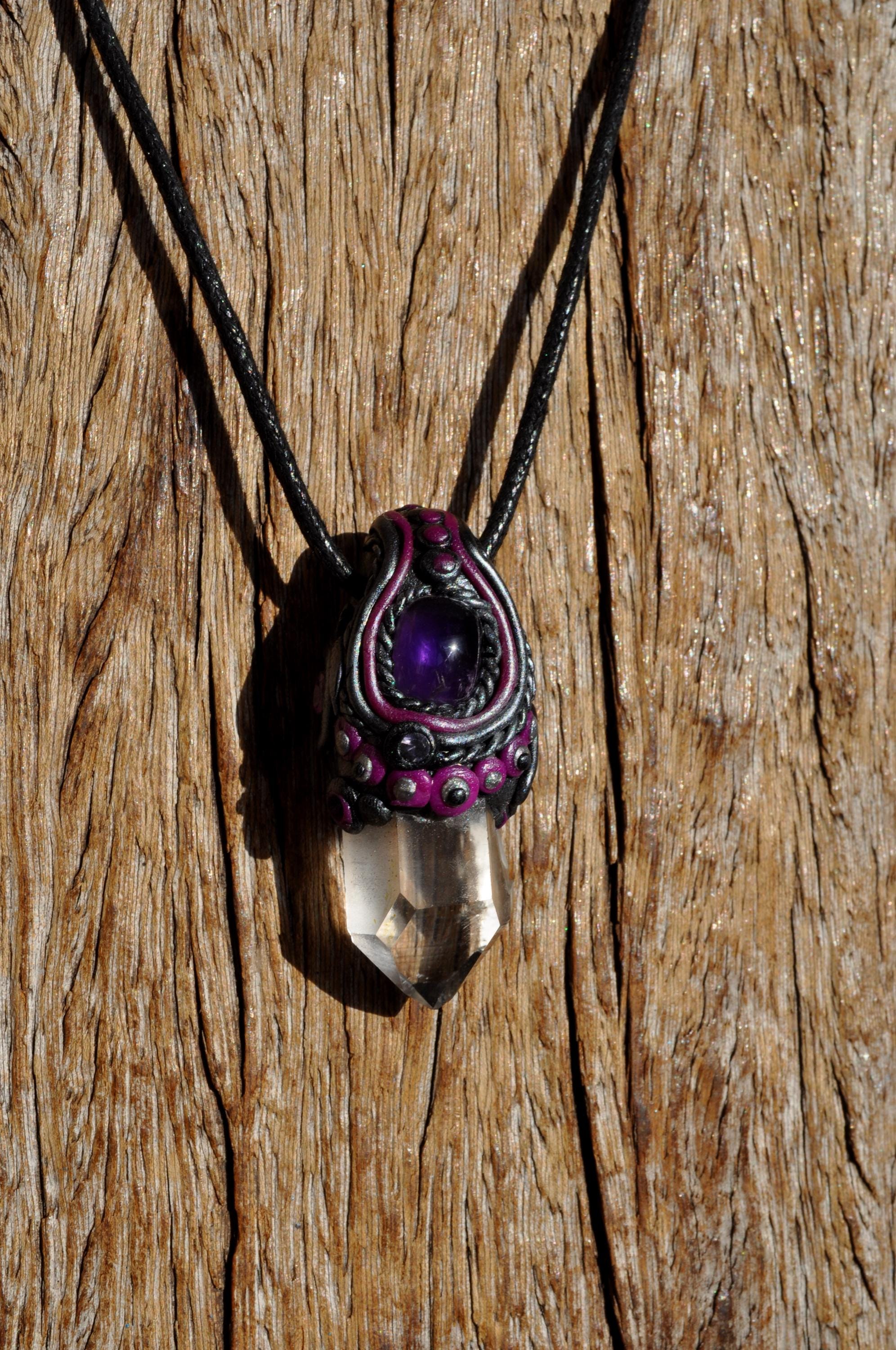 This handmade pendant features a natural terminated Clear Quartz point from Minas Gerais, Brazil, topped with a polished Amethyst stone. Each piece is carefully set in a durable, hand-sculpted polymer clay setting, created with love and attention to detail.