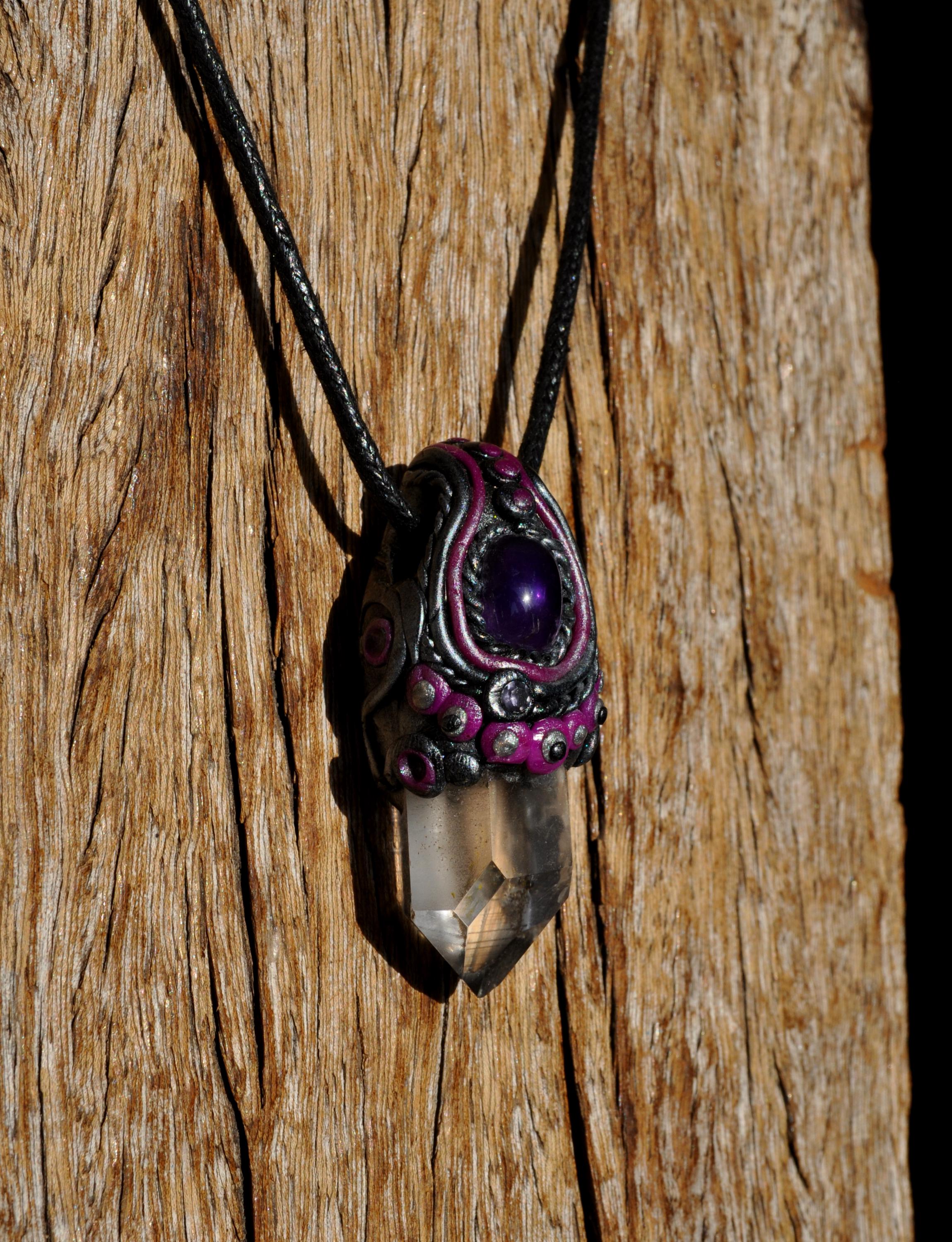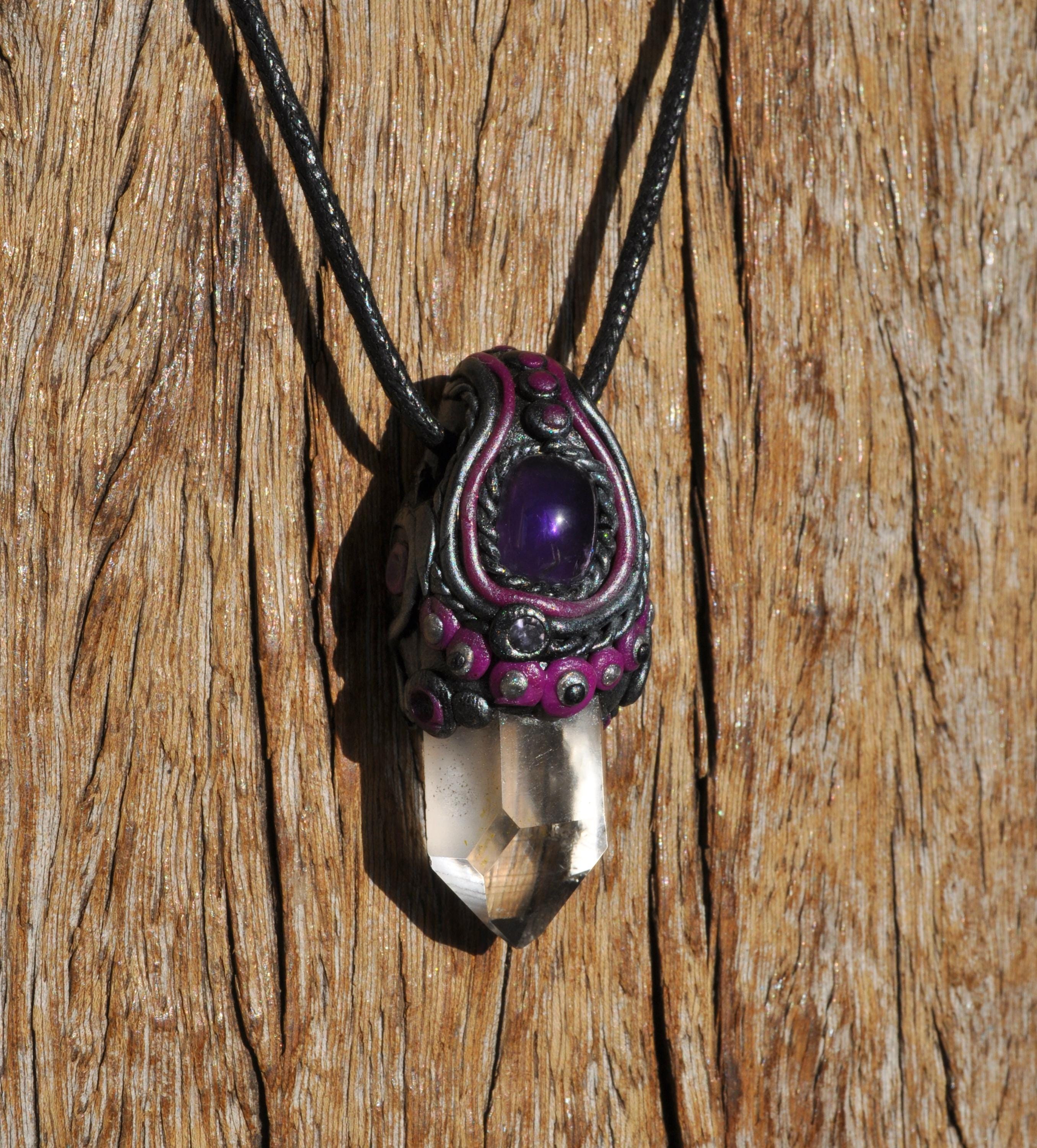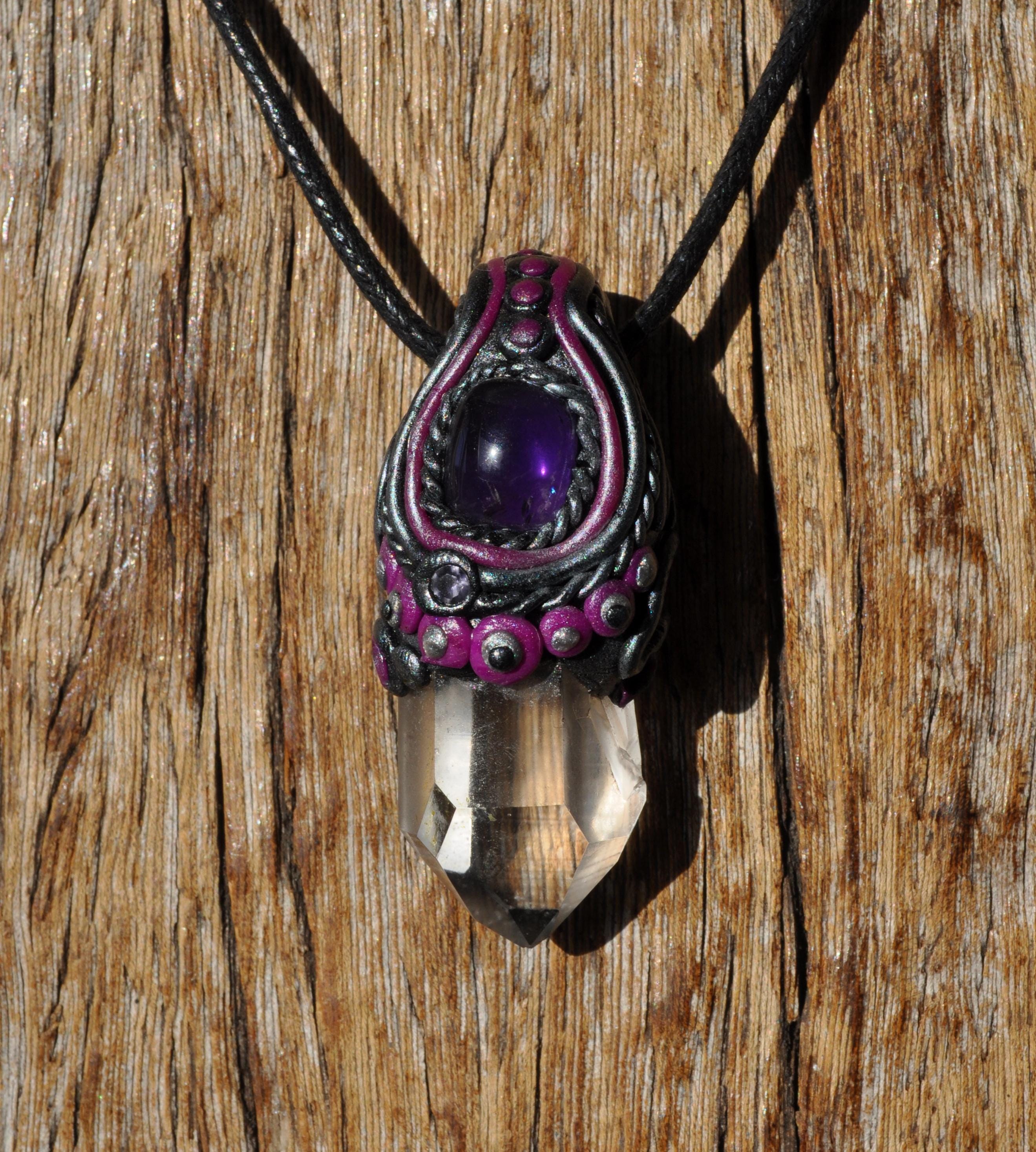 This handmade pendant features a natural terminated Clear Quartz point from Minas Gerais, Brazil, topped with a polished Amethyst stone. Each piece is carefully set in a durable, hand-sculpted polymer clay setting, created with love and attention to detail.