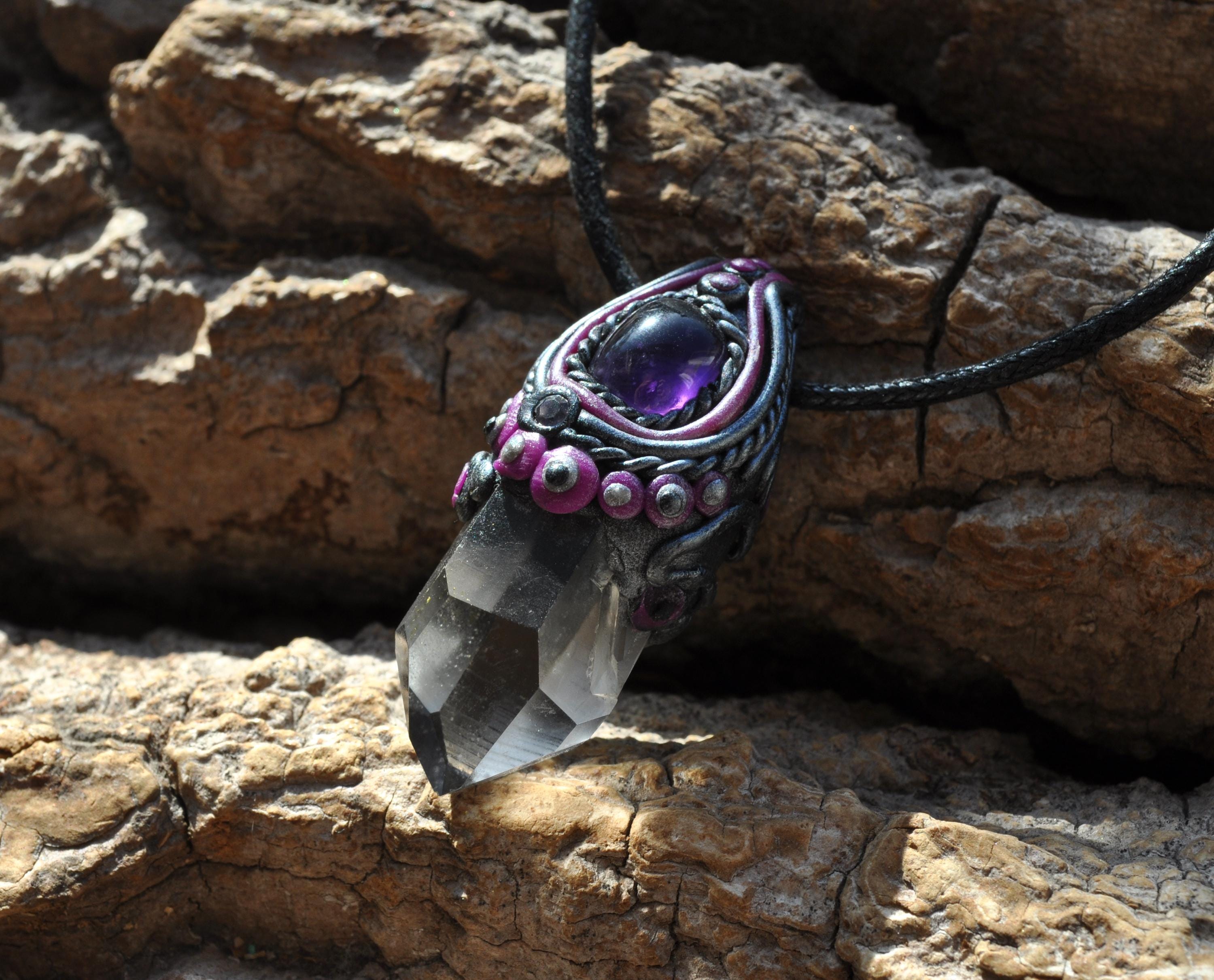 The pendant combines black, silver, and purple tones, some of which are slightly UV-active and glow beautifully under blacklight. A truly one-of-a-kind crystal necklace that blends natural elegance with a touch of mysticism.