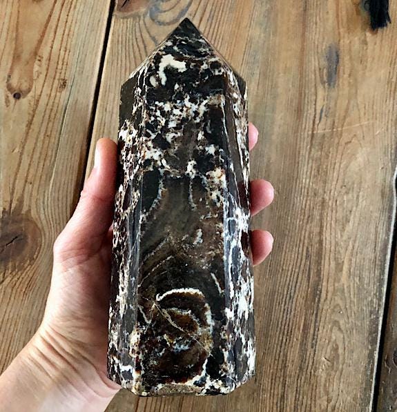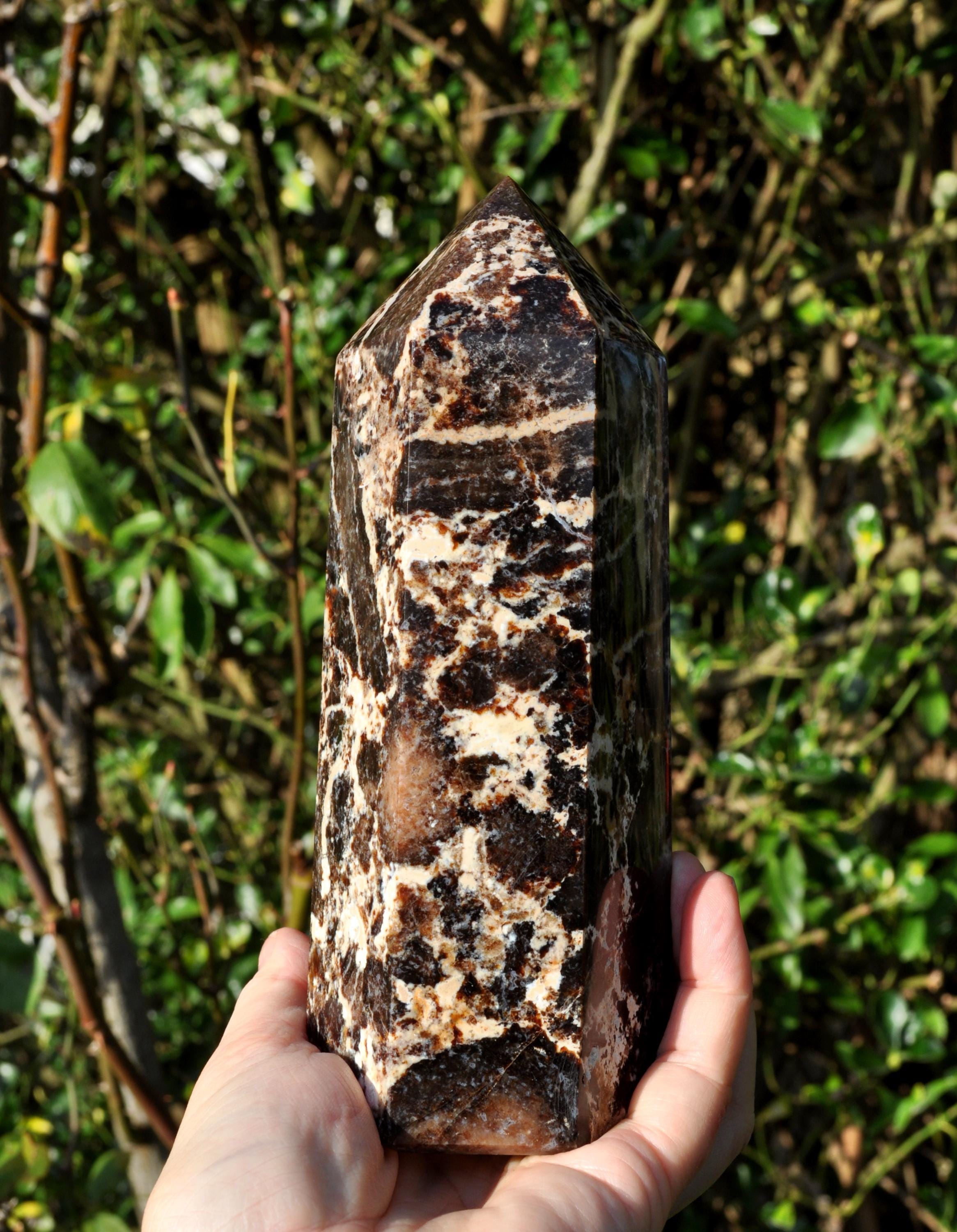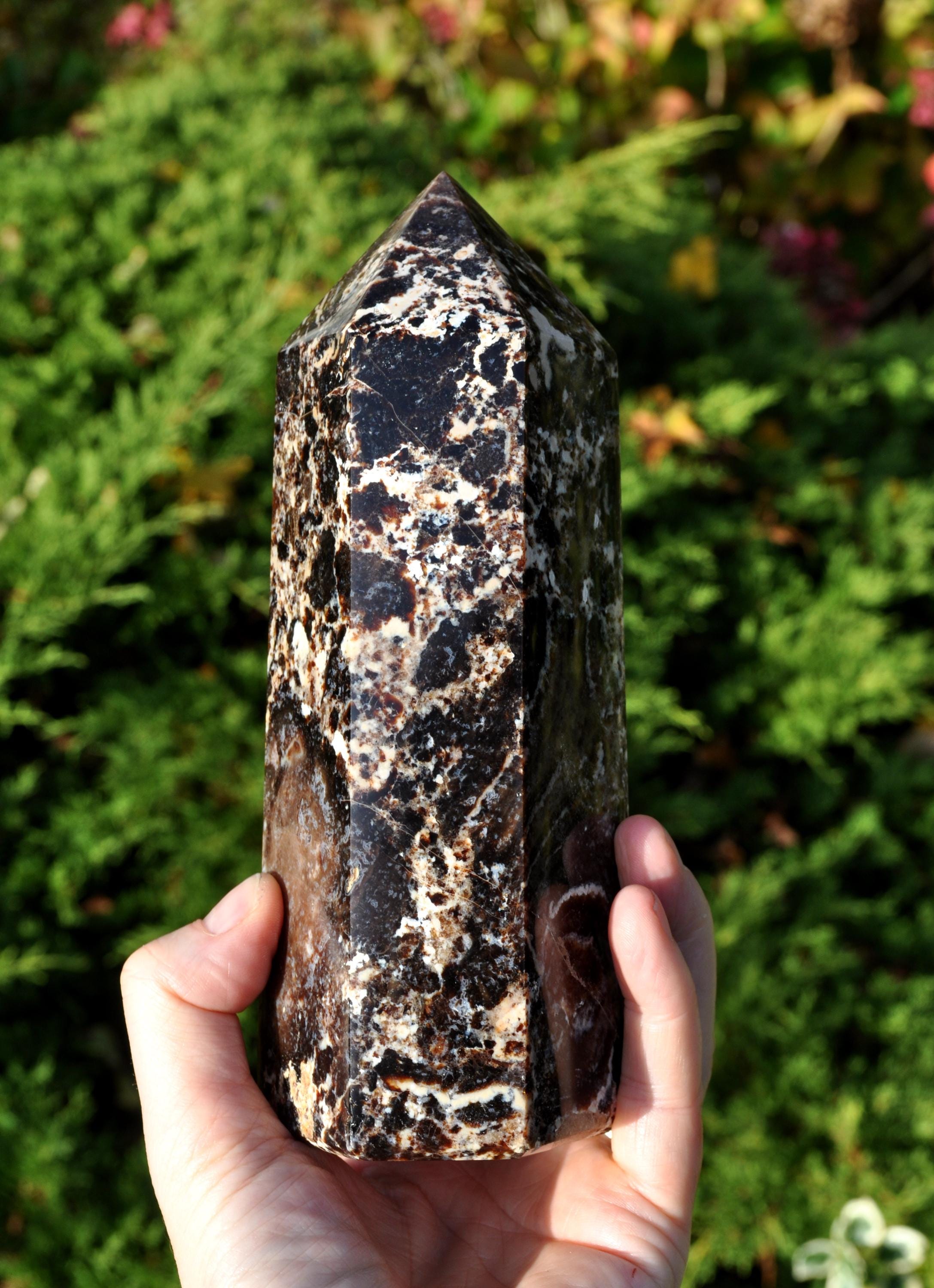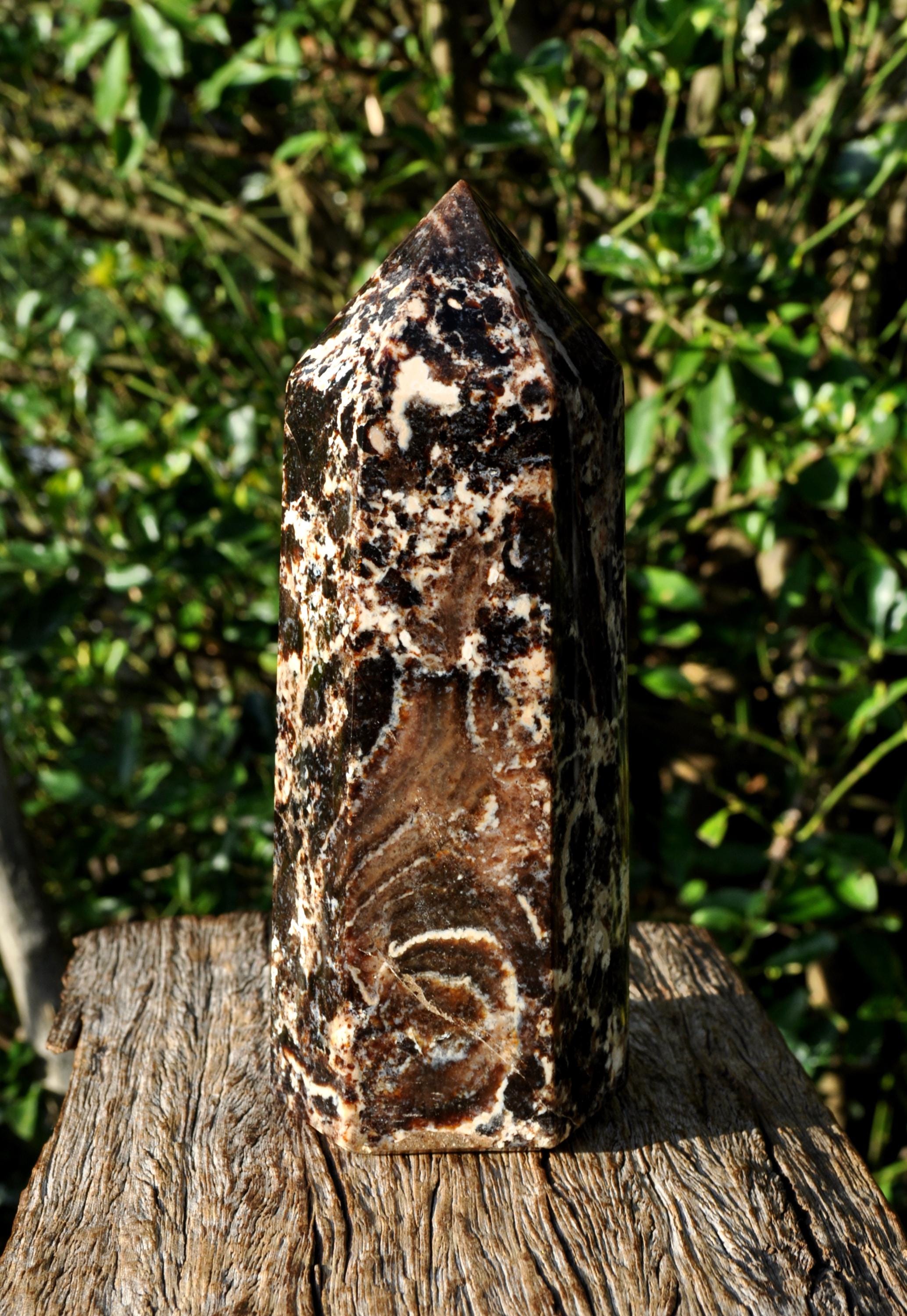 This large Black Opal Tower from Madagascar is a stunning natural stone, perfect for display in a cabinet, on a shelf, or as a centerpiece in a mineral collection. Weighing 1067 grams, this freestanding tower is substantial in size and instantly draws the eye. Its polished surface showcases the natural beauty of the stone, featuring a harmonious blend of deep blacks, warm browns, soft beige, and off-white tones, with intricate patterns that make each piece truly unique. Not just a decorative gem, Black Opal from Madagascar is valued for its calming, grounding, and balancing energy. Many people use it to help promote emotional balance, enhance creativity and focus, and create a peaceful atmosphere. Perfect as a mineral specimen, a standout piece in a crystal collection, or a natural accent in home decor, this Black Opal Tower is elegant, earthy, and deeply connected to the beauty of nature.
