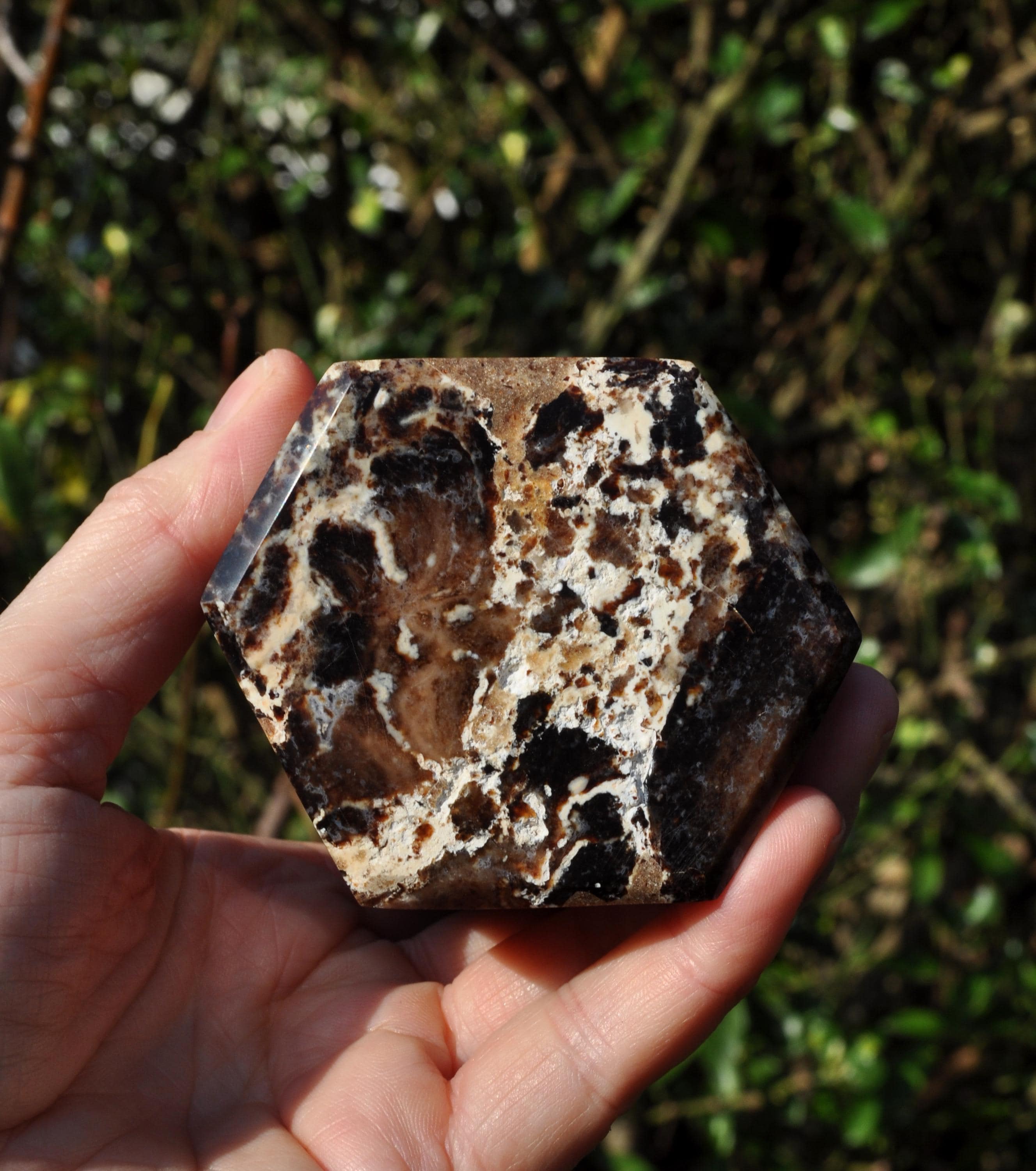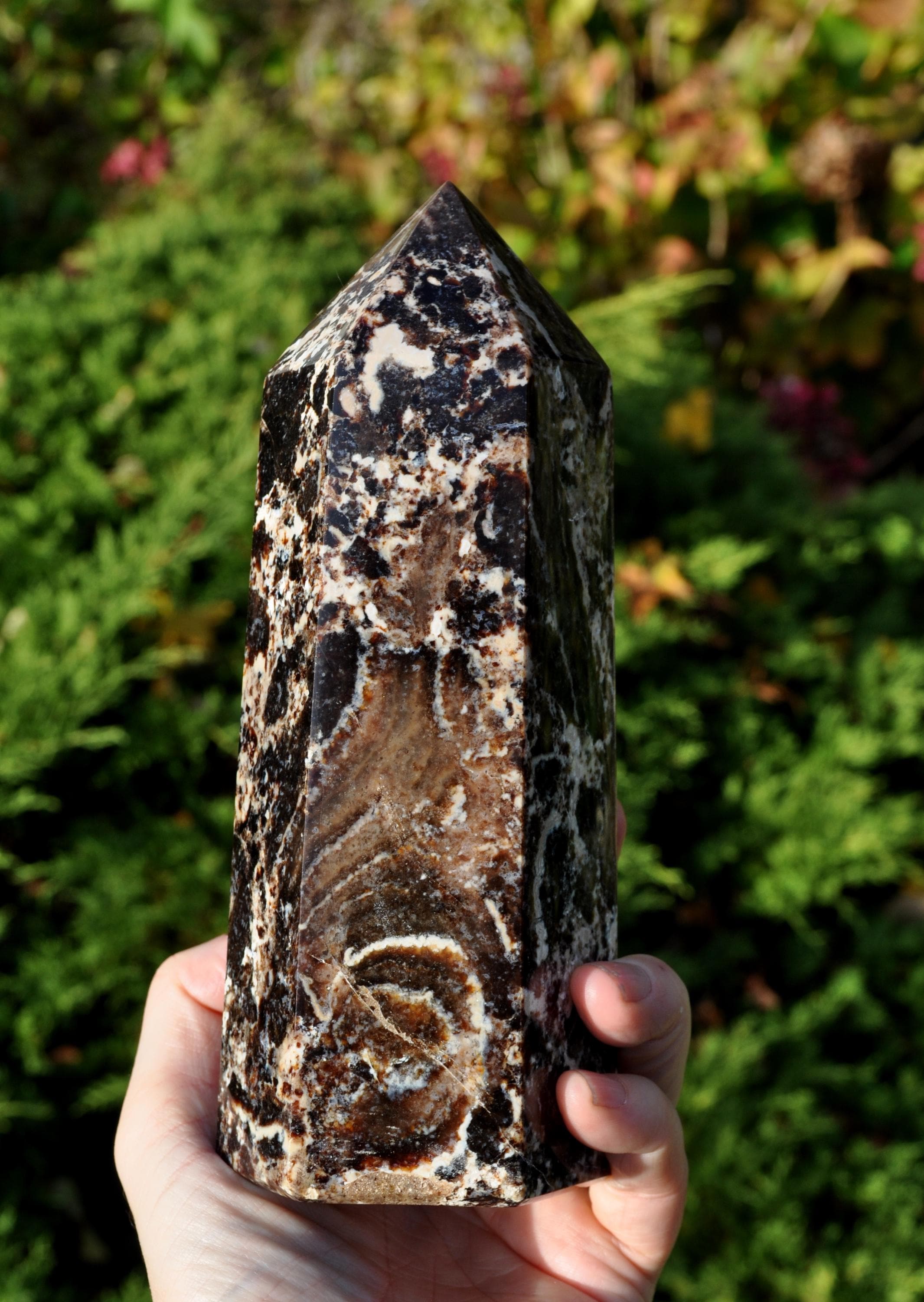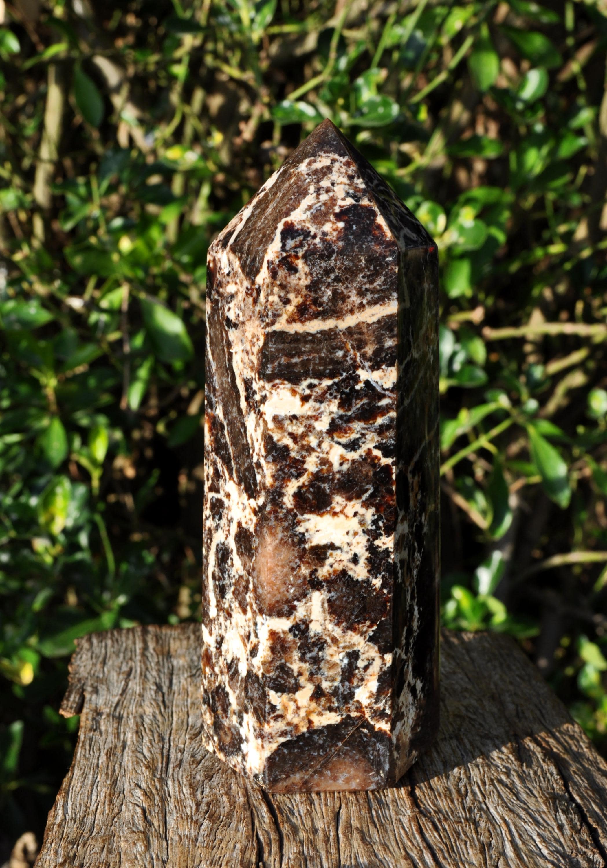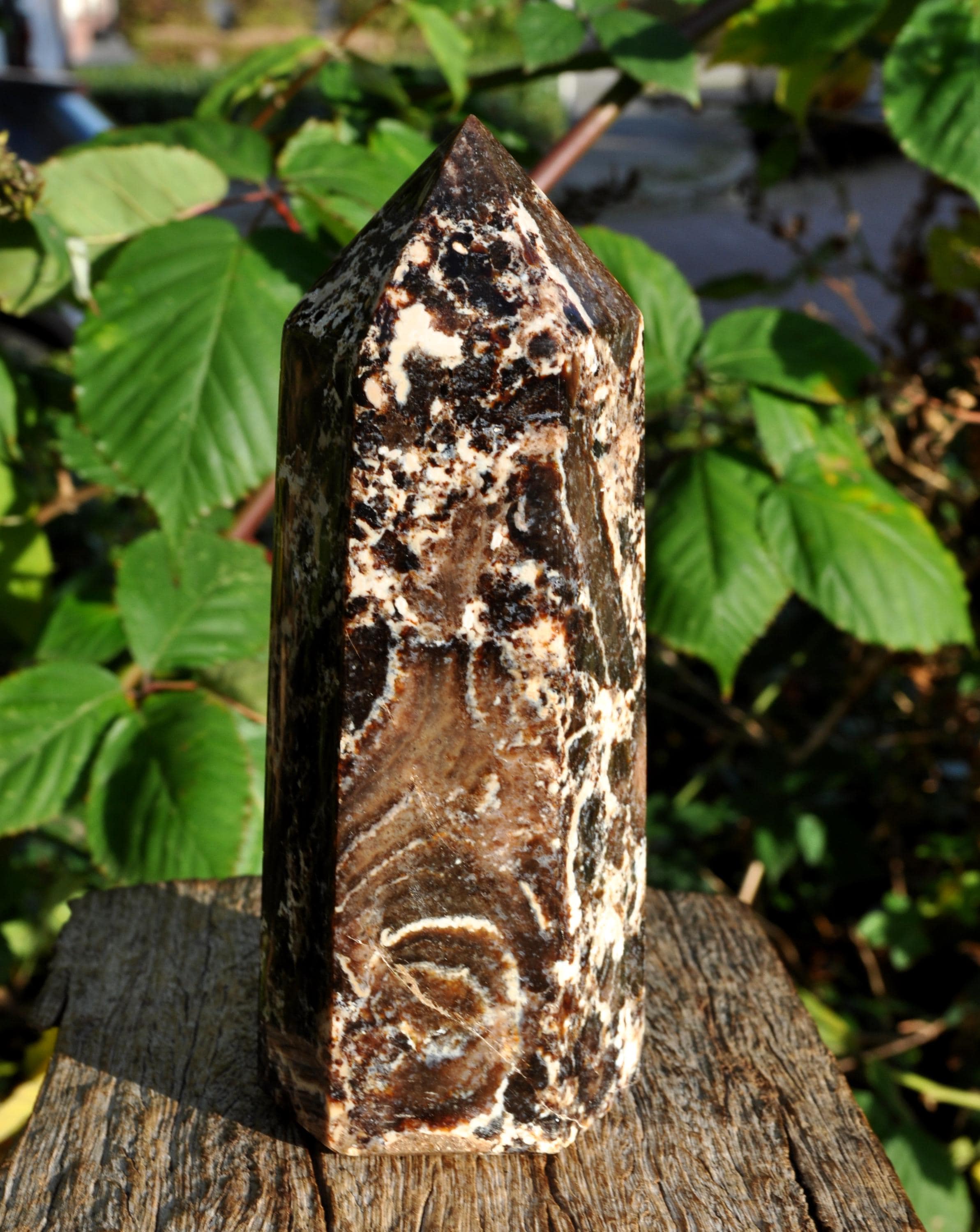 This large Black Opal Tower from Madagascar is a stunning natural stone, perfect for display in a cabinet, on a shelf, or as a centerpiece in a mineral collection. Weighing 1067 grams, this freestanding tower is substantial in size and instantly draws the eye. Its polished surface showcases the natural beauty of the stone, featuring a harmonious blend of deep blacks, warm browns, soft beige, and off-white tones, with intricate patterns that make each piece truly unique. Not just a decorative gem, Black Opal from Madagascar is valued for its calming, grounding, and balancing energy. Many people use it to help promote emotional balance, enhance creativity and focus, and create a peaceful atmosphere. Perfect as a mineral specimen, a standout piece in a crystal collection, or a natural accent in home decor, this Black Opal Tower is elegant, earthy, and deeply connected to the beauty of nature.