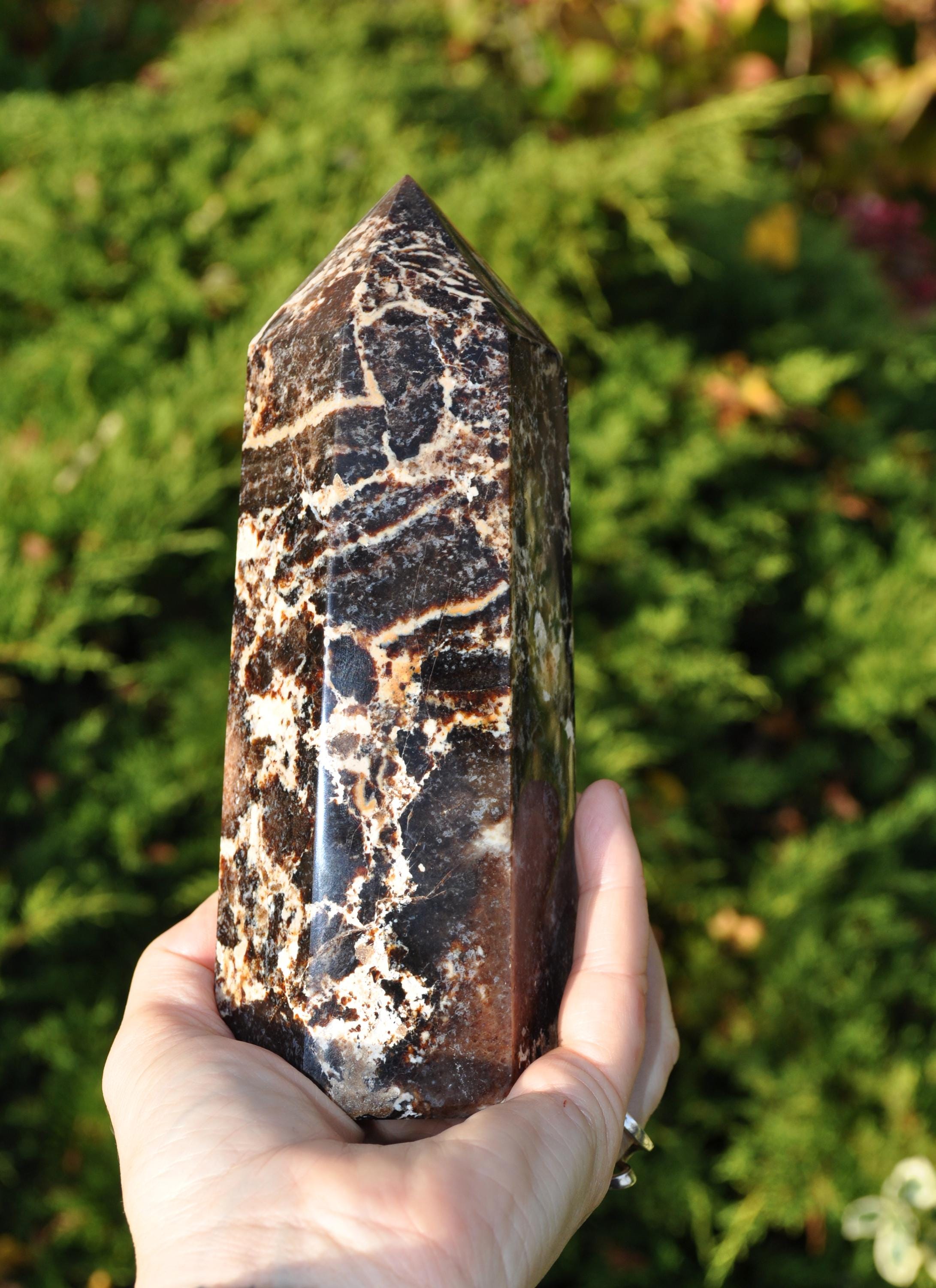 This large Black Opal Tower from Madagascar is a stunning natural stone, perfect for display in a cabinet, on a shelf, or as a centerpiece in a mineral collection. Weighing 1067 grams, this freestanding tower is substantial in size and instantly draws the eye. Its polished surface showcases the natural beauty of the stone, featuring a harmonious blend of deep blacks, warm browns, soft beige, and off-white tones, with intricate patterns that make each piece truly unique. Not just a decorative gem, Black Opal from Madagascar is valued for its calming, grounding, and balancing energy. Many people use it to help promote emotional balance, enhance creativity and focus, and create a peaceful atmosphere. Perfect as a mineral specimen, a standout piece in a crystal collection, or a natural accent in home decor, this Black Opal Tower is elegant, earthy, and deeply connected to the beauty of nature.